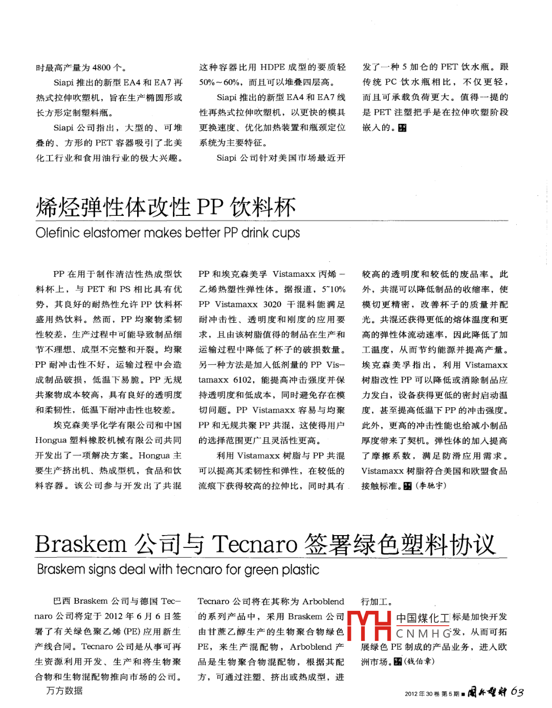 時最高產(chǎn)量為4800個。這種容器比用HDPE成型的要質(zhì)輕發(fā)了一種5加侖的PET飲水瓶。跟Siapi推出的新型EA4和EA7再50%-60%,而且可以堆疊四層高傳統(tǒng)PC飲水瓶相比,不僅更輕熱式拉伸吹塑機,旨在生產(chǎn)橢圓形或Siapi推出的新型EA4和EA7線而且可承載負荷更大。值得一提的長方形定制塑料瓶性再熱式拉伸吹塑機,以更快的模具是PET注塑把手是在拉伸吹塑階段Siapi公司指出,大型的、可堆更換速度、優(yōu)化加熱裝置和瓶頸定位嵌入的。圖疊的、方形的PET容器吸引了北美系統(tǒng)為主要特征。化工行業(yè)和食用油行業(yè)的極大興趣。 Siapi公司針對美國市場最近開烯烴彈性體改性PP飲料杯Olefinic elastomer makes better pp drink cupsPP在用于制作清潔性熱成型飲PP和??松梨?istamaxx丙烯較高的透明度和較低的廢品率。此料杯上,與PET和PS相比具有優(yōu)乙烯熱塑性彈性體。據(jù)報道,5-10%外,共混可以降低制品的收縮率,使勢,其良好的耐熱性允許PP飲料杯 PP Vistamaxⅹ300干混料能滿足模切更精密,改善杯子的質(zhì)量并配盛用熱飲料。然而,PP均聚物柔韌耐沖擊性、透明度和剛度的應(yīng)用要光。共混還獲得更低的熔體溫度和更性較差,生產(chǎn)過程中可能導致制品細求,且由該樹脂值得的制品在生產(chǎn)和高的彈性體流動速率,因此降低了加節(jié)不理想、成型不完整和開裂。均聚運輸過程中降低了杯子的破損數(shù)量。工溫度,從而節(jié)約能源并提高產(chǎn)量PP耐沖擊性不好,運輸過程中會造另一種方法是加入低劑量的 PP Vis-??松梨谥赋?利用 Vistamaxx成制品破損,低溫下易脆。PP無規(guī) tamaxx6102,能提高沖擊強度并保樹脂改性PP可以降低或消除制品應(yīng)共聚物成本較高,具有良好的透明度持透明度和低成本,同時避免存在模力發(fā)白,設(shè)備獲得更低的密封啟動溫和柔韌性,低溫下耐沖擊性也較差。切問題。 PP Vistamaxx容易與均聚度,甚至提高低溫下PP的沖擊強度。埃克森美孚化學有限公司和中國PP和無規(guī)共聚PP共混,這使得用戶此外,更高的沖擊性能也給減小制品Hongua塑料橡膠機械有限公司共同的選擇范圍更廣且靈活性更高。厚度帶來了契機。彈性體的加入提高開發(fā)出了一項解決方案。 Hongua主利用 Vistamaxx樹脂與PP共混了摩擦系數(shù),滿足防滑應(yīng)用需求。要生產(chǎn)擠出機、熱成型機,食品和飲可以提高其柔韌性和彈性,在較低的Ⅴ istamaxx樹脂符合美國和歐盟食品料容器。該公司參與開發(fā)出了共混流痕下獲得較高的拉伸比,同時具有接觸標準。(李馳宇)Braskem公司與 Tecnaro簽署綠色塑料協(xié)議Braskem signs deal with tecnaro for green plastic巴西 Braskem公司與德國 Tec- Tecnaro公司將在其稱為 Arboblend行加工。naro公司將定于2012年6月6日簽的系列產(chǎn)品中,采用 Braskem公司中國煤化工標是加快開發(fā)署了有關(guān)綠色聚乙烯(PE)應(yīng)用新生由甘蔗乙醇生產(chǎn)的生物聚合物綠色CNMHG發(fā),從而可拓產(chǎn)線合同。 Recaro公司是從事可再PE,來生產(chǎn)混配物, Arboblend產(chǎn)展綠色PE制成的產(chǎn)品業(yè)務(wù),進入歐生資源利用開發(fā)、生產(chǎn)和將生物聚品是生物聚合物混配物,根據(jù)其配洲市場。(錢伯章)合物和生物混配物推向市場的公司。方,可通過注塑、擠出或熱成型,進202年30第5期限棄63