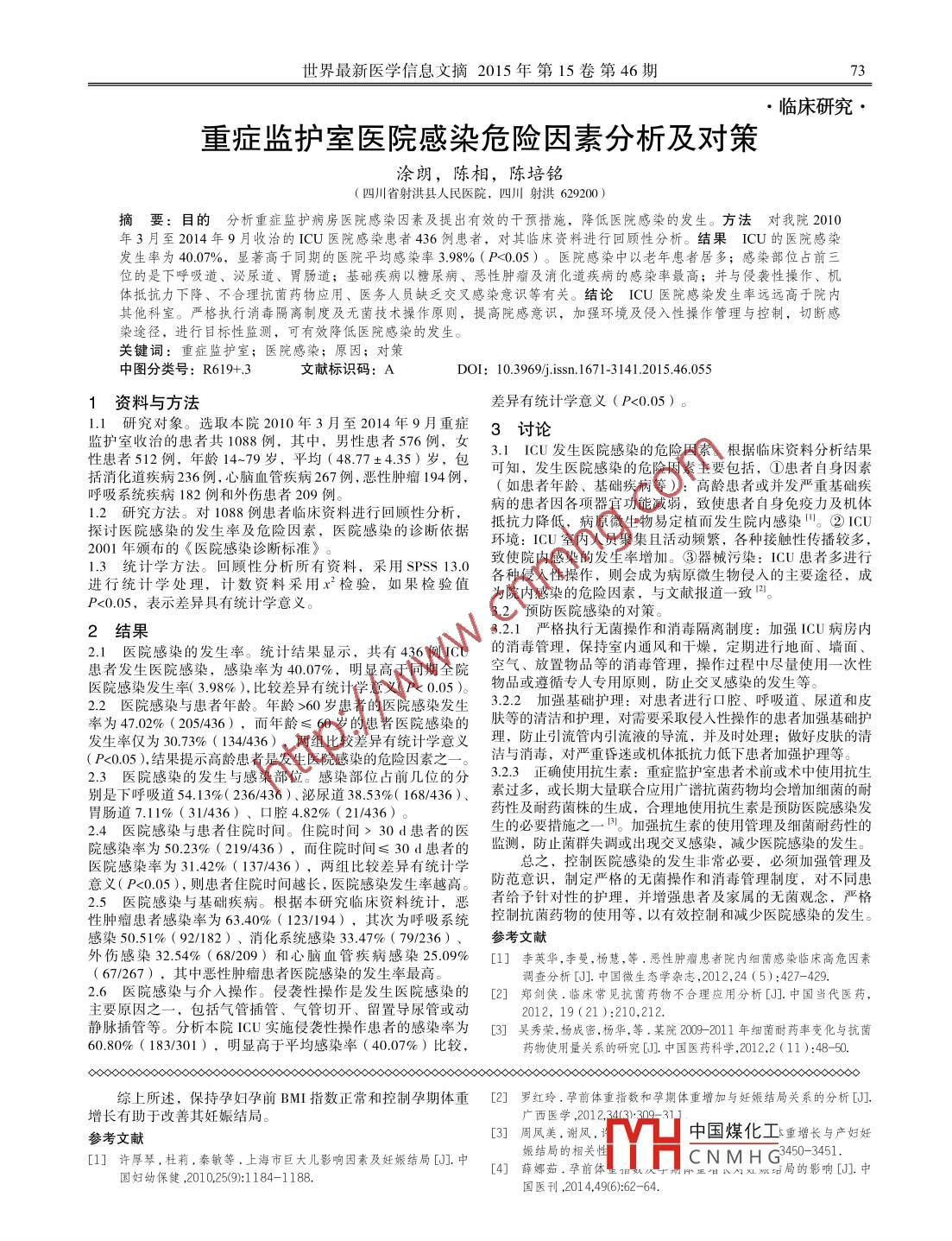 World Latest Medicne Information(Electronic Version)2015 Vol 15 No 46臨床研究孕前體重指數(shù)及孕期體重增長(zhǎng)對(duì)妊娠結(jié)局的影響分析王秋霞(海南省儋州市八一總場(chǎng)醫(yī)院,海南儋州571727)摘目的觀(guān)察和分析孕前體重指數(shù)(BMI)和孕期體重增長(zhǎng)對(duì)產(chǎn)婦妊娠結(jié)局的影響。方法選取2013年2月至2015年2月間于我院進(jìn)行產(chǎn)前檢查且住院分娩的BMI≥24kgm2的100例孕婦作為臨床研究對(duì)象,并將其作為研究組,另選我院同期進(jìn)行分娩的BM正常(18.5kgm2-22.9kgm2)的100例孕婦作為對(duì)照組。觀(guān)察兩組孕婦的妊娠結(jié)局情況并進(jìn)行對(duì)比分析。結(jié)果研究組孕婦岀現(xiàn)PIH、GDM、巨大兒及剖宮產(chǎn)等情況的概率明顯高于對(duì)照組,(P<(0.05)差異均有統(tǒng)計(jì)學(xué)意義。孕期體重增長(zhǎng)>15kg孕婦的PH、剖宮產(chǎn)及巨大兒發(fā)病率均明顯高于孕期體重增長(zhǎng)0.05)差異均無(wú)統(tǒng)計(jì)學(xué)意義。娩的BM≥24kg/m2的100例孕婦作為臨床研究對(duì)象,對(duì)2.2不同孕期體重增長(zhǎng)孕婦的妊娠結(jié)局對(duì)比。從表2可以其臨床資料進(jìn)行回顧性分析總結(jié)如下看出,孕期體重增長(zhǎng)>15kg孕婦的PIH、剖宮產(chǎn)及巨大兒發(fā)病率均明顯高于孕期體重增長(zhǎng)<15kg的孕婦,(P<0.05)差資料及方法異均有統(tǒng)計(jì)學(xué)意義。1.1一般資料。本次研究選取2013年2月至2015年23討論間于我院進(jìn)行產(chǎn)前檢查且住院分娩的BMI≥24kg/m2的本次研究結(jié)果顯示,研究組孕婦出現(xiàn)PIH、GDM、巨大齡20-36歲,平均年齡27.34±421歲;孕齡3442周,平兒及剖富產(chǎn)等情況的概率明顯高于對(duì)照組,(P05差異均有均孕齡3924±1.75周。另選我院同期進(jìn)行分娩的BM正常統(tǒng)計(jì)學(xué)意義。兩組孕婦的產(chǎn)后出血和新生兒窒息情況對(duì)比(18.5kg/m2-2.9kg/m2)的100例孕婦作為對(duì)照組,年齡00)差異均無(wú)統(tǒng)計(jì)學(xué)意義。這提示孕婦孕前BM指數(shù)過(guò)高21-38歲,平均年齡27.34±421歲;孕齡35-42周,平均與其發(fā)生PH、CDM、巨大兒及剖官產(chǎn)等異常妊娠結(jié)局之間具孕齡39.51±1.87周。兩組孕婦中均已排除具有呼吸系統(tǒng)有密切的聯(lián)系。因此,醫(yī)院產(chǎn)科臨床人員在進(jìn)行孕前健康體檢內(nèi)分泌代謝系統(tǒng)、消化系統(tǒng)及心血管系統(tǒng)等嚴(yán)重疾病的患者。時(shí),需要為孕婦供給合理的運(yùn)動(dòng)鍛煉指導(dǎo)和飲食指導(dǎo)等護(hù)理干1.2方法。孕婦入院后由專(zhuān)門(mén)的醫(yī)護(hù)人員對(duì)孕婦的孕前體預(yù),以有效降低不良妊娠結(jié)局的發(fā)生率,降低相關(guān)并發(fā)癥的發(fā)重進(jìn)行詢(xún)問(wèn),并對(duì)其身高進(jìn)行測(cè)量,按照BM的計(jì)算公式生同時(shí),研究也顯示孕期體重增長(zhǎng)>15kg孕婦的剖宮產(chǎn)率(BMI=體重/身高的平方)對(duì)孕婦的BMI進(jìn)行計(jì)算。同時(shí)均明顯高于孕期體重增長(zhǎng)<15kg的孕婦,(P<0.05)差異均有統(tǒng)在產(chǎn)婦分娩前對(duì)其體重進(jìn)行測(cè)量,以計(jì)算其孕期中的體重增計(jì)學(xué)意義。這表明孕婦孕期體重增長(zhǎng)過(guò)多與孕婦的剖宮產(chǎn)率之長(zhǎng)情況。觀(guān)察和記錄孕婦妊娠期的并發(fā)癥發(fā)生及發(fā)展情況間呈正相關(guān)關(guān)系,據(jù)分析主要是由于孕婦孕期體重過(guò)多增長(zhǎng)導(dǎo)包括如子癇前期(PIH)輕度、重度與妊娠期糖尿病(GDM)致過(guò)多的脂肪堆積于盆腔中,導(dǎo)致盆腔的可利用空間減少,進(jìn)妊娠期高血壓等。待產(chǎn)婦分娩后對(duì)新生兒的體重進(jìn)行測(cè)量而使胎頭的入盆時(shí)間延遲或出現(xiàn)頭盆不稱(chēng)現(xiàn)象所致。并且研隨訪(fǎng)觀(guān)察其產(chǎn)后出血、新生兒窒息及手術(shù)產(chǎn)等情況究顯示孕期體重增長(zhǎng)>15kg孕婦的PIH、巨大兒發(fā)病率均明顯1.3統(tǒng)計(jì)學(xué)方法。將本組數(shù)據(jù)納人SPSS20.0統(tǒng)計(jì)軟件中進(jìn)高于孕期體重增長(zhǎng)<15kg的孕婦,(P005)差異均有統(tǒng)計(jì)學(xué)意統(tǒng)計(jì)和分析,其中的計(jì)數(shù)資料采用x2比較方法進(jìn)行比較,義。這提示產(chǎn)前BM指數(shù)過(guò)高及孕婦的體重過(guò)多增加會(huì)明顯提高PIH和巨大兒的發(fā)病率,進(jìn)而影響孕婦的并發(fā)癥發(fā)生情以率(%)進(jìn)行表示,計(jì)量資料采用t檢驗(yàn)進(jìn)行比較,以(x±s)況和新生兒出生后的異常結(jié)局表1兩組孕婦的PH、GDM、產(chǎn)后出血、巨大兒、新生兒窒息及剖宮產(chǎn)情況等情況對(duì)比[n(%)組別GDM巨大兒剖宮產(chǎn)產(chǎn)后出血新生兒窒息研究組2(120)22(22.05(5.0)對(duì)照組1003(3,0)2(2.0)7(7.010(10.0)3(3.0)7.68059.074417.92110.13020.00000.00910.0000表2孕期體重增長(zhǎng)孕婦的妊娠結(jié)局對(duì)比孕期體重增長(zhǎng)>1組別孕期體重增長(zhǎng)<15kg中國(guó)煤化工對(duì)照組396(15.38)研究組18(2571)CNMHG2(3.28)4(13.33)注:與孕期體重增長(zhǎng)<15kg孕婦對(duì)比,P<0.05世界最新醫(yī)學(xué)信息文摘2015年第15卷第46期73臨床研究重癥監(jiān)護(hù)室醫(yī)院感染危險(xiǎn)因素分析及對(duì)策涂朗,陳相,陳培銘(四川省射洪縣人民醫(yī)院,四川射洪629200)摘要:目的分析重癥監(jiān)護(hù)病房醫(yī)院感染因素及提出有效的干預(