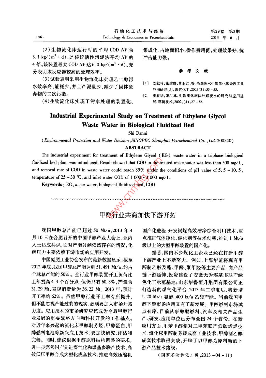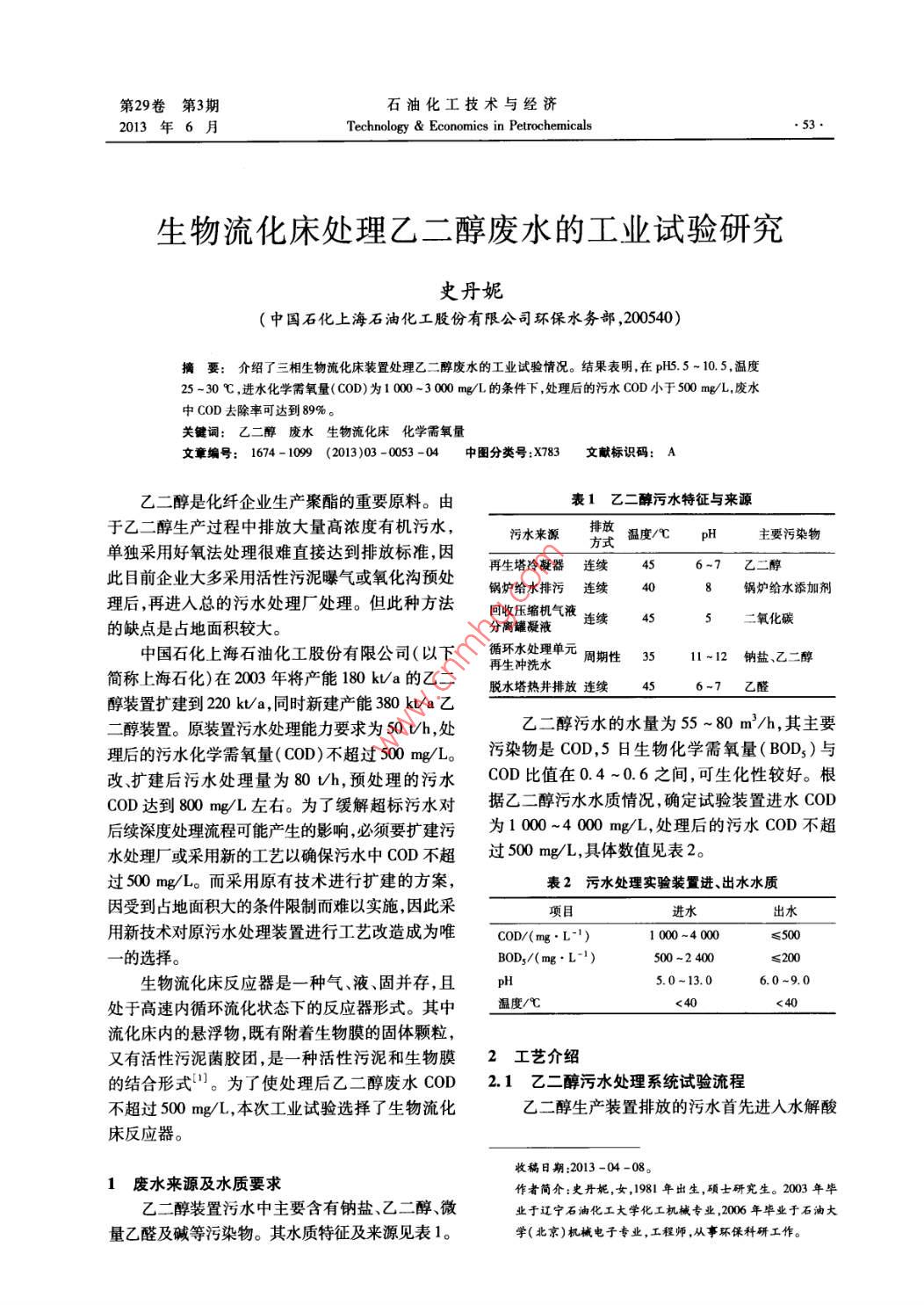 生物流化床處理乙二醇廢水的工業(yè)試驗(yàn)研究