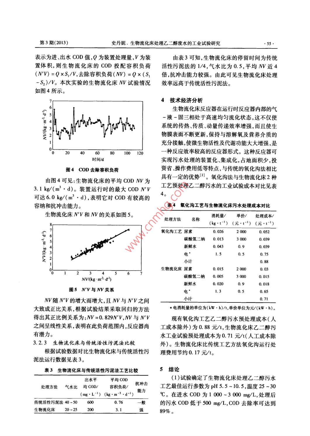 第29卷第3期石油化工技術(shù)與經(jīng)濟(jì)2013年6月 Technology Economics in Petrochemicals53生物流化床處理乙二醇廢水的工業(yè)試驗(yàn)研究史丹妮(中國(guó)石化上海石油化工股份有限公司環(huán)保水務(wù)部,200540)摘要:介紹了三相生物流化床裝置處理乙二醇廢水的工業(yè)試驗(yàn)情況。結(jié)果表明,在pH5.5~10.5,溫度25-30℃,進(jìn)水化學(xué)需氧量(COD)1000-3000mg/L條件下,處理后的污水COD小于500mg/L廢水中COD去除率可達(dá)到89%。關(guān)鍵詞:乙二醇廢水生物流化床化學(xué)需氧量文章編號(hào):1674-1099(2013)03-0053-04中圖分類(lèi)號(hào):X783文獻(xiàn)標(biāo)識(shí)碼:A乙二醇是化纖企業(yè)生產(chǎn)聚酯的重要原料。由表1乙二醇污水特征與來(lái)源于乙二醇生產(chǎn)過(guò)程中排放大量高濃度有機(jī)污水,污水來(lái)源排放溫度/℃H主要污染物單獨(dú)采用好氧法處理很難直接達(dá)到排放標(biāo)準(zhǔn),因方式此目前企業(yè)大多采用活性污泥曝氣或氧化溝預(yù)處再生塔冷凝器連續(xù)456-7乙二醇鍋爐給水排污連續(xù)408鍋爐給水添加劑理后,再進(jìn)入總的污水處理廠(chǎng)處理。但此種方法回收壓縮機(jī)氣液的缺點(diǎn)是占地面積較大。分離罐凝液連續(xù)455二氧化碳中國(guó)石化上海石油化工股份有限公司(以下循環(huán)水處理單元簡(jiǎn)稱(chēng)上海石化)在2003年將產(chǎn)能180ka的乙二再生沖洗周期性3511~12鈉鹽、乙二醇脫水塔熱井排放連續(xù)456-7乙醛醇裝置擴(kuò)建到220kt/a,同時(shí)新建產(chǎn)能380k/a乙二醇裝置。原裝置污水處理能力要求為50h,處乙二醇污水的水量為55~80m3/h,其主要理后的污水化學(xué)需氧量(COD)不超過(guò)500mg/L污染物是coD,5日生物化學(xué)需氧量(bD)與改、擴(kuò)建后污水處理量為80th,預(yù)處理的污水COD比值在0.4~0.6之間,可生化性較好。根COD達(dá)到800mg/L左右。為了緩解超標(biāo)污水對(duì)據(jù)乙二醇污水水質(zhì)情況,確定試驗(yàn)裝置進(jìn)水cOD后續(xù)深度處理流程可能產(chǎn)生的影響,必須要擴(kuò)建污為1000~400mg/L,處理后的污水COD不超水處理廠(chǎng)或采用新的工藝以確保污水中COD不超過(guò)500mg/L,具體數(shù)值見(jiàn)表2過(guò)500mg/L。而采用原有技術(shù)進(jìn)行擴(kuò)建的方案,表2污水處理實(shí)驗(yàn)裝置進(jìn)、出水水質(zhì)因受到占地面積大的條件限制而難以實(shí)施,因此采項(xiàng)目進(jìn)水出水用新技術(shù)對(duì)原污水處理裝置進(jìn)行工藝改造成為唯CD/(mg.l-)10004000≤500一的選擇。 BOD3/(mg.L-)500~2400≤200生物流化床反應(yīng)器是一種氣、液、固并存,且H5.0~13.06.0~9.0處于高速內(nèi)循環(huán)流化狀態(tài)下的反應(yīng)器形式。其中溫度/℃<40<4流化床內(nèi)的懸浮物,既有附著生物膜的固體顆粒,又有活性污泥菌膠團(tuán),是一種活性污泥和生物膜2工藝介紹的結(jié)合形式。為了使處理后乙二醇廢水COD2.1乙二醇污水處理系統(tǒng)試驗(yàn)流程不超過(guò)500mg/L,本次工業(yè)試驗(yàn)選擇了生物流化乙二醇生產(chǎn)裝置排放的污水首先進(jìn)入水解酸床反應(yīng)器。收稿日期:2013-04-08。1廢水來(lái)源及水質(zhì)要求作者簡(jiǎn)介:史丹妮,女,1981年出生,碩士研究生。2003年畢乙二醇裝置污水中主要含有鈉鹽、乙二醇、業(yè)于遼寧石油化工大學(xué)化工機(jī)械專(zhuān)業(yè)2006年畢業(yè)于石油大量乙醛及堿等污染物。其水質(zhì)特征及來(lái)源見(jiàn)表1。??蒲泄W(xué)(北京)機(jī)械電子專(zhuān)業(yè),工程師,從事環(huán)保科研工作。石油化工技術(shù)與經(jīng)濟(jì)第29卷第3期54· Technology Economics in Petrochemicals2013年6月化池,然后進(jìn)入預(yù)曝氣池,再進(jìn)入氧化溝,處理后的污水送至下游總污水處理場(chǎng)(見(jiàn)圖1)下游總污1裝置污水水處理場(chǎng)處理裝置水解酸化池預(yù)曝氣池氧化溝2裝置污水工業(yè)試驗(yàn)均質(zhì)水解罐生物流化床圖1乙二醇污水現(xiàn)有處理試驗(yàn)流程乙二醇污水處理試驗(yàn)系統(tǒng)及流程見(jiàn)圖1虛線(xiàn)中投加載體及一定量取自總污水處理場(chǎng)的污泥,部分,從水解酸化池引出一部分污水進(jìn)入試驗(yàn)系另外投加營(yíng)養(yǎng)液和特種菌,然后通入污水和空氣統(tǒng),污水首先進(jìn)入均質(zhì)水解罐,然后進(jìn)入生物流化進(jìn)行悶曝培養(yǎng),3天后連續(xù)進(jìn)水,水停留時(shí)間床反應(yīng)器,經(jīng)生化處理后,排至氧化溝出水管線(xiàn)。(HRT)為10~15h在啟動(dòng)運(yùn)行約15d后,可發(fā)2.2流化床工藝流程現(xiàn)多數(shù)載體的表面附著了生物膜,此外還發(fā)現(xiàn)了大型生物流化床處理乙二醇污水工業(yè)試驗(yàn)裝鐘蟲(chóng)、累枝蟲(chóng)等原生動(dòng)物附著在生物膜表面。隨置主要包括均質(zhì)水解罐、生物流化床加藥罐和空著載體表面生物膜的逐漸形成,生物數(shù)量也逐漸氣壓縮機(jī),工藝流程如圖2所示。來(lái)自水解酸化增加,在運(yùn)行20d后,載體上生物膜已成熟,在宏池的乙二醇污水,由污水泵提升到均質(zhì)罐,經(jīng)酸化觀上表現(xiàn)為生物流化床去除有機(jī)物的效率達(dá)到較水解反應(yīng)后,污水溢流至生物流化床進(jìn)行生化降高水平。解,處理后的水排至氧化溝出水管線(xiàn)。加藥罐中3.2運(yùn)行結(jié)果按要求配制的營(yíng)養(yǎng)液,由加藥