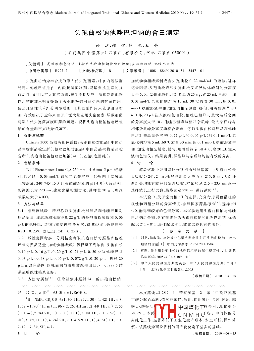 ●3446●現(xiàn)代中西醫(yī)結(jié)合雜志Modern Journal of Integrated Traditional Chinese and W estern Medicine 2010 Nov, 19( 31 )西拉普利的合成李國萍',慕善學(xué)“( 1.遼河石油勘探局婦嬰醫(yī)院,遼寧盤錦124010;2. 沈陽藥科大學(xué)高職學(xué)院,遼寧沈陽110026 )[關(guān)鍵詞] 西拉普利;合成工藝[中圖分類號] TQ460.6.[文獻(xiàn)標(biāo)識碼] B[文章編號] 1008 - 8849( 2010 )31 - 3446 -02西拉普利是一種非巰基血管緊張素轉(zhuǎn)化酶(ACE)抑制氣進(jìn)行催化氫化反應(yīng)18h,反應(yīng)完畢后過濾,蒸除溶劑,加人劑,該藥由瑞士Roche公司研發(fā),1990年首先在英國上市。300mL乙醚,過濾得白色固體。所得固體溶于500 mL二氯甲它可以抑制血漿中ACE活性和血管緊張素I引起的血壓升烷,于 10C攪拌下滴加SOCI2( 5.5 mL, 80.0 mmol),加畢室溫高,增強(qiáng)緩激肽的降壓作用,抑制血管壁去甲腎上腺素引起的反應(yīng)4h,加入KHCO( 15.5g,155 mL )水溶液,分液后濃縮有血管緊張素II的釋放。西拉普利降壓、抑制ACE、拮抗血管機(jī)層得黃色固體,環(huán)已烷重結(jié)晶得化合物(5 )25.1 g,收率緊張素I的加壓反應(yīng)和作用時(shí)間比卡托普利和依那普利優(yōu)76% ,mp 188~189 C,[ a]D20 -85.2( c=0.5, MeOH )。越,本品臨床用于輕度和中度原發(fā)性、頑固性高血壓的治療。'H - NMR( CDCI, )8:1.5(9H,s),1.5~2.0( 3H,m),2.2~本文經(jīng)9步單元操作,完成了西拉普利合成工藝的設(shè)計(jì)和優(yōu)2. 5( 3H,m),2.92( 1H,dt),3. 35 ~3.5( 1H,m),3.7~3. 85( 1H,化,原料廉價(jià)易得,操作簡便高效,關(guān)鍵中間體和終產(chǎn)物經(jīng)'H-m),4.7( 1H,dt),5.25 ~5.35( 2H,m),7.7 ~7. 9( 4H,m)。NMR確證。現(xiàn)將合成方法介紹如下。2.3 (1S,9S)-八氫-10-氧代 -9-苯二甲酰亞氨基-6H-1儀器與材料噠嗪并[ 1,2-a][ 1,2]二氮雜-1 -羧酸叔丁酯( 6 )的制備熔點(diǎn)由X-4雙目型顯微熔點(diǎn)儀(北京泰克儀器有限公在反應(yīng)瓶中加人化合物(5 )( 36. 5g,86.5 mmol)和干燥THF司生產(chǎn))測定,溫度未經(jīng)校正;'H一NMR譜由ARX - 300核磁(85 mL),于10 C氬氣保護(hù)下滴加BH,( 1 mol/L in THF,75.2共振儀(德國Bruker公司生產(chǎn))測定,旋光度由WZZ-1型旋mL,75 mmol )溶液,加畢,室溫反應(yīng)3 h,加入150 mL二氯甲光儀(上海精密儀器儀表有限公司生產(chǎn))測定。所用試劑均烷,再加入170mL鹽酸(2mol/L),混合液室溫?cái)嚢?5min,加為分析純或化學(xué)純,不經(jīng)處理直接使用。人Na2CO3調(diào)pH值為中性。分液后用飽和鹽水洗滌,濃縮有2方法 與結(jié)果機(jī)層蒸除溶劑,乙醇重結(jié)晶得化合物(6)32.1 g,收率90%,西拉普利的合成路線見圖1。mp 140~141 C,[ a]D2-69.1( e=1,MeOH )。'H - NMR( CDCI, )8:1.36~1.48( 1H,m),1.53( 9H,s),12100 CHG"1.56~1. 98( 3H,m),2. 00 ~2.20( 1H,m),2. 20 ~2. 62( 4H,m),3.04( 1H,d),3.23( 1H,dt),3. 48( 1H,dt),4. 98( 1H,d),5.70( 1H,dd ),7.66~7.97( 4H,m)。2.4 (1S,9S)-9-[(1S)-乙氧羰基 -3-苯丙氨基]八氫-10-氧代-6H-噠嗪并[ 1,2-a][ 1,2]二氮雜-1 -羧酸叔丁酯(8)的制備 在反應(yīng)瓶中加入化合物( 6 )( 8.26 g.20 mmol )、Chazxprl乙醇( 80 mL )和水合肼(2.2 g,44 mmol ),混合物室溫?cái)嚢?圖1西拉普利的合成路線h,蒸干溶劑;加入乙酸( 2 mol/L,82. 6 mL )后室溫?cái)嚢?2h,2.1 (28)-4- 芐氧羰基-2-苯二甲酰亞氨基丁酰氣(2)過濾 ,濾液加入Na2CO3調(diào)pH值為中性,二氯甲烷50 mL萃的制備依次將化合物( 1)(33.8 g,90 mmol)、socl,(13.1取,有機(jī)層 加入Na2CO,( 40 ml,10% ),室溫下加人化合物mL, 180.36 mmol )和甲苯200 mL加人反應(yīng)瓶,攪拌回流3h。(7)(7.48 g.22 mmol),混合物攪拌反應(yīng)5h,分液,有機(jī)層為減壓蒸除過量的SOClI,,剩余甲苯溶液約130mL備用?;衔?8)的二氣甲烷溶液,備用。2.2 (IS,9S)-八氫-6,10-二氧代-9-苯二甲酰亞氨基 2.5 (1S,9S)[[( 1S)-1-(乙氧羰基)-3-苯基丙基]氨噠嗪并[ 1,2-a][ 1,2]二氮雜-1 -羧酸叔丁酯( 5 )的制備基]八氫-10-長[222[1,2]二氮雜-1-中國煤化工將化合物(3)(24.6g,77mmol)和甲苯135mL加入反應(yīng)瓶中羧酸( Cilazap下,向上步制備的攪拌溶解,降溫至10 C攪拌下加入NaHCO,( 20.2 g,200 mL )化合物( 8)的:YHCNMHG集HCI氣體2h.然水溶液,繼續(xù)在攪拌下加入上步制備化合物(2)(以75 mmol后 繼續(xù)室溫?cái)嚢璺磻?yīng)12h,蒸除溶劑,加入乙醚和水萃取,分計(jì))的甲苯溶液,室溫下反應(yīng)15h。分液,取有機(jī)層減壓蒸除液,水層用NaOH( 5 mol/L )水溶液調(diào)pH值為4.5,析出固體,溶劑,殘余物用500mLDMF溶解,加入5%的Pd/C后通入氫過濾,乙醇重結(jié)晶得西拉普利單水合物7.2g,收率82%。mp現(xiàn)代中西醫(yī)結(jié)合雜志Modern Journal of Integrated Traditional Chinese and W estern Mediceine 2010 Nov, 19( 31 )●3447●頭孢曲松鈉他唑巴坦鈉的含量測定孫潔,鄭健,薛颯,王靜(石藥集團(tuán)中諾藥業(yè)(石家莊)有限公司,河北石家莊050091 )[關(guān)鍵詞]高效液相色譜法;注射用頭孢曲松鈉他唑巴坦鈉;頭孢曲松鈉;他唑巴坦鈉[中圖分類號] R927.2[文獻(xiàn)標(biāo)識碼] B[文章編號] 1008 - 8849( 2010 )31 -3447 -01頭孢曲松鈉為半合成的第3代頭孢菌素,對β內(nèi)酰胺酶加流動(dòng)動(dòng)相溶解制成含頭孢曲松0.22mol/mL的溶液,進(jìn)樣穩(wěn)定。他唑巴坦是β-內(nèi)酰胺酶抑制劑,能增強(qiáng)抗生素的抗記錄圖譜,頭孢曲松峰和頭孢曲松反式異構(gòu)體峰間的分離度菌活性,又可以擴(kuò)大其抗菌譜,減少不良反應(yīng)。酶抑制劑他唑大于6.0。②取他唑巴坦對照品約25mg,置25mL量瓶中,加.巴坦鈉的加人明顯提高了頭孢曲松鈉對耐藥菌的抗菌作用,0.01 mol/L氫氧化鈉溶液10 mL,30