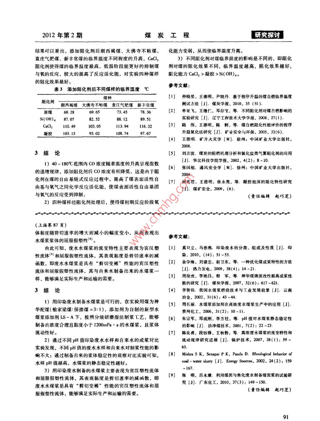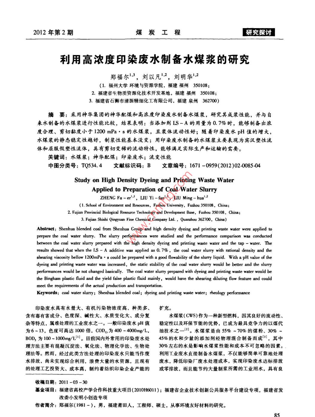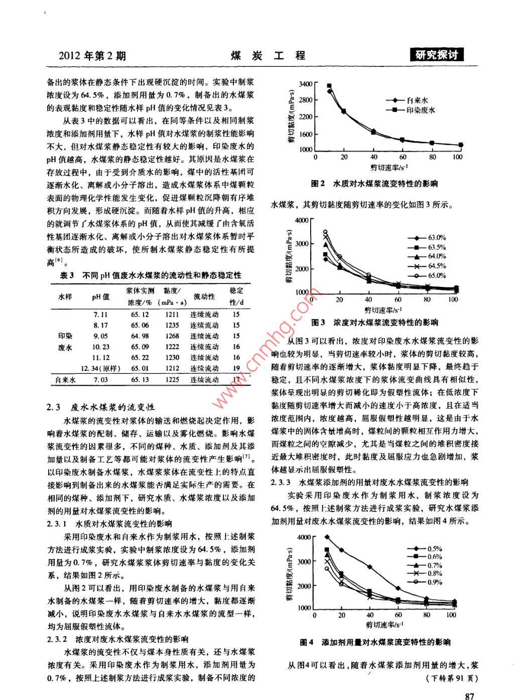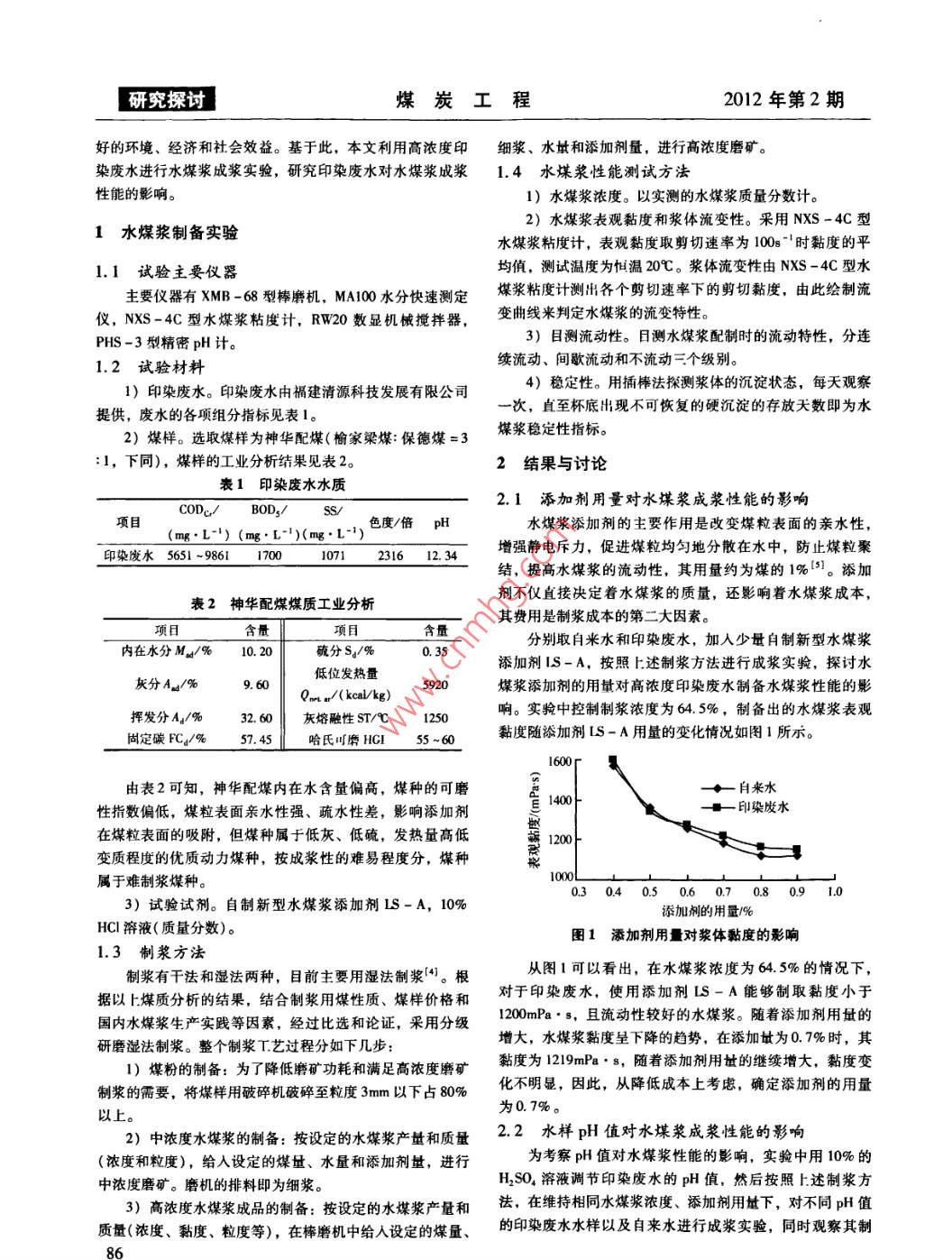2012年第2期煤炭工程研究探討利用高濃度印染廢水制備水煤漿的研究鄭福爾13,劉以凡2,劉明華2(1.福州大學(xué)環(huán)境與資源學(xué)院,福建福州3501082.福建省生物質(zhì)資源化技術(shù)開(kāi)發(fā)基地,福建福州350108;3.福建省石獅市清源精細(xì)化工有限公司,福建泉州362700)摘要:采用神華集團(tuán)的神華配煤和高濃度印染廢水制備水煤漿,研究其成漿性能,并與自來(lái)水制備的水煤漿進(jìn)行性能比較,結(jié)果表明:當(dāng)添加劑LS-A的用量為0.7%時(shí),能夠制備出濃度合理、剪切黏度小于1200mPa·s的水煤漿,且漿體流動(dòng)性好;隨著印染廢水pH值的增大,水煤漿的靜態(tài)穩(wěn)定性越妤,制漿性能基本沒(méi)變;用印染廢水制備的水煤漿主要表現(xiàn)為賓漢塑性流體和屈服假塑性流體,具有剪切變稀的流動(dòng)特性,能夠滿足實(shí)際生產(chǎn)和運(yùn)輸?shù)男枰?。關(guān)鍵詞:水煤漿;神華配煤;印染廢水;流變性能中圖分類號(hào):TQ534.4文獻(xiàn)標(biāo)識(shí)碼:B文章編號(hào):1671-0959(2012)02008504Study on High Density Dyeing and Printing Waste WaterApplied to Preparation of Coal Water SlurryZHENG Fu-er, LIU Yi-fan LIU Ming-hua.2(1. School of Environment and Resources, Fuzhou University, Fuzhou 350108, China;2. Fujian Provincial Biological Resource Technology and Development Base, Fuzhou 350108, China3. Fujian Shishi Qingyuan Fine Chemical Company Ltd, Quanzhou 362700, ChinaAbstract: Shenhua blended coal from Shenhua Group and high density dyeing and printing waste water were applied toprepare the coal water slurry. The slurry performances were studied and the performance comparison was conductedbetween the coal water slurry prepared with the high density dyeing and printing waste water and the tap-water. Theresults showed that when the IS-A additive was applied as 0. 7%, the coal water slurry with rational density and theshearing viscosity bellow 1200mPa.s could be prepared with a good flowability of the slurry liquid. With a pH value of thedyeing and printing waste water was increased, the static stability of the coal water slurry would be better and the slurryperformances would be not changed basically. The coal water slurry prepared with dyeing and printing waste water would bethe Bingham plastic fluid and the yield false plastic fluid mainly, would have the shearing diluting flow feature and couldmeet the requirements of the actual production and transportation.Keywords: coal water slurry: Shenhua blended coal; dyeing and printing waste water; rheology performance印染廢水具有水量大、有機(jī)污染物濃度高、種類多、擴(kuò)充。含有毒有害成分、色度深、堿性大、水質(zhì)變化大、成分復(fù)水煤漿(CWS)作為一種新型燃料,因其良好的流動(dòng)性雜等特點(diǎn),屬難處理的工業(yè)廢水之一。一般印染廢水pH值穩(wěn)定性以及環(huán)保節(jié)能的優(yōu)勢(shì),已成為最具競(jìng)爭(zhēng)力的以煤代為6~13,色度可高達(dá)1000倍音,COD為400~4000mg/L,油技術(shù)之121。水煤漿是由55%~70%的煤粉、30%BOD3為100-100mg/u。目前國(guó)內(nèi)外常用的印染廢水處45%的水和少量的添加劑經(jīng)物理混合制備而成3,其中理方法主要有混凝沉淀法、氧化法、物理化學(xué)法、生物處30%左右的水是影響水煤漿性能和成本不可忽略的因素。理法等。然而,經(jīng)過(guò)此類方法處理的印染廢水只能當(dāng)作廢利用工業(yè)廢水直接制備水煤漿,不儀能夠簡(jiǎn)單可靠地處理水排放,尚未實(shí)現(xiàn)綜合利用,浪費(fèi)大量的水資源,且現(xiàn)有廢水,降低印染廠廢水處理成本,實(shí)現(xiàn)印染廢水達(dá)標(biāo)排放的處理工藝投資大、成本高,制約著紡織印染企業(yè)產(chǎn)能的或零排放,而且能節(jié)約大量制漿所需的工業(yè)用水,具有良收稿日期:2011-03-30基金項(xiàng)目:福建省高校產(chǎn)學(xué)合作科技重大項(xiàng)目(2010H011);福建省企業(yè)技術(shù)創(chuàng)新公共服務(wù)平臺(tái)建設(shè)專項(xiàng),福建省發(fā)改委小發(fā)明小創(chuàng)造專項(xiàng)作者簡(jiǎn)介:鄭福爾(1981-),男,福建莆田人,工程師、碩士,從事環(huán)境友好材料的研究。研究探討煤炭工程2012年第2期好的環(huán)境、經(jīng)濟(jì)和社會(huì)效益。基于此,本文利用高濃度印細(xì)漿、水坻和添加劑量,進(jìn)行高濃度磨礦染廢水進(jìn)行水煤漿成漿實(shí)驗(yàn),研究印染廢水對(duì)水煤漿成漿1.4水煤漿性能測(cè)試方法性能的影響。1)水煤漿濃度。以實(shí)測(cè)的水煤漿質(zhì)量分?jǐn)?shù)計(jì)。I水煤漿制備實(shí)驗(yàn)2)水煤漿表觀黏度和漿體流變性。采用NXS-4C型水煤漿粘度計(jì),表觀黏度取剪切速率為100-1時(shí)黏度的平1.1試驗(yàn)主要儀器均值,測(cè)試溫度為恒溫20℃。漿體流變性由NXS-4C型水主要儀器有XMB-68型棒廉機(jī),MA100水分快速測(cè)定媒漿粘度計(jì)測(cè)出各個(gè)剪切速率下的剪切黏度,由此繪制流儀,NXS-4C型水煤漿粘度計(jì),RW20數(shù)顯機(jī)械攪拌器,變曲線來(lái)判定水煤漿的流變特性。PHS-3型精密pH計(jì)。3)目測(cè)流動(dòng)性。日測(cè)水煤漿配制時(shí)的流動(dòng)特性,分連1.2試驗(yàn)材料續(xù)流動(dòng)、間歇流動(dòng)和不流動(dòng)三個(gè)級(jí)別。1)印染廢水。印染廢水由福建清源科技發(fā)展有限公司4)穩(wěn)定性。用插棒法探測(cè)漿體的沉淀狀態(tài),每天觀察提供,廢水的各項(xiàng)組分指標(biāo)見(jiàn)表1次,直至杯底出現(xiàn)不可恢復(fù)的硬沉