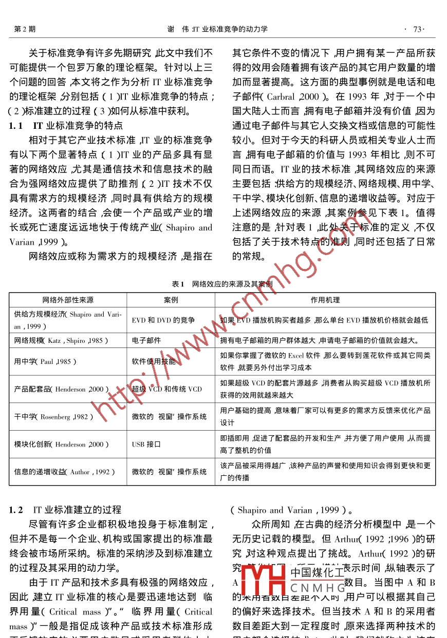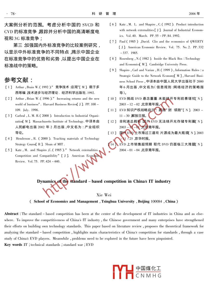 第27卷第2期管理VoL 272006年3月ience Research Management文章編號:000-29952006)0-007-0072I業(yè)標準競爭的動力學(xué)謝偉清華大學(xué)經(jīng)濟管理學(xué)院,北京100084)摘要在國內(nèi)外信息產(chǎn)業(yè)發(fā)展過程中標準競爭一直是行業(yè)競爭的焦點之一。為了提高我國信息產(chǎn)業(yè)的競爭力我國政府和企業(yè)近年來也加強了建立自有技術(shù)標準的努力。本文基于文獻綜述提出了分析Ⅳ業(yè)標準競爭的理論框架通過對中國EW播放機的案例分析揭示了中國標準競爭的主要特點并提岀了未來研究需要解決的問題關(guān)鍵詞狺息產(chǎn)業(yè)技術(shù)標準標準戰(zhàn)EⅤD中圖分類號206.2文獻標識碼:A在國內(nèi)外信息產(chǎn)業(yè)的發(fā)展過程中標準競爭式總結(jié)國外學(xué)者的相關(guān)研究,為本文和以后的學(xué)一直是行業(yè)競爭的焦點之一.信息產(chǎn)業(yè)的技術(shù)標術(shù)研究建立一個簡單的理論基礎(chǔ)計對第二個問準正在越來越多地引起國內(nèi)企業(yè)和政府部門的關(guān)題本文將通過案例研究方法利用國內(nèi)EVD播注。為了提高我國在國際標準競爭中的地位,為放機發(fā)展的過程來揭示中國T業(yè)標準競爭的特了更好地推進我國自有技術(shù)標準的制定科技部點。本文共分為三個部分第一部分提出分析T已經(jīng)立項了中國技術(shù)標準發(fā)展戰(zhàn)略研究”項目業(yè)標準競爭的理論框架第二個部分揭示中國TT研究和發(fā)展經(jīng)費超過了1000多萬元人民幣,該研業(yè)標準競爭的特點第三個部分總結(jié)和未來研究究項目共分為四個方面,包括環(huán)境科學(xué)、信息科展望學(xué)、農(nóng)業(yè)技術(shù)及制造業(yè)。與此同時國家發(fā)改委為我國的高清晰度電視標準的研究目前累計投入1T業(yè)標準競爭分析的理論框架約3個億的人民幣。隨著我國信息產(chǎn)業(yè)的發(fā)展和國內(nèi)外企業(yè)之間競爭激烈化程度的提高標準和關(guān)于T業(yè)標準競爭分析的理論框架本文首基于標準的竟?fàn)幵诮窈髸蔀槲覀兤髽I(yè)和政府部先開始于以下三個問題第一縱觀國內(nèi)外標準競門日常經(jīng)營和管理的重要問題之爭的歷史事件很多有影響的并且被產(chǎn)業(yè)競爭和由于技術(shù)標準問題在現(xiàn)代商業(yè)競爭中的關(guān)鍵技術(shù)史學(xué)家經(jīng)常提起和引用的案例多屬于信息產(chǎn)作用國外已經(jīng)有了一系列的先期研究( Authur,業(yè)這是為什么呢?第二世界上很多企業(yè)或國家19921996; Shapiro and varian,l999)〉同樣,近都積極投身于制定技術(shù)標準甚至在信息產(chǎn)業(yè)中年來關(guān)于技術(shù)標準問題的研究已經(jīng)引起了國內(nèi)數(shù)次發(fā)生了標準戰(zhàn)但什么樣的標準最終會被市些學(xué)者的注意。基于前人的工作本文重在探場接受呢?或者說標準是如何建立的呢?第討兩個問題(1)關(guān)于T業(yè)標準競爭的理論分析中國煤化工準并不是每一個企業(yè)框架(2)中國T業(yè)標準競爭的主要特點。針對都CNMHG利。決定企業(yè)能否獲第一個研究問題本文主要是通過文獻綜述的方利建是云呢收稿日期2004-12-02.基金項目國家自然科學(xué)基金資助項目,項目資助號0173008頊目名稱狺信息產(chǎn)業(yè)技木標準的管理和競爭戰(zhàn)暾2002.1-200.12作者簡介:謝俵(1967-)顒漢),安徽人清華大學(xué)經(jīng)濟管理學(xué)院副教授.研究方冋∶竟?fàn)帒?zhàn)略和技術(shù)密集型企業(yè)管理第2期謝偉罪業(yè)標準競爭的動力學(xué)關(guān)于標準競爭有許多先期研究此文中我們不其它條件不變的情況下用戶擁有某一產(chǎn)品所獲可能提供一個包羅萬象的理論框架。針對以上得的效用會隨著擁有該產(chǎn)品的其它用戶數(shù)量的增個問題的回答本文將之作為分析Ⅳ業(yè)標準競爭加而顯著提高。這方面的典型事例就是電話和電的理論框架分別包括(1)T業(yè)標準競爭的特點;子郵件 Cabral2000)在1993年對于一個中(2)標準建立的過程(3)如何從標準中獲利。國大陸人士而言擁有電子郵箱并沒有價值因為1.1m業(yè)標準競爭的特點通過電子郵件與其它人交換文檔或信息的可能性相對于其它產(chǎn)業(yè)技術(shù)標準丌業(yè)的標準競爭較小。但對于今天的科研人員或相關(guān)專業(yè)人士而有以下兩個顯著特點(1m業(yè)的產(chǎn)品多具有顯言擁有電子郵箱的價值與1993年相比則不可著的網(wǎng)絡(luò)效應(yīng)尤其是通信技術(shù)和信息技術(shù)的融同日而語。I業(yè)的技術(shù)標準其網(wǎng)絡(luò)效應(yīng)的來源合為強網(wǎng)絡(luò)效應(yīng)提供了助推劑〔2)?技術(shù)不僅主要包括拱給方的規(guī)模經(jīng)濟、網(wǎng)絡(luò)規(guī)模、用中學(xué)、具有需求方的規(guī)模經(jīng)濟冋同時具有供給方的規(guī)模干中學(xué)、模塊化創(chuàng)新、信息的遞增收益等。對應(yīng)于經(jīng)濟。這兩者的結(jié)合會使一個產(chǎn)品或產(chǎn)業(yè)的增上述網(wǎng)絡(luò)效應(yīng)的來源其案例參見下表1。值得長或死亡速度遠遠地快于傳統(tǒng)產(chǎn)業(yè)( Shapiro and注意的是針對表1此處關(guān)于標準的定義不僅Varian 1999 o包括了關(guān)于技術(shù)特點的準則同時還包括了日常網(wǎng)絡(luò)效應(yīng)或稱為需求方的規(guī)模經(jīng)濟是指在的常規(guī)表1