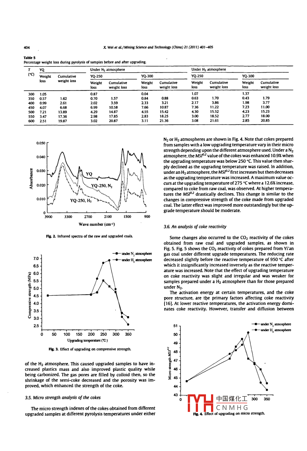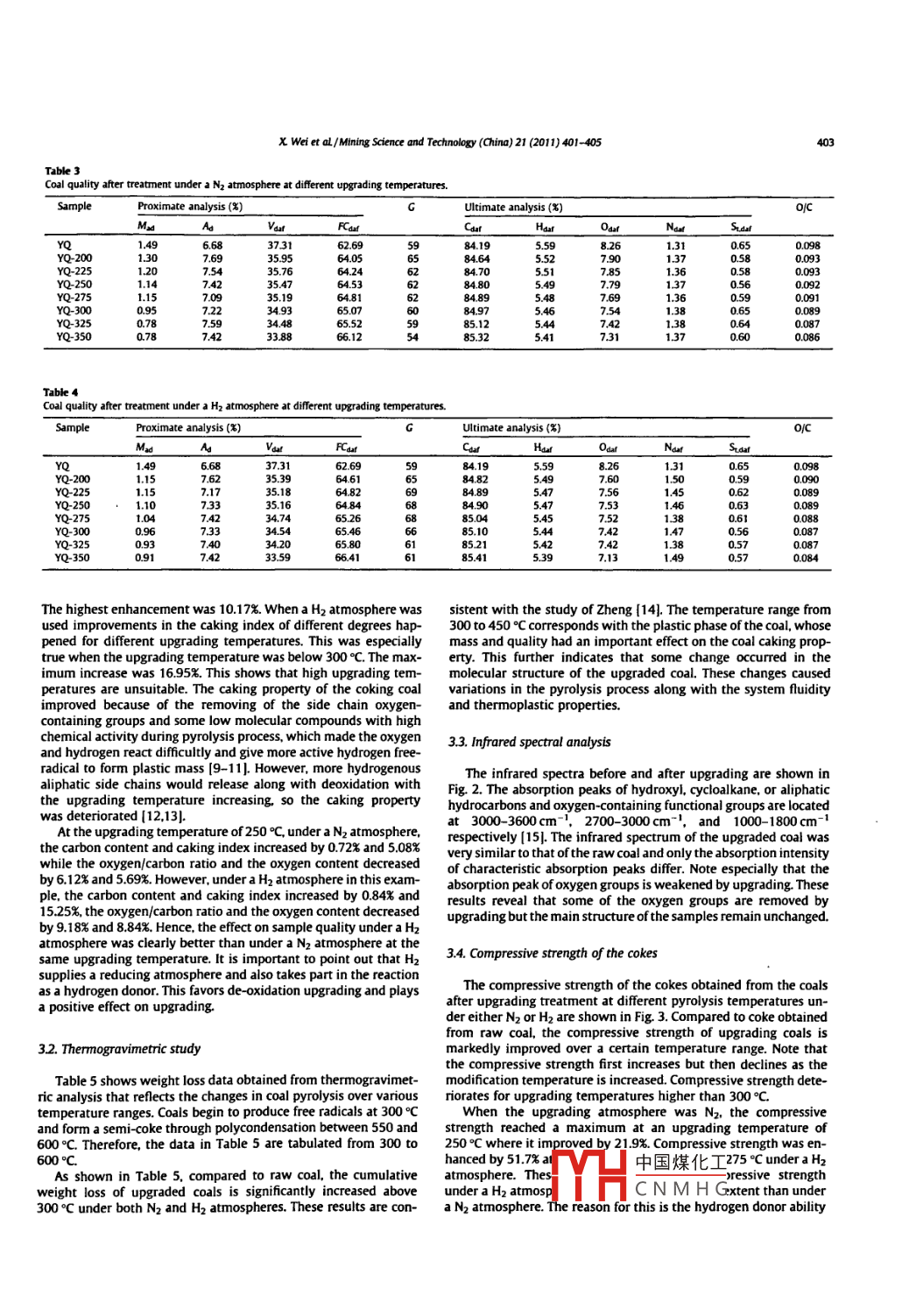 Mining Science and Technology( China)21(2011)401-405Contents lists available at Science Direct氵M(jìn)ining Science and Technology( china)ELSEVIERjournalhomepagewww.elsevier.com/locate/mstcUpgrading of Yi'an gas coal by low temperature pyrolysis underdifferent atmospheresWei Xiaomei, Zhou Min Zhang Chun, Lei Jiali a, Song liqiangLaboratory of Coal Processing 8 Effcient Utilization, School of Chemical Engineering G Technology, China University of Mining 6 Technology, Xuzhou 221008, chinaitute of Process Engineering, Chinese Academy of Sciences, Beijing 100190, ChinaARTICLE INFOA BSTRACTThe quality of Yi'an gas coal before and after low temperature upgrading under either a n2 or H2 atmo-Received 15 October 2010Received in revised form 13 November 2010sphere was examined by thermogravimetric and infrared analyses the effect of upgrading on the pre-Accepted 10 December 2010pared coke quality was analyzed. The results show that the carboxyl and phenolic hydroxyls in theAvailable online 12 June 2011coal molecular structure are removed after upgrading by low temperature pyrolysis under either n2 orH2 atmospheres. This improves coal caking properties to a certain extent. the upgrading effect under aH2 atmosphere is remarkably better than the effect observed after upgrading under Nz. Compared to cokeobtained from raw coal, the compressive- and micro-strength of the cokes obtained from upgraded coalare greatly improved. The effect on coke reactivity with CO2 is not significant. the best upgrading tem-Upgradingperature for Yi'an gas coal under either a N2 or H2 atmosphere is 250 or 275C respectively.Coke qualitye 2011 Published by Elsevier B V on behalf of China University of Mining technology1 Introductionstudy. the anthracite was used as an inert component to estimatethe coke quality by the carbonization test. All these samples wereThe modification and upgrading of coal by low temperature air-dried prior to use: their properties are listed in Table 1pyrolysis is of great practical importance because it creates newopportunities for enlarging coal resources usable for coking. The 2.2. Coal upgrading at different temperaturestechnology functions by controlling the carbonization process toobtain coke having desirable properties. during the modificationYi'an gas coal was pyrolyzed at different temperatures, all lowerand upgrading process most oxygen-containing groups of the coal than the softening temperature. The chosen upgrading tempera-are removed, which improves the coking and caking property tures are listed in Table 2. In this test the electric tube furnace[1-3]. The authors have studied the modification of thermoplastic was heated to the assigned temperature and then N2, or Hz, wereproperties of coals, and the coke qualityobtained, by pyrolysisIned intoan inert atmosphere 4-7.the tube at a rate of 0.5 L/min. After that a 25 g samplin a steel vessel was quickly pushed into the constant temperatureBlending some gas coals for a conventional coking oven is zone of the tube and a rubber stopper was tightly screwed onto therestricted by the high volatiles and weak caking properties of these tube portal. the coal samples were cooled to room temperature.coals. In this paper we discuss the coal quality of Yi'an gas coals be- under an inert atmosphere, after being pyrolyzed for a fixed time.fore and after upgrading under n2 or Hz atmospheres. Thermogravi- They were then crushed mechanically to-0.2 mm and the remainsmetric and infrared analyses are used to analyze the coals. The effect were devoted to the carbonization test. Table 2 also lists the corre-on the individual indexes of coke quality after the upgrading isexamined by a carbonization test.sponding coke names for the samples obtained from upgradingsamples by carbonization.The upgrading time was determined by the change in oxygen2. Experimentalcontaining functional groups. Samples were pyrolyzed for differenttimes at a heat treatment temperature of 250C. chemical2.1. Coal samplesmethods were used to measure the oxygen containing functionalgroups [8 The total acidic and carboxylic content was, respecYi'an Gas Coal from the Huanyu Coking Plant, Co, Ltd, located tively, measured by the exchange method using barium ion andXuzhou, and anthracite from Taixi in Ningxia were used for this calcium acetate the difference between these was taken as thecontent of phenolic hydroxyl. Fig. 1 shows the results.Corresponding author. Tel. +86 13852138866Asin IE-mailaddress:zm@cumt.edu.cn(M.Zhou).ylic oxygeen co中國煤化工 y under either a1674-5264/s- see front matter o 2011 Published by Elsevier B V on behalf of China University of MiningCNMHGdoi:10.1016 mstc201105027lef et aL/ Mining Science and Technology( China)21(2011)and ultimate analyses of the coals(AYi'an gas coal3731626984.195.59826131065Taixi anthracite1.69725006Table 2Upgrading temperatures and corresponding coke namesUpgrading temperature(oc)Raw coal275Y200Y225YQ275YQ-300Q-350K200JK-275nitrogen or hydrogen atmosphere. After 20 min the loss in oxygen with the anthracite in the proportion of 1: 1 and then charged to abecame relatively slower so the upgrading time chosen for the fol- steel cup(height 70 mm and 57 x 4 mm) and carbonized bylowing work was 20 min.heating at 3C min from 200 C up to 900C. Several 5 mm diameter holes were punched in the bottom of the cup so that gas re2,3 Thermogravimetric analysisleased during carbonization could pass freely from the sampleThe cokes obtained were allowed to cool naturally and stored forhermogravimetric analysis was carried out using a STA409c further use.thermogravimetric analyzer Samples weighing 10*0. 1 mg wereheated to 9ooC at a 3C/min rate under a nitrogen flow of 2.6. Compressive -and micro-strength measurements of the coke100 mL/minThe cokes were analyzed with a TYE-20 compression testing2. 4. FTIR spectroscopymachine to determine the compressive strength index. then thecokes were broken and 5 g of coke 3-6 mm in size were put into%L All Fourier Tra