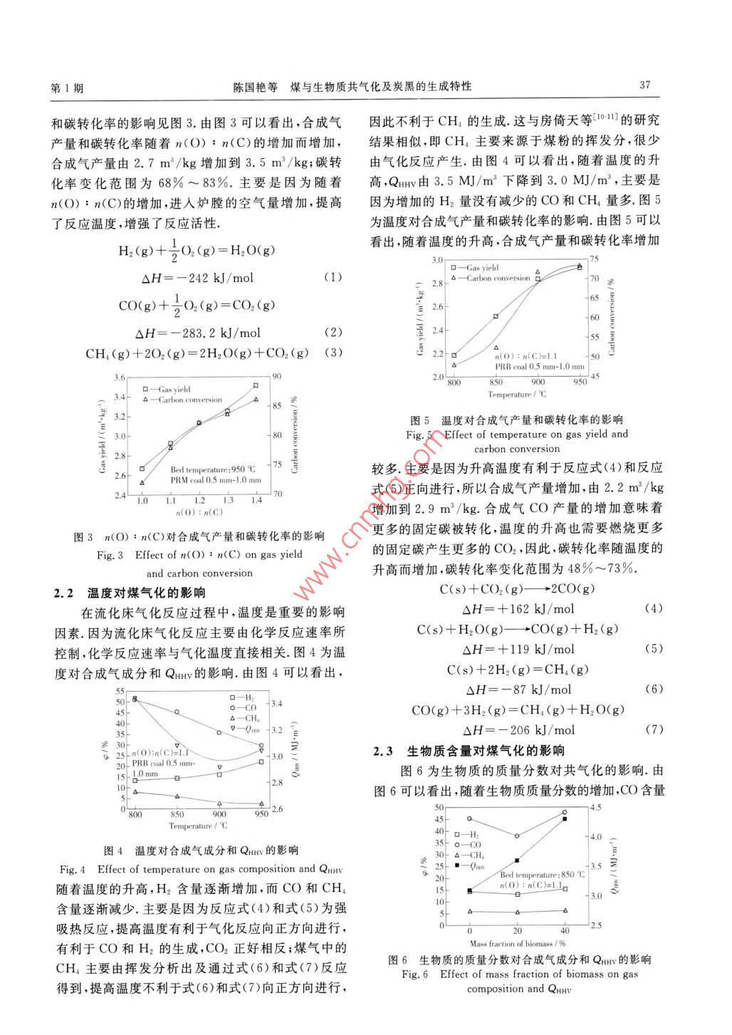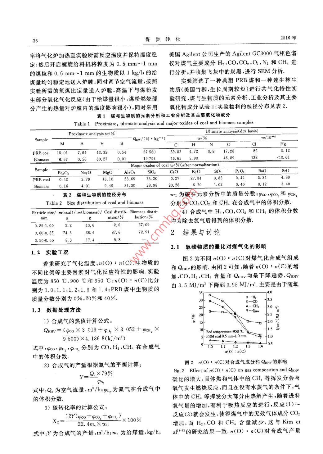 第39卷第1期某炭轉(zhuǎn)化Vol. 39 No. 12016年1月COAL CONVERSIONJan.2016煤與生物質(zhì)共氣化及炭黑的生成特性陳國艷)李 偉莉2)張保森3)鄧浩鑫"張安超”盛偉”摘要在1kg/h規(guī)模的常壓流化床氣化實驗系統(tǒng)上,在850 C,900 C和950 C.n(O) : m(C)分別為1.0,1.1,1.2,1.3和1.4,生物質(zhì)的質(zhì)量分數(shù)分別為20%和40%的條件下,對某地PRB煤和一種生物質(zhì)(美國竹柳)的共氣化特性進行了研究.結(jié)果表明:隨著溫度的升高,H2含量(體積分數(shù),下同)逐漸增加,CO和CH,含量及QHv(合成氣熱值)逐漸減少,合成氣產(chǎn)量和碳轉(zhuǎn)化率增加較多.隨著n(O) ; n(C)的增加,CO,H2,CH含量和QHv呈下降趨勢;合成氣產(chǎn)量和碳轉(zhuǎn)化率增加.隨著生物質(zhì)比例的增加,CO,H2,CH,的含量先減少后增加,Qav增加較多,合成氣產(chǎn)量和碳轉(zhuǎn)化率增加. m(O) : n(C)為1.0時的炭黑量要高于m(O) : n(C)為1.3時的炭黑量.關(guān)鍵詞生物質(zhì),共氣化,流化床,炭黑中圖分類號TQ546為20%和40%的條件下,對某地PRB煤和一種生0引言物質(zhì)的共氣化特性進行了研究;另外,研究了炭黑的煤氣化技術(shù)作為潔凈煤技術(shù)的重要組成部分,生成特性隨溫度及n(O) : n(C)的變化情況,以在由于具有高煤炭利用效率和低污染排放的特點,近.煤與生物質(zhì)共氣化生成可燃氣體的同時,尋求有用年來得到快速發(fā)展.生物質(zhì)與煤的物理化學性質(zhì)不的副產(chǎn)物.同,二者的有機反應(yīng)特性和無機反應(yīng)特性不同,煤與1實驗部分生物質(zhì)的單獨氣化過程不同,煤與生物質(zhì)的共氣化特性更為復雜.生物質(zhì)進入氣化爐后,先析出表面水1.1實驗 系統(tǒng)及煤樣分,然后在200 C以上開始干燥,當溫度升高到300 C,常壓流化床煤與生物質(zhì)共氣化實驗系統(tǒng)如圖1開始進行熱解反應(yīng);當溫度達到400 C ,揮發(fā)分基本所示.整個系統(tǒng)由一維電加熱爐、煤與生物質(zhì)給料裝上能夠析出完全;煤要到800 C才能將揮發(fā)分析出完全,兩者共氣化會相互影響,煤的氣化效率更高.5014金會心等[0]通過煤與生物質(zhì)的熱解實驗,得Y Coual federSample port到了表面特性改善的半焦;宋新潮等[6]研究發(fā)現(xiàn),幾www.-analysis種煤與生物質(zhì)共氣化后,碳轉(zhuǎn)化率和合成氣中可燃Valve8Elxash氣體含量均高于單獨生物質(zhì)或煤氣化時的碳轉(zhuǎn)化率Flow metera和可燃氣體含量;李克忠等切利用煤與生物質(zhì)共氣化制備富氫氣體,結(jié)果表明,在不同工況下產(chǎn)生的合成氣含H2量不同.因此,煤與生物質(zhì)共氣化,不僅F回x本Batamash可以得到可燃的合成氣,而且可以得到相對富裕的Air tankH2或CO等,還可以通過調(diào)節(jié)生物質(zhì)的量來得到合圖1氣化實驗測試系統(tǒng)示意圖適的半焦等產(chǎn)物.為研究生物質(zhì)在煤氣化中的共氣Fig. 1 Schematic diagram of coal gasification test system化特性,在1kg/h規(guī)模的常壓流化床氣化實驗系統(tǒng)置、供氣系統(tǒng)、氣體取樣和分析裝置組成.爐膛加熱上,在850 C,900 C和950 C,n(O) : n(C)分別為段高度為2 m,內(nèi)徑為63.5 mm,氣化爐溫度由自上1.0,1.1,1.2,1.3,1.4,生物質(zhì)占總質(zhì)量的比例分別而下伸人爐膛的熱電偶測定.首先以- -定的升溫速,國家自然科學青年基金資助項目(51306046).1)博士后、副教授;3)高級工程師;4)博士、副教授,河南理工大學機械與動力工程學院,454000河南焦作 ;2)講師,鄭州職業(yè)技術(shù)學院機械系,450121鄭州收稿日期:2015-01-22;修回日期:2015-05-2236煤炭轉(zhuǎn)化2016年率將氣化爐加熱至實驗所需反應(yīng)溫度并保持溫度穩(wěn)美國Agilent公司生產(chǎn)的Agilent GC3000氣相色譜定;然后開啟螺旋給料機將粒度為0.5 mm~1 mm儀對煤氣主要成分H2,CO,CO2,O2,N2和CH進的煤粒和0.6mm~1mm的生物質(zhì)以1kg/h的給行分析;并收集飛灰中的炭黑,進行SEM分析.煤量均勻穩(wěn)定地送入爐膛;同時調(diào)節(jié)空氣流量,按照實驗篩選了一種典型PRB煤和- -種速生林生實驗所需的氧煤比定量送人爐膛,高溫下與煤粉發(fā)物質(zhì)(美國竹柳,生長周期較短)進行共氣化特性實生部分氧化氣化反應(yīng)(由于給煤量很小,煤粉燃燒部驗研究,煤與生物質(zhì)的元素分析、工業(yè)分析及其主要分產(chǎn)生的熱量對爐膛內(nèi)的溫度影響很小),同時采用氧化物成分見表1;實驗物料的粒徑分布見表2.表煤與生物質(zhì)的元素分析和工業(yè)分析及其主要氧化物成分Table 1 Proximate, ultimate analysis and major oxides of coal and biomass samplesUltimate analysis( dry basis)Proximate analysis w/%Sample: Qow/(kJ.kg~")rw/%w/10AVsH_N_0_CHgPRBcoal 15.01 7.64 43. 320. 5427 56069.02 4.72 0.8 17. 28820.12Biomass__ 6.57 0. 5680. 20, 0119 79446.6532<0.01Major oxides of coal w/ % (after normalization)Fe2O3 Na2OMgOAl2O3SiOzCaOKzOSO3BaOSrOPRB coal3. 7913.1023.69 23. 20D.2727. 840.820.440.344. 89Biomass0.164.019.4924. 3028. 9820.286.70表2煤和生物質(zhì)的粒徑分布wc為碳在元素分析中的質(zhì)量分數(shù);Qc>,9CO2和9CH,Table 2 Size distribution of coal and biomass分別為CO,CO2和CH4在合成氣中的體積分數(shù).Paricle size/ m(coal)/ m( biomass>/ Coal distrb- Biomass distri-4)合成氣中H2 ,CO,CO2和CH的體積分數(shù)mmgution/%_ bution/%均為除去氮氣后得到的體積分數(shù).0. 85-1.002.13. 62.627.090, 60-0. 8574. 536.672. 912結(jié)果與討論0. 50-0.608.317. 49. 82.1氧碳物質(zhì)的量比對煤氣化的影響1.2 實驗工況著重研究了氣化溫度、n(O) : n(C)、生物質(zhì)的圖2