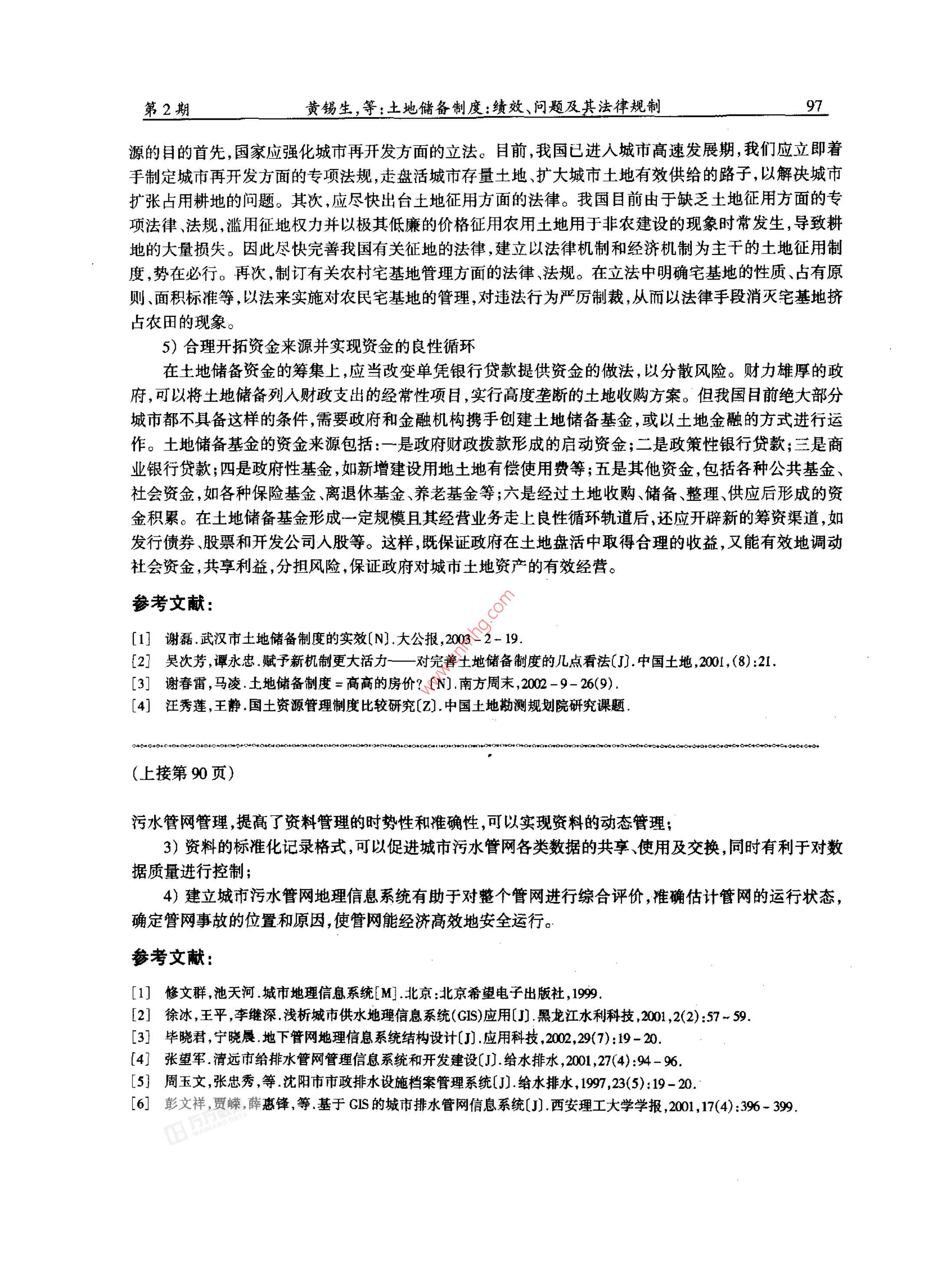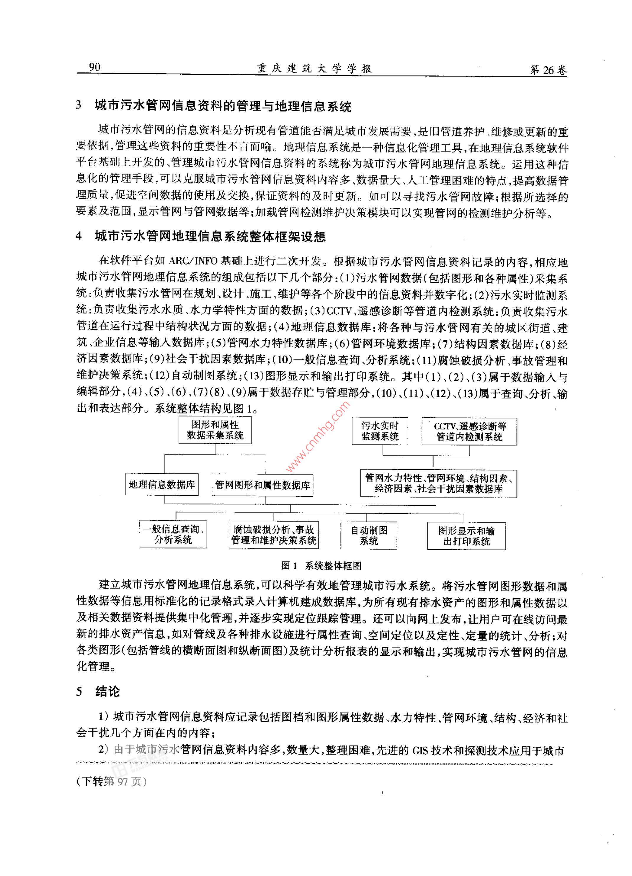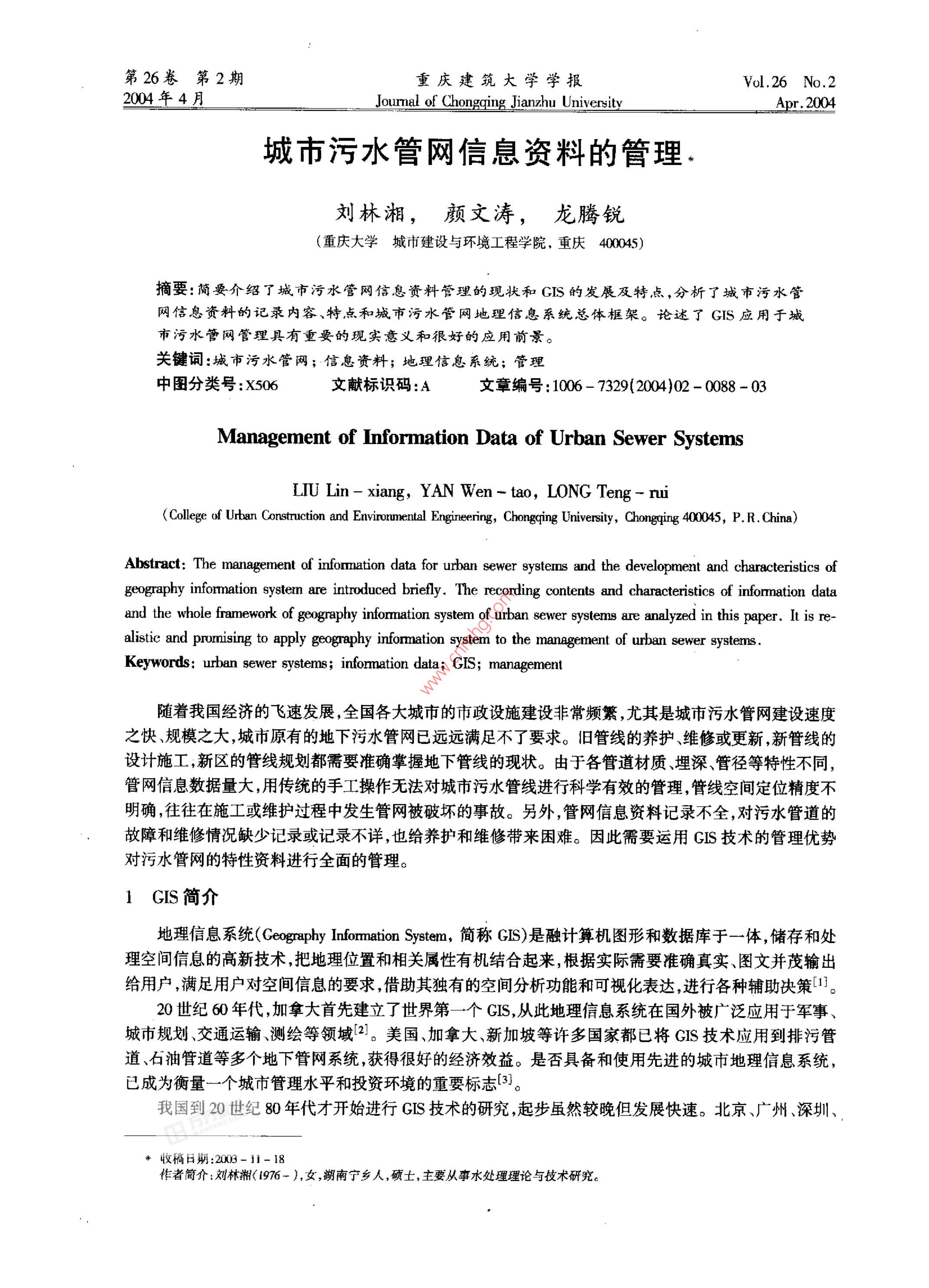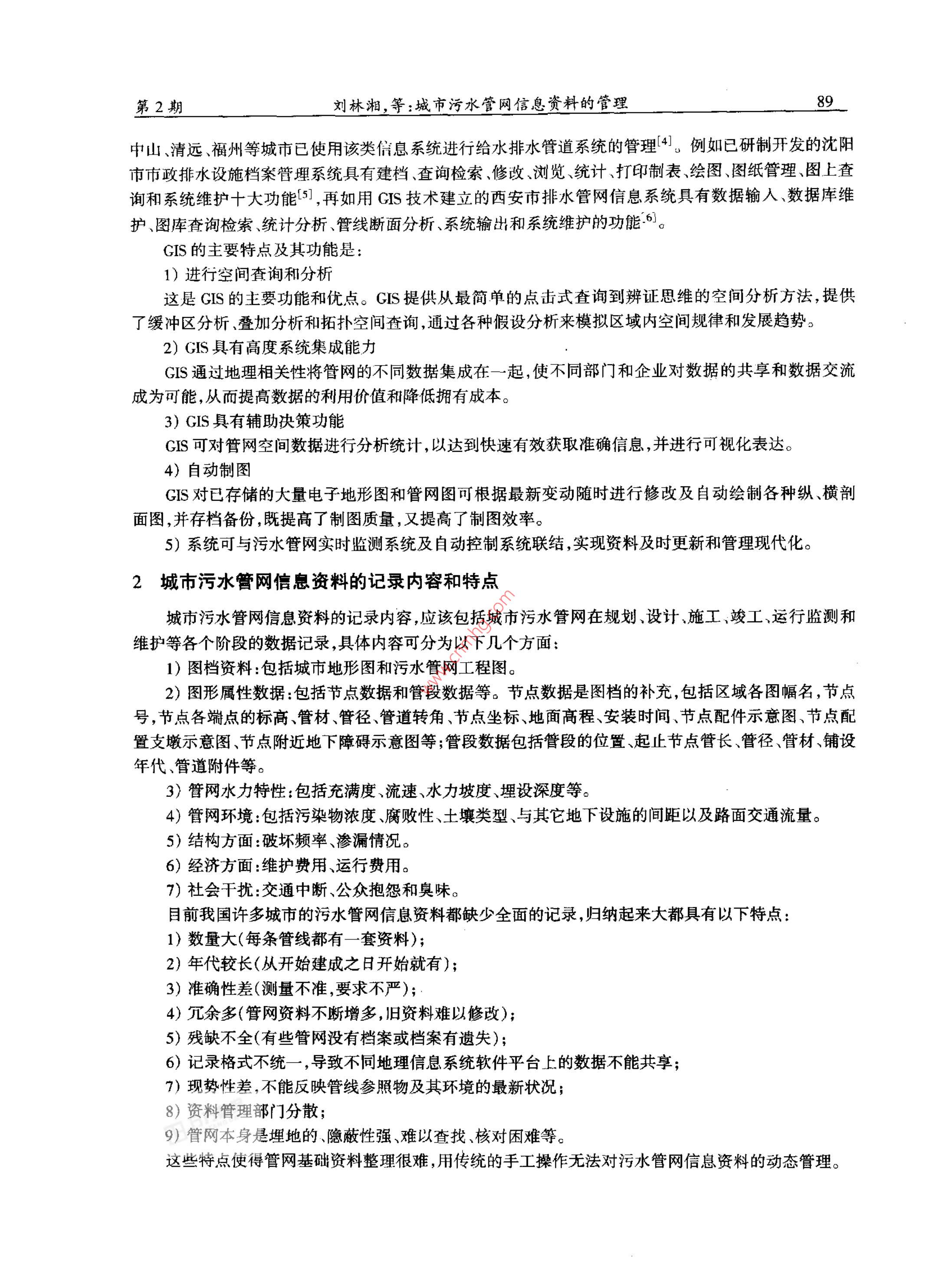 第26卷第2期重慶建筑大學(xué)學(xué)報(bào)Vol.26 No.22004年4月Joumal of Chonging Jianzhu UniversityApr .2004城市污水管網(wǎng)信息資料的管理.劉林湘,顏文濤,龍騰 銳(重慶大學(xué)城市建設(shè)與環(huán)境工程學(xué)院, 重慶400045)摘要:簡要介紹了城市污水管網(wǎng)信息資料管理的現(xiàn)狀和CIS的發(fā)展及特點(diǎn),分析了城市污水管網(wǎng)信息資料的記錄內(nèi)容、特點(diǎn)和城市污水管網(wǎng)地理信息系統(tǒng)總體框架。論述了GIS 應(yīng)用于城市污水管網(wǎng)管理具有重要的現(xiàn)實(shí)意義和很好的應(yīng)用前景。關(guān)鍵詞:城市污水管網(wǎng);信息資料;地理信息系統(tǒng);管理中圖分類號(hào):X506 ,文獻(xiàn)標(biāo)識(shí)碼:A文章編號(hào):1006 - 7329(2004)02 - 0088 - 03Management of Information Data of Urban Sewer SystemsLIU Lin- xiang, YAN Wen- tao, LONG Teng - rui(College of Urban Construction and Envirormental Engineering, Chongqing University, Chongqing 400045, P. R. China)Abstract: The management of infomation data for urban sewer systerms and the development and characteristics ofgeography information system are introduced briefly. The recording contents and characteristics of information dataand the whole framework of geography information system of urban sewer systems are analyzed in this paper. It is re-alistic and promising to apply geography information system to the management of urban sewer systems.Keywords: urban sewer systems ; infomation data; GIS; management隨著我國經(jīng)濟(jì)的飛速發(fā)展,全國各大城市的市政設(shè)施建設(shè)非常頻繁,尤其是城市污水管網(wǎng)建設(shè)速度之快、規(guī)模之大,城市原有的地下污水管網(wǎng)已遠(yuǎn)遠(yuǎn)滿足不了要求。舊管線的養(yǎng)護(hù),維修或更新,新管線的設(shè)計(jì)施工,新區(qū)的管線規(guī)劃都需要準(zhǔn)確掌握地下管線的現(xiàn)狀。由于各管道材質(zhì)埋深、管徑等特性不同,管網(wǎng)信息數(shù)據(jù)量大,用傳統(tǒng)的手工操作無法對城市污水管線進(jìn)行科學(xué)有效的管理,管線空間定位精度不明確,往往在施工或維護(hù)過程中發(fā)生管網(wǎng)被破壞的事故。另外,管網(wǎng)信息資料記錄不全,對污水管道的故障和維修情況缺少記錄或記錄不詳,也給養(yǎng)護(hù)和維修帶來困難。因此需要運(yùn)用GIS技術(shù)的管理優(yōu)勢對污水管網(wǎng)的特性資料進(jìn)行全面的管理。1GIS簡介地理信息系統(tǒng)(Geography Information System, 簡稱GIS)是融計(jì)算機(jī)圖形和數(shù)據(jù)庫于一體,儲(chǔ)存和處理空間信息的高新技術(shù),把地理位置和相關(guān)屬性有機(jī)結(jié)合起來,根據(jù)實(shí)際需要準(zhǔn)確真實(shí)、圖文并茂輸出給用戶,滿足用戶對空間信息的要求,借助其獨(dú)有的空間分析功能和可視化表達(dá),進(jìn)行各種輔助決策[1。20世紀(jì)60年代,加拿大首先建立了世界第-一個(gè)GIS,從此地理信息系統(tǒng)在國外被廣泛應(yīng)用于軍事、城市規(guī)劃、交通運(yùn)輸、測繪等領(lǐng)域[2]。美國、加拿大、新加坡等許多國家都已將GIS技術(shù)應(yīng)用到排污管道、石油管道等多個(gè)地下管網(wǎng)系統(tǒng),獲得很好的經(jīng)濟(jì)效益。是否具備和使用先進(jìn)的城市地理信息系統(tǒng),已成為衡量一個(gè)城市管理水平和投資環(huán)境的重要標(biāo)志[3]。我國到20世紀(jì)80年代才開始進(jìn)行GIS技術(shù)的研究,起步雖然較晚但發(fā)展快速。北京、廣州、深圳、*收稿日期:2003-11- 18作者簡介:劉林糊<1976- ),女,湖南寧鄉(xiāng)人,碩士,主要從事水處理理論與技術(shù)研究。.第2期劉林湘,等:城市污水管網(wǎng)信息資料的管理_89_中山、清遠(yuǎn)、福州等城市已使用該類信息系統(tǒng)進(jìn)行給水排水管道系統(tǒng)的管理[4)。例如已研制開發(fā)的沈陽市市政排水設(shè)施檔案管理系統(tǒng)具有建檔、查詢檢索、修改、瀏覽統(tǒng)計(jì)、打印制表、繪圖、圖紙管理、圖上查.詢和系統(tǒng)維護(hù)十大功能[5],再如用CIS技術(shù)建立的西安市排水管網(wǎng)信息系統(tǒng)具有數(shù)據(jù)輸人、數(shù)據(jù)庫維護(hù)、圖庫查詢檢索、統(tǒng)計(jì)分析、管線斷面分析、系統(tǒng)輸出和系統(tǒng)維護(hù)的功能。GIS的主要特點(diǎn)及其功能是:1)進(jìn)行空間查詢和分析這是GIS的主要功能和優(yōu)點(diǎn)。CIS提供從最簡單的點(diǎn)擊式查詢到辨證思維的空間分析方法,提供了緩沖區(qū)分析疊加分析和拓?fù)淇臻g查詢,通過各種假設(shè)分析來模擬區(qū)域內(nèi)空間規(guī)律和發(fā)展趨勢。2)GIS具有高度系統(tǒng)集成能力GIS通過地理相關(guān)性將管網(wǎng)的不同數(shù)據(jù)集成在一起,使不同部門和企業(yè)對數(shù)據(jù)的共享和數(shù)據(jù)交流成為可能,從而提高數(shù)據(jù)的利用價(jià)值和降低擁有成本。3)GIS具有輔助決策功能GIS可對管網(wǎng)空間數(shù)據(jù)進(jìn)行分析統(tǒng)計(jì),以達(dá)到快速有效獲取準(zhǔn)確信息,并進(jìn)行可視化表達(dá)。4)自動(dòng)制圖GIS對已存儲(chǔ)的大量電子地形圖和管網(wǎng)圖可根據(jù)最新變動(dòng)隨時(shí)進(jìn)行修改及自動(dòng)繪制各種縱、橫剖面圖,并存檔備份,既提高了制圖質(zhì)量,又提高了制圖效率。5)系統(tǒng)可與污水管網(wǎng)實(shí)時(shí)監(jiān)測系統(tǒng)及自動(dòng)控制系統