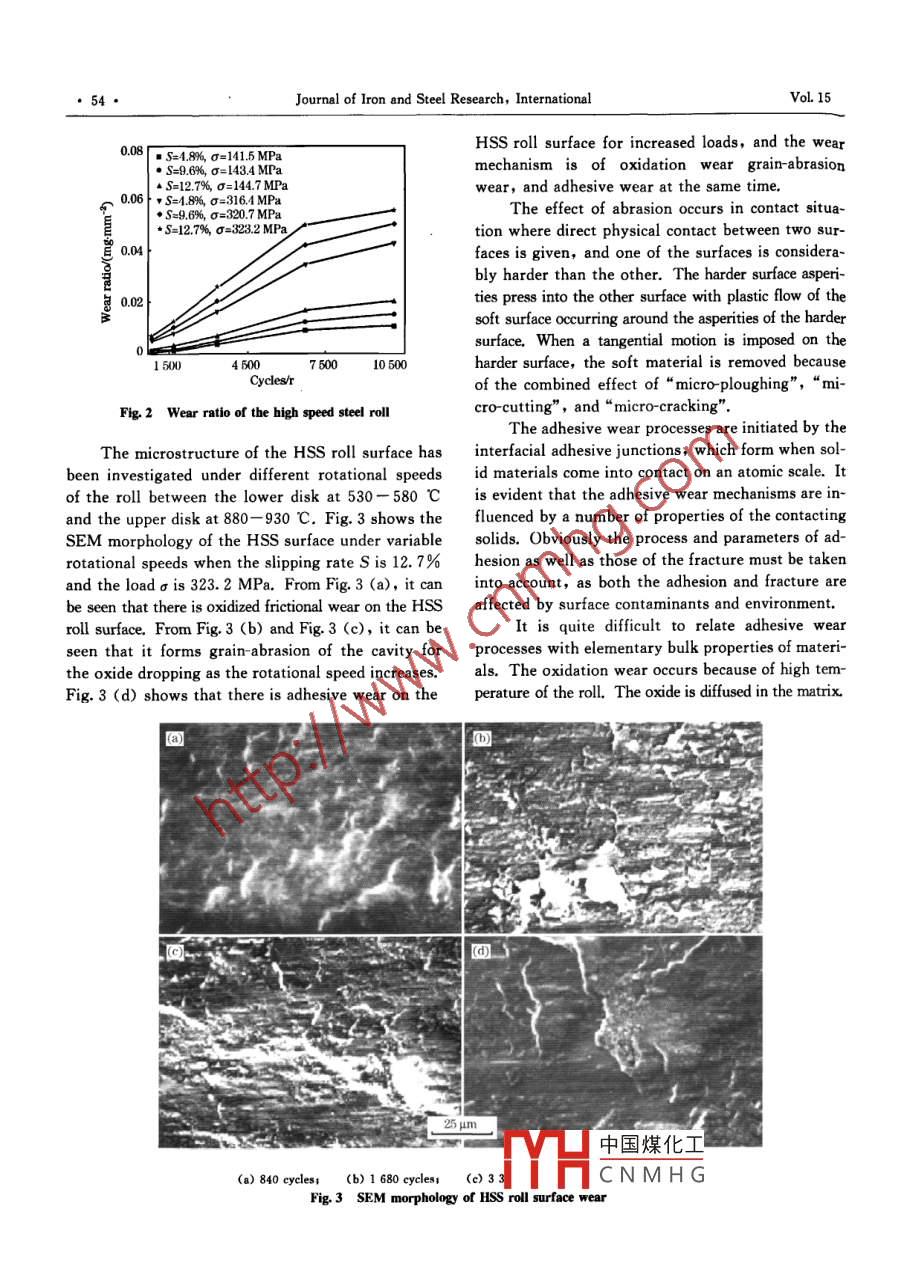 Available online at www.sciencedirect.comScienceDirectJOURNAL OF IR0N AND STEEI. RESEARCH, INTERNATIONAL. 2008, 15(6); 52-55New Method for Evaluating Thermal Wear of Rolls in Rolling ProcessLI Chang-sheng, LIU Xiang-hua, WANG Guo-dong(State Key Laboratory of Rolling and Automation, Northeastern University, Shenyang 10004, Liaoning, China)Abstract: A new method was developed by a thermal wear machine to evaluate the thermal wear of rolls in steel roll-ing process. The steel strip and rolls were simulated by upper and lower heating disks. The upper heating disk couldbe kept at a temperature of over 900 C by induction heating. The pressure between the disks as high as 323.2 MPacould be achieved and the slpping rate could be 12. 7%. The thermal wear of high speed steel (HSS) roll material, the wearrate of the HSS rll, and the SEM morphology of a worn HSS roll surface were investigated. This method was usefuland could be employed to simulate friction and wear between strip and roll during the strip rolling process.Key words; thermal wear; roll; friction; strip rolling; induction heatingThe roll is one of the most important tools in However, this equipment was a mill and the work-the rolling process. Its surface may get worn out be-piece that needed to be heated and rolled for stud-cause of the relative slip between the roll surface andying the frictional wear. Thus, for some workpieces,steels for the fast changes in both rolling force andit was almost impossible to study the wear under differ-temperature. In designing and calculating the wearent slipping rate and load for a long period.crown of rolls, the roll wear is a very important fac-In this paper, the thermal wear test method istor and has to be taken into consideration, as it candeveloped, which is a disk-like machine. The upperreduce the difficulty in controlling steel shape andand lower disks are used to simulate the workpieceincrease the accuracy in the calculation model of theand the roll, respectively. The upper disk can beroll wear crown. Furthermore, the wear of the rollheated up to 900 C through an induction coil. Thsurface will directly affect the surface quality ofload can be exerted as high as 323. 2 MPa betweensteel. Therefore, it is significant to develop an appro-disks, and the maximum slippage ratio is 12. 7%.priate method to evaluate the roll wear and to study the1 Principlemechanism of roll wear based on friction theory.To date, many studies have been carried out con-To evaluate the thermal wear of rolls, a newcerning roll wear. For example, Kato'1] developed atest machine was developed, which was disk-like onthermal wear equipment, which is a disk- shaped ma-the basis of the 2-high φ160 mm mill, The disk,chine. However, it is difficult to simulate the weardrive shaft, bearing block, and forcing equipmentbetween steel and roll during the rolling process, aswere designed and manufactured, and the inductionthe disk is small and thin, and the load is not veryheating equipment was designed with a special shapelarge. Guo et alL2] and Li et al(3] studied the thermalto heat the upper disk where the temperature couldwear attribution of wear-resistant materials 9Cr2reach higher than 900 C. The upper and lower disksand 3Cr2W8V, and the thermal wear equipmentcould be used to simulate the workpiece and the rollsthey used was a pin-disk machine, which could notduring hot rolling, respectively. The ratio of thebe used to simulate the thermal wear of the roll. Li-slip between disks could be determined by the for-aoleJ used a small mill to roll the wire and studiedward slip. The lower disk with different embeddedthe thermal wear of the roll with high Cr cast iron,mate中國(guó)煤化,工tudy the wear of the.Foundation Item :Item Sponsored by National Natural Science Foundation of ChinaMYHCNMHGBlography: LI Chang-sheng(1964-), Male, Doctor, Professort E-mail: lics@ral neu. edu. cn; Revised Date; June 3, 2007Issue 6New Method for Evaluating Thermal Wear of Rolls in Rolling Process,53●roll under some rlling condition.The original 2-high $160 mm mill consists ofmotor-driven equipment, a reducer, and junctor.The devices to be designed are disk, shaft, bearingblock, forcing equipment, balancing spring, end3cap, cushion ring, junction box, back plate, and soon. The high- frequency induction equipment is de-signed as a special heating mode. (1) The dimensionof the upper disk is φ160 mmX 30 mm and that ofthe lower disk is φ160 mmX 50 mm. The disk mate-rial is 45 steel and the dimension of the experimentalroll material is $10 mmX 10 mm, which is embeddedon the periphery of the lower disk. (2) The materialof the drive shaft is 40Cr steel which is hollow for1- High frequency power source; 2- -Induction heater;water cooling. The bearing block, the forcing equip-3 Upper disk; 4- -Lower disk;ment, and the balancing spring are also designed.5 Water box; 6- Water pumpFor this purpose, the GP10-C1 high-frequencyFig 1 Schematic ilustration of thermal wear testerinduction apparatus is employed, and the inductionpower source and the parameters are listed in Table 1.conductor material is T1 or T2 pure copper tube andThe surface of the inverse upper disk is heated the dimension is中10 mmX1 mm.by the GP10 C1 induction power source according to2 Experimentalthe theory of skin effect of electromagnetic inductionheating. The induction coil is specially designed as aTo test the validity of the machine perform-semicircle for a continuous heating of the inverse up- ance, roll material of high speed steel (HSS) wasper disk. The experimental setup for testing thermalembedded in the lower disk[5- 門]。 The chemical com-wear including the heater and water cooling system position of the roll material ( mass percent) is listedof the disks is schematically ilustrated in Fig. 1. Thein Table 2. The original hardness of the experimen-tal material was HRC 51.3 measured by HR-150ATable 1 Parameters of GP10-C1 high-frequencyRockwell hardometer.induction apparatusThe 