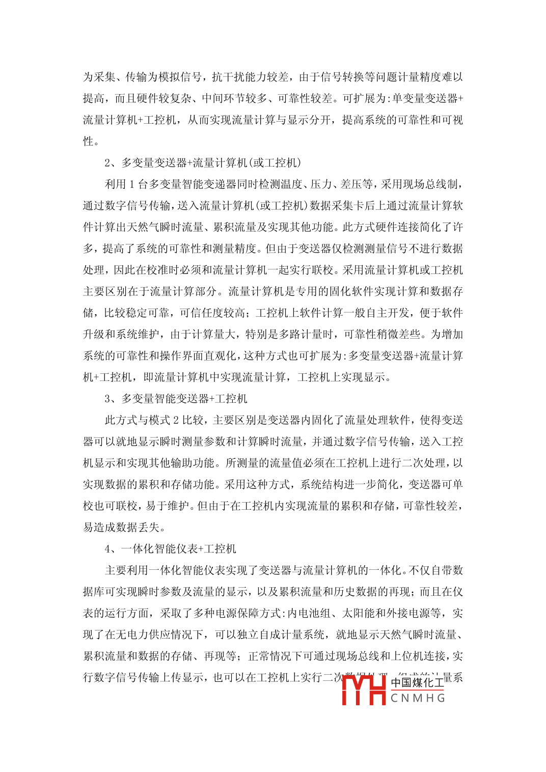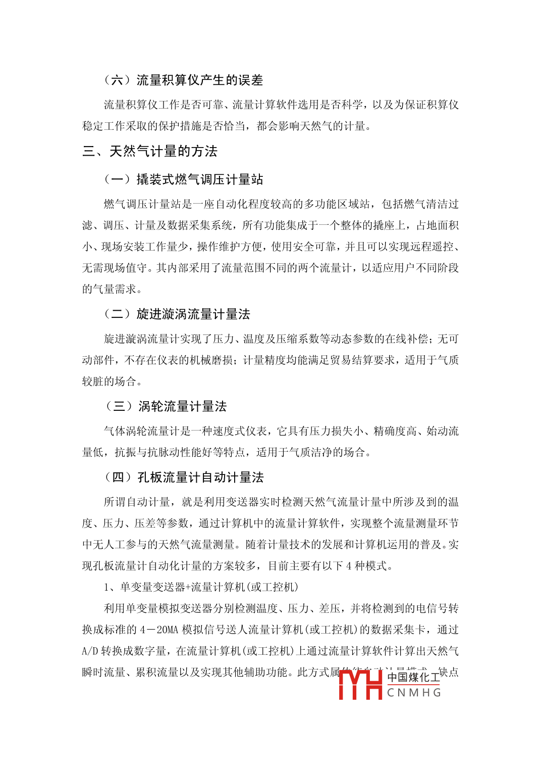 天然氣計量方法探析李毅益陽市城市建筑設(shè)計有限責任公司湖南益陽413000摘要:天然氣工業(yè)在我國發(fā)展迅猛,天然氣的生產(chǎn)、輸送、銷售各環(huán)節(jié)之間的商業(yè)活動都要以計量為依據(jù),天然氣計量的準確度至關(guān)重要。因此,選擇合理的流量計量方法,以保證計量準確度并有一套行之有效的計量管理體系,使企業(yè)獲得良好的社會效益和經(jīng)濟效益,具有典型的現(xiàn)實意義。本文主要探討了影響天然氣計量精度的因素,并對天然氣計量的方法進行了詳細闡述。關(guān)鍵詞:天然氣;流量;計量;孔板;精度Abstract: the fast development of gas industry in China, natural gas production, transportation,ales, commercial activities between each link should be based on measurement, gas meteringccuracy is crucial. So, choose the reasonable flow measurement methods, so as to ensure theccuracy of measuring and a set of effective measurement management system, make theenterprise to get good social benefit and economic benefit, is a typical practical significance. Thispaper mainly discusses the influence factors of natural gas measurement accuracy, this paperexpounds in detail and the method of natural gas measurementKey words: natural gas; Flow; Measurement; Orifice plate; precision中圖分類號:473,2+4文獻標識碼:A文章編號:2095-2104(2013)、天然氣計量發(fā)展的趨勢天然氣作為一種優(yōu)質(zhì)能源和化工原料,其計量越來越被人們重視。雖然我國天然氣計量起步較晚,但這些年已經(jīng)在天然氣儀表的設(shè)計選型、使用、安裝、維護、管理、氣質(zhì)分析等方面作了相應(yīng)的工作,得出了一些重要的結(jié)論,取得了些成果。隨著環(huán)境和要求發(fā)生新的變化,我國的天然氣計量在以下幾方面取得了進展。根據(jù)相關(guān)部門的統(tǒng)計結(jié)果顯示,2010年我國用于天然氣計量的器具為1900多臺,而2015年將可能達到5600多臺;過去,流量儀表選型比較單一,近幾年隨著對流量計的研究和開發(fā),不同的流量計有不同H中國煤化工量儀CNMHG表選型由此呈現(xiàn)從單一儀表向多元化儀表方向發(fā)展,一些新型的流量計,如高中壓、大流量干線超聲流量計將得到廣泛運用;我國目前的天然氣貿(mào)易計量方法主要還是在法定的質(zhì)量指標下按體積計量,隨著市場經(jīng)濟的不斷完善和與國外天然氣交易量的增加,要求我國天然氣貿(mào)易計量方法盡快與國際接軌,實行能量計量結(jié)算,而據(jù)介紹,我國天然氣能量計量的標準已經(jīng)制定完成,國家可能即將推行按能量計量的貿(mào)易結(jié)算方式;另外,完善天然氣計量校準系統(tǒng),擴大流量校準口徑,改建成都分站,擴大校準能力也將成為我國天然氣計量的一大發(fā)展趨勢影響天然氣計量精度的因素分析(一)節(jié)流裝置本身產(chǎn)生的誤差如設(shè)計計算時偏離實際常用流量,偏離實際流體特性??装寮庸r由于各種原因?qū)е氯肟谥苯卿J利度不夠、孔板厚度誤差、節(jié)流件附件產(chǎn)生臺階、偏心、孔板上游端面水平度、孔板的圓度等影響其精度??装迨褂靡欢螘r間后,發(fā)生彎曲變形、上游測量管沉積臟物、上游端面沉積臟物、孔板入口直角邊緣變鈍,破損等也會影響計量精度。(二)孔板閥產(chǎn)生的誤差流量計的節(jié)流孔板是安裝在孔板閥當中,由于存在泄漏,會導(dǎo)致不同程度的誤差。對此應(yīng)加強孔板閥的維護保養(yǎng),及時發(fā)現(xiàn)及時解決。在條件允許的情況下,每隔一定周期對孔板閥進行全面清洗維護,使孔板閥工作在最佳狀態(tài)(三)安裝引起的誤差計量裝置安裝中造成的節(jié)流件不同軸度、取壓位置、焊接、焊縫突出、取壓孔加工不規(guī)范或堵塞、導(dǎo)壓管的不規(guī)范等造成的安裝誤差是普遍性的。(四)直管段引起的誤差孔板前后的直管段,其長度和管道內(nèi)壁的粗糙度,平直度、圓度等必須符合定的要求。管道投入使用后,由于污物沉積和長期沖刷會產(chǎn)生計量誤差。(五)現(xiàn)場儀表產(chǎn)生的誤差儀表精度、回差、線性度、量程等不可避免的會產(chǎn)生計量誤差;另外由于現(xiàn)場工作條件惡劣,儀表會產(chǎn)生零漂和溫漂。中國煤化工CNMHG(六)流量積算儀產(chǎn)生的誤差流量積算儀工作是否可靠、流量計算軟件選用是否科學,以及為保證積算儀穩(wěn)定工作采取的保護措施是否恰當,都會影響天然氣的計量。三、天然氣計量的方法(一)撬裝式燃氣調(diào)壓計量站燃氣調(diào)壓計量站是一座自動化程度較高的多功能區(qū)域站,包括燃氣淸潔過濾、調(diào)壓、計量及數(shù)據(jù)采集系統(tǒng),所有功能集成于一個整體的撬座上,占地面積小、現(xiàn)場安裝工作量少,操作維護方便,使用安全可靠,并且可以實現(xiàn)遠程遙控、無需現(xiàn)場值守。其內(nèi)部采用了流量范圍不同的兩個流量計,以適應(yīng)用戶不同階段的氣量需求。(二)旋進漩渦流量計量法旋進漩渦流量計實現(xiàn)了壓力、溫度及壓縮系數(shù)等動態(tài)參數(shù)的在線補償;無可動部件,不存在儀表的機械磨損;計量精度均能滿足貿(mào)易結(jié)算要求,適用于氣質(zhì)較臟的場合(三)渦輪流量計量法氣體渦輪流量計是一種速度式儀表,它具有壓力損失小、精確度髙、始動流量低,抗振與抗脈動性能好等特點,適用于氣質(zhì)潔凈的場合。(四)孔板流量計自動計量法所謂自動計量,就