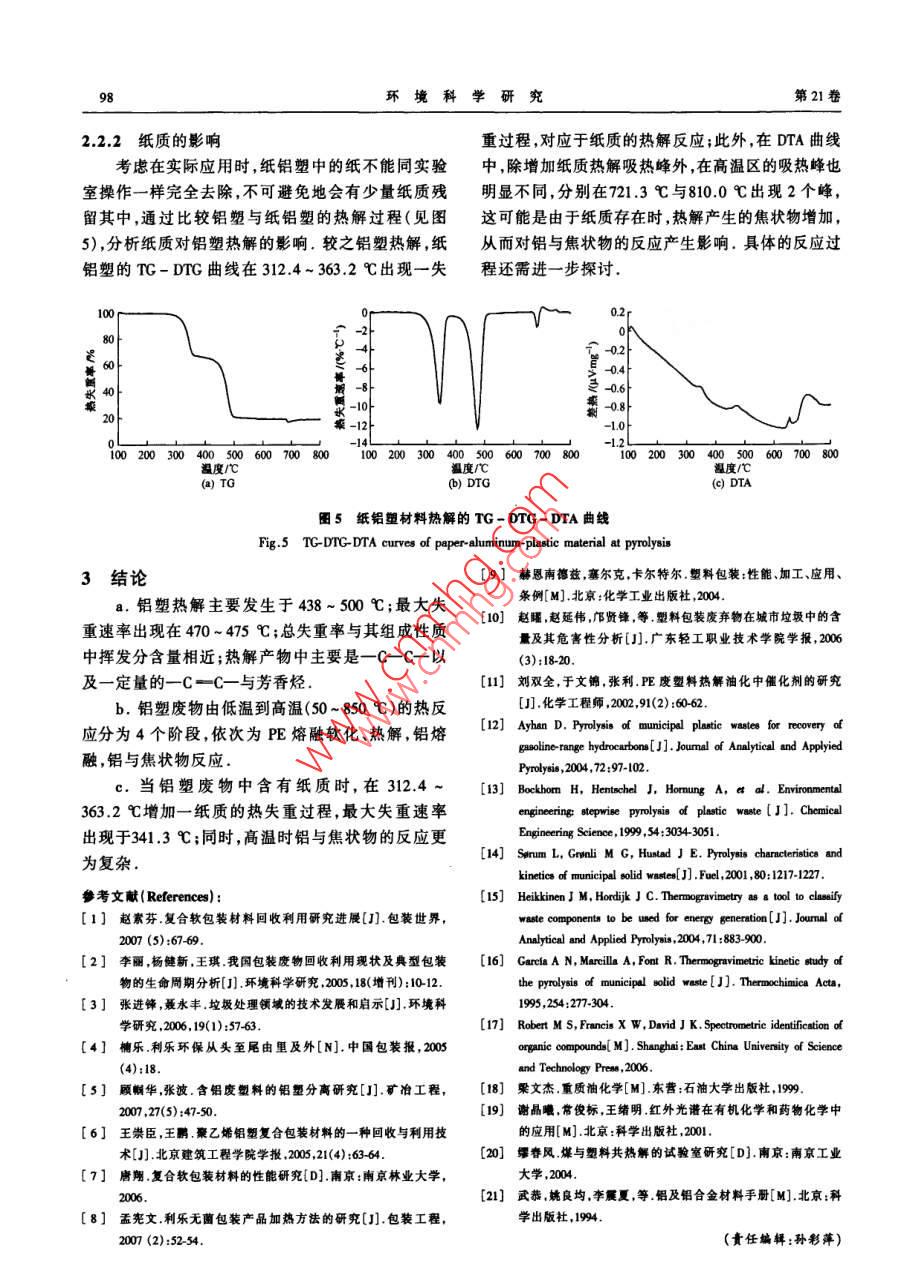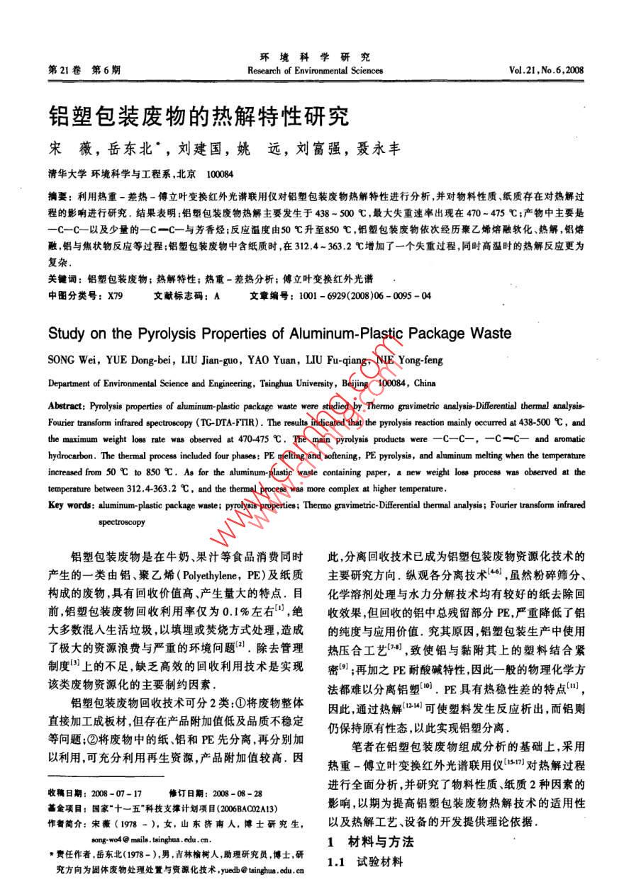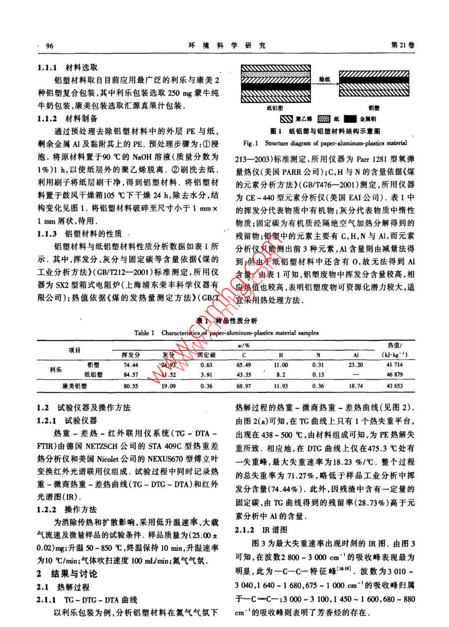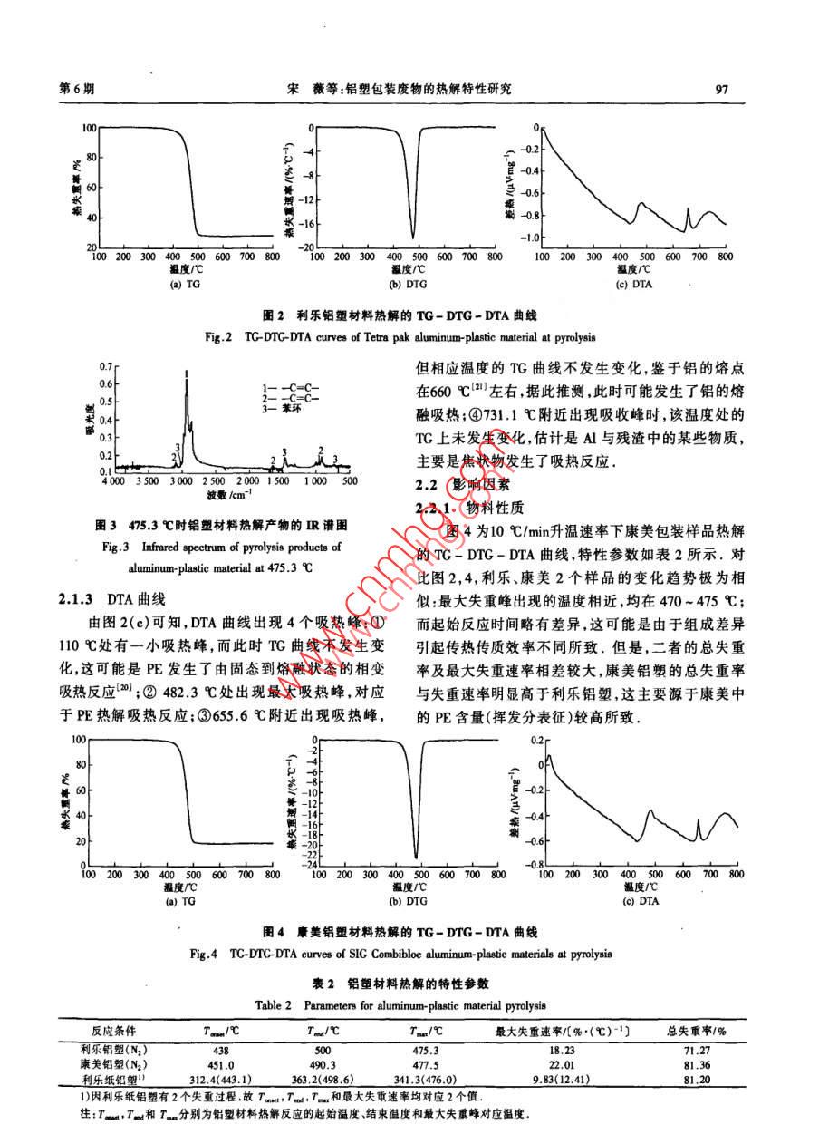環(huán)境科學(xué)研究第21卷第6期Research of Environmental SciencesVol.21,No.6,208鋁塑包裝廢物的熱解特性研究宋薇,岳東北",劉建國,姚遠,劉富強,聶永豐清華大學(xué)環(huán)境科學(xué)與工程系,北京10084摘要:利用熱重-差熱-傅立葉變換紅外光講聯(lián)用儀對鋁塑包裝廢物熱解特性進行分析,并對物料性質(zhì)、紙質(zhì)存在對熱解過程的影響進行研究,結(jié)果表明:鋁塑包裝廢物熱解主要發(fā)生于438 - 500 C ,最大失重速率出現(xiàn)在470-475 C;產(chǎn)物中主要是-C-C- -以及少量的一C一C- -與芳香烴;反應(yīng)溫度由50 C升至850 C ,鋁塑包裝廢物依次經(jīng)歷聚乙烯熔融軟化、熱解,鋁熔融,鋁與焦狀物反應(yīng)等過程;鋁塑包裝廢物中含紙質(zhì)時,在312.4~363.2C增加了一個失重過程,同時高溫時的熱解反應(yīng)更為復(fù)雜關(guān)鍵詞:鋁塑包裝廢物;熱解特性;熱重-差熱分析;傅文葉變換紅外光譜中圖分類號: X79 :文獻標志碼: A文章編號: 1001 - 6929(2008)06 - 0095-04Study on the Pyrolysis Properties of Aluminum-Plastic Package WasteSONG Wei, YUE Dong-bei, LIU Jian-guo, YA0 Yuan, LIU Fu-qiang, NIE Yong fengDepartment of Environmental Science and Engineering, Teinghua University, Beijing 100084, ChinaAbstract: Pyrolysis properties of ahuminum- plastic package waste were studied by Thermno gravimetric analyeis- Diferential thernal analyeis-Fourier transform infrared spectroecopy (TC-DTA-FTTR) . The results indicated that the pyrolysis reaction mainly ocurred at 438-500 C, andthe maximum weight loss rate was observed at 470-475 C,The main pyrolyeis products were - -C- -C-,一-C- -C- and Bromatichydrocarbon. The thermal proceas included four phases: PE meling and sfening, PE pyrolysis, and aluminum melting when the temperatureincreased from 50 C to 850 C. As for the aluminum-plastic wastle containing paper, 8 new weighit loss process was observed at thetemperaturebetween 312.4-363.2 C , and the thermal process was more complex at higher temperature.Key words; aluminum plastic package waste; prolysis propertie; Thermo garinticiferenial thermal analysis; Fourier transform infraredspectoscopy鋁塑包裝廢物是在牛奶、果汁等食品消費同時此,分離回收技術(shù)已成為鋁塑包裝廢物資源化技術(shù)的產(chǎn)生的一-類由鋁、聚乙烯(Polyethylene,PE)及紙質(zhì)主要研究方向.縱觀各分離技術(shù)(46) ,雖然粉碎篩分、構(gòu)成的廢物,具有回收價值高、產(chǎn)生量大的特點,目化學(xué)溶劑處理與水力分解技術(shù)均有較好的紙去除回前,鋁塑包裝廢物回收利用率僅為0.1%左右”,絕收效果,但回收的鋁中總殘留部分PE,嚴重降低了鋁大多數(shù)混入生活垃圾,以填埋或焚燒方式處理,造成的純度與應(yīng)用價值.究其原因,鋁塑包裝生產(chǎn)中使用了極大的資源浪費與嚴重的環(huán)境問題[2).除去管理熱壓合工藝1248 ,致使鋁與黏附其上的塑料結(jié)合緊制度()上的不足,缺乏高效的回收利用技術(shù)是實現(xiàn)密[9] ;再加之PE耐酸堿特性,因此一般的物理化學(xué)方該類廢物資源化的主要制約因索.法都難以分離鋁塑[0].PE具有熱穩(wěn)性差的特點",鋁塑包裝廢物回收技術(shù)可分2類:①將廢物整體因此,通過熱解1241)可使塑料發(fā)生反應(yīng)析出,而鋁則直接加工成板材,但存在產(chǎn)品附加值低及品質(zhì)不穩(wěn)定仍保持原有性態(tài),以此實現(xiàn)鋁塑分離.等問題;②將廢物中的紙、鋁和PE先分離,再分別加筆者在鋁塑包裝廢物組成分析的基礎(chǔ)上,采用以利用,可充分利用再生資源,產(chǎn)品附加值較高.因熱重-傅立葉變換紅外光譜聯(lián)用儀1511對熱解過程進行全面分析,并研究了物料性質(zhì)、紙質(zhì)2種因素的收稿日期: 2008-07-17修訂日期: 2008-08-28影響,以期為提高鋁塑包裝廢物熱解技術(shù)的適用性基金項目:國家“+一五"科技支撐計劃項目(2006BAC02A13)作者簡介:宋薇(1978 - ),女,山東資南人,博士研究生,以及熱解工藝、設(shè)備的開發(fā)提供理論依據(jù).8ong- wo4 @ mails. tsinghus . edu .cn.1材料與方法,責任作者.岳東北(1978-),男,吉林榆樹人,助理研究員,博士,研1.1試驗材料究方向為固體廢物處理處置與資源化技術(shù)yuedb@ wingu. edu.cn96環(huán)境科學(xué)研究第21卷1.1.1材料選取鋁塑材料取自目前應(yīng)用最廣泛的利樂與康美2紙種鋁塑復(fù)合包裝,其中利樂包裝選取250 mg蒙牛純牛奶包裝,康美包裝選取匯源真果汁包裝.紙鋁塑鋁量1.1.2材料制備聚乙烯紙II■金局鋁.通過預(yù)處理去除鋁塑材料中的外層PE與紙,圖1 紙鋁塑與鋁塑材料結(jié)構(gòu)示意圖剩余金屬Al 及黏附其上的PE.預(yù)處理步驟為:①浸Fig.1 Structure diagram of paper-aluminum. plastics material泡.將原材料置于90 C的NaOH溶液(質(zhì)量分數(shù)為213- -2003)標準測定,所用儀器為Parr 1281型氧彈1%)1 h,以使紙層外的聚乙烯脫離.②刷洗去紙.量熱儀(美國PARR公司);C,H與N的含量依據(jù)《煤利用刷子將紙層刷干凈,得到鋁塑材料.將鋁塑材的元素分析方法》(GB/T476- -2001 )測定,所用儀器料置于鼓風干燥箱105 C下干燥24 h,除去水分,結(jié)為CE-440型元素分析儀(美國EAI公司).表1中構(gòu)變化見圖1.將鋁塑材料破碎至尺寸小于1 mmx的揮發(fā)分代表物質(zhì)中有機物;灰分代表物質(zhì)中惰性1mm屑狀,待用.物質(zhì);固定碳為有機質(zhì)經(jīng)隔絕空氣加熱分解得到的1.1.3鋁塑材料的性 質(zhì)殘留物;鋁塑中的元素主要有C,H,N與Al,而元素鋁塑材料與紙鋁塑材料性質(zhì)分析數(shù)據(jù)如表1所分析儀只能測