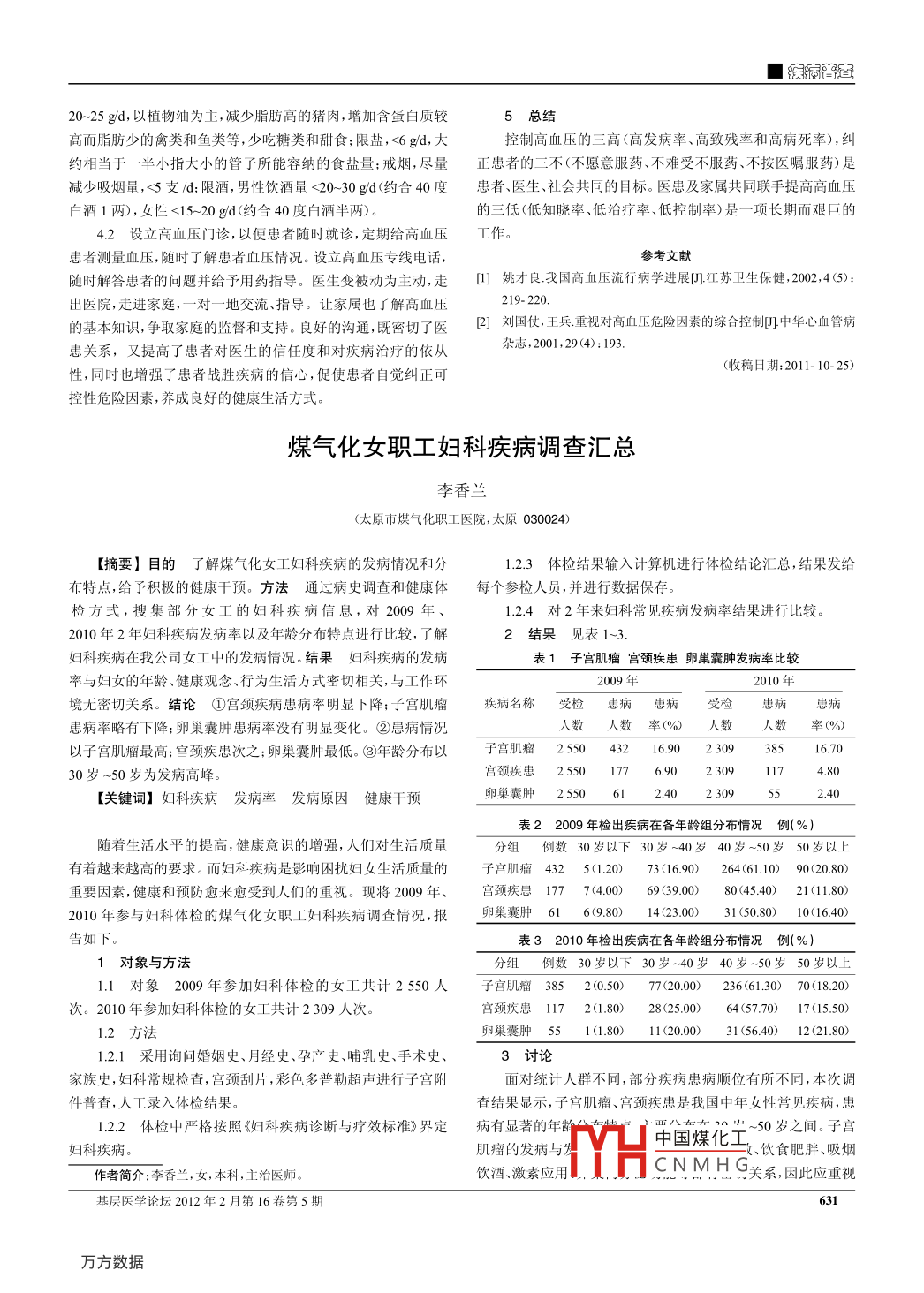 III疾病普查20~25gd,以植物油為主,減少脂肪高的豬肉,增加含蛋白質(zhì)較5總結(jié)高而脂肪少的禽類和魚類等,少吃糖類和甜食;限鹽,<6gd,大控制高血壓的三高(高發(fā)病率、高致殘率和高病死率),糾約相當于一半小指大小的管子所能容納的食鹽量:戒煙,盡量正 患者的三不(不愿意服藥、不難受不服藥、不按醫(yī)囑服藥)是減少吸煙量,<5支/d;限酒,男性飲酒量<20~30g/d(約合40度患者、醫(yī)生、社會共同的目標。醫(yī)患及家屬共同聯(lián)手提高高血壓白酒1兩),女性<15-~20 gd(約合40度白酒半兩)。的三低(低知曉率、低治療率、低控制率)是一項長期而艱巨的4.2設(shè)立高血壓門診,以便患者隨時就診,定期給高血壓工作。患者測量血壓,隨時了解患者血壓情況。設(shè)立高血壓專線電話,參考文獻隨時解答患者的問題并給予用藥指導。醫(yī)生變被動為主動,走0] 姚才 良,我國高血壓流行病學進展四江蘇衛(wèi)生保健,2002,4(5):出醫(yī)院,走進家庭,一-對- -地交流指導。讓家屬也了解高血壓219- 220.的基本知識,爭取家庭的監(jiān)督和支持。良好的溝通,既密切了醫(yī)[2]劉國仗,王兵重視對高血壓危險因素的綜合控制[D]中華心血管病雜志2001, 29(4):193.患關(guān)系,又提高了患者對醫(yī)生的信任度和對疾病治療的依從(收稿日期:2011- 10- 25)性,同時也增強了患者戰(zhàn)勝疾病的信心,促使患者自覺糾正可控性危險因素,養(yǎng)成良好的健康生活方式。煤氣化女職工婦科疾病調(diào)查匯總李香蘭(太原市煤氣化職工醫(yī)院,太原030024)[摘要]目的了 解煤氣化女工婦科疾病的發(fā)病情況和分1.2.3體檢結(jié)果輸入計算機進行體檢結(jié)論匯總,結(jié)果發(fā)給布特點,給予積極的健康干預。方法通過病史調(diào)查和健康體每個參檢人員,并進行數(shù)據(jù)保存。檢方式,搜集部分女工的婦科疾病信息,對2009年、1.2.4對2年來婦科常見疾病發(fā)病率結(jié)果進行比較。2010年2年婦科疾病發(fā)病率以及年齡分布特點進行比較,了解2結(jié)果見表1~3.婦科疾病在我公司女工中的發(fā)病情況。結(jié)果婦科疾病 的發(fā)病表1子宮肌瘤 宮頸疾患卵巢囊腫發(fā)病率比較率與婦女的年齡、健康觀念、行為生活方式密切相關(guān),與工作環(huán)2009 年2010年境無密切關(guān)系。結(jié)論①宮頸疾病患病 率明顯下降;子宮肌瘤疾病名稱受檢 患病 患病受檢患病患病率略有下降;卵巢囊腫患病率沒有明顯變化。②患病情況數(shù)人數(shù)率(%) 人數(shù).人數(shù)率(%).以子宮肌瘤最高;宮頸疾患次之;卵巢囊腫最低。③年齡分布以子宮肌瘤2550 432 16.90230938516.7030歲~50歲為發(fā)病高峰。宮頸疾患2550 177 6.902 3091174.80[關(guān)鍵詞]婦科疾病發(fā)病率發(fā)病原因 健康干預卵巢囊腫2550402.40表22009 年檢出疾病在各年齡組分布情況例(%)隨著生活水平的提高,健康意識的增強,人們對生活質(zhì)量分組例數(shù) 30歲以下30歲-40歲 40歲~50歲 50歲以上有著越來越高的要求。而婦科疾病是影響困擾婦女姓活質(zhì)量的子宮肌瘤432 5(.20)73(16.90)264(61.10) 90(20.80)重要因素,健康和預防愈來愈受到人們的重視?,F(xiàn)將2009年、宮頸疾患177 7(4.00) 69(39.00) 80(45.40) 21(11.80)2010年參與婦科體檢的煤氣化女職工婦科疾病調(diào)查情況,報卵巢囊腫61 6(9.80)14 (23.00)31 (50.80) 10(16.40)告如下。表32010 年檢出疾病在各年齡組分布情況例( %)1對象與方法分組例數(shù)30歲以下30歲~40歲 40歲~50歲 50歲以上1.1 對象2009年參加婦科體檢的女工共計2550人子宮肌瘤385 2 (0.50)77 (20.00)236(61.30) 70(18.20)欠。2010年參加婦科體檢的女工共計2309人次。宮頸疾患1172(1.80)28 (25.00)64(57.70) 17(15.50)1.2 方法卵巢囊腫5:1(1.8C11(20.00) 31 (56.40) 12(21.80)1.2.1 采用詢問婚姻史、月經(jīng)史、孕產(chǎn)史、哺乳史、手術(shù)史、3 討論家族史,婦科常規(guī)檢查,宮頸刮片,彩色多普勒超聲進行子宮附面對統(tǒng)計人群不同,部分疾病患病順位有所不同,本次調(diào)件普查,人工錄入體檢結(jié)果。查結(jié)果顯示,子宮肌瘤、宮頸疾患是我國中年女性常見疾病,患1.2.2體檢中嚴格按照《婦科疾病診斷與療效標準》界定病有顯著的年齡分布背上中國煤化工50歲之間。子宮婦科疾病。肌瘤的發(fā)病與、飲食肥胖、吸煙作者簡介:李香蘭,女,本科,主治醫(yī)師。飲酒、激素應用MYHCN M H G關(guān)系,因此應重視基層醫(yī)學論壇2012年2月第16卷第5期631■疾病普查這個年齡段人群的健康教育和健康管理,提高女職工生活質(zhì)不 良的生活方式,注意健康教育,提高女職工對婦科疾病的知量曉率和自我保健能力,從而有效預防和降低婦科疾病的發(fā)生。今后的醫(yī)療服務(wù)模式應以預防保健為中心,提供全面良好(收稿日期:2011- 08- 05)的服務(wù),在女性朋友中開展健康講座,宣傳健康保健知識,改變■經(jīng)驗休會妊娠合并尖銳濕疣治療體會李家旭左小燕(紫陽縣人民醫(yī)院,陜西紫陽725300)[摘要]目的討論妊娠合并尖銳濕疣(CA)治療方法。方2.1 治療結(jié)果 經(jīng)7d~28 d治療所有患者治愈,后觀察法小疣體用 30%~ 40%的三氯醋酸局部用藥,疣體較大時采12周有 12例復發(fā), 復發(fā)者繼續(xù)治療。 足月時仍復發(fā)者行剖宮用CO2激光治療。結(jié)果經(jīng)過治療所有患者均治愈,后觀察產(chǎn)術(shù)結(jié)束分娩。12周有12例復發(fā),復發(fā)者繼續(xù)治療。足月時仍復發(fā)