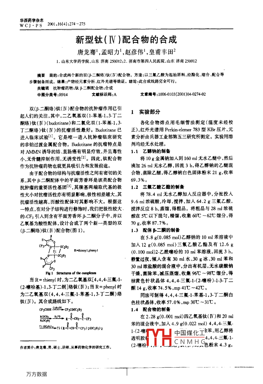 華西藥學雜志2001 ,16(4):274 ~ 275WC]. PS新型鈦(IV )配合物的合成唐龍騫',孟昭力,趙彥偉',皇甫豐田21.山東大學藥學院,山東濟南250012;2.濟南市第四人民醫(yī)院,山東濟南250012摘要目的:合成兩個新的雙(β二酮絡(luò))鈦(IV)配合物。 方法:以三氟乙酸為起始原料,經(jīng)酯化,縮合、配合等步驟制備而成。結(jié)果:產(chǎn)物經(jīng)元素分析、紅外光譜等確證。結(jié)論:此合成線路完全可行。關(guān)鍵詞抗腫瘤藥物;鈦 β二酮配合物;合成中圈分類號:R914文獻標識碼:A文章編號:1006-0103(2001 )04-0274-02雙(β_二酮絡(luò))鈦( IV )配合物的抗腫瘤作用已引1實驗部分起人們的關(guān)注,其中,二乙氧基雙(1.苯基-1,3-丁二酮絡(luò))鈦( IV )( budotitane)和二氯化雙(1.苯基-1,3-各化合物熔點用毛細管法測定(溫度未經(jīng)校丁二酮絡(luò))鈦( N )的抗瘤活性最好。Budotitane 已正),紅外光譜用Perkin-elemer 783型KBr壓片,元進入臨床試驗[1]。它是唯- -進 入抗腫瘤臨床研究素分析由兵器工業(yè)部第五三研究所測定。實驗用溶的非鉑過渡金屬配合物。Budotitane 的抗瘤特點是劑均經(jīng)無水處理。對AMMN誘導的結(jié)、直腸癌有明顯療效,并且毒性1.1乙醉鈉的制備小,無骨髓抑制作用,無誘變性[2]。因此,鈦配合物將10 g金屬鈉加人到160 ml無水乙醚中,然后作為抗腫瘤藥物也就更具吸引力和發(fā)展前途。滴加26ml無水乙醇,回流3h,得乙醇鈉的乙醚混由于配合物的結(jié)構(gòu)與抗瘤活性之間有密切的關(guān)合物,蒸除乙醚,得乙醇鈉白色固體粉末21 g,收率系,其中β二酮配體中的平面芳香環(huán)是該類配合物69.3%。抗腫瘤的重要活性基團[(3],其羰基兩端取代基的極1.2三氟乙酸乙酯的制備性大小對抗瘤活性亦有明顯影響,極性相差越大,其將78.4 ml無水乙醇加人反應器中,分批投入抗瘤活性越高,而酸性配體對其影響不大。根據(jù)這9.6 ml濃硫酸,冷卻,攪拌,加人64.2 g三氟乙酸,-特,點,在對分子結(jié)構(gòu)進行修飾時,我們把極性較大.攪拌反應8 h,蒸餾,得粗品。將粗品與28 ml濃硫的-CF3引人到含有平面芳香環(huán)p-二酮分子中,并以酸在5C以下混勻,精餾,收集60C ~ 62C餾分,得乙氧基為酸性配體,設(shè)計合成了兩個新- -類 型的雙70 g,收率87.7%。(β-二酮絡(luò))鈦( IV )配合物(圖1)。1.3配體β-二酮的制備在5.8 g(0.085 mol)乙醇鈉的10 ml苯溶液中CF3--0C2HsR=thieayl.phenyI加人12 g(0.085 mol)三氟乙酸乙酯及有12.6 g(0. 100 mol)2-乙酰噻吩的10 ml苯溶液,回流3 h, .靜置過夜,傾人含有30 ml水、30g冰、30 ml苯和30 ml濃鹽酸的混合液中,分出有機層,無水碳酸鈉Fig1 Stroctures of the complexes千燥,蒸除苯,減壓蒸餾,收集96七~98亡餾分,得當R= thienyl時,為二乙氧基雙[4,4,4三氟1桔黃色針狀晶體4,4,4-三氟-1-(2-噻吩)-1-3-丁二(2-噻吩基)-1,3~丁二銅]絡(luò)鈦(IV);當R= phenyl時酮14 g,收率74.5% ,mp 41C ~42C。為二乙氧基雙(4,4,4-三氟-1-苯基-1,3~丁二酮)絡(luò)同法可制得4,4,4三氟-1.苯基-1,3.丁二酮白鈦(V)。其合成路線如下。色柱狀晶體,收率57 .0% ,mp 30C ~31C。,CF3COOH C250 CF C0C2851.4配合物的制備CcCh.1y0-R-C-can2-C-cP3在2.28 g(0.001 mol)四乙氧基鈦(IV )和20 mlNAOCHS苯的混合液中,加入4.9 g(0.022 mol) 4,4,4三氟-TIH-Ti(R-c--CP3) 2(OC28s)21-(2-噻中國煤化工苯,用乙醇將透明膠MYHE4,4,4-三氟1作者簡介:唐龍壽,男.碩士,講師,從事藥物化學的研究工作。CNMHC色粉末4.3g,第4期唐龍騫,等。新型鈦(V )配合物的合成275收率74.5%,mp 91C ~92C。IR cm~4:1 610,鈉、氫化鈉等。我們選用醇鈉為催化劑,是因為醇鈉1 542,1 512,1 408,1 359,1 110,521。 元素分析(實易得,反應溫和,操作方便、安全。為了臧少酮酯同測值% /理論值% ):C 41.76/41.39,H3.18/3.13,S分子間的縮合,我們對酮、酯的投料順序進行了改10.91/11 .05。進,在操作.上,作為?;瘎┑孽ハ扰c堿催化劑混合,同法可制得二乙氧基雙(4,4,4三氟-1-<2-噻然后再滴加被?;耐?以減少被?;耐c堿的吩)-1,3-丁二酮)鈦(IV),淡黃色粉末,收率77.5%,接觸時間,降低副反應,提高了產(chǎn)率。mp 70C ~ 71C。IR cm-':1 621,1 607,1 579,參考文獻1574,1 536, 444。元素分析(實測值%/理論值%):C 49.76/50.72,H 3.33/3.90。1 Keller HJ.Keppler B,Krueger D,et al . Mctal camplexes having助antinoplastic action, and medicaments containing these complexes2討論[P]. Wo83/00868( 1983)2 Kepler BK, Heim ME, Flchuner H, et al. Asenent of the pre-2.1在配合物中 ,由于共軛體系的兩個羰基與鈦配合的結(jié)果,使配合物的羰基吸收峰較其配體發(fā)生sytamnits lack of mutasenicity and finst results of cinical I phasestudies[J]. Armeim-forsch, 1989 ,39:706了紅移,并且出現(xiàn)雙峰,這是由兩個配合環(huán)的羰基伸3趙彥偉,原惠玲.雙(β二酮絡(luò))鐵(IV )鰲合物的合成及抗腫瘸活縮振動通過金屬原子的連接引起的。性[J].藥學學報,1993,28:3972.2酮、酯縮合常 用的催化劑有金屬鈉、醇鈉氨基收稿日期:000-02SYNTHESIS OF A NEW CLASS OF TTTANIUM COMPLEXESTANG Long-qian' ,MENG Zhaoli2' ,ZHAO Yan- weil ,HUANGFU Feng tian21.College of Pharmacy, Shandong Unirersity,Jinan 25012,China ;2.Fourth Hospital of Jinan ,Jinan 250012,ChinaAhstract OBJECTTVE: To synthesize twO new bisβ diket-fluoroacetic acid. RESULTS: The chernical structures of synthet-onato titanium( IV ) comoplexes. METHODS: They were synthe-ic products were confirmed by IR spectrun and elementarysized by steps of esterification, condensation, complex from rianalysis. CONCLUSION:The synthetic troutes are practical.Key words Antumor agents;A-Diketonato oumplexes of titanium; SynthesisaLc number:R914Document code;AArticke D: 1006-0103(2001)04-0274