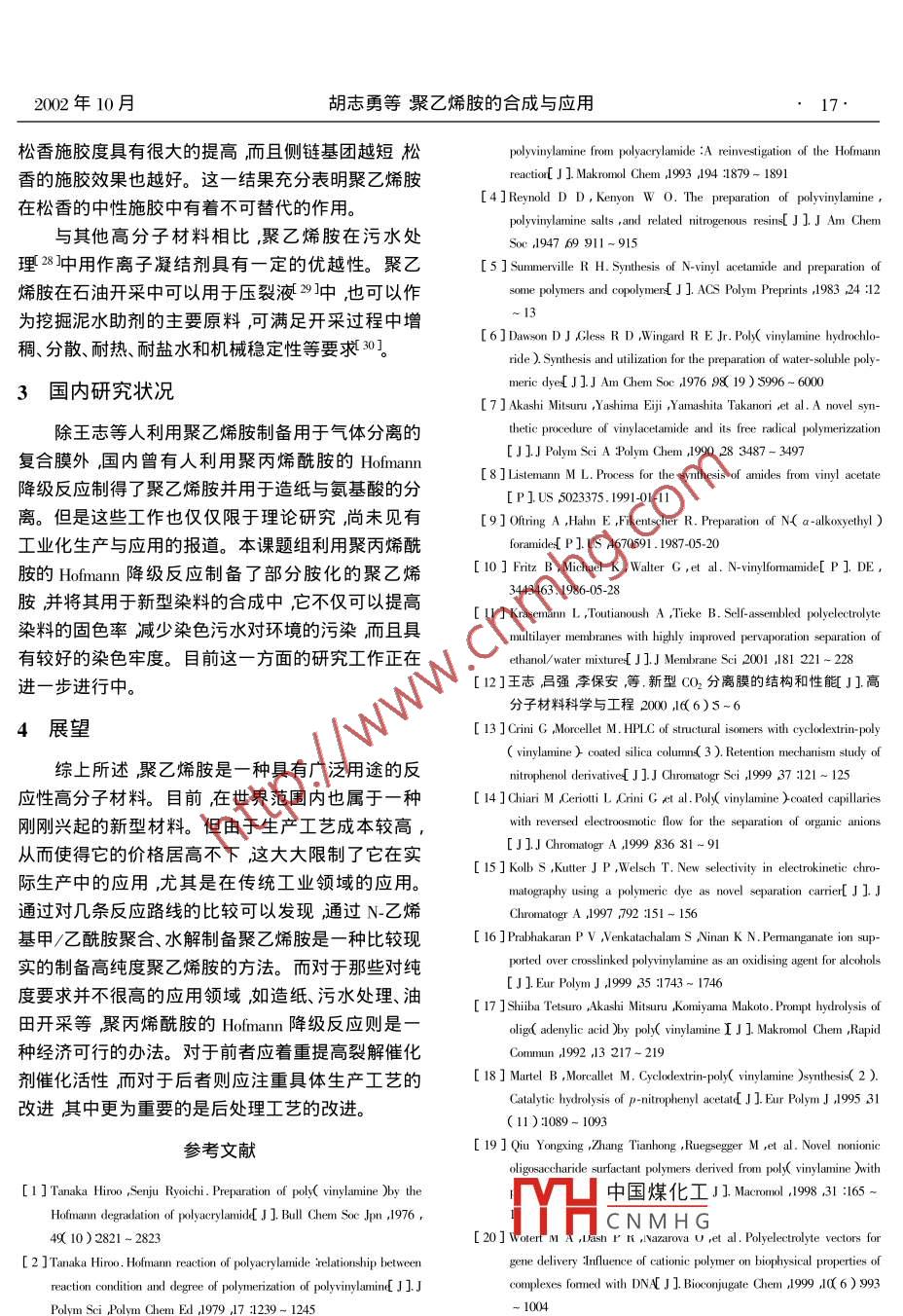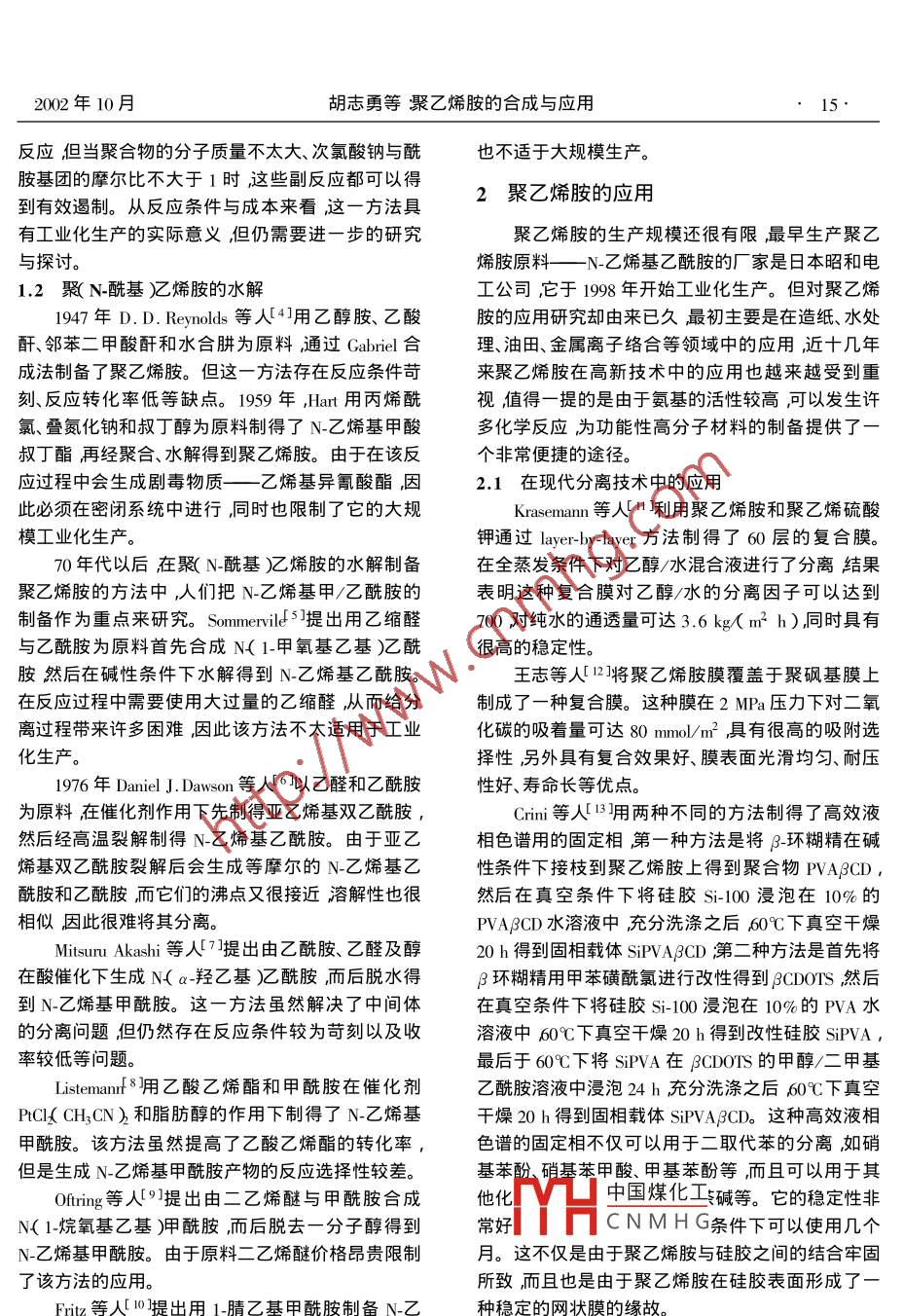 Oct. 2002現(xiàn)代化工第22卷第10期14.Modern Chemical Industry2002年10月聚乙烯胺的合成與應(yīng)用胡志勇張淑芬楊錦宗(大連理工大學(xué)精細(xì)化工國家重點(diǎn)實(shí)驗(yàn)室大連116012)摘要聚乙烯胺是-種氨基直接連接在碳?xì)涔羌苌系木哂卸喾N用途的高分子材料尤為重要的是由于氨基的活性較高為功能性高分子材料的制備提供了便利條件。介紹了聚乙烯胺的兩類制備方法,即聚丙烯酰胺的Hofmann降級反應(yīng)和聚(N-酰基)乙烯胺的水解。綜述了聚乙烯胺在現(xiàn)代分離技術(shù)、生物醫(yī)學(xué)催化以及造紙、表面改性、污水處理等領(lǐng)域的應(yīng)用。指出由N_乙烯基甲/乙酰胺經(jīng)聚合、水解制備聚乙烯胺是制備高純度聚乙烯胺的比較現(xiàn)實(shí)的方法對于那些對純度要求并不很高的應(yīng)用領(lǐng)域聚丙烯酰胺的Hofnann降級反應(yīng)則是一種經(jīng)濟(jì)可行的辦法對于前者應(yīng)著重提高裂解催化劑的催化活性對于后者則應(yīng)注重具體生產(chǎn)工藝的改進(jìn)其中更為重要的是后處理工藝的改進(jìn)。關(guān)鍵詞聚乙烯胺合成:應(yīng)用.中圖分類號:TIQ325文獻(xiàn)標(biāo)識碼:ASynthesis and application of polyvinylamineHU Zhi-yong , ZHANG Shu-fen , YANG Jin- zong( State Key Laboratory of Fine Chemicals , Dalian University of Technology , Dalian 116012 , China )Abstract : Polyvinylamine( PVAm ) is a kind of attractive multi-purpose polymer with amino groups direct along its hydro-carbon main chain. It has an exceptional potential reactivity because of the presence of primary amino groups . The two kinds ofmethods to prepare polyvinylamine i. e. Hofmann degradation of polyacrylamide and hydrolysis of poly( N-vinylforamide ) and/orpoly( N-vinylacetamide ) are recommended as two feasible processes. Its application in various fields such as moderm separationtechnology biomedicine scatalysis papermnaking surface modifcation and treatment of wastewater is reviewed.It is pointed outthat the hydrolysis of poly( N-inylforamide ) and/or poly( N- vinylacetamide ) is a practical method to prepare polyvinylaminewith high purity ,while to those fields where polyvinylamine with high purity is not needed ,Hofmann degradation of polyacry-lamide is an economical and feasible method. It is important for the former method to enbance the reactivity of catalyst duringpyrolysis and for Hofmann degradation of polyacrylamide it is stressed to improve the industrial arts ,especially the after treat-ment techniques .Key words : polyvinyamine ; synthesis ; application聚乙烯胺(簡稱PVAm)是一種氨基直接連接在乙烯胺的制備方法主要分兩類:--是聚丙烯酰胺的碳?xì)涔羌?上的高分子材料。它不僅具有重要的理論Hofmann降級反應(yīng)二是聚( N-酰基)乙烯胺的水解。研究價(jià)值,而且具有重要的實(shí)際使用價(jià)值。由于氨1.1 聚丙烯酰胺的Hofmann降級反應(yīng)基具有較高的反應(yīng)活性,因此它的應(yīng)用領(lǐng)域變得非盡管20世紀(jì)40年代已有人利用這-方法制備常廣泛。尤其是近10多年來聚乙烯胺在-些高新聚乙烯胺但是由于反應(yīng)轉(zhuǎn)化率很低沒有工業(yè)化生技術(shù)領(lǐng)域的應(yīng)用受到人們的極大重視。產(chǎn)的意義。70 年代中后期,TanakF 12]用聚丙烯酰胺和大量氫氧化鈉在低溫條件下制得了胺化度為1聚乙烯胺的合成96%中國煤化工:hari等人53]對聚丙烯由于乙烯胺非常不穩(wěn)定,因此不能通過乙烯胺酰胺YH |CN MH G進(jìn)行了深入研究,指單體的聚合反應(yīng)來制備聚乙烯胺。到目前為止聚出在反應(yīng)過程中雖然存在酰胺水解、成環(huán)、斷鏈等副收稿日期20022-06.19基金項(xiàng)目國家自然科學(xué)基金資助項(xiàng)目( 206006 )作者簡介廂忘鄭據(jù),1971年生博士生楊錦宗男,1932 年生,中國工程院院士教授搏導(dǎo)主要從事精細(xì)化學(xué)品的結(jié)構(gòu)與性能關(guān)系的研究。2002年10月胡志勇等聚乙烯胺的合成與應(yīng)用15 .反應(yīng),但當(dāng)聚合物的分子質(zhì)量不太大、次氯酸鈉與酰也不適于大規(guī)模生產(chǎn)。胺基團(tuán)的摩爾比不大于1 時(shí),這些副反應(yīng)都可以得2聚乙烯胺的應(yīng)用到有效遏制。從反應(yīng)條件與成本來看,這一方法具有工業(yè)化生產(chǎn)的實(shí)際意義,但仍需要進(jìn)-步的研究聚乙烯胺的生產(chǎn)規(guī)模還很有限最早生產(chǎn)聚乙與探討。烯胺原料一N-乙烯基乙酰胺的廠 家是日本昭和電1.2 聚( N-?;?乙烯胺的水解工公司,它于1998年開始工業(yè)化生產(chǎn)。但對聚乙烯1947年D.D. Reynolds等人[41用乙醇胺、乙酸胺的應(yīng)用研究卻由來已久最初主要是在造紙、水處酐、鄰苯二甲酸酐和水合肼為原料通過Gabriel 合理、油田、金屬離子絡(luò)合等領(lǐng)域中的應(yīng)用近十幾年成法制備了聚乙烯胺。但這-方法存在反應(yīng)條件苛來聚乙烯胺在高新技術(shù)中的應(yīng)用也越來越受到重刻、反應(yīng)轉(zhuǎn)化率低等缺點(diǎn)。1959年,Hart用丙烯酰視值得一提的是由于氨基的活性較高,可以發(fā)生許氯、疊氮化鈉和叔J醇為原料制得了N_乙烯基甲酸多化學(xué)反應(yīng)為功能性高分子材料的制備提供了-叔丁酯再經(jīng)聚合、水解得到聚乙烯胺。由于在該反個(gè)非常便捷的途徑。應(yīng)過程中會(huì)生成劇毒物質(zhì)一乙烯基異氰酸酯 ,因2.1在現(xiàn)代分 離技術(shù)中的應(yīng)用此必須在密閉系統(tǒng)中進(jìn)行,同時(shí)也限制了它的大規(guī)Krasema