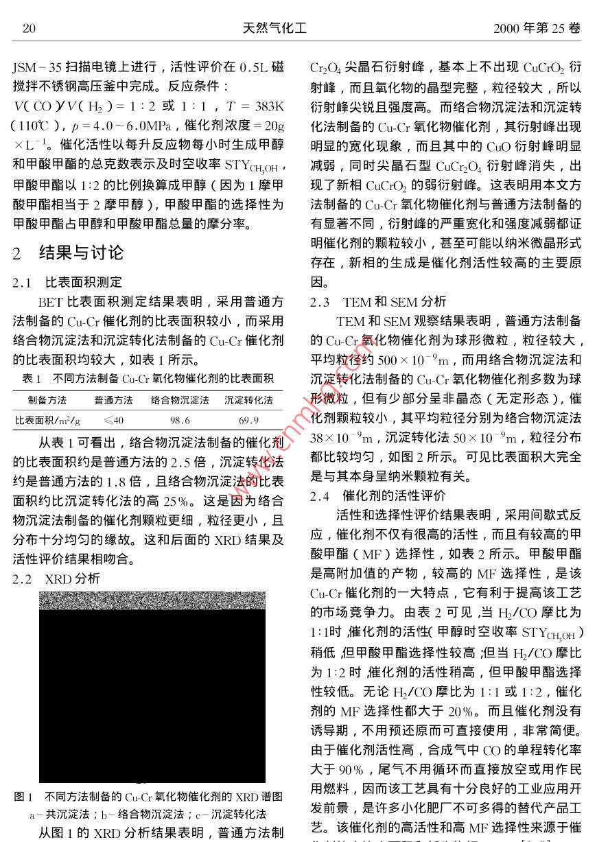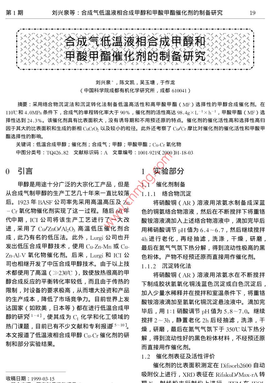 第1期劉興泉等:合成氣低溫液相合成甲醇和甲酸甲酯催化劑的制備研究合成氣低溫液相合成申醇和甲酸甲酯催化劑的制備研究一,一劉興泉,陳文凱,吳玉塘,于作龍中國科學(xué)院成都有機化學(xué)研究所,成都610041)摘要:采用絡(luò)合物沉淀法和沉淀轉(zhuǎn)化法制備低溫高活性和高甲酸甲酯(MF)選擇性的甲醇合成催化劑。在110℃和4.0MPa條件下,合成氣的單程轉(zhuǎn)化率大于90%,催化劑的活性高達98.4g×L1×h1,甲酸甲酯(MF)選擇性達到24.3%。該催化劑具有比表面積大,沒有誘導(dǎo)期和不用預(yù)還原的特點。催化劑的催化活性高和選擇性高歸因于其大的比表面積和生成的新相C'以及較小的粒徑。此外還考察了Cu/(r摩比對催化劑的催化活性和甲酸甲酯選擇性的影響。關(guān)鍵詞:低溫合成甲醇;催化劑;合成氣;甲醇;甲酸甲酯;CuCr氧化物中圖分類號:TQ426.82文獻標識碼:A文章編號:1001-92192000)1-18-030引言1實驗部分甲醇是用途十分廣泛的大宗化工產(chǎn)品,但是1.1催化劑制備從合成氣制甲醇的生產(chǎn)工藝幾十年來一直比較落1.1.1絡(luò)合物沉淀后。1923年BASF公司率先采用高溫高壓及Zn將硝酸銅(AR)溶液用濃氨水制備成深藍r氧化物催化劑實現(xiàn)了這一過程。隨后60年色的銅氨絡(luò)合物溶液,然后在不斷攪拌下將重鉻代中期,II公司將該生產(chǎn)工藝進行了一大改酸銨溶液滴加入上述絡(luò)合物溶液中,滴加完畢后進,采用了Cu/ ZnO/ALC3高溫低壓催化劑合用稀硝酸調(diào)節(jié)pH值為6.4-6.7,然后繼續(xù)攪拌成,此乃有名的低壓法。此外,L公司也開4h進行老化,再經(jīng)抽濾,洗滌,干燥,研磨發(fā)出低壓合成甲醇技術(shù),使用 Cu-Zn-Mn或Cu最后在氮氣氣氛下熱分解,得到流動性極高的黑ZmAV氧化物催化劑。后來,Lurg和ICI公色粉體。產(chǎn)物不經(jīng)預(yù)還原而直接用作催化劑。司也相繼開發(fā)了中壓合成甲醇技術(shù)。由于以上技1.1.2沉淀轉(zhuǎn)化法術(shù)都使用了高溫(>230℃),致使放熱很高的甲將硝酸銅(AR)溶液用濃氨水在不斷攪拌醇合成反應(yīng)的平衡轉(zhuǎn)化率較低,而且由于傳熱的下制成膠狀氫氧化銅淺藍色沉淀或白色沉淀后,限制,對設(shè)備的要求極高,從而增大投資和產(chǎn)品加入少量水稀釋并在攪拌和室溫條件下,將重鉻的生產(chǎn)成本,降低了市場競爭力。目前世界上發(fā)酸銨溶液滴加至氫氧化銅沉淀懸濁液中。滴加完達國家(如歐美,日本等)都在進行低溫合成甲畢后,用1:1硝酸調(diào)節(jié)pH值為5.8~7.0。繼續(xù)醇的研究1-4],使其成為C1化學(xué)和化工領(lǐng)域的攪拌2~3h,靜置老化2h后經(jīng)抽濾,洗滌,干熱門課題,目前已有不少文獻和專利報道5-10燥,研磨,最后在氮氣氣氛下于350℃以下熱分本文報道了低溫液相合成甲醇CuGr催化劑的研解,得到流動性好的黑色粉體材料,不經(jīng)預(yù)還原制和部分實驗結(jié)果。而直接用作催化劑1.2催化劑表征及活性評價催化劑的比表面積測定在 Difisorb2600自動吸附儀上進行,XRD表征在 RifakuD/ Max-rA轉(zhuǎn)收稿日期:1999-03-15天然氣化工2000年第25卷JSM-35掃描電鏡上進行,活性評價在0.5L磁Cr2O4尖晶石衍射峰,基本上不出現(xiàn)CuCO2衍攪拌不銹鋼高壓釜中完成。反應(yīng)條件射峰,而且氧化物的晶型完整,粒徑較大,所以W(αOyv〔H2)=1:2或1:1,T=383K衍射峰尖銳且強度高。而絡(luò)合物沉淀法和沉淀轉(zhuǎn)(110℃),p=4.0~6.0MPa,催化劑濃度=20g化法制備的Cu(r氧化物催化劑,其衍射峰出現(xiàn)L。催化活性以每升反應(yīng)物每小時生成甲醇明顯的寬化現(xiàn)象,而且其中的CuO衍射峰明顯和甲酸甲酯的總克數(shù)表示及時空收率 STYCHOH,減弱,同時尖晶石型CuCr2O4衍射峰消失,出甲酸甲酯以1:2的比例換算成甲醇(因為1摩甲現(xiàn)了新相CuCO2的弱衍射峰。這表明用本文方酸甲酯相當(dāng)于2摩甲醇),甲酸甲酯的選擇性為法制備的CuCr氧化物催化劑與普通方法制備的甲酸甲酯占甲醇和甲酸甲酯總量的摩分率。有顯著不同,衍射峰的嚴重寬化和強度減弱都證2結(jié)果與討論明催化劑的顆粒較小,甚至可能以納米微晶形式存在,新相的生成是催化劑活性較高的主要原2.1比表面積測定因BET比表面積測定結(jié)果表明,采用普通方2.3TEM和SEM分析法制備的CuCr催化劑的比表面積較小,而采用TEM和SEM觀察結(jié)果表明,普通方法制備絡(luò)合物沉淀法和沉淀轉(zhuǎn)化法制備的CuCr催化劑的CuμCr氧化物催化劑為球形微粒,粒徑較大,的比表面積均較大,如表1所示平均粒徑約500×10-m,而用絡(luò)合物沉淀法和表1不同方法制備CuCr氧化物催化劑的比表面積沉淀轉(zhuǎn)化法制備的Cu-Cr氧化物催化劑多數(shù)為球制備方法普通方法絡(luò)合物沉淀法沉淀轉(zhuǎn)化法形微粒,但有少部分呈非晶態(tài)(無定形態(tài)),催比表面積/m3/g≤4化劑顆粒較小,其平均粒徑分別為絡(luò)合物沉淀法從表1可看出,絡(luò)合物沉淀法制備的催化劑38×10m,沉淀轉(zhuǎn)化法50×10m,粒徑分布的比表面積約是普通方法的2.5倍,沉淀轉(zhuǎn)化法都比較均勻,如圖2所示??梢姳缺砻娣e大完全約是普通方法的18倍,且絡(luò)合物沉淀法的比表是與其本身呈納米顆粒有關(guān)。面積約比沉淀轉(zhuǎn)化法的高25%。這是因為絡(luò)合2.4催化劑的活性評價物沉淀法制備的催化劑顆粒更細,粒徑更小,且活性和選擇性評價結(jié)果表明,采用間歇式反分布十分均勻的緣故。這和后面的XRD結(jié)果及應(yī