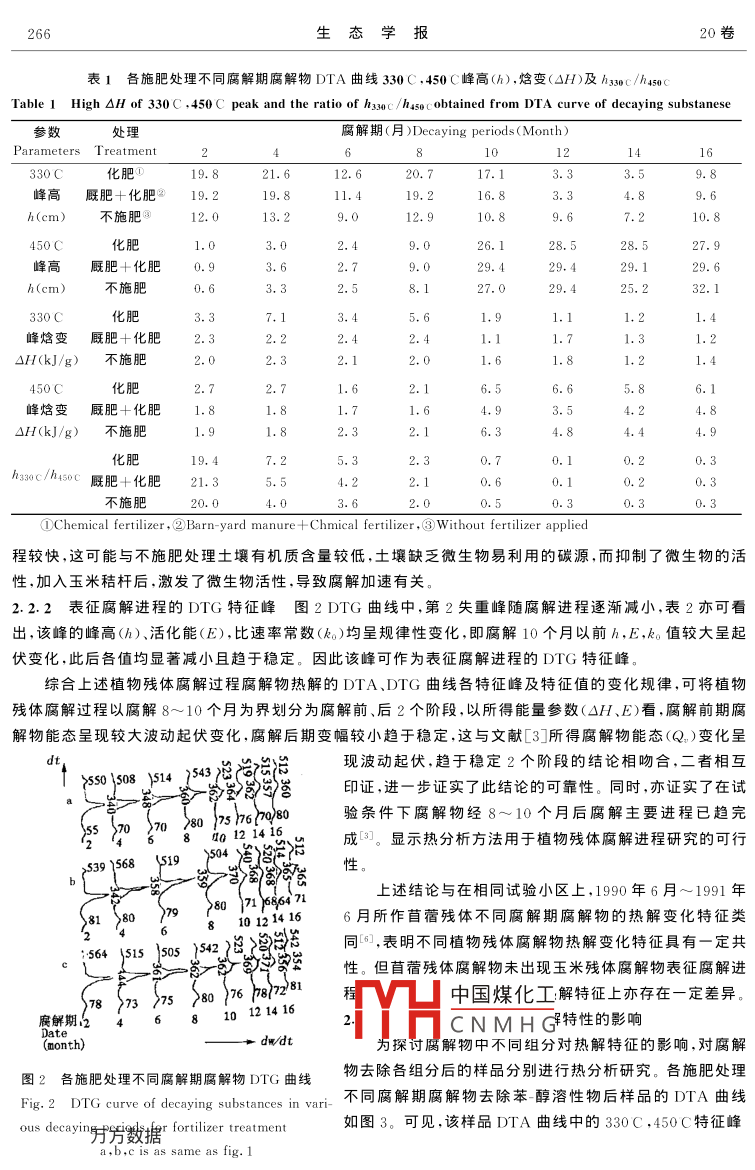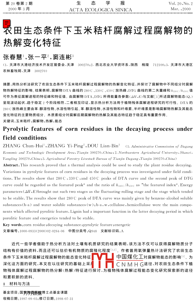 第20卷第2期生態(tài)學報Vol. 20. No. 22000年3月ACTA ECOLOGICA SINICAM農田生態(tài)條件下玉米秸桿腐解過程腐解物的熱解變化特征張春慧1,張一平2,竇連彬(1,天津市大港經濟技術開發(fā)區(qū)管委會,天津300270;2.西北農業(yè)大學資環(huán)系,陜西楊陵712100;3,天津市大港區(qū)農林畜牧局,天津300270)摘要:;用熱分析法研究了農田生態(tài)條件下玉米秸桿腐解過程腐解物的熱解變化特征,并探討了腐解物中不同組分對腐解物熱解特征的影響。結果表明,腐解物DTA曲線的280C、330C、450C放熱峰,DTIG曲線的第二失重峰和h3c/h45c值可作為表征腐解進程的特征峰和特征值。由腐解物DTA、DTG所得能量各參數(ΔH,E)與文獻[3]所述腐解物能態(tài)(Q呈現波動起伏,趨于穩(wěn)定2個階段相符,二者相互印證,顯示熱分析方法用于植物殘體腐解進程硏究的可行性。DTA旳28℃放熱峰主要由苯-醇溶性物、水溶性物引起。苯-醇溶性物、水溶性物和纖維素、半纖維素是影鳴腐解物熱解及其能態(tài)變化特征的主要物質組分。木質素組分對腐解后期腐解物的熱解及其能態(tài)特征趨于穩(wěn)定具有重要作用關鍵詞:玉米秸桿;腐解物;熱解;能態(tài)Pyrolytic features of corn residues in the decaying process underfield conditionsZHANG Chun-Hui, ZHANG Yi-Ping DOU Lian-Bin (1. Administrative Commsission of dagangEconomic and Technologic Development Area, Tian jin 300270, China: 2. Northweestern Agricultural University, shanxiYangling 300270, China; 3. Agricultural Forestry Livestock Bureau of Tianjin Dagang, Tianjin 300270, China)Abstract: This research proved that a thermal analysis could be used to study the plant residue decaying.Variations in pyrolytic features of corn residues in the decaying process was investigated under field condions. The results show that 280 C, 330C, and 450C peaks of DTA curve and the second peak of DTGcurve could be regarded as the featured peak"and the ratio of h3s0c/h4sec as"the featured index". Energyparameters(AH, E)brought out such two stages as the fluctuating-rolling stage and the stage which tendeto be stable. The results show that 280C peak of dta curve was mainly given by benzene-alcohol solublesubstances(b-a) and water soluble substances(w); b-a, w cellulose, hemicellulose were the main compo-nents which affected pyrolitic feature Lignin had a important function in the latter decaying period in whichporolitic feature and energetics tended to be stableKey words: corn residue; decaying substance pyrolytic feature: energetic文章編號:1000-0933(2000)02-0264-06中圖分類號:Q948文獻標識碼:A近代一些學者借助于熱分析方法對土壤有機質研究的結果表明,該方法不僅可以荻得腐解物質分子結構有價值的資料,而且還可以估價有機物質的腐殖化程度。作者曾用氧彈量熱計法研究了農田生態(tài)條件下玉米秸桿腐解過程腐解物的能態(tài)變化特征中國煤化工對腐解物能態(tài)的影響。為深化這方面的研究,本文在以往研究的基礎上采CNMHG途徑,對農田生態(tài)條件下植物殘體腐解過程腐解物的熱分解(熱解)特征進行探討,為植物殘體腐解過程能態(tài)變化研究探索新的途徑和累積新的資料。材料與方法基金項目:國荊據博士點基金課題稿日期:1997-09-03;修訂日期:199807-312期張春慧等:農田生態(tài)條件下玉米秸杄腐解過程腐解物的熱解變化特征本試驗利用西北農業(yè)大學有機質轉化研究定位試驗地進行,土壤系口土安排本試驗時,定位試驗已連續(xù)進行了13a,小區(qū)面積為19.8m2,每年小麥玉米連作。本試驗選用定位試驗中化肥,廄肥+化肥,不施肥3個處理,供試小區(qū)施肥處理,小區(qū)土壤化學性質及供試腐解物樣品的采集及制備同文獻[3]。用島津DT-30B型熱分析儀進行供試樣品的差熱(DTA),熱重(TG)和微商熱重(DTG)分析。DTA稱樣6.00g、TG稱樣10.00mg,參比物為Al2O,試樣氣氛為靜態(tài)空氣,升溫速度10C/min。DTA中腐解物的能態(tài)14用焓變(△H)表示,其計算公式為AH=k·s/m(S:測試峰面積,m:峰區(qū)熱解物重量,k:用苯甲酸測得的標定常數)1。DTG中腐解物熱解活化能(E),比速率常數(k。)依urner等·的計算公式推求2結果與討論2.1植物殘體腐解過程腐解物熱分析曲線特征各施肥處理不同腐解期腐解物的DTA曲線如圖1。各曲線特征基本相似,共同點是,60~85C有一吸熱谷,32210~342C和419~475C有兩個主放熱峰,480C左右有一尖狀放熱峰。此外,腐解前期265~321C有一小放熱峰各施肥處理不同腐解期腐解物的DTG曲線如圖2。各DTG曲線亦有共性,均顯示3個失重峰,其中第2失重峰8最突出。2.2植物殘體腐解過程腐解物熱解的動態(tài)變化特征22.1表征腐解進程的DTA特征峰和特征值圖6√0IDTA曲線中,265~321℃小放熱峰(簡稱280C峰),各施肥處理在腐解前期(10個月前)均明顯,以后消失,此峰的顯示腐解過程處于前期,因此可作為表征腐解進程的4254特征峰(280c特征峰);322-382c放熱峰(簡稱33c6452a22峰),各施肥處理及各腐解期皆突出,峰較高,峰面積較大峰溫變幅小,基本處于330C左右,同時從表1可見,腐解過程此峰的峰高(h),焓變(ΔⅠ)呈現規(guī)律性變化。腐解10個月以前,、ΔH值較大、且波動起伏變幅較大,此后該值變小,變幅減小,因此可作為表征腐解進程的330C特征圖1各施肥處理不同腐解期腐解物DTA曲線峰:419~475C放熱峰(多數在450C,簡稱450C峰),各施Fig 1 DTA curve of decaying substances in va肥處理及各腐解期亦較突出,且從表1可見該峰峰高(h)· ous decaying periods for fertilizer treatment焓變(ΔH)隨腐解進程亦呈現規(guī)律性變化,腐解前h,ΔH值較小,此后增