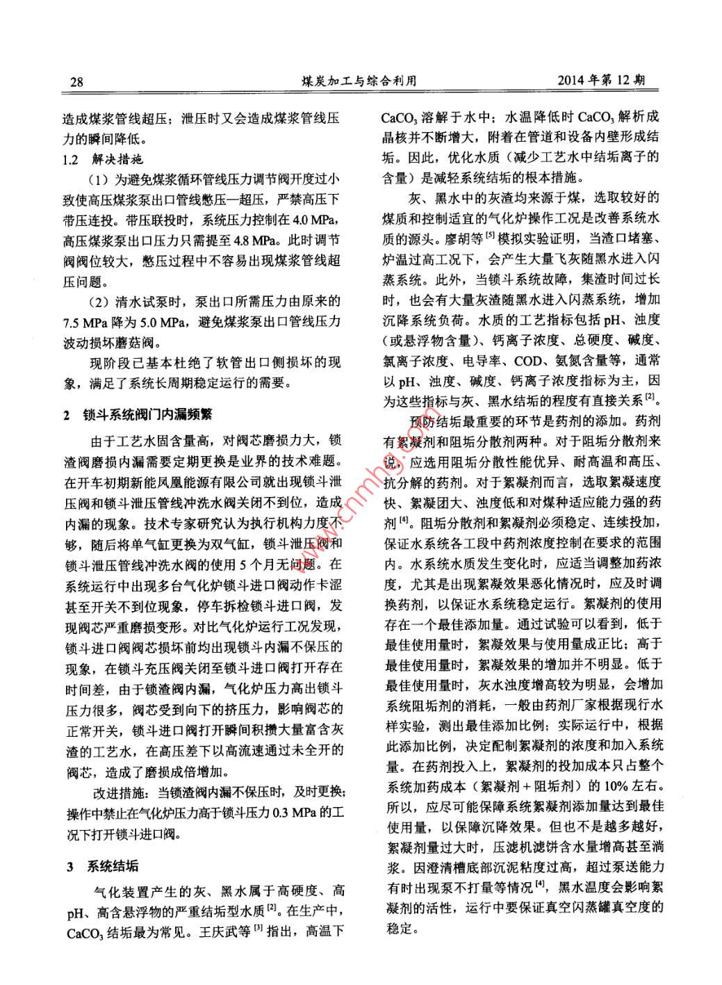 No.12,2014煤炭加工與綜合利用 COAL PROCESSING COMPREHENSIVE UTILIZATION27四噴嘴氣化裝置運(yùn)行總結(jié)馬艷軍,孫化祥,孔德升(新能鳳凰滕州能源有限公司,山東滕州277527)摘要:針對(duì)水煤漿氣化裝置運(yùn)行中遇到的高壓煤漿泵軟管破裂、鎖渣閥內(nèi)漏、系統(tǒng)結(jié)垢、灰水換熱器堵塞、開工抽引消音器堵塞和閃蒸系統(tǒng)角閥下堵板磨損等問題進(jìn)行了分析,提出了處理措施,在工業(yè)運(yùn)行中取得了較好的效果。關(guān)鍵詞:煤炭氣化;加壓氣化;問題;技術(shù)措施中圖分類號(hào):TQ545文獻(xiàn)標(biāo)識(shí)碼:A文章編號(hào):1005-8397(2014)12-0027-04新能鳳凰(滕州)能源有限公司65萬ta甲擠壓而損害這種現(xiàn)象也與軟管損壞位置在出醇項(xiàng)目采用多噴嘴對(duì)置式水煤漿加壓氣化工藝,口側(cè)相一致。通過分析發(fā)現(xiàn),造成缸頭出口端內(nèi)于2006年7月20日開工建設(shè),配套生產(chǎn)工序包外側(cè)壓差過大的原因有以下兩種。括140th鍋爐3套、42000m3h空分裝置2套、1500td四噴嘴氣化爐3臺(tái)、凈化和合成精餾裝置2套等。四噴嘴氣化裝置自2009年12月成功開車以來,遇到了一些技術(shù)性難題,經(jīng)過攻堅(jiān)克難,均已得到解決,現(xiàn)總結(jié)與下,以供同行業(yè)參考。1高壓煤漿泵軟管損壞1.1軟管損壞原因分析生產(chǎn)運(yùn)行中菲魯瓦高壓煤漿泵軟管頻繁破損,且損壞位置均靠近出口端,形狀為一核桃狀大小的圓孔(見圖1),每次停車均有軟管損壞,不僅增加了生產(chǎn)成本和檢修任務(wù),而且經(jīng)常出現(xiàn)非計(jì)劃停車,制約了系統(tǒng)的長(zhǎng)周期高效穩(wěn)定運(yùn)行。運(yùn)行早期采取了規(guī)范防凍液添加操作,杜絕防凍液添加不足、過量或存有氣體的處理措施,圖1軟管損壞均未取得理想效果,軟管損壞現(xiàn)象依舊存在。通過對(duì)設(shè)備、工況、工藝操作三方面進(jìn)行研究分(1)帶壓連投時(shí)要求煤漿壓力高于氣化爐壓析,認(rèn)為導(dǎo)致軟管損壞的原因?yàn)檫\(yùn)行中出現(xiàn)缸頭力.ma由于系統(tǒng)壓力較高,通過煤漿循環(huán)出口端內(nèi)外側(cè)壓差過大的現(xiàn)象,造成軟管的過度切斷閥后的調(diào)節(jié)閥憋壓,經(jīng)常出現(xiàn)煤漿管線超壓現(xiàn)象;為保護(hù)泵體必須進(jìn)行泄壓操作,泄壓時(shí)又收稿日期:2014-10-03會(huì)造成煤漿管線壓力的瞬間降低。作者簡(jiǎn)介:馬艷軍(1976一),男,山東滕州人,1994年畢(2)高壓煤漿泵清水試泵時(shí),需要將煤漿管業(yè)于中科院管理學(xué)院計(jì)算機(jī)專業(yè),新能鳳凰滕州能源有限公司氣線壓力控制在正常運(yùn)行時(shí)的壓力,同樣高的壓差化助理工程師下,煤漿壓力調(diào)節(jié)閥開度過小,憋壓時(shí)也會(huì)頻繁28煤炭加工與綜合利用2014年第12期造成煤漿管線超壓;泄壓時(shí)又會(huì)造成煤漿管線壓caco3溶解于水中水溫降低時(shí)CaCO3解析成力的瞬間降低。晶核并不斷增大,附著在管道和設(shè)備內(nèi)壁形成結(jié)1.2解決措施垢。因此,優(yōu)化水質(zhì)(減少工藝水中結(jié)垢離子的(1)為避免煤漿循環(huán)管線壓力調(diào)節(jié)閥開度過小含量)是減輕系統(tǒng)結(jié)垢的根本措施致使高壓煤漿泵出口管線憋壓一超壓,嚴(yán)禁高壓下灰、黑水中的灰渣均來源于煤,選取較好的帶壓連投。帶壓聯(lián)投時(shí),系統(tǒng)壓力控制在4.0MPa,煤質(zhì)和控制適宜的氣化爐操作工況是改善系統(tǒng)水高壓煤漿泵出口壓力只需提至4.8MPa。此時(shí)調(diào)節(jié)質(zhì)的源頭。廖胡等模擬實(shí)驗(yàn)證明,當(dāng)渣口堵塞、閥閥位較大,憋壓過程中不容易出現(xiàn)煤漿管線超爐溫過高工況下,會(huì)產(chǎn)生大量飛灰隨黑水進(jìn)入閃壓?jiǎn)栴}。蒸系統(tǒng)。此外,當(dāng)鎖斗系統(tǒng)故障,集渣時(shí)間過長(zhǎng)(2)清水試泵時(shí),泵出口所需壓力由原來的時(shí),會(huì)有大量灰渣隨黑水進(jìn)入閃蒸系統(tǒng),增加7.5Ma降為5.0MPa,避免煤漿泵出口管線壓力沉降系統(tǒng)負(fù)荷水質(zhì)的工藝指標(biāo)包括pH、濁度波動(dòng)損壞蘑菇閥。(或懸浮物含量)、鈣離子濃度、總硬度、堿度、現(xiàn)階段已基本杜絕了軟管出口側(cè)損壞的現(xiàn)氯離子濃度、電導(dǎo)率、COD、氨氮含量等,通常象,滿足了系統(tǒng)長(zhǎng)周期穩(wěn)定運(yùn)行的需要。以pH、濁度、堿度、鈣離子濃度指標(biāo)為主,因?yàn)檫@些指標(biāo)與灰、黑水結(jié)垢的程度有直接關(guān)系2鎖斗系統(tǒng)閥門內(nèi)漏頻繁預(yù)防結(jié)垢最重要的環(huán)節(jié)是藥劑的添加。藥劑由于工藝水固含量高,對(duì)閥芯磨損力大,鎖有絮凝劑和阻垢分散劑兩種。對(duì)于阻垢分散劑來渣閥磨損內(nèi)漏需要定期更換是業(yè)界的技術(shù)難題。說,應(yīng)選用阻垢分散性能優(yōu)異、耐高溫和高壓、在開車初期新能鳳凰能源有限公司就出現(xiàn)鎖斗泄抗分解的藥劑。對(duì)于絮凝劑而言,選取絮凝速度壓閥和鎖斗泄壓管線沖洗水閥關(guān)閉不到位,造成快、絮凝團(tuán)大、濁度低和對(duì)煤種適應(yīng)能力強(qiáng)的藥內(nèi)漏的現(xiàn)象。技術(shù)專家研究認(rèn)為執(zhí)行機(jī)構(gòu)力度不劑阻垢分散劑和絮凝劑必須穩(wěn)定、連續(xù)投加,夠,隨后將單氣缸更換為雙氣缸,鎖斗泄壓閥和保證水系統(tǒng)各工