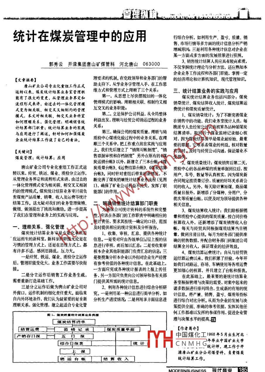 行綜合分析,如利用生產(chǎn)、盈虧.質(zhì)量.銷統(tǒng)計在煤炭管理中的應用售市場行情等多方面的統(tǒng)計信息分析產(chǎn)銷增減原內(nèi):三是利用各種統(tǒng)計信息對企業(yè)在某~方面或多方面的發(fā)展前景進行預測。郭秀云開灤集團唐山礦煤管科 河北唐山 0630003.銷售統(tǒng)計結算人員應具有較高素質(zhì),不僅掌據(jù)統(tǒng)計理論與分析方法,還應熟知本企業(yè)業(yè)務工作流程和各部門職能,掌握- -定[文章摘要]理要求的機制。在黨政領導和業(yè)務部門的幫的經(jīng)濟理論和計算機知識、 現(xiàn)代管理知識。唐山礦業(yè)公司專業(yè)化重組工作正式助支持下,從學業(yè)務學管理人手,在工作思運轉以來,煤炭統(tǒng)計結算業(yè)務室管理職維萬5式和管理方式上理順了三個關系:三、統(tǒng)計結算業(yè)務的實踐與應用能有了很大的變更,從管理業(yè)務界定和第一,從思想上盡快擺脫舊的-體化煤炭統(tǒng)計結算業(yè)務包括四部分:煤炭流程形式來講,由過去的一體化管理模管理模式的影響,理順相關聯(lián).相制約又相銷量統(tǒng)計、 煤炭結算收入統(tǒng)計,煤炭結算運式變?yōu)橄嚓P聯(lián)、相交叉又相制約的管理互交叉的業(yè)務職能,費統(tǒng)計和煤炭質(zhì)量統(tǒng)計。模式,本文對相關聯(lián)、相交叉業(yè)務科室第二,立足保護公司利益,從全局整體、煤炭銷朵統(tǒng)計:為了不斷完善煤業(yè)如何理順關系,強化管理;明確銷售統(tǒng)利益出發(fā),理順與經(jīng)貿(mào)公司銷運過程的業(yè)務在銷售中的功能,我們業(yè)務室統(tǒng)計人員,每計結算部門職責;統(tǒng)計結算業(yè)務的實踐關系;第三,確保公司的煤炭質(zhì)量,理順與局結算清單, 取回后十煤業(yè)監(jiān)磅記錄細心核晚派專人去經(jīng)貿(mào)公司認真核算齊品種煤煤炭與應用進行了闌述。針對如何加強煤炭企業(yè)統(tǒng)計結算工作談了自己的看法。質(zhì)檢中心煤質(zhì)化驗過程中的業(yè)務關系。在理對, 因為煤炭結算清單是煤業(yè)最原始、最重順三個關系中,把工作重點放在實踐與應用要的票據(jù), 它唯系若媒業(yè)的利益。核對數(shù)量[關鍵詞]上。我們先后建立了“銷偉對帳制度"、“銷有誤時,及時與經(jīng)貿(mào)公司溝通,保證煤業(yè)不煤炭管理;統(tǒng)計結算;應用售票據(jù)審核和存檔制度”另外在原有的《煤受損失。炭運銷臺帳》以外,新建立了三本臺帳《煤2.煤炭質(zhì)量統(tǒng)計:煤炭銷售后第二天,唐山礦業(yè)公司專北化重組工作正式運炭質(zhì)最臺帳). 《運費結算臺帳》、《煤炭結算質(zhì)檢中心的各品種煤的質(zhì)量單據(jù)到位后, 按轉以來,經(jīng)貿(mào)。鐵運、煤業(yè)、質(zhì)檢分立運作,臺帳)。 同時針對重組后帶來的新情況,不用戶、 號、數(shù)量等認真核實,因為煤炭新從管理業(yè)務界定和流程形式來講,由過去的斷完善 了煤炭銷量統(tǒng)計結算業(yè)務流程(見圖合同規(guī)定按質(zhì)最訂價,質(zhì)量的好壞關系著公-體化管理模式變?yōu)橄嚓P聯(lián).相交叉又相制1), 確保了礦業(yè)公司利益不流失,發(fā)揮了職司的收人。另外,每天除計算原煤、商品煤約的管理模式。煤炭統(tǒng)計結算業(yè)務室目前負能部i ]的作用。質(zhì)量日報外,新增添了分煤種、分用戶、分責煤炭產(chǎn)品質(zhì)量、銷氧.收人及運費等統(tǒng)計批次等質(zhì)量臺帳,以便及時為領導提供各種結算工作。這尤疑對我們的業(yè)務管理做精、二. 明確銷售統(tǒng)計結算部門職責相關信息。做細、做強提出了挑戰(zhàn)和激勵。進步提高為確保公可統(tǒng)計資料的系統(tǒng)性和完整3.煤炭結算收入統(tǒng)計:我們]除根據(jù)銷了我們在管理和業(yè)務上的實踐與應用。性,應該任各部[ ]的工作職責中明確相應的量和質(zhì)檢中心提供的煤炭質(zhì)量. 按合同價格統(tǒng)計責任,要求其按統(tǒng)一確定的口徑范圍核算收入外, 還新增添了煤發(fā)銷售收人臺-.理順關系,強化管理及時提供相應的統(tǒng)計資料及分析報告。帳,每天與經(jīng)貿(mào)共同根據(jù)煤質(zhì)結算當日銷煤炭統(tǒng)計結算業(yè)務室是專業(yè)化重組后.1、收集、審核、匯總提供各種統(tǒng)計 最,做到日清日結。每月為財務部門提供準: 應運而生的新科室,新科室的職能尤論是在 信息。一是要對應由齊級單位公層上報的信 確的銷售數(shù)據(jù),并院合財務刪到集團公司習慣的管理方式上,還是在思維方式上,都息進行審核, 而后加以匯總二是要收集審結算全月收人,保證煤業(yè)的經(jīng)濟效益。有許多不適,感到思路亂,壓力大。核本企業(yè)其他職能部門負責匯總的信息三4、煤炭結算運費統(tǒng)計:自從與經(jīng)貿(mào)鐵-是經(jīng)貿(mào)、鐵運、煤業(yè)、質(zhì)檢分立運作是要搜集分析本企業(yè)以外但對企業(yè)生產(chǎn)經(jīng)營運結算運費以來,我們積累了經(jīng)驗,今年開后,管理職能變化大,業(yè)務工作需要盡快銜有參考價值的各 種統(tǒng)計信息。在此基礎上,始我們對路運, 存場,車輛使用等各項運費一方面應完成各種統(tǒng)計報表的上報上傳任更加細心的核算,并月建立了臺帳和報表。二是分立運作后銷售工作業(yè)務生疏,務, 另一方面應負責向公司領導和各有關部在此基礎上,最重要的是統(tǒng)計結算業