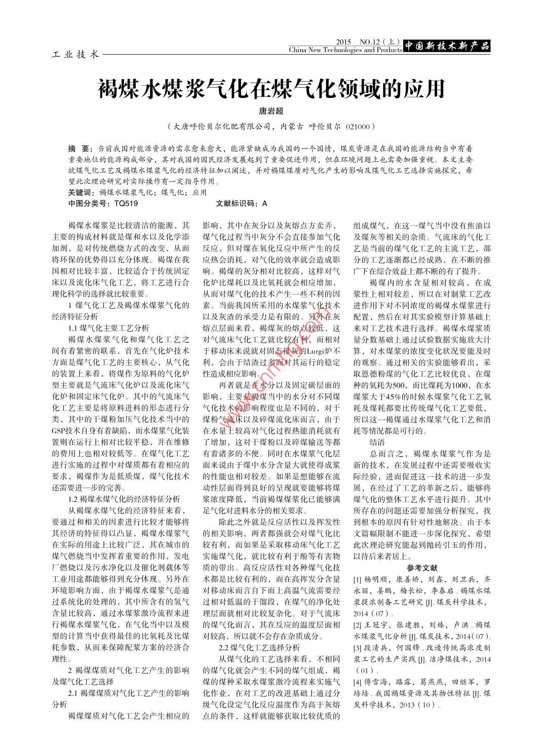 2015 N0.12(上)中國新技術(shù)新產(chǎn)品工業(yè)技術(shù)China New Technologies and Products褐煤水煤漿氣化在煤氣化領(lǐng)域的應(yīng)用唐巖超(大唐呼倫貝爾化肥有限公司,內(nèi)蒙古呼倫貝爾021000)摘要:當前我國對能源資源的需求愈來愈大,能源緊缺成為我國的一個國情,煤炭資源是在我國的能源結(jié)構(gòu)當中有著重要地位的能源構(gòu)成部分,其對我國的國民經(jīng)濟發(fā)展起到了重要促進作用,但在環(huán)境問題上也需要加強重視。本文主要就煤氣化工藝及褐煤水煤漿氣化的經(jīng)濟特征加以闡述,并對褐煤煤質(zhì)對氣化產(chǎn)生的影響及煤氣化工藝選擇實施探究,希望此次理論研究對實際操作有一定指導(dǎo)作用。關(guān)鍵詞:褐煤水煤漿氣化;煤氣化;應(yīng)用中圖分類號: TQ519文獻標識碼: A褐煤水煤漿是比較清潔的能源,其影響, 其中在灰分以及灰熔點方賣弄,組成煤氣,在這一煤氣當中沒有焦油以主要的構(gòu)成材料就是煤和水以及化學添煤氣化過程當中灰分不會直接參加氣化及煤灰等相關(guān)的雜質(zhì)。氣流床的氣化工加劑,是對傳統(tǒng)燃燒方式的改變,從而反應(yīng), 但對煤在氧化反應(yīng)中所產(chǎn)生的反藝是當前的煤氣化工藝的主流工藝,部將環(huán)保的優(yōu)勢得以充分體現(xiàn)。褐煤在我應(yīng)熱 會消耗,對氣化的效率就會造成影分的 工藝逐漸都已經(jīng)成熟,在不斷的推國相對比較豐富,比較適合于傳統(tǒng)固定響。褐煤的灰分相對比較高,這樣對氣廣 下在綜合效益上都不斷的有了提升。床以及流化床氣化工藝,將工藝進行合化爐比煤耗以及比氧耗就會相應(yīng)增加,褐煤內(nèi)的水含量相對較高,在成理化科學的選擇就比較重要。從而對煤氣化的技術(shù)產(chǎn)生一些不利的因漿性 上相對較差,所以在對制漿工藝改1煤氣化工藝及褐煤水煤漿氣化的素。當前我國所采用的水煤漿氣化技術(shù)進作用下對不同濃度的褐煤水煤漿進行經(jīng)濟特征分析以及灰渣的承受力是有限的。另外在灰配置,然后在對其實驗?zāi)P陀嬎慊A(chǔ)上1.1煤氣化主要工藝分析熔點層面來看,褐煤灰的熔點較低,這來對 工藝技術(shù)進行選擇。褐煤水煤漿質(zhì)褐煤水煤漿氣化和煤氣化工藝之對氣流床氣化工藝就比較有利,而相對量分數(shù)基礎(chǔ)上通過試驗數(shù)據(jù)實施放大計間有著緊密的聯(lián)系,首先在氣化爐技術(shù)于移動床來說就對固態(tài)排灰的Lurgi爐不算, 對水煤漿的濃度變化狀況要能及時方面是煤氣化工藝的主要核心,從氣化利, 會由于結(jié)渣過多而對其運行的穩(wěn)定的觀察。通過相關(guān)的實驗?zāi)軌蚩闯觯傻难b置上來看,將煤作為原料的氣化爐性造成相應(yīng)影響。取恩德粉煤的氣化工藝比較優(yōu)良,在煤型主要就是氣流床氣化爐以及流化床氣再者就是在水分以及固定碳層面的種的氧耗為500,而比煤耗為1000,在水化爐和固定床氣化爐。其中的氣流床氣影響,主要是褐煤當中的水分對不同煤煤漿大于45%的時候水煤漿氣化工藝氧化工藝主要是將原料進料的形態(tài)進行分氣化技 術(shù)的影響程度也是不同的,對干耗及煤耗都要 比傳統(tǒng)煤氣化工藝要低,類,其中的干煤粉加壓氣化技術(shù)當中的煤粉氣流床以及碎煤流化床而言,由于所以這一褐煤通過水煤漿氣化工藝和消GSP技術(shù)自身有著缺陷,而水煤漿氣化裝在水量上較高對氣化過程熱能消耗就有耗等情況都是可行的。置則在運行上相對比較平穩(wěn),并在維修了增加,這對干煤粉以及碎煤輸送等都結(jié)語的費用上也相對較低等。在煤氣化工藝有 著諸多的不便。同時在水煤漿氣化層總而言之,褐煤水煤漿氣作為是進行實施的過程中對煤質(zhì)都有著相應(yīng)的面來說由于煤中水分含量大就使得成漿新的技術(shù),在發(fā)展過程中還需要吸收實要求,褐煤作為是低質(zhì)煤,煤氣化技術(shù).的性能也相對較差。如果是想能夠在流際經(jīng)驗,進而促進這一技術(shù)的進--步發(fā)還需要進-步的完善。動性層面得到良好的呈現(xiàn)就要能夠?qū)⒚赫梗?在經(jīng)過了工藝的革新之后,能夠?qū)?.2褐煤水煤氣化的經(jīng)濟特征分析漿濃度降低,當前褐煤煤漿化已能夠滿煤氣化的整體工藝水平進行提升。其中從褐煤水煤氣化的經(jīng)濟特征來看,足氣化對進料水分的相關(guān)要求。所存在的問題還需要加強分析探究,找要通過和相關(guān)的因素進行比較才能夠?qū)⒊酥饩褪欠磻?yīng)活性以及揮發(fā)性到根本的原因有針對性地解決。由于本其經(jīng)濟的特征得以凸顯,褐煤水煤漿氣的 相關(guān)影響,兩者都強就會對煤氣化比文 篇幅限制不能進一步深化探究, 希望在實際的用途上比較廣泛,其在城市的較有利,而如果是采取移動床氣化工藝此次理論研究能起到拋磚引玉的作用,煤氣燃燒當中發(fā)揮著重要的作用,發(fā)電實施煤氣化, 就比較有利于酚等有害物以待后來者居 上。廠燃燒以及污水凈化以及催化劑載體等質(zhì)的帶出。高反應(yīng)活性對各種煤氣化技參考文獻工業(yè)用途都能夠得到充分體現(xiàn)。另外在術(shù)都是比較有利的,而在高揮發(fā)分含量[1]楊明順,康善嬌,劉鑫,劉衛(wèi)兵,齊環(huán)境影響方面,由于褐煤水煤漿氣是通對移動床而言自下而上高溫氣流需要經(jīng)永麗,姜鵬,梅長松,李春啟.褐煤水煤過系