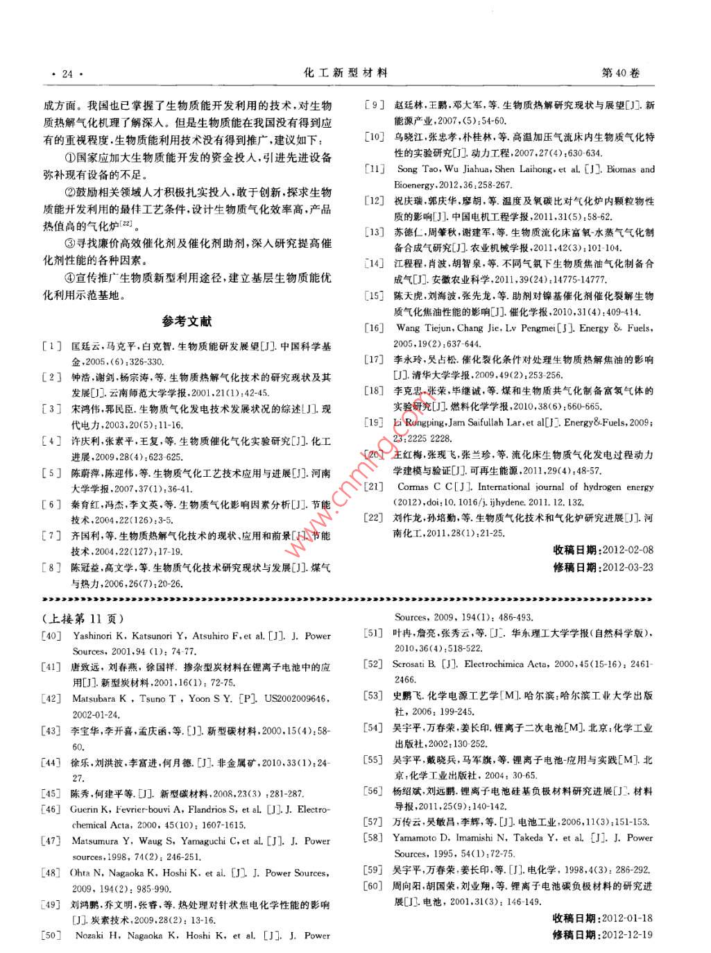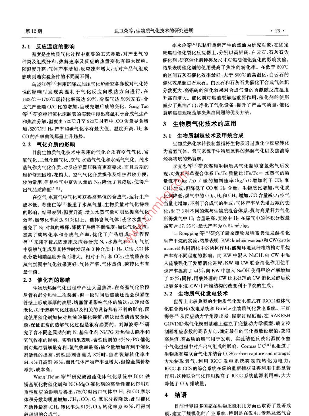Vol.40 No. 12化工新型材料第40卷第12期●22●NEW CHEMICAL MATERIALS2012年12月生物質(zhì)氣化技術(shù)的研究進(jìn)展.武衛(wèi)榮崔淑貞高文超(濟(jì)寧學(xué)院化學(xué)與化工系,曲阜273155)摘要生物質(zhì)能是一種理想的可再生能源,由于其儲(chǔ)量大、低污染.熱值高等優(yōu)點(diǎn),現(xiàn)已被廣泛開發(fā)利用。論述了生物質(zhì)氣化技術(shù)的基本原理,反應(yīng)過程及影響氣化特性的因素,如溫度、氣化介質(zhì)、催化劑。并對(duì)當(dāng)前國內(nèi)外生物質(zhì)氣化技術(shù)應(yīng)用現(xiàn)狀進(jìn)行概括,最后就生物質(zhì)氣化技術(shù)存在的問題提出幾點(diǎn)建議。關(guān)鍵詞生物質(zhì)氣化, 氣化介質(zhì).催化劑,碳轉(zhuǎn)化率Research progress of biomass gasification technologyWu Weirong Cui Shuzhen Gao Wenchao(Department of Chemistry and Chemical Engineering ,Jining University ,Qufu 273155)Abstract Biomass energy is one kind of ideal regenerative energy resource. Due to itossessed large storage, lowpollution and high calorific value,it has been widely developed. The basic principle of biomass gasification , the course of re-action and the influences of operating conditions on the applications of boomass gasification such as temperature, gasfier a-gent,catalyst were introduced. Meanwhile the application situation of biomass gasification technology was described. Final-ly, some advices about the existing problems were put forward.Key words biomass gasification,asifying media,catalyst, carbon conversion能源關(guān)系到我國經(jīng)濟(jì)的快速增長和社會(huì)的可持續(xù)發(fā)的排放少,減輕環(huán)境污染;生物質(zhì)將炭和能量以COr形式固展。為此探尋可再生的綠色無污染能源是當(dāng)務(wù)之急。據(jù)聯(lián)定,CO2排放量等于C固定量,故生物質(zhì)是一-種CO2零排放的合國調(diào)查資料顯示,東南亞各國42%的能源消耗來自生物質(zhì),可再生資源,避免了溫室效應(yīng)加劇13.7]。非洲占58%。我國農(nóng)村主要的生活能源也是生物質(zhì)能[2],其1.2生物質(zhì)氣化基本原理和氣化過程在地球上的儲(chǔ)量豐富,低污染,熱值高,具有可再生性。很多生物質(zhì)氣化原理指在- -定熱力學(xué)條件下,借助空氣、水蒸國家已經(jīng)建立起生物質(zhì)IGCC系統(tǒng)發(fā)電示范基地[3]1,利用費(fèi)氣的作用,使生物質(zhì)高聚物發(fā)生熱解、氧化還原、重整反應(yīng),熱托合成工藝將合成氣轉(zhuǎn)變?yōu)榧状肌⒍酌训纫后w燃料[°。對(duì)解伴生的焦油進(jìn)一步熱裂化或催化裂化為小分子碳?xì)浠衔覈裕_發(fā)經(jīng)濟(jì)高效的生物質(zhì)能可有效緩解能源危機(jī),改物,獲得含CO、H2和CH,氣體[8]。善當(dāng)前劣性環(huán)境,對(duì)建立資源節(jié)約型社會(huì)有重要意義,現(xiàn)已被生物質(zhì)氣化過程根據(jù)反應(yīng)溫度和產(chǎn)物不同,可以分為4列人我國21世紀(jì)發(fā)展議程'5。個(gè)階段:干燥階段、熱解階段、氧化還原階段和凈化階段。干燥階段:脫除水分,物料化學(xué)組成幾乎不變[9]。1生物質(zhì)氣化基本原理及 反應(yīng)過程熱解階段:生物質(zhì)初步裂解炭化,脫除揮發(fā)分(主要是碳1.1生物質(zhì)的定義及優(yōu)點(diǎn)氫氣體、氫氣焦油、水蒸.-氧化碳、二氧化碳),得到固定碳生物質(zhì)指利用大氣,水,土地等通過光合作用而產(chǎn)生的各和灰分。種有機(jī)體。美國能源部(DOE)把生物質(zhì)定義為:生物質(zhì)是來氧化還原階段:固定碳與O2共燃生成CO.CO:和H2O,源于植物和動(dòng)物的有機(jī)物質(zhì)。月前我們開發(fā)利用的主要是富放出大量熱為碳的深層氣化提供能量。含纖維索和木質(zhì)素的生物質(zhì).凈化階段:產(chǎn)出氣夾帶少量水蒸汽焦油、堿金屬及氨,須能源問題不僅關(guān)系到我國經(jīng)濟(jì)的快速增長和社會(huì)的可持經(jīng)冷卻器除塵器、水噴淋塔將它們除去后,方可輸送到燃?xì)饫m(xù)發(fā)展,也關(guān)系到生物質(zhì)能指直接或間接地通過綠色植物的設(shè)備。光合作用,把太陽能轉(zhuǎn)化為化學(xué)能后固定和貯藏在生物體內(nèi)2影響生物質(zhì) 氣化工藝的因素的能量0。生物質(zhì)能得到世界各國的關(guān)注,因其有許多優(yōu)于傳統(tǒng)化石能源的特點(diǎn):生物質(zhì)具有可再生性,原料具有多樣性氣化過程中有很多因素影響產(chǎn)出氣的組成和熱解速率,和廣泛性,資源開發(fā)潛力大國;生物質(zhì)揮發(fā)分含量高、H/C和比如氣化介質(zhì)、反應(yīng)溫度、催化劑種類、反應(yīng)物粒徑、傳熱方法O/ C比高、空隙率大孔徑大,有利于著火和燃燒,反應(yīng)活性等,這里僅詳細(xì)討論反應(yīng)溫度、氣化介質(zhì)、催化劑對(duì)氣化工藝更好;生物質(zhì)的硫、氮、灰分含量少,硫化物、氨氧化物和粉塵的影響。基金項(xiàng)目:山東省綠色制造與節(jié)能減排科技發(fā)展計(jì)劃項(xiàng)目第12期武衛(wèi)榮等:生物質(zhì)氣化技術(shù)的研究進(jìn)展●232.1反應(yīng)溫 度的影響李永玲等[1)以秸稈熱解產(chǎn)生的焦油為研究對(duì)象,在固定溫度是生物質(zhì)氣化過程中重要的工藝參數(shù),對(duì)產(chǎn)出氣的床焦油催化裂化反應(yīng)器上,分別以高鋁磚、白云石、石灰石為種類及組成分布、熱解速率及反應(yīng)的熱量變化有很大影響。催化劑,研究催化劑種類及尺寸對(duì)焦油催化裂化的影響實(shí)驗(yàn)。隨