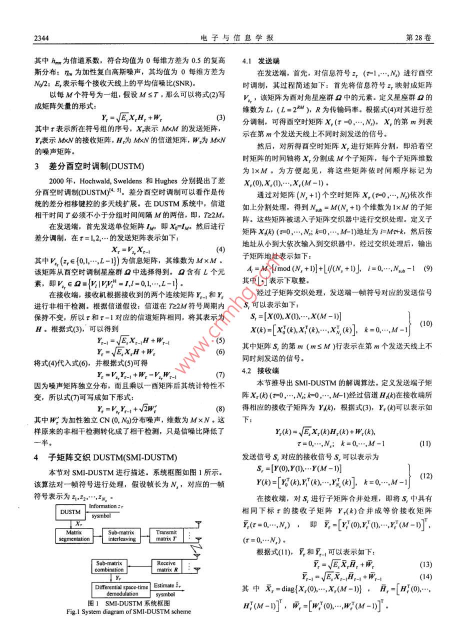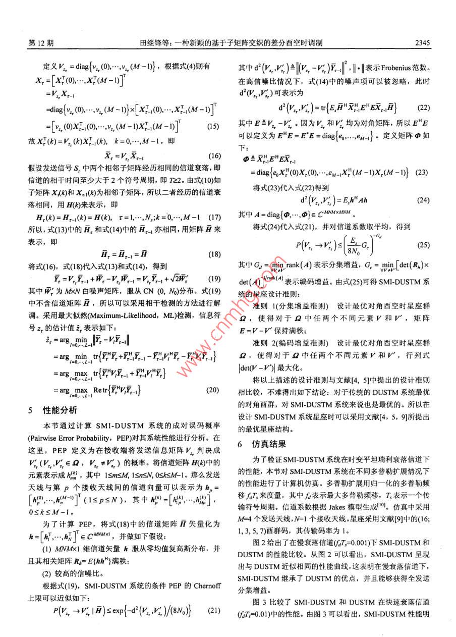 第28卷第12期電子與信息學(xué)報Vol.28No 122006年12月Journal of Electronics Information TechnologyDec.2006一種新穎的基于子矩陣交織的差分酉空時調(diào)制田繼鋒姜海寧羅漢文宋文濤徐友云上海交通大學(xué)電子工程系上海2000摘要差分酉空時調(diào)制 DUSTM是一種應(yīng)用于時變衰落信道下的多天線調(diào)制方法。該方法在慢衰落信道下無需知道信道狀態(tài)信息而能獲得全發(fā)送分集增益。但是,在快速衰落信道下,其性能明顯惡化并且呈現(xiàn)出較高的誤碼平層。該文通過在差分酉空時調(diào)制中引入矩陣分割和子矩陣交織等操作提出了一種基于子矩陣交織的差分酉空時調(diào)制(SM- DUSTM)方案,并對其性能進行了分析。性能分析和相應(yīng)的計算機仿真證明了SM- DUSTM不僅能夠繼承DUSTM在慢衰落信道下的優(yōu)點,而且在快速衰落信道下能夠保持良好的系統(tǒng)性能關(guān)鍵詞差分酉空時調(diào)制,時變衰落,多天線,交織中圖分類號:TN9143文獻標(biāo)識碼:A文章編號:1009-5896(2006)122343-04A Novel Sub-matrix Interleaved DifferentialUnitary Space-Time ModulationTian Ji-feng Jiang Hai-ning Luo Han-wen Song Wen-tao Xu You-yunDept. of Electronic Eng, Shanghai Jiaotong Univ, Shanghai 200030, China)Abstract Differential Unitary Space-Time Modulation(DUSTM), which is a multi-antenna modulation technique fortime-varying fading channels, can obtain full diversity gains without channel state information at the receiver in slowlyfading channels. For fast fading channels, however, its performance degrades considerably and suffers an irreducible errorfloor. In this paper, a novel Sub-Matrix Interleaved Differential Unitary Space-Time Modulation(SMI-DUSTM) scheme isproposed, in which matrix-segmentation and sub-matrix based interleaving are combined with conventional DUSTM. Theconstellation design criteria of SMI-DUSTM are also derived in this paper, based on the calculation of Pairwise ErrorProbability(PEP). The performance analysis and simulation results demonstrate that SMI-DUSTM can not only inherit themerit of DUSTM in slowly fading channels, but also maintain a good performance in fast fading channelsKey words Differential Unitary Space-Time Modulation(DUSTM), Time-varying fading, Multi-antenna, Interleaving1引言時矩陣沿著時間軸分割成若干子矩陣。最后,對這些子矩陣多天線無線通信系統(tǒng)因為能夠提供更高的數(shù)據(jù)傳輸率進行交織處理后發(fā)送到相應(yīng)的發(fā)送天線上。由于采用了子矩并保證更低的誤碼差錯概率而得到人們越來越多的注意。陣交織的方法,本文所提的 SMI-DUSTM方案對多普勒擴展但是,大多數(shù)多天線系統(tǒng)假設(shè)接收端已知信道狀態(tài)信息,而具有更好的魯棒性,而且在快速衰落信道下性能明顯優(yōu)于傳這在多數(shù)情況下是無法保證的,尤其是在時變信道或者發(fā)送統(tǒng)的 DUSTM。本文還對其系統(tǒng)性能進行了分析,計算出了端采用更多的發(fā)送天線的時候。為了解決這個問題,成對誤碼概率(PEP),并給出了相應(yīng)的最優(yōu)空時星座設(shè)計準(zhǔn)Hochwald和 Sweldens于2000年提出了差分酉空時調(diào)制Differential Unitary Space- -Time Modulation, DUSTM)方案。2系統(tǒng)模型Hughes也于2000年提出類似的方案。差分酉空時調(diào)制在多天線無線通信系統(tǒng)包含M個發(fā)送天線和N個接收天慢衰落信道下無需知道信道狀態(tài)信息而能達到信道容量,因線。假設(shè)不同發(fā)送接收天線對之間的子信道系數(shù)統(tǒng)計獨立,而近年來獲得了越來越多的關(guān)注但是在快速衰落信道且為時變平坦瑞利衰落信道,信道相干時間為T,即該信道下, DUSTM的性能急速惡化并呈現(xiàn)出較高的誤碼平層。在T個符號周期內(nèi)保持不變。令xm表示在第m(m=1,2…,M本文提出了一種新穎的基于子矩陣交織的差分西空時個發(fā)送天線第r(=1,2,,D個時隙發(fā)送的基帶信號,它滿足調(diào)制( SMI-DUSTM方案,它不僅能夠繼承 DUSTM在慢衰落下式信道下的優(yōu)點,而且在快速衰落信道下能夠保持良好的系統(tǒng)性能。在SM|- DUSTM系統(tǒng)中,首先信息符號被映射成酉空小0時星座,然后通過差分調(diào)制,生成空時矩陣,接著將這些空在第n(m=1,2,…,M個接收天線第t(=1,2,…,T)個時隙接收到的信號ym可以如下表示2005-04-04收到,2005-0916改回國家自然科學(xué)基金(60272079)和國家863計劃項目(2003AA12330)VE∑資助課題電子與信息學(xué)報第28卷其中hm為信道系數(shù),符合均值為0每維方差為05的復(fù)高4.1發(fā)送端斯分布;nm為加性復(fù)白高斯噪聲,其均值為0每維方差為在發(fā)送端,首先,對信息符號zr(=1,…,N)進行酉空N/2:E表示每個接收天線上的平均信噪比(SNR)。時調(diào)制,其過程簡述如下:首先將信息符號z映射成矩陣以每M個符號為一組,假設(shè)MsT,那么可以將式(2)寫v,該矩陣為西對角星座群中的元素。定義星座群2的成矩陣矢量的形式Y(jié)=√EX,H+W維數(shù)為L,(L=2),R為傳輸碼率。根據(jù)式(4)對其進行差其中τ表示所在符號組的序號,X表示MM的發(fā)送矩陣分調(diào)制,可得酉空時矩陣X1(r=0…,N)。X的第m列表Y表示MN的接收矩陣,H為MkN的信道矩陣,W為MN示在第m個發(fā)送天線上不同時刻發(fā)送的信號。的噪聲矩陣然后,對所得酉空時矩陣x進行矩陣分割,即沿著空時矩陣的時間軸將X分割成M個子矩陣,每個子矩陣維數(shù)3差分酉空時調(diào)制( DUSTM為1×M。為方便起見,將這些矩陣依時間順序標(biāo)記為2000年, Hochwald,, Sweldens和 Hughes