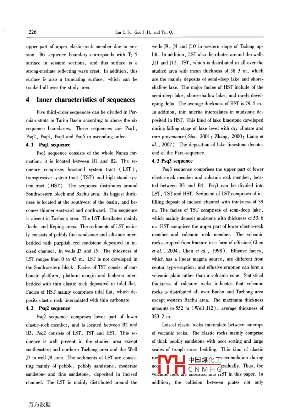 Global Geology, 14(4): 221-230(2011)doi;10. 3969/j. issn. 1673-9736. 2011. 04.02Article ID: 1673-9736(2011 )040221-10Permian sequence stratigraphy of shallow water basinin Tarim BasinLIU Chensheng',2,GUO Jianhual!2 and YIN Qiong',2I. Key Laboralory of Nonferrous Meallogentic Prognosis,Ministry of Education, Central Souh University, Changsha 410083, China;2. School of Geosciences and Info-physics , Central South University, Changsha 410083, ChinaAbstract: Based on analysis of drilling, logging and field profile data, six sequence boundaries in Permian areidentified in Bachu and Tazhong regions of Tarim Basin. All sequence boundaries are of type I sequence bound-aries, and are characterized by down cut. According to the six sequence boundaries, the Permian in this areacan be divided into 5 third-order sequences, and all the sequences correspond with classic sequence model ofVail. Sequence Psq4 indicates lake transgressive system tract (TST) and highstand system tract ( HST). Se-quences Psq1,Psq2, Psq3, Psq5 indicate low stand system tract ( LST) , transgressive system tract and high-stand system tract. LST is deposited by incised channel ifilling with features of fluvial facies. TST is depositedby shore shallw lake and semi -deep lake. HST is deposited by semi -deep lake ,shore-shallow lake and delta.In addition, volcanic rocks are present on the top part of HST in sequence Psq3. Incised channel inilling anddeltaice deposits were mainly distributed on westerm slope of Tadong uplift.Key words: Tarim Basin; Permian; sequence stratigraphy ; incised channel in6lling; deltaic depositing and inner framework of sequences.1 IntroductionTarim Basin is a typical shallow basin in PermianThe reasons for formation of shallow basins arewhich is also the most important period for transfor-drought climate and flat lake bottom. Because waterming of Tarim Basin from marine to continental facies.body of shallow basin is shallow , basin sediments areMarine carbonates deposited in west and southwesterndifferent from others in type, mainly including shore-parts of the basin in Early Permian. During later Earlyshallow lake, semi-deep lake and delta, rare deepPermian, regression happened from east to west( He etlake. Due to drought climate , shallw water body andal, 2005), and fllowed by deposition with craton-lttle provenance, lacustrine fan and wedge-shapeinner-depression continental facies. During Middlebody deposited in lowstand system tract don not devel-Permian, lots of volcanic rocks are present in the ba-oped. Major sediment is fine grain sediment, such assin because of close of South Tianshan Ocean and col-mudstone which intercalates with thin lake carbonatelision between Tianshuihai block ( Qaidam block) andin the basin. Coarse grain sediment often distributesTarim block (Fig. 1). Most area of the basin is uplif-around basin margin. Because shallow basin has spe-ted with continental deposition during Late Permiancial sedimentary environment, there are particularities(Ji中國煤化工Ioreland basin onlyin sequence boundaries recognizing, sequence divid-distri!YHC N M H Greas, where devel-Received 22 June 2011, accepted 20 July 2011222liwC.S., GuoJ.H. and Yin Q.oped fluvial and lacustrine facies. Comprehensive re-derstanding of reservoir types and distribution fea-search of Permian sequence is beneficial for better un-UrumchiJunggar PlateNt-haptiashagsag-ntianshan block.PAKS0--KurleHgishichang sction 10wuping, Tazhong areTadong uplft arca"Makeleinkagblock1Qaidam Plate'Hertian\●1312口subduction belt口mainfault CV ieland- are beltactive belt of ancient landthe studied arca國basement rocks of Tarim Plateblock boundaryFig.1 Location of study area2 Sedimentary characteristic3 Sequence boundary recognitionTarim Basin can be divided into four blocks viz:The main evidences for recognizing sequenceSouthwestern block, Keping block , Taklimakan blockboundaries include:①absence of strata; ?change ofand Nantianshan block. Bachu and Tazhong are theparasequence superimposing styles; ③sharp changesfocused study areas in this paper are located in Takli-of facies;④erosion and infll of fluvial;⑤inner re-makan block, where the Permian strala are divided in-flection features of seismic data. According to thoseto Nanzha Formation, lower clastic-rock member, vol-evidences, six sequence boundaries can be recognizedcanic member and upper clastic-rock member. Thein Permian in this area. 'These boundaries from lowerNanzha Formation deposited by micrite and grainedto upper strala are BI, B2, B3, B4, B5 and B6.limeslone is only distributed al Bachu and southwest-boundary B1 : under which develops carbonateem Tarim Basin ( Wang et al., 2006). Thickness ofrock deposited in Carboniferous, locates in the bottormNanzha Formation becomes thinning from southwest toof Permian. Paleo-weathering crust, inilling of ero-Bachu area, and the strata are absent in Tazhong areaded channel and tide flat facies are present over the(Ding el al, 1998). light-gray and brown red thicksequence boundary. Facies sharply developed uppermudstone intercalated with sandstone and limestone ,and lower boundary BI change , thus, boundary BI isis the major deposition in the lower clastic-rock mem-ast中國煤化Iygena zone, Trit-ber and upper clastic -rock member. Clastic-rock faci-icites:IHCNMHGare normally pres-es include lacustrine, fluvial and delta (Jiang et al.,ent beuween rerman au Luarouerous are absenl ac-2003) .cording to paleontological data( Xiong, 1997; ZhangPermian sequence stratigraphy of shallow water basin in Tarim Basin223el al, 2006). The reason is that the strata were up-conformity surface in Qimugen-Sangzhuhe section inlifted after Carboniferous deposition and then eroded.Southwesterm block (Xi et al. , 2002). Platform car-Thus, the boundary B1 is a type I sequence bounda-bonate of Keziliqiman Formation ( corresponding tory, it corresponds to T rllecting surface according toNanzha Formation) deposits under boundary B2, butseismic da