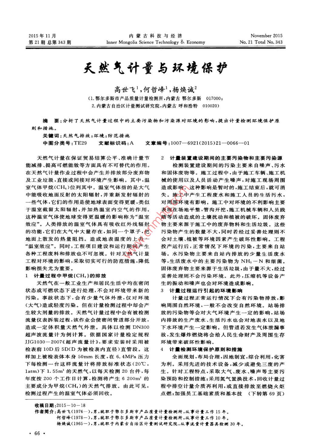 2015年11月內(nèi)蒙古科技與經(jīng)濟(jì)November 2015第21期總第343Inner Mongolia Science Technology & EconomyNo 21 Total No 343天然氣計(jì)量與環(huán)境保護(hù)高世飛1,何哲峰1,楊煥誠2(1.鄂爾多斯市產(chǎn)品質(zhì)量計(jì)量檢測所,內(nèi)蒙古鄂爾多斯017000;2.內(nèi)蒙古自治區(qū)計(jì)量測試研究院,內(nèi)蒙古呼和浩特010020)摘要:分析了天然氣計(jì)量過程中的主要污染物和污染源對(duì)環(huán)境的影響,提出計(jì)量檢測環(huán)境保護(hù)原則和措施關(guān)犍詞:天然氣排放;環(huán)境;防范措施中圖分類號(hào):TE29文獻(xiàn)標(biāo)識(shí)碼:A文章編號(hào):1007-6921(2015)21-0066-01天然氣計(jì)量在保證貿(mào)易結(jié)算公平、準(zhǔn)確計(jì)量節(jié)2計(jì)量裝置建設(shè)期間的主要污染物和主要污染源能減排、提高可燃能效等方面具有不可替代的作用。檢測裝置建設(shè)期間的污染主要來自噪聲、污水在天然氣計(jì)量作業(yè)過程中會(huì)產(chǎn)生并排放部分廢棄物和固體廢物等。施工過程中,由于施工車輛、施工機(jī)及工業(yè)垃圾,直接或間接對(duì)環(huán)境產(chǎn)生影響。其中,溫械的使用以及人員活動(dòng)產(chǎn)生噪聲,對(duì)施工現(xiàn)場周圍室氣體甲烷(CH4)位列其中。溫室氣體指的是大氣造成影響。這種影響是暫時(shí)的,施工結(jié)束后,就可消中能吸收地面反射的太陽輻射,并重新發(fā)射輻射的失。施工中產(chǎn)生工程廢水和施工人員的生活污水,些氣體,它們的作用是使地球表面變得更暖,類似對(duì)周圍環(huán)境有影響。施工中對(duì)環(huán)境的不利影響主要于溫室截留太陽輻射,并加熱溫室內(nèi)空氣的作用。表現(xiàn)在場地平整,管溝開挖,施工機(jī)械車輛和人員踐這種溫室氣體使地球變得更溫暖的影響稱為“溫室踏等活動(dòng)造成的土壤擾動(dòng)和植被的破壞。固體廢棄效應(yīng)”。人類排放的溫室氣體具有吸收紅外線輻射物主要來源于施工中的廢棄物料和生活垃圾。這些的功能,它們?cè)诖髿庵写罅看嬖?如同一個(gè)罩子,把污染物產(chǎn)生的數(shù)量不大,同時(shí)若經(jīng)過妥善處理則不地面上散發(fā)的熱量阻擋。造成地表溫度的上升—會(huì)對(duì)土壤、植被等環(huán)境因素產(chǎn)生破壞性影響。工程溫室效應(yīng)”。同時(shí),工程項(xiàng)目建設(shè)和運(yùn)行期間產(chǎn)生投產(chǎn)運(yùn)行后,正常情況下環(huán)境的污染,主要來自站各種工程廢料和排放也不可忽視。針對(duì)天然氣計(jì)量場。水污染物主要來自站內(nèi)排放的少量生活廢水工程對(duì)環(huán)境的影響,釆取切實(shí)可行的防范措施,降低等,生活廢水中的主要污染物為NH2-N和細(xì)菌。影響損失尤為重要。固體廢棄物主要來源于生活垃圾,由于量不大,經(jīng)過計(jì)量過程中甲烷(CH4)的排放妥善處理則不會(huì)污染環(huán)境。此外,壓縮機(jī)等設(shè)備產(chǎn)天然氣在一般工業(yè)生產(chǎn)和居民生活中均在密閉生的振動(dòng)和噪聲也會(huì)對(duì)環(huán)境造成影響狀態(tài)或可燃狀態(tài)下進(jìn)行處理,不會(huì)對(duì)環(huán)境帶來新的3計(jì)量過程運(yùn)行引起的環(huán)境影響污染。事故狀態(tài)下,會(huì)有少量氣體外泄,僅對(duì)環(huán)境計(jì)量過程正常運(yùn)行情況下會(huì)有污染物排放,影大氣)造成輕度污染。但在計(jì)量檢測過程中卻會(huì)產(chǎn)響周圍自然環(huán)境,一般不會(huì)改變自然環(huán)境。站場排生較大劑量的排放。天然氣計(jì)量過程中會(huì)有被檢測放的污染物等會(huì)對(duì)大氣環(huán)境產(chǎn)生一定的影響,站場流量儀表拆裝過程,該作業(yè)會(huì)使密閉管道部分開放,內(nèi)排放的生產(chǎn)廢水、生活污水也會(huì)對(duì)地表水以及地造成一定體積量天然氣外泄。具體以檢測DN300下水環(huán)境產(chǎn)生一定影響。但管道若發(fā)生氣體泄漏事超聲波流量計(jì)為例計(jì)算。依據(jù)國家計(jì)量檢定規(guī)程故,發(fā)生爆炸燃燒將會(huì)給人民生命財(cái)產(chǎn)及周圍生存JJG1030—2007《超聲流量計(jì)》,要求安裝時(shí)采用被環(huán)境帶來破壞性影響。檢表前10D后5D(D為被檢表內(nèi)直徑)直管段。這4計(jì)量檢測環(huán)境保護(hù)原則和措施樣加上被檢表體本身50mm長度,在6.4MPa壓力全面規(guī)劃,布局合理,因地制宜,綜合利用,化害下每檢測一臺(tái)這樣流量計(jì)將排放標(biāo)準(zhǔn)狀態(tài)(20℃,為利。采用先進(jìn)的技術(shù)設(shè)備,減少或避免三廢的產(chǎn)latm)下1.55m3的天然氣,以每天檢測20臺(tái)件,每生。針對(duì)工程特點(diǎn),采取大氣、廢水、噪聲等主要污年度按200個(gè)工作日計(jì)算,檢測將產(chǎn)生6200m3的染預(yù)防和控制措施;采用氮?dú)庵脫Q技術(shù),回收計(jì)量過主要成分為甲烷(CH4)的天然氣排放。由此可見,程中排空計(jì)量介質(zhì)再利用,或直接排放至燃燒火炬檢測過程產(chǎn)生的溫室氣體必須回收。點(diǎn)燃;加強(qiáng)員工基礎(chǔ)素質(zhì)和基本技(下轉(zhuǎn)第69頁)收藕日期:2015-10-18作者簡介:高世飛(1976—),男,就職于鄂爾多斯市產(chǎn)品質(zhì)量計(jì)量檢測所,從事計(jì)量工作15年何哲峰(1978-—),男,就職于鄂爾多斯市產(chǎn)品質(zhì)量計(jì)量檢測所,從事計(jì)量工作10年。楊煥誠(1965—),男,就職于內
