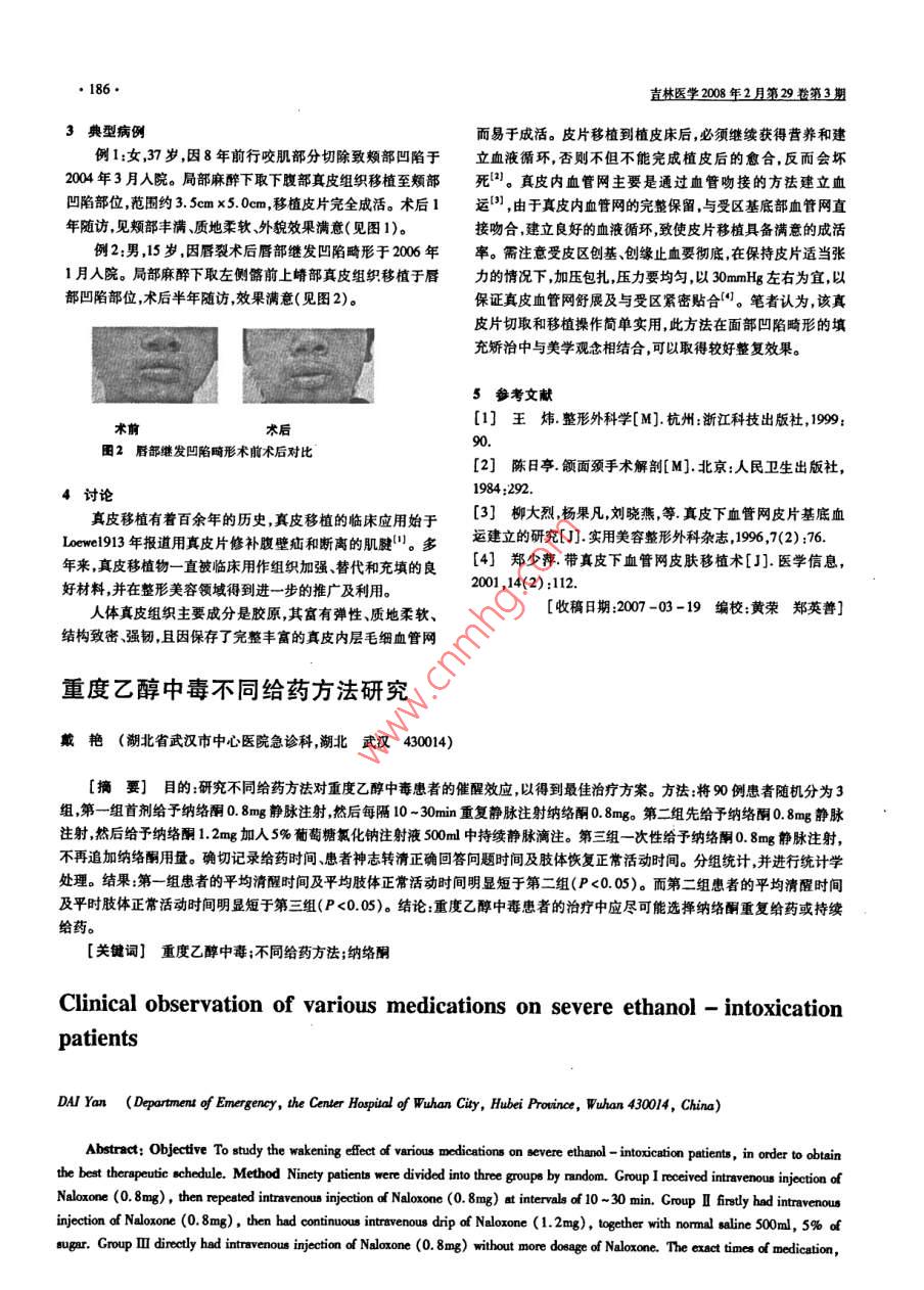 186直林醫(yī)學(xué)2008年2月第29卷第3期3典型病例而易于成活。皮片移植到植皮床后,必須繼續(xù)獲得營(yíng)養(yǎng)和建例1:女,37歲因8年前行咬肌部分切除致頰部凹陷于立血液循環(huán)否則不但不能完成植皮后的愈合,反而會(huì)壞004年3月人院。局部麻醉下取下腹部真皮組織移植至類(lèi)部死1。真皮內(nèi)血管網(wǎng)主要是通過(guò)血管吻接的方法建立血凹陷部位范圍約3.5cmx50cm,移植皮片完全成活。術(shù)后1運(yùn)1,由于真皮內(nèi)血管網(wǎng)的完整保留,與受區(qū)基底部血管網(wǎng)直年隨訪見(jiàn)頰部豐滿、質(zhì)地柔軟、外貌效果滿意(見(jiàn)圖1)。接吻合,建立良好的血液循環(huán)致使皮片移植具備滿意的成活例2:男,15歲因唇裂術(shù)后唇部繼發(fā)凹陷畸形于2006年率。需注意受皮區(qū)創(chuàng)基、創(chuàng)緣止血要徹底在保持皮片適當(dāng)張1月人院。局部麻醉下取左側(cè)髂前上嵴部真皮組織移植于唇力的情況下加壓包扎,壓力要均勻,以30mmHg左右為宜,以部凹陷部位,術(shù)后半年隨訪效果滿意(見(jiàn)圖2)。保證真皮血管網(wǎng)舒展及與受區(qū)緊密貼合聞。筆者認(rèn)為,該真皮片切取和移植操作簡(jiǎn)單實(shí)用,此方法在面部凹陷畸形的填充矯治中與美學(xué)觀念相結(jié)合,可以取得較好整復(fù)效果。5參考文獻(xiàn)[]王煒整形外科學(xué)M]杭州:浙江科技出版社,199術(shù)前術(shù)后9圖2唇部繼發(fā)凹陷畸形術(shù)前術(shù)后對(duì)比[2]陳日亭頜面頸手術(shù)解剖[M]北京:人民衛(wèi)生出版社,4討論1984:292.真皮移植有著百余年的歷史真皮移植的臨床應(yīng)用始于[3]柳大烈楊果凡,劉驍燕等真皮下血管網(wǎng)皮片基底血Lw930年報(bào)道用真皮片修補(bǔ)腹壁疝和斷離的肌腱"多運(yùn)建立的研究[J實(shí)用美容整形外科雜志9,7(2):76年來(lái)真皮移植物一直被臨床用作組織加強(qiáng)、替代和充填的良[4]鄭少萍帶真皮下血管網(wǎng)皮膚移植術(shù)[].醫(yī)學(xué)信息,好材料,并在整形美容領(lǐng)域得到進(jìn)一步的推廣及利用2001,14(2):112.人體真皮組織主要成分是膠原其富有彈性質(zhì)地柔軟[收稿日期:2007-03-19編校黃榮鄭英善]結(jié)構(gòu)致密、強(qiáng)韌且因保存了完整豐富的真皮內(nèi)層毛細(xì)血管網(wǎng)重度乙醇中毒不同給藥方法研究戴艷(湖北省武漢市中心醫(yī)院急診科湖北武漢430014)摘要]目的研究不同給藥方法對(duì)重度乙醇中毒患者的催醒效應(yīng)以得到最佳治療方案。方法:將90例患者隨機(jī)分為3組,第一組首劑給予納絡(luò)酮0.8mg靜脈注射然后每隔10~30min重復(fù)靜脈注射納絡(luò)酮0.8mg。第二組先給予納絡(luò)酮08mg靜脈注射然后給予納絡(luò)酮1.2mg加人5%葡萄糖氯化鈉注射液500m中持續(xù)靜脈滴注。第三組一次性給予納絡(luò)酮0.8mg靜脈注射,不再追加納絡(luò)酮用量。確切記錄給藥時(shí)間患者神志轉(zhuǎn)清正確回答問(wèn)題時(shí)間及肢體恢復(fù)正?;顒?dòng)時(shí)間。分組統(tǒng)計(jì),并進(jìn)行統(tǒng)計(jì)學(xué)處理。結(jié)果:第一組患者的平均清醒時(shí)間及平均肢體正?;顒?dòng)時(shí)間明顯短于第二組(P<0.05)。而第二組患者的平均清醒時(shí)間及平時(shí)肢體正?;顒?dòng)時(shí)間明顯短于第三組(P<0.05)。結(jié)論重度乙醇中毒患者的治療中應(yīng)盡可能選擇納絡(luò)酮重復(fù)給藥或持續(xù)給藥。[關(guān)鍵詞]重度乙醇中毒;不同給藥方法;納絡(luò)酮Clinical observation of various medications on severe ethanol-intoxicationpatientsDAI Yan (Department of Emergency, the Center Haupital of Wuhan Ciy, Hubei Prouince, Wuhan 430014, China)Abstract: Objective To study the wakening effect of various medications on severe ethanol-intoxication patients, in order to obtainthe best therapeutic scMethod Ninety patients were divided into three groups by random, Group I received intravenous injection ofNaloxone(0. 8mg), then repeated intravenous injection of Naloxone(0. 8mg)at intervals of 10-30 min. Croup I firstly had intravenousinjection of Naloxone(0. 8mg), then had continuous intravenous drip of Naloxone(1. 2mg), together with normal saline 500ml, 5%ofsugar. Group Ill directly had intravenous injection of Naloxone(0. 8mg) without more dosage of Naloxone. The exact times o medication林醫(yī)學(xué)2008年2月第29卷第3期the patients gained consciousness and were able to answer the questions correctly, and body resumed normal function were recorded. Re-sults The average time that was needed for the patients gaining consciousness and body resuming nomal function in group I was obviouslyshorter than that of group I(P<0. 05), and that in group I was obviously shorter than in group I(P<0. 05). Conclusion Medica-tion should be given repeatedly or continuously in the treatment of severe ethanol intoxication patientsKey Words: Severe ethanol intoxication; various medications; Naloxone急性乙醇中毒是急診常見(jiàn)病之一,中毒后主要對(duì)中樞神源性阿片肽釋放出來(lái),乙醇代謝的某些產(chǎn)物也具有阿片樣作經(jīng)系統(tǒng)產(chǎn)生抑制作用進(jìn)一步影響呼吸和循環(huán)系統(tǒng)。重度中用,表現(xiàn)為中樞神經(jīng)系統(tǒng)的抑制,出現(xiàn)運(yùn)動(dòng)及神經(jīng)精神失常毒可誘發(fā)心血管系統(tǒng)疾患或呼吸中樞麻痹而死亡。納絡(luò)酮是嚴(yán)重者呈昏睡昏迷狀態(tài)及導(dǎo)致呼吸中樞麻痹。納絡(luò)酮為阿片受體拮抗劑,目前廣泛應(yīng)用于急性乙醇