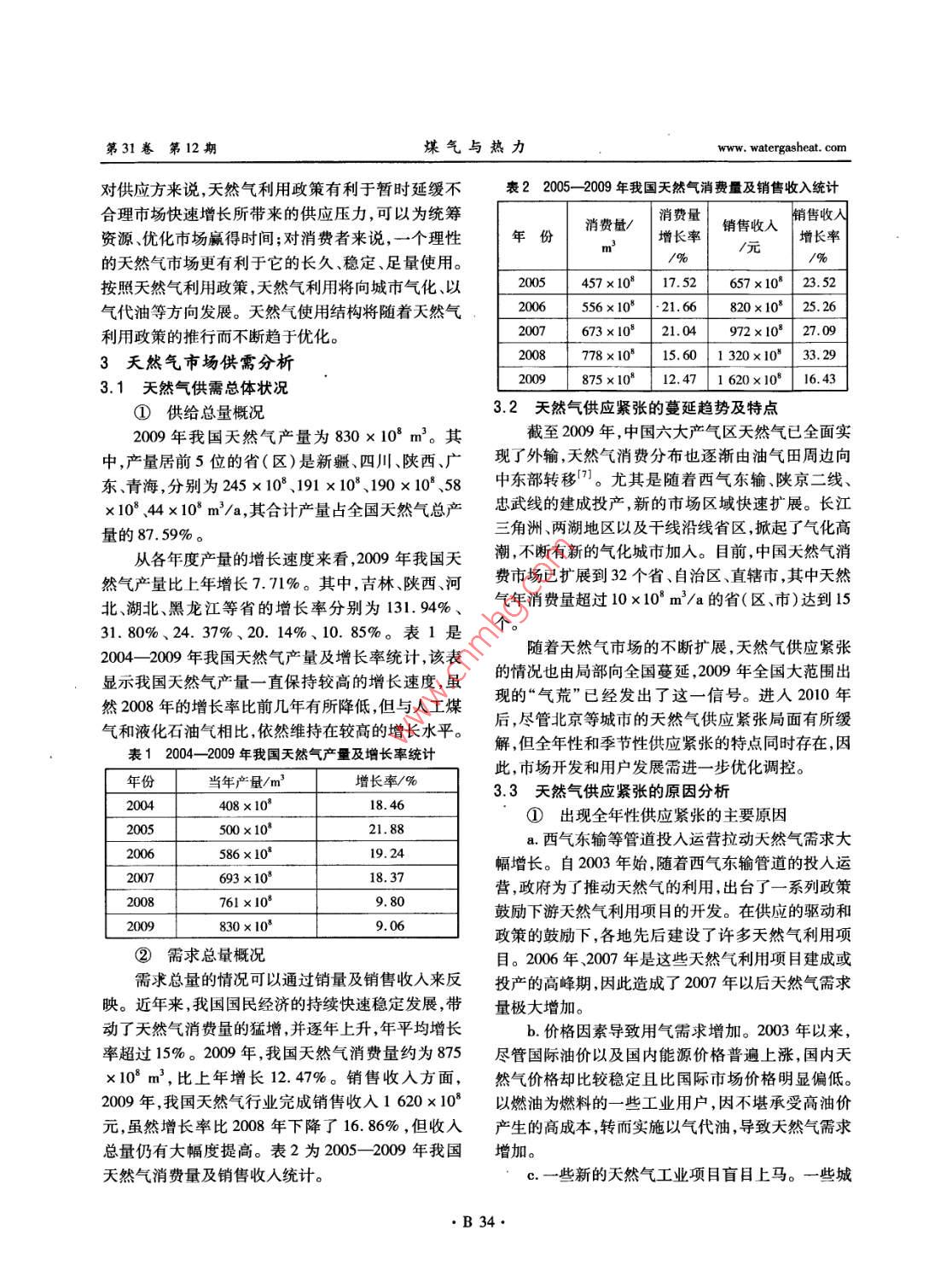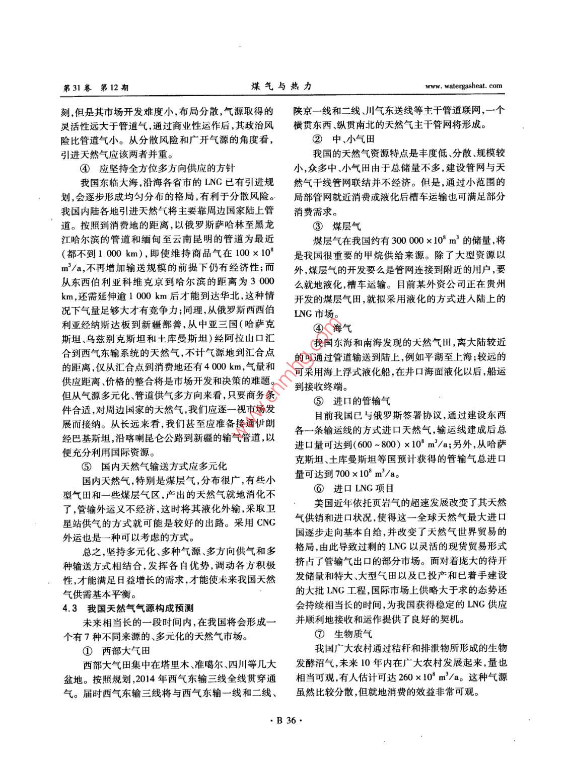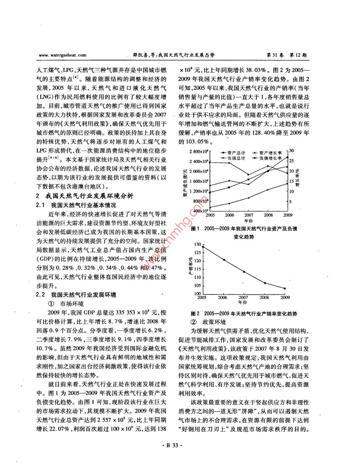 第31卷第12期煤氣與熱力Vol 31 No. 12201l年12月Gas heatDec. 2011我國天然氣行業(yè)發(fā)展態(tài)勢薛凱喜32,胡艷香2,潘貴生3,石一磊13(1.重慶大學土木工程學院,重慶400045;2.東華理工大學建筑工程學院,江西南昌300099;}3.重慶翼志投資咨詢有限公司,重慶400040)摘要:論述了我國天然氣行業(yè)的發(fā)展環(huán)境,指出天然氣因具有獨特的優(yōu)勢將在未來城市燃氣構(gòu)成中占有越來越大的比例。通過分析天然氣市場供需狀況,認為我國天然氣當前供應(yīng)緊張的局面呈蔓延趨勢,從全年性和季節(jié)性倛應(yīng)緊張兩個方面指岀了原因、給出了應(yīng)對措施。展望了天然氣行業(yè)的發(fā)展前景,對我國天然氣的需求進行了預(yù)測,提出了滿足供應(yīng)缺口的措施。分析預(yù)測了未來我國天然氣供給市場的來源構(gòu)成。關(guān)鍵詞:天然氣行業(yè);市場;供需;發(fā)展態(tài)勢;預(yù)測中圖分類號:TU996文獻標識碼:B文章編號:1000-4416(2011)12-0B32-06Development Situation of Natural Gas Industry in ChinaXUE Kaixi, HU Y anxiang, PAN Guisheng, SHI YileiAbstract: The development environment of natural gas industry in China is elaborated. It is pointed out that natural gas will account for a growing proportion in the constitution of city gas in the future dueto its unique advantages. Through analyzing the supply and demand status of natural gas market, it isconsidered that the Chinese natural gas supply shortage situation shows a tendency of spread. The causesfor the both annual and seasonal supply shortage are pointed out, and the relevant countermeasures areput forward. The future development of natural gas industry is prospected, the Chinese natural gas demand is predicted, and the measures to meet the supply gap are proposed. The source structure of theChinese natural gas supply market is analyzed and forecastedKey words: natural gas industry; market; supply and demand; development situation;概述家庭數(shù)量的增長將導(dǎo)致城市燃氣接駁業(yè)務(wù)需求量的燃氣能源是現(xiàn)代城市發(fā)展的必要條件,是城市增加和人均燃氣消費量的增加。另外,目前我國天功能正常運轉(zhuǎn)的基本保證(。中國城市化進程的然氣占一次能源消費量的比例還相當?shù)?按《BP世加快、家庭小型化趨勢和管道燃氣使用率的提升是界能源統(tǒng)計》數(shù)據(jù),中國2009年該比例約為3.6%,城市燃氣行業(yè)持續(xù)成長的動力2-3。隨著中國城市而同期世界均值約為23.7%。因此,天然氣行業(yè)整化進程不斷加快,城市人口快速增加天然氣用氣人體上尚有巨大的提升空間,其發(fā)展前景廣闊。口基數(shù)隨之擴大。同時,中國家庭正在加速小型化,20世紀90年代以來,我國燃氣行業(yè)發(fā)展迅速,基金項目:西部交通建設(shè)科技項目(2009318000001B32www.watergasheat.com薛凱喜,等:我國天然氣行業(yè)發(fā)展態(tài)勢第31卷第12期人工煤氣、IPG、天然氣三種氣源并存是中國城市燃×103元,比上年同期增長38.03%。圖2為2005氣的主要特點4。隨著能源結(jié)構(gòu)的調(diào)整和經(jīng)濟的2009年我國天然氣行業(yè)產(chǎn)銷率變化趨勢。由圖2發(fā)展,2005年以來,天然氣和進口液化天然氣可知,2005年以來,我國天然氣行業(yè)的產(chǎn)銷率(當年(LNG)作為民用燃料使用的比例有了較大幅度增銷售量與產(chǎn)量的比值)一直大于1,各年度銷售量總加。目前,城市管道天然氣的推廣使用已得到國家水平超過了當年產(chǎn)品生產(chǎn)總量的水平,也就是說行政策的大力扶持,根據(jù)國家發(fā)展和改革委員會2007,業(yè)處于供不應(yīng)求的局面。但隨著天然氣供應(yīng)量的逐年頒布的《天然氣利用政策》,確保天然氣優(yōu)先用于年增加和燃氣輸送管網(wǎng)的不斷擴大,上述趨勢有所城市燃氣的原則已經(jīng)明確。政策的扶持加上其自身緩解,產(chǎn)銷率也從2005年的128.40%降至2009年的特殊優(yōu)勢,天然氣將逐步對原有的人工煤氣和的103.05%。LPG形成替代,在一次能源消費結(jié)構(gòu)中的地位穩(wěn)步2800×103曾資產(chǎn)總計資產(chǎn)增長提升4-。本文基于國家統(tǒng)計局及天然氣相關(guān)行業(yè)2400×108負債總計負債增長率協(xié)會公布的經(jīng)濟數(shù)據(jù),論述我國天然氣行業(yè)的發(fā)展舊2000×1020態(tài)勢,以期為該行業(yè)的發(fā)展提供可借鑒的資料(以爛1600×10下數(shù)據(jù)不包含港澳臺地區(qū))。1200×103我國天然氣行業(yè)發(fā)展環(huán)境分析800×1032.1我國天然氣行業(yè)基本情況近年來,經(jīng)濟的快速增長促進了對天然氣等清400×1032005200620082009潔能源的巨大需求,建設(shè)資源節(jié)約型、環(huán)境友好型社會和發(fā)展低碳經(jīng)濟已成為我國的長期基本國策,這圖12005-2009年我國天然氣行業(yè)資產(chǎn)及負債為天然氣的持續(xù)發(fā)展提供了充分的空間。國家統(tǒng)計變化趨勢局數(shù)據(jù)顯示,天然氣工業(yè)總產(chǎn)值占國內(nèi)生產(chǎn)總值(GDP)的比例在持續(xù)增長,205-2009年,該比例分別為0.28%、0.32%、0.34%、0.44%和0.47%。零115由此可見,天然氣行業(yè)整體在國民經(jīng)濟中的地位逐11(步提升。2.2我國天然氣行業(yè)發(fā)展環(huán)境①市場環(huán)境年份2009年,我國GDP總量達335353×10°元,按圖22005-2009年天然氣行業(yè)產(chǎn)銷率變化趨勢可比價格計算,比上年增長8.7%,增速比2008年②政策環(huán)境回落0.9個百分點。分季度看,一季度增長6.2%為緩解天然氣