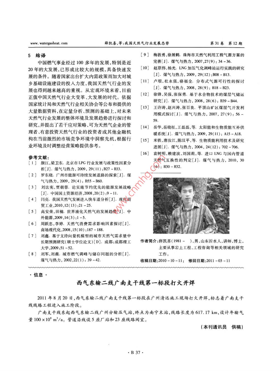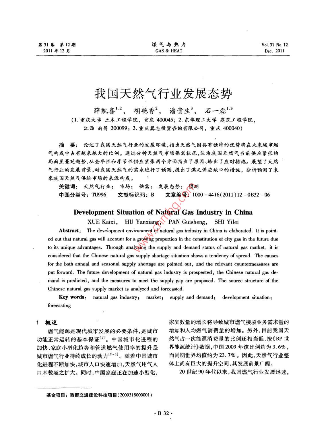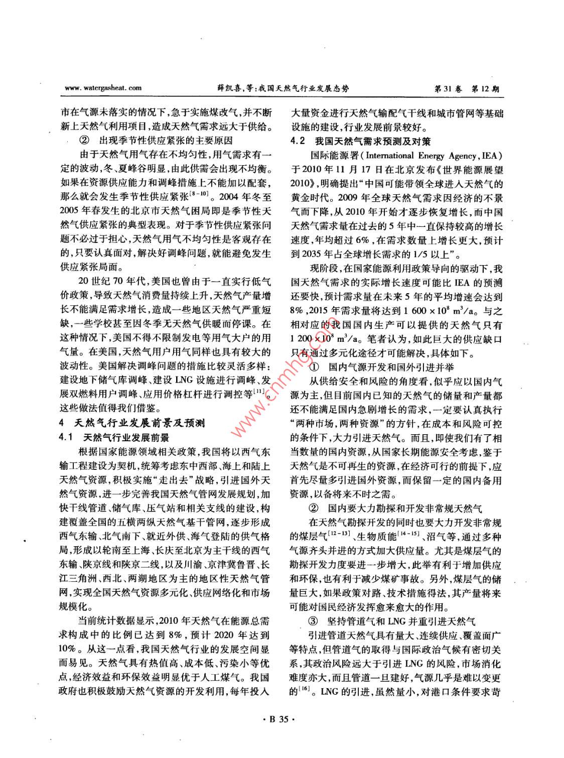 第31卷第12期煤氣與熱力Vol 31 No. 12201l年12月Gas heatDec. 2011我國天然氣行業(yè)發(fā)展態(tài)勢薛凱喜32,胡艷香2,潘貴生3,石一磊13(1.重慶大學土木工程學院,重慶400045;2.東華理工大學建筑工程學院,江西南昌300099;}3.重慶翼志投資咨詢有限公司,重慶400040)摘要:論述了我國天然氣行業(yè)的發(fā)展環(huán)境,指出天然氣因具有獨特的優(yōu)勢將在未來城市燃氣構(gòu)成中占有越來越大的比例。通過分析天然氣市場供需狀況,認為我國天然氣當前供應(yīng)緊張的局面呈蔓延趨勢,從全年性和季節(jié)性倛應(yīng)緊張兩個方面指岀了原因、給出了應(yīng)對措施。展望了天然氣行業(yè)的發(fā)展前景,對我國天然氣的需求進行了預(yù)測,提出了滿足供應(yīng)缺口的措施。分析預(yù)測了未來我國天然氣供給市場的來源構(gòu)成。關(guān)鍵詞:天然氣行業(yè);市場;供需;發(fā)展態(tài)勢;預(yù)測中圖分類號:TU996文獻標識碼:B文章編號:1000-4416(2011)12-0B32-06Development Situation of Natural Gas Industry in ChinaXUE Kaixi, HU Y anxiang, PAN Guisheng, SHI YileiAbstract: The development environment of natural gas industry in China is elaborated. It is pointed out that natural gas will account for a growing proportion in the constitution of city gas in the future dueto its unique advantages. Through analyzing the supply and demand status of natural gas market, it isconsidered that the Chinese natural gas supply shortage situation shows a tendency of spread. The causesfor the both annual and seasonal supply shortage are pointed out, and the relevant countermeasures areput forward. The future development of natural gas industry is prospected, the Chinese natural gas demand is predicted, and the measures to meet the supply gap are proposed. The source structure of theChinese natural gas supply market is analyzed and forecastedKey words: natural gas industry; market; supply and demand; development situation;概述家庭數(shù)量的增長將導(dǎo)致城市燃氣接駁業(yè)務(wù)需求量的燃氣能源是現(xiàn)代城市發(fā)展的必要條件,是城市增加和人均燃氣消費量的增加。另外,目前我國天功能正常運轉(zhuǎn)的基本保證(。中國城市化進程的然氣占一次能源消費量的比例還相當?shù)?按《BP世加快、家庭小型化趨勢和管道燃氣使用率的提升是界能源統(tǒng)計》數(shù)據(jù),中國2009年該比例約為3.6%,城市燃氣行業(yè)持續(xù)成長的動力2-3。隨著中國城市而同期世界均值約為23.7%。因此,天然氣行業(yè)整化進程不斷加快,城市人口快速增加天然氣用氣人體上尚有巨大的提升空間,其發(fā)展前景廣闊。口基數(shù)隨之擴大。同時,中國家庭正在加速小型化,20世紀90年代以來,我國燃氣行業(yè)發(fā)展迅速,基金項目:西部交通建設(shè)科技項目(2009318000001B32www.watergasheat.com薛凱喜,等:我國天然氣行業(yè)發(fā)展態(tài)勢第31卷第12期人工煤氣、IPG、天然氣三種氣源并存是中國城市燃×103元,比上年同期增長38.03%。圖2為2005氣的主要特點4。隨著能源結(jié)構(gòu)的調(diào)整和經(jīng)濟的2009年我國天然氣行業(yè)產(chǎn)銷率變化趨勢。由圖2發(fā)展,2005年以來,天然氣和進口液化天然氣可知,2005年以來,我國天然氣行業(yè)的產(chǎn)銷率(當年(LNG)作為民用燃料使用的比例有了較大幅度增銷售量與產(chǎn)量的比值)一直大于1,各年度銷售量總加。目前,城市管道天然氣的推廣使用已得到國家水平超過了當年產(chǎn)品生產(chǎn)總量的水平,也就是說行政策的大力扶持,根據(jù)國家發(fā)展和改革委員會2007,業(yè)處于供不應(yīng)求的局面。但隨著天然氣供應(yīng)量的逐年頒布的《天然氣利用政策》,確保天然氣優(yōu)先用于年增加和燃氣輸送管網(wǎng)的不斷擴大,上述趨勢有所城市燃氣的原則已經(jīng)明確。政策的扶持加上其自身緩解,產(chǎn)銷率也從2005年的128.40%降至2009年的特殊優(yōu)勢,天然氣將逐步對原有的人工煤氣和的103.05%。LPG形成替代,在一次能源消費結(jié)構(gòu)中的地位穩(wěn)步2800×103曾資產(chǎn)總計資產(chǎn)增長提升4-。本文基于國家統(tǒng)計局及天然氣相關(guān)行業(yè)2400×108負債總計負債增長率協(xié)會公布的經(jīng)濟數(shù)據(jù),論述我國天然氣行業(yè)的發(fā)展舊2000×1020態(tài)勢,以期為該行業(yè)的發(fā)展提供可借鑒的資料(以爛1600×10下數(shù)據(jù)不包含港澳臺地區(qū))。1200×103我國天然氣行業(yè)發(fā)展環(huán)境分析800×1032.1我國天然氣行業(yè)基本情況近年來,經(jīng)濟的快速增長促進了對天然氣等清400×1032005200620082009潔能源的巨大需求,建設(shè)資源節(jié)約型、環(huán)境友好型社會和發(fā)展低碳經(jīng)濟已成為我國的長期基本國策,這圖12005-2009年我國天然氣行業(yè)資產(chǎn)及負債為天然氣的持續(xù)發(fā)展提供了充分的空間。國家統(tǒng)計變化趨勢局數(shù)據(jù)顯示,天然氣工業(yè)總產(chǎn)值占國內(nèi)生產(chǎn)總值(GDP)的比例在持續(xù)增長,205-2009年,該比例分別為0.28%、0.32%、0.34%、0.44%和0.47%。零115由此可見,天然氣行業(yè)整體在國民經(jīng)濟中的地位逐11(步提升。2.2我國天然氣行業(yè)發(fā)展環(huán)境①市場環(huán)境年份2009年,我國GDP總量達335353×10°元,按圖22005-2009年天然氣行業(yè)產(chǎn)銷率變化趨勢可比價格計算,比上年增長8.7%,增速比2008年②政策環(huán)境回落0.9個百分點。分季度看,一季度增長6.2%為緩解天然氣