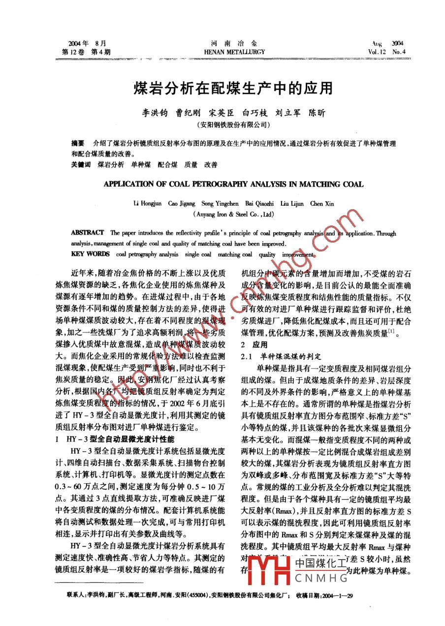 2004年8月河南冶金Aug 2004.第12卷第4期HENAN METALLURGYVol.12 No.4煤巖分析在配煤生產中的應用李洪鈞曹紀剛宋英臣白巧枝劉立軍陳昕(安陽鋼鐵股份有限公司)摘要介紹了煤巖分析鏡質組反射率分 布圖的原理及在生產中的應用情況,通過煤巖分析有效促進了單種煤管理和配合煤質量的改善。關鍵詞煤巖分析單種煤配合煤質量改善APPLICATION OF COAL PETROGRAPHY ANALYSIS IN MATCHING COALli Hongjun Cao Jigang Song Yingchen Bai Qiaozhi Liu Ljun Chen Xin(Anyang lron & Seel Co. ,Ld)ABSTRACT The paeper introduces the rlectivit profile' s pinciple of coal petrography analysis and is aplication. Throughanalysis. , manegement of single coal and quality of matching coal have been improved.KEY WORDS coal petrography analysis single coal matching coal quality improvenent近年來,隨著冶金焦價格的不斷上漲以及優(yōu)質機組分中碳元素的含量增加而增加,不受煤的巖石煉焦煤資源的缺乏,各焦化企業(yè)使用的煉焦煤種及成分含量變化的影響,是目前公認的最能全面準確煤源有逐年增加的趨勢。在進煤過程中,由于各地反映煉焦煤變質程度和結焦性能的質量指標。不僅資源條件不同和煤的質量控制方法的差異,使得進可有效的對進廠單種煤進行跟蹤監(jiān)督和評價,杜絕場單種煤煤質波動較大,存在著不同程度的混煤現(xiàn)劣質煤進廠,降低焦化配煤成本,而且還可用于配合象,加之一些洗煤廠為了追求高額利潤,將一些劣質煤管理,優(yōu)化配煤方案,預測及改善焦炭質量”1。煤摻入優(yōu)質煤中故意混煤,造成單種煤煤質波動較2應用大。而焦化企業(yè)采用的常規(guī)化驗方法難以檢查監(jiān)測2.1單種煤混煤的判定混煤現(xiàn)象,使配煤生產受到嚴重影響,同時也不利于單種煤是指具有一定變質程度及相同煤巖組分焦炭質量的穩(wěn)定。因此,安鋼焦化廠經(jīng)過認真考察組成的煤。但由于成煤地質條件的差異、巖層深度分析,根據(jù)國內各廠均把鏡質組反射率確定為判定的不同及外界條件的影響,嚴格意義上的單種煤基煉焦煤變質程度的指標的情況,于2002年6月底引本上是不存在的。通常所謂的單種煤是指煤巖分析進了HY-3型全自動顯微光度計,利用其測定的鏡具有鏡質組反射率直方圖分布范圍窄、標準方差“S”質組反射率分布圖對進廠單種煤進行鑒定。小等特點的煤,并且該煤種的各批次來煤顯微組分HY- 3型全自動顯微光度計性能基本無變化。而混煤-般指變質程度不同的兩種或HY-3型全自動顯微光度計系統(tǒng)包括顯微光度兩種以上的單種煤按- -定 比例混合成煤巖組成差別計、四維自動掃描臺、數(shù)據(jù)采集系統(tǒng)、掃描物臺控制較大的煤,其煤巖分析表現(xiàn)為鏡質組反射率直方圖系統(tǒng)、計算機、打印機等。顯微光度計的測定點數(shù)在為雙峰或多峰、分布范圍寬及標準方差“S"大等特0.3~ 60萬點之間,測定速度為每分鐘0.5~ 10萬點。常規(guī)的煤的工業(yè)分析及全分析難以判定其混洗點。其通過3點直線提取方法,可準確反映進廠煤程度。但是由于各個煤種具有一定的鏡 質組平均最中各變質程度的煤的分布情況。配套計算機系統(tǒng)能大反射率(Rmax),并且反射率直方圖的標準方差s將自動測試和數(shù)據(jù)處理--次完成,可與常用打印機可以表示煤的混洗程度,因此可利用鏡質組反射率相連,顯示并打印出有關參數(shù)及曲線等。分布圖中的Rmax和s分別判定來煤煤種及煤的混HY -3型全自動顯微光度計煤巖分析系統(tǒng)具有洗程度。其中鏡質組平均最大反射率Rmax與煤種測定速度快、準確性高、節(jié)省人力等特點。其測定的中國煤化工差s較小時,雖然鏡質組反射率是一項較好的煤巖學指標,隨煤的有為此種煤為單種煤。*YHCNMHG聯(lián)系人:李洪鈞,副廠長,高級工程師,河南.安陽45004),安陽鋼鐵股份有限公司焦化廠;收稿日期2004-1- -292004年第4剛河南冶金29●為此結合安鋼實際定為當某種進廠煤的巖相標準方Rax。差S≤0.2時,判定其為單種煤。表1煤種與鏡質組平均最大反射率(Rmex)對 應關系物1煤種Rmox/%氣煤0.65~0.801/3焦煤0.80-0.902.0 Par/%肥煤0.90~1.20焦煤1.20~1.69圉2煤種B鏡質組反射率分布瘦煤1.70-1.900↑貧煤1.90~2.50無煙煤2.50- 6.00* 15S= 0.28在配煤生產中,安鋼焦化廠采用1/3焦煤、焦煤肥煤、瘦煤四種煤進行配煤煉焦,除瘦煤外其余三種優(yōu)質煉焦煤都存在混洗現(xiàn)象,特別是焦煤混洗20~- Rax/%-現(xiàn)象較為嚴重,表現(xiàn)為摻人低變質程度或高變質程圖3煤種C鏡質組反射率分布度的煤冒充優(yōu)質煤,有的甚至將次質煤按作優(yōu)質煤2.2 優(yōu)化配煤方案,改善焦炭質量上煤,以謀取不正當利益。常規(guī)化驗分析方法難以配煤煉焦時,雖然配合煤的全分析指標在一定反映其真實質量狀況。因此可借助鏡質組反射率分程度上可粗略反應配煤質量及預測焦炭的質量狀布圖對來煤做出正確判斷。2002 年9月,安鋼焦化況,但鏡質組反射率分布圖更能準確合理反映其配廠對3種牌號為焦煤但質量狀況較差的來煤進行了比情況是否合理,焦炭質量是否達到預定要求,從而抽查分析,其全分析質量指標見表2。及時調整混合煤配比及配煤方案,改善焦炭質量。表2煤種A.B.C全分析質指標煤種水分灰分硫分揮發(fā)分膠質層膨脹度粘轅由于配合煤鏡質組反射率分布圖中,當Rmax-般在1.0~1.5之間、S在0.25~0.36之間、并且焦煤A 9.8 10.6 0.52 27.3516.5 21.3 82.1反射率分布圖中,靠近
