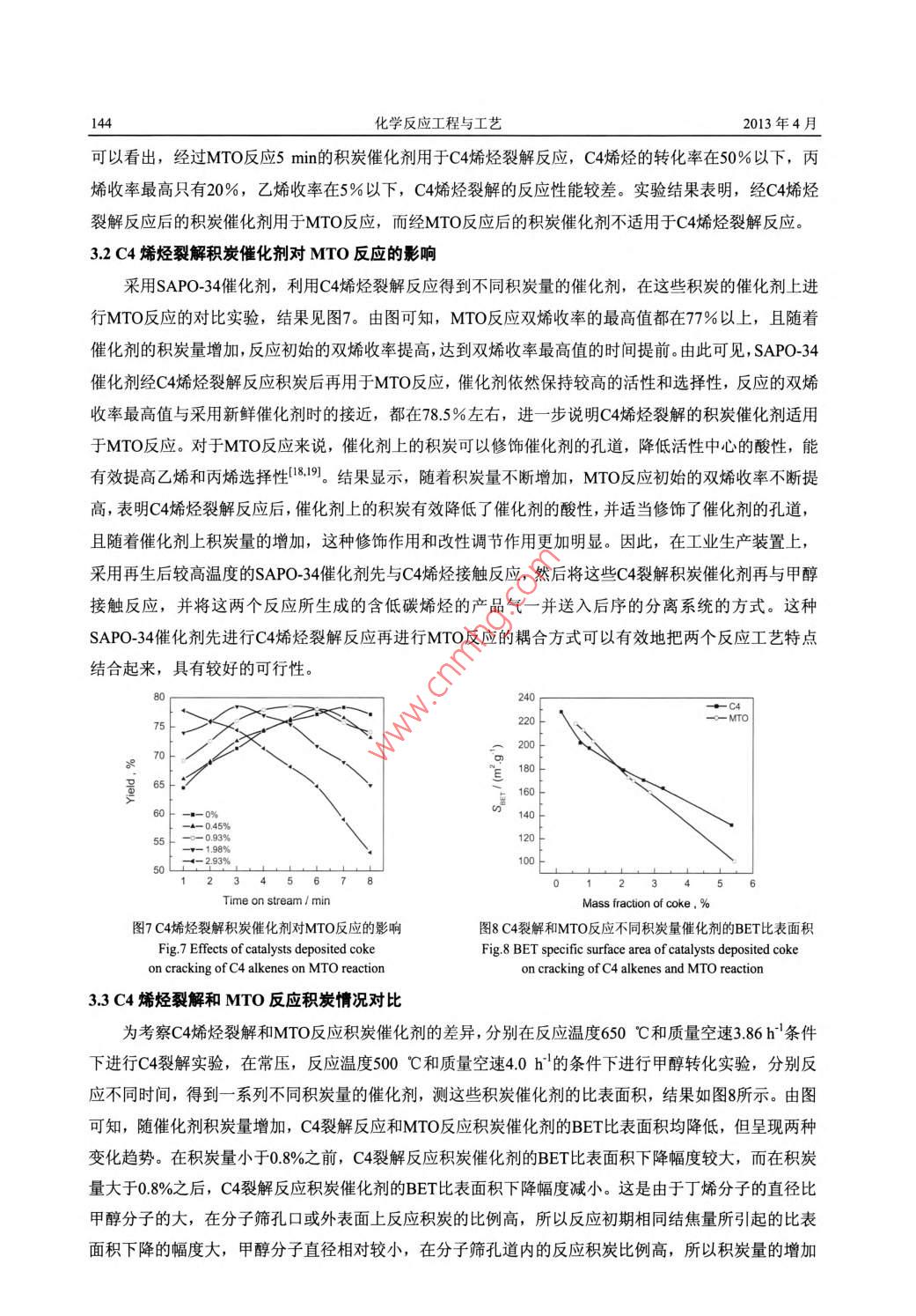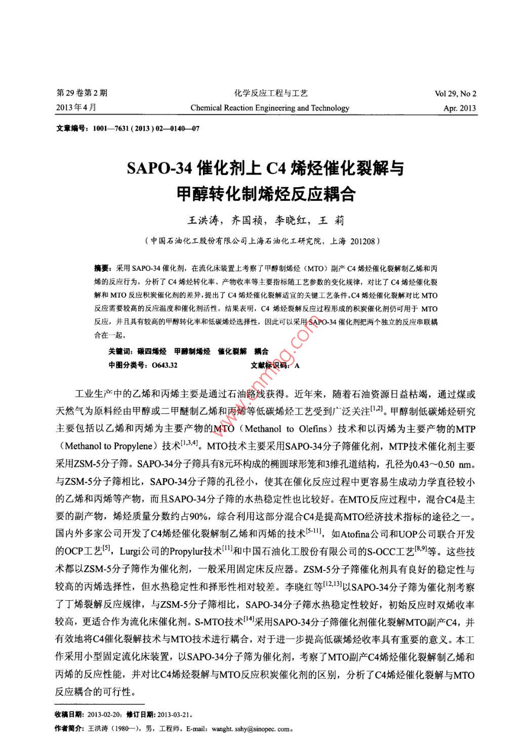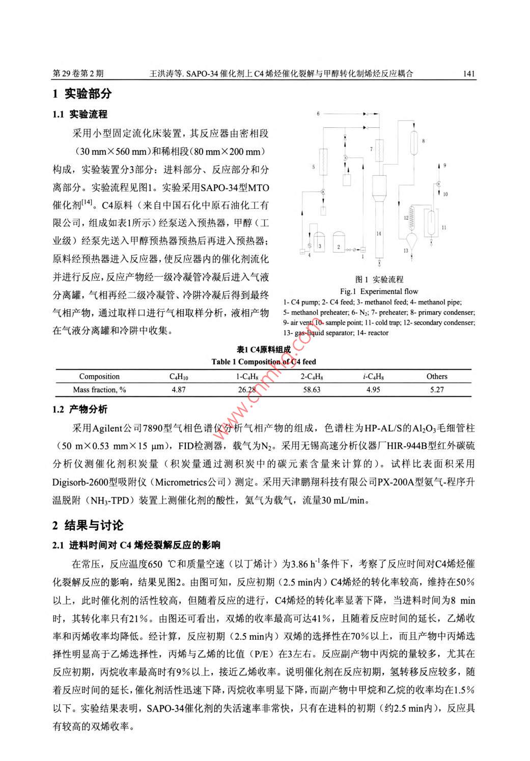 第29卷第2期化學反應(yīng)工程與工藝Vol 29, No 22013年4月Chemical Reaction Engineering and TechnologyApr. 2013文章編號: 1001- -7631 (2013)02- -0140- -07SAPO-34催化劑上C4烯烴催化裂解與甲醇轉(zhuǎn)化制烯烴反應(yīng)耦合王洪濤,齊國禎,李曉紅,王莉(中國石油化工股份有限公司上海石油化工研究院,上海201208)摘要;采用SAPO-34催化劑,在流化床裝置上考察了甲醇制烯烴(MTO)副產(chǎn)C4烯烴催化裂解制乙烯和丙烯的反應(yīng)行為,分析了C4烯烴轉(zhuǎn)化率、產(chǎn)物收率等主要指標隨I藝參數(shù)的變化規(guī)律,對比了C4烯烴催化裂解和MIO反應(yīng)積炭催化劑的差異,提出了C4烯烴催化裂解適宜的關(guān)鍵工藝條件.C4烯烴催化裂解對比MTO反應(yīng)需要較高的反應(yīng)溫度和催化劑活性。結(jié)果表明,C4烯烴裂解反應(yīng)過程形成的積炭催化劑仍可用于MTO反應(yīng),并且具有較高的甲醇轉(zhuǎn)化率和低碳烯烴選擇性,因此可以采用SAPO-34催化劑把兩個獨立的反應(yīng)串聯(lián)耦合在一起。關(guān)鍵詞:碳四烯烴甲醇制烯烴催化裂解耦合中圖分類號: 0643.32文獻標識碼: A工業(yè)生產(chǎn)中的乙烯和丙烯主要是通過石油路線獲得。近年來,隨著石油資源8益枯竭,通過煤或天然氣為原料經(jīng)由甲醇或二甲醚制乙烯和丙烯等低碳烯烴工藝受到廣泛關(guān)注1.21。甲醇制低碳烯烴研究主要包括以乙烯和丙烯為主要產(chǎn)物的MTO (Methanol to Olefins) 技術(shù)和以丙烯為主要產(chǎn)物的MTP(Methanol to Propylene)技術(shù)234。MTO技術(shù)主要采用SAPO-34分子篩催化劑,MTP技術(shù)催化劑主要采用ZSM-5分子篩。SAPO-34分 子篩具有8元環(huán)構(gòu)成的橢圓球形籠和3維孔道結(jié)構(gòu),孔徑為0.43 ~0.50 nm。與ZSM-5分子篩相比,SAPO-34分 子篩的孔徑小,使其在催化反應(yīng)過程中更容易生成動力學直徑較小的乙烯和丙烯等產(chǎn)物,而且SAPO-34分子篩的水熱穩(wěn)定性也比較好。在MTO反應(yīng)過程中,混合C4是主要的副產(chǎn)物,烯烴質(zhì)量分數(shù)約占90%,綜合利用這部分混合C4是提高MTO經(jīng)濟技術(shù)指標的途徑之一。國內(nèi)外多家公司開發(fā)了C4烯烴催化裂解制乙烯和丙烯的技術(shù)51,如Atofina 公司和UOP公司聯(lián)合開發(fā)的OCP工藝圖, Lurgi公 司的Propylur技術(shù)"和中國石油化工股份有限公司的S_OCCI藝18.9]等。這些技術(shù)都以ZSM-5分子篩作為催化劑,一般采用固定 床反應(yīng)器。ZSM-5分子篩催化劑具有良好的穩(wěn)定性與較高的丙烯選擇性,但水熱穩(wěn)定性和擇形性相對較差。李曉紅等[2,13]以SAPO-34分 子篩為催化劑考察了丁烯裂解反應(yīng)規(guī)律,與ZSM-5分 子篩相比,SAPO-34分 子篩水熱穩(wěn)定性較好,初始反應(yīng)時雙烯收率較高,更適合作為流化床催化劑。S-MTO技術(shù)4采用SAPO-34分子篩催化劑催化裂解MTO副產(chǎn)C4,并有效地將C4催化裂解技術(shù)與MTO技術(shù)進行耦合,對于進一-步 提高低碳烯烴收率具有重要的意義。本工作采用小型固定流化床裝置,以SAPO-34分 子篩為催化劑,考察了MTO副產(chǎn)C4烯烴催化裂解制乙烯和丙烯的反應(yīng)性能,并對比C4烯烴裂解與MTO反應(yīng)積炭催化劑的區(qū)別,分析了C4烯烴催化裂解與MTO反應(yīng)耦合的可行性。收稿日期: 2013-02-20; 修訂日期: 2013-03-21. .作者簡介:王洪濤(1980 -), 男,工程師。E-mail: wanght. shysinopec. com。.第29卷第2期王洪濤等. SAPO-34催化劑上C4烯烴催化裂解與甲醇轉(zhuǎn)化制烯烴反應(yīng)耦合1411實驗部分1.1實驗流程采用小型固定流化床裝置,其反應(yīng)器由密相段(30 mmX 560 mm)和稀相段(80 mmX 200 mm)構(gòu)成,實驗裝置分3部分:進料部分、反應(yīng)部分和分9離部分。實驗流程見圖1。實驗采用SAPO-34型MTO10催化劑4。C4原料(來自中國石化中原石油化工有限公司,組成如表1所示)經(jīng)泵送入預(yù)熱器,甲醇(工業(yè)級)經(jīng)泵先送入甲醇預(yù)熱器預(yù)熱后再進入預(yù)熱器;原料經(jīng)預(yù)熱器進入反應(yīng)器,使反應(yīng)器內(nèi)的催化劑流化并進行反應(yīng),反應(yīng)產(chǎn)物經(jīng)一級冷凝管冷凝后進入氣液圖1實驗流程分離罐,氣相再經(jīng)二級冷凝管、冷阱冷凝后得到最終Fig.1 Experimental flow1- C4 pump; 2- C4 feed; 3- methanol feed; 4- methanol pipe;氣相產(chǎn)物,通過取樣口進行氣相取樣分析,液相產(chǎn)物S- methanol preheater; 6- N2; 7- preheater; 8- primary condenser;9- air vent; 10- sample point; 11- cold trap; 12- secondary condenser;在氣液分離罐和冷阱中收集。13- gas-liquid separator; 14- reactor表1 C4原料組成Table 1 Composition of C4 feedCompositionC4HIo1-C4Hs2-C.Hgi-C.HgOthersMass fraction, %26.2858.634.955.271.2產(chǎn)物分析采用Agilent公司7890型氣相色譜儀分析氣相產(chǎn)物的組成,色譜柱為HP-AL/S的Al2O3毛細管柱(50 mX0.53 mmX15 um),F(xiàn)ID檢測器,載氣為N2。采用無錫高速分析儀器廠HIR-944B型紅外碳硫分析儀測催化劑積炭量(積炭量通過測積炭中的碳元素含量來計算的)。試樣比表面積采用Digisorb-2600型吸附儀( Micrometrics公司)測定。采用天津鵬翔科技有限公司PX-200A型氨氣-程序升溫脫附(NH3-TPD)裝置上測催化劑的酸性,氦氣為載氣,流量30 mL/min.2結(jié)果與討論2.1進料時間對C4烯烴裂解反應(yīng)的影響在常壓,反應(yīng)溫度650 C和質(zhì)量空速(以丁烯計)為3.86 h'條件下,考察了反應(yīng)時間對C4烯烴催化裂解反應(yīng)的影響,結(jié)果見圖2。由圖可知,反應(yīng)初期(