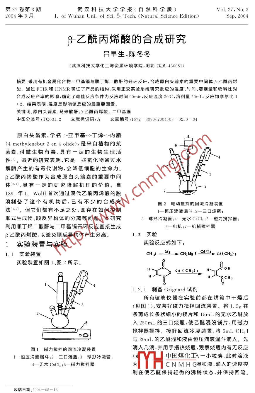 第27卷第3期武漢科技大學(xué)學(xué)報(自然科學(xué)版)Vol. 27. No. 32004年9月I. of Wuhan Uni. of Sci. & Tech. Natural Science Edition)Sep.2004β-乙酰丙烯酸的合成研究呂早生,陳冬冬(武漢科技大學(xué)化工與資源環(huán)境學(xué)院,湖北武漢,430081)摘要:采用有機金屬化合物二甲基鎘與順丁烯二酸酐的開環(huán)反應(yīng),合成原白頭翁素的重要中間體β乙酰丙烯酸。通過FTIR和HNMR確證了產(chǎn)品的結(jié)構(gòu),采用正交實驗系統(tǒng)研究反應(yīng)的溫度、時間、溶劑量和物料比對合成反應(yīng)產(chǎn)率的影響,確定了最佳反應(yīng)條件為反應(yīng)時間90min,反應(yīng)溫度30℃,溶劑量50mL,反應(yīng)物摩爾比1。結(jié)果表明,溫度是影響該反應(yīng)的最重要因素關(guān)鍵詞:原白頭甕素;馬來酸酐;β乙酰丙烯酸;二甲基鎘中圖分類號:TQ031.2文獻標(biāo)識碼:A文章編號:1672-3090(2004)03-0250-04原白頭翁素,學(xué)名4亞甲基-2-丁烯-4-內(nèi)脂(4- methylenebut--2-en-4- glide),是來自植物的抗菌素,對微生物有毒,具有一定的生物生理活性。最近的研究表明,它是一些氯化物通過水解酶產(chǎn)生的有毒代謝物,會降低細胞的生命力3乙酰丙烯酸作為合成原自頭翁素的重要中間體2:3,具有一定的研究降解機理的價值。自1891年L.Wolf首次通過溴代乙酰丙烯酸的脫溴制備了這個有機物后,已有不少的合成方圖2電動攪拌的回流冷凝裝置法4:。但它們都有不足之處,即存在如何控制—恒壓滴液漏斗;2—三口燒瓶;順式生成物、順反異構(gòu)體的分離等問題。本研究3—球形冷凝管;4一無水CaCl2;5—磁力攪拌器;利用順丁烯二酸酐與二甲基鎘開環(huán)反應(yīng)直接生成6—電機;7—機械攪拌器3乙酰丙烯酸,以避免順反異構(gòu)體產(chǎn)生分離。1.2實驗1實驗裝置與實驗實驗反應(yīng)式如下實驗裝置CH, I-Mg+CH, Mg I Cdcl,ca(CH,)實驗裝置如圖1、圖2所示。cd(CH,)2CCH2.1制備d試劑所有玻璃儀器在實驗前都在烘箱中干燥后(見圖1),安裝好磁力攪拌回流裝置。將1.5g鎂條剪成長條狀細小的鎂片和15mL的無水乙醚放入250mnL的三囗燒瓶,使乙醚浸沒鎂片,用磁力攪拌器攪拌。接好回流冷凝裝置,將5mL.CH3I與20mL的乙醚混和液由恒壓滴液漏斗滴入。先圖1磁力攪拌的回流冷凝裝置滴入幾滴,并用手捂熱燒瓶,觀察燒瓶內(nèi)有無反應(yīng)1—恒壓滴液漏斗;2—三口燒瓶;3—球形冷凝管中國煤化工入一小粒碘,此時溶液4—無水CaCl2;5—磁力攪拌器CNMHG混和液,滴入的速度控制在使乙醚保持輕微的沸騰狀態(tài),并保持回流。作者簡禿肯數(shù)據(jù)1961-),男,武漢科技大學(xué)化工與資源環(huán)境學(xué)院副教授,博士2004年第3期呂早生,等:β乙酰丙烯酸的合成研究251滴加時間為30~40min。混合液滴加完畢后,用30℃的水浴回流加熱約30min,使鎂屑反應(yīng)完全1.2.2制備二甲基鎘在水浴中磁力攪拌下加入6.2g無水CdCl2。0.5次加料不能過多。當(dāng)有氣泡冒出時,即停止加料,并用空心塞塞好瓶口。直至無氣泡時打開瓶塞繼續(xù)加料。但加料時間必須控制在5min以波長/mm內(nèi)。全部料加完后撤掉冰浴,改用30℃水浴加熱回流45min。制得的二甲基鎘溶液為灰白色并有圖3β乙酰丙烯酸標(biāo)準(zhǔn)溶液(在三氯少量絮狀沉淀甲烷中)的紫外吸收光譜1.2.3制備β乙酰丙烯酸制標(biāo)準(zhǔn)曲線,線性回歸方程為A=0.00325+將磁力攪拌裝置換成電動攪拌裝置(見圖0.0913C;線性相關(guān)系數(shù)r=0.9892)。稱取一定量的酸酐在硏體中碾成粉末,溶解將反應(yīng)產(chǎn)物用濃鹽酸酸化至pH=1~2后,用于一定量的無水乙醚中。將溶液移至恒壓滴液漏 mL CHCI3萃取3次(20ml,15ml,15mL),定容斗中。在冰浴下將酸酐的乙醚溶液滴入二甲基鎘至10ml,移取2mL至50mL容量瓶中并稀釋至溶液中。開始緩慢滴加,后來可以加快滴加速度??潭?配制成溶液,測定該浴液的吸光度值A(chǔ),依據(jù)滴加完畢后撒掉冰浴,在一定溫度下水浴回流回歸方程求出其相應(yīng)的濃度C。產(chǎn)率P=2.5C定的時間。最后得到黃色粘稠液m×100%,其中m為產(chǎn)品的理論產(chǎn)量反應(yīng)完畢后,將濃度為10%50mL的硫酸由2實驗結(jié)果及討論滴液漏斗滴入冰浴冷卻下的燒瓶中,先慢后快,同為了研究反應(yīng)條件對合成產(chǎn)率的影響,我們時充分攪拌。將酸解后的液體放入分液漏斗中萃進行了單因素實驗和正交實驗。所考慮的條件有取分離,酸層用50mL乙醚萃取三次(20m反應(yīng)時間、反應(yīng)溫度、溶劑量、物料比(CH3:順丁15mL,15mL),合并乙醚液,用40mL濃度為20%烯二酸酐)碳酸鉀溶液洗滌醚液,再在分液漏斗中分離岀水2.1單因素實驗結(jié)果層,過濾后得到橙黃色溶液如圖4所示,反應(yīng)時間在90min時產(chǎn)率達最2.4合成產(chǎn)物的分離與提純大。反應(yīng)時間為30~90min時,隨著時間的增選用717型強堿性陰離子交換樹脂,將所得加,產(chǎn)率隨之提高。當(dāng)反應(yīng)進行一段時間后,反應(yīng)的橙黃色溶液用鹽酸調(diào)至pH=3配制成待交換時間增加,反而可能使反應(yīng)物在長時間的溫水浴液上柱,使交換液流經(jīng)樹脂柱,控制流速為5mL/加熱下發(fā)生其它復(fù)雜的化學(xué)反應(yīng),導(dǎo)致產(chǎn)率降低。min。此后,隨時檢查流出液,待流出液呈明顯的酸性時,停止上柱,用去離子水沖洗樹脂柱,控制流速為10mL/min。當(dāng)流出液達到pH時,停止水洗,用0.1mol的HCl洗脫,洗脫速度為5mL/min。當(dāng)有碘仿反應(yīng)
