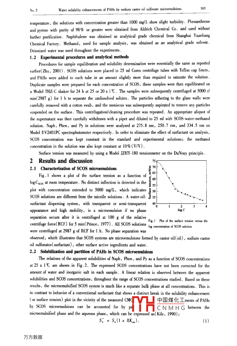 5001-022Journal of Enmaionmental SciencesVdl.IS,No.5.pp.583- -589 ,2003C011-5689XArticle ID: 101-0742(2003)05-0583-07CLC number: XI31Document code: AWater solubility enhancements of PAHs by sodium castor oilsulfonate microemulsionsZHU Li-zhong', ZHAO Bao-wei, LI Zong-lai(Dpartment o Enionental Science. Zhejiang Univenity, Hanghou 310028. Chin. E-mal: lzhu@ mil.h2. zj.cn)microemulsions were evaluated. The apparent slubities of PAHs are linearly proportional to the concentations of sCOS micremulsion, andthe enhancement etent by scOS slutions is greater than that by ordiny sufecants on the basis of weight slbilizainin ratio( WSR). TheogK. values of Naph, Phen, and Py are 3.13, 4.44 and 5.01 repecivedy, which are sbout the same 斯the logKw_ volues. AI 5000 Lof scos cncentation, the aparent slubities are 8.80, 121, and 674 times as the itinsic soubiti for Naph, Phen, and Py. Theefects of inorganic ioon and temperaure on the slbiliation of solutes are also ivestigted. The soubilizain is improved wih a moderaleaditionoCe2+.Na' . NH: and the mitureofNa* , K* ,Ca*, Mg* and NHL: . WSR values are cnhanced by 22.0% for Napb.23.4% for Phen, and 24.6% for Py with lempernture increasing by 5C . The results idicated that SCOS microemulsions improve thepefornmance of the sufoctant enhanced rediation(SER) of soil, by inereasing slubilitis of organie plulants and reducing the level afsurfactant pollution and remediation expenses.Keywords: sodium castor oil slfonate; microemulsion; slubilizationi PAHsIntroductionContamination of groundwater and soils by organic pollutants has become an issue of increasingworldwide concerm, which arouses environmental scientists to explore different approaches for the clean-upof the contaminated soils and groundwater. The chemical , biological ,and chemical-biological remediationshave received considerable atention due to high eficiency in contrast to pump-and-treat systems andsurfactants play key roles in these techniques( Zhu,1999). Surfactant enhanced remediation( SER) hasbeen employed to remove nonaqueous phase liquids( NAPLs) fom conlaminated soils and aquifers( Abdul,1992; Pinto, 2000; Lagade, 2000; Taylor, 2001). The key points for SER are (1) to increase theaqueous solubility of NAPLs through the formation of surfactant micelles, and (2) to mobilize theentrapped NAPIs through decrease in NAPL- water interfacial tension. To conform with these requirements,different surface active agents, such as anionic surfactants ( Divarakanath, 1999), nonionic surfactants(Dianne, 2000; Cowell, 2000; Zhou, 2000) ,cyclodextrins( Ko, 2000), humic acids( Van Stempoot,002) and biosurfactants( McCray, 2001), were used to improve the solubilzation, mobilization andbioavailability of organic pollutants. However, microemulsion may be a promising approach for theremediation of soils and groundwater, because microemulsion is capable of solubilizing much more oil thanthat of micellar solution and arising ultralow interfacial tension between the aqueous phase and oil phase(Cui, 1999).Since J. H. Schulman introduced the term“microemulsion" in 1959 , microemulsions have atainedincreasing significance both in basic research and industry ( Schwuger, 1995). Recently, much attentionhas been paid to its application in SER( Fiorenza, 2000). Richard Martel et al . (Martel, 1998a; 1998b)optimized different surfactant-alcohol-solvent ( oil- in- water ) microemulsions to recover NAPLs from sandcolumns. Ouyang et al .(Ouyang, 1995; 1996) developed a surfactant- enhanced microemulsion( gasoline-in- water) approach for the remediation of NAPLs from contam中國煤化工high recoverywas obtained from these studies , the main drawback of this:MYHC N M H GconcentationFoundalion ite: The Nationl Exellent Young Seientint Fund d Chin(No. 20125719); The National Natuni Science Foundeion odf China(No20077025); * Corespnding suthor584ZHU Lizhong et al .Vol. 15of ingrediens necessary for NAPL disolution, which made the process expensive. The solvents used(e.g.toluene, xyenes, ethybenzene, D-limonene, gasoline, etc. ) would be potential contaninants to soils andgroundwater. A temary microemulsion of water-rapeseed oil-polyglycoside ( APG) significantly extractedpyrene(Py) from a real soil sample and its ingredients (APG and rapeseed oil ) are bioderadable(Schwuger, 1995). However, 10% (wt. fraction) of APG would be a great cost for the clean-up ofcontaminated soils. Thus, these microemulsified systems are not suitable for remediation application.Meanwhile , the information about the efects of the temperature and inorganic salts co-existed with organicpollutants in soils on the performance of microemulsion are not available .The conmercial sodium castor oil sulfonate(SCOS) (Turkey red oil) is the product of natural castoroil sulfonated by concentrated sulfuric acid. SCOS is used as emulsifying and dispersing agents in variousapplications(Liu, 1995). It is a mixture of castor oil, sodium castor oil sulfonate , sodium castor oil acid,inorganic salts and water and so on. The structures of main ingredients are shown in Scheme 1. SC0S isaptitude for biodegradation due to the unsaturated bonds and hydroxyl groups in the structures of itsingredients. A stable microemulsion( oil-in-water) forms when SCOS is mixed with water. Thus, SCOSmicroemulsion would solubilize more organic pollutants than the surfactant micelle solutions arise ultralowinterfacial tension and expose litle contamination risk on the soils and groundwater; meanwhile, abundantresources of castor oil and a simple process for SCOS production would result in a relative low cost if SCOSmicroemulsion would be used in SER application. Most conventional surfactants are derived from petroleumhydrocarbans( non-reproducible resources). However, SCOS is the product of the reproducible castor oil,which has significance to resources availability .)HCH:(CH)xCHCH2CH=CH(CH)C-OCH2CH2(CH)CHCH2CH-CH(CH)C-OCHOSO)Na0CH2(CH2)CHCH2CH=CH(CH2)C-0CH2CH;(CH2)sCHCH2CH=CH(CH)C-OI(@)Casto