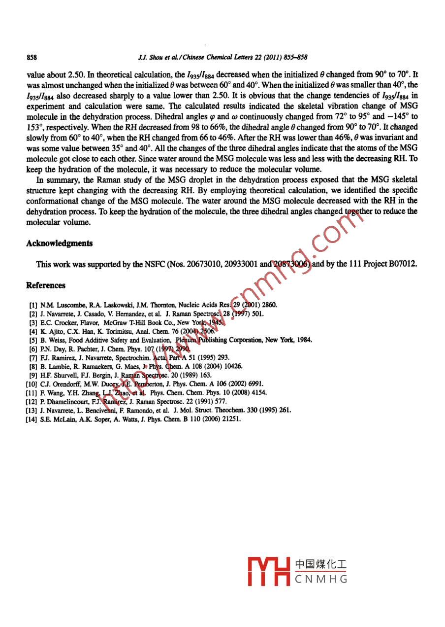 Available online at www.sciencedirect.comCHINES EScienceDirectC HEMICALL .ETTERSELSEVIERChinese Chemical Letters 22 (2011) 855 -858www.elsevier.com/locate/ccletMicro- Raman studies on the conformational behaviors ofmonosodium glutamate in dehydration processJing Jing Shou, Guang Zeng, Hao Zhang, Yun Hong Zhang *The Instinute of Chemical Physic, Key Laboratory of Cluster Science, Beijing Instiute of Technology, Beijing 100081, ChinaReceived 15 October 2010Available online 16 April 2011AbstractThe conformational behaviors of monosodium glutamate (MSG) in a dehydration process were studied by Micro-Ramanspectroscopy in combination with Hartree Fock calculations using 6-31+G* method. The dehydration process of the MSG dropletwas performed by decreasing the ambient relative bumidity (RH). The intensity ratio of the 935 cm 1 band to 884 cm^ 1 band (9gs188) kept decreasing when RH decreased. By optimizing the geometries with dfferent fixed dibedral angles, the downtrend of (1g3s/I884) is found to be due to the reduction of MSG molecular volume.◎2010 Yun Hong Zhang. Published by Elsevier B.V. on bebalf of Chinese Chemical Society. All rights reserved.Keywonds: Raman; MSG; Calculation; Dehydration; Intensity; Dihedral angleThe conformational behavior of amino acids and their vibrational characteristics are important. The intrinsicconformational properties and energies determine to a large extent the functional specificity of proteins andpolypeptides [1]. Biological systems are usually associated with aqueous solutions, where solute- -solvent interactionssignificantly influence the energy, structure and vibrations of the amino acids [2].Glutamate is an a-amino which can be easily found in protein-containing foods. Monosodium glutamate (MSG)known as a flavor enhancer is a zwitterionic structure of glutamate [3]. MSG is one of the most abundant excitatoryneurotransmitters in higher life forms. It has a particular interest to curent models of memory and learning [4]. It hasbeen proved that excessive MSG can cause damages to the brains of young rodents [5]. Most previous investigationson the MSG molecule are based on theoretical calculations which might be different from the real condition [6,7]. .Recently, infrared and Raman spectroscopy were imported on this subject [8,9]. But few investigations were carriedout to study the MSG at high concentration or colloidal state. In present work, the conformation change of MSG indehydration process was studied by Micro-Raman spectroscopy in combination with theoretical calculation.1. ExperimentalMSG was dissolved into triply dillel water by 1.0 mol/L. The pH of the solution was 6.8. A MSG droplet(~100 μm in diameter) was injected onto a quatz substrate by a syringe. Then the quatz substrate was fixed on the中國煤化工本Corresponding author,E-mail address: ybz@bit.edu.cn (YH. Zhang).MHCNMHG1001-8417/S -see front mater C 2010 Yun Hong Zhang. Publisbed by Elsevier B.V on behalf of Chinese Chemical Society. Al rights reserved.do:10.1016j.cet.2010.12.022856JJ. Shou er al./Chinese Chemical Ltters 22 (2011) 855 -858Fig. 1. Structure of MSG molecule with the atomic numbering used in this work.bottom of a chamber sealed with thin transparent polyethylene (PE) flm. The chamber was mounted on an automatedmotorized stage. The RH in the chamber was adjusted discretely by adjusting the flow ratio of water-saturated N2 anddry N2. The RH and temperature of the gas fed into the chamber were measured by a humidity temperature meter withthe accuracy of土2.5% and土0.7 K.Raman spectra were obtained by the Raman microscope (Renishaw Invia) with a514.5 nm argon ion laser. The datawere recorded under the following conditions: laser power, 20 mW; number of scan, 20; exposure time, 10 s andspectral resolution, 1 cm- . To make the droplet completely equilibrate with a given ambient RH, 40 min was spentbefore each Raman measurement. All the measurements were made at ambient temperature of 293 K.Both geometrical optimizations and vibrational frequency calculations were performed at HF/6-31+G* level byusing Gaussian 03 program. All calculations were carried out with default convergence criteria of Gaussian 03program. There are three main dibedral angles deciding the framework of MSG. They are ilustrated in Fig.1 as C1-C2-C3-C4, Cz C3-C4-Cs and N-C2 C3 C4, which are defined as 0, φ and w for simplicity. For comparison,vibrational frequency calculations were performed with fixed θ or φ from 0° to 180° with a step of 10° while the othervariables were fully optimized.2. Results and discussionThe saturated RH of the monosodium glutamate solution measured is about 90土2%. Crystallization was notobserved in the MSG droplets even at the lowest RH. Raman spectroscopy can provide exquisite molecular details of0.HC.HX10RH(%)98. 867656554636中國煤化工900 95028003200TYHCNMHGRaman shift (cm^)Fig. 2. Raman spectra of MSG droplet at various RH values.JJ. Shou et al./Chinese Chemical Letters 22 (2011) 855 -858857Table 1Experimental and calculated intensity ratios of 13/s884 and the optimized results of the 4 and w when the 0 was fixed.ExperimentTheoretical calculationRH13/88404w93.6990°863.5480°74.593.4873.2270°75.8°-166.9662.8260°77.0-176.7°3.0855079.0173.9°2.98462.7940°82.2°164.592.89362.5735°94.7°153.0°2.3322.5211the objects such as conformational changes, hydrogen bonding [10,11]. Fig. 2 shows the Raman spectra of MSGdroplet at various RHs. The peak at 2938 cm-1 is assigned to CH stretching mode. The OH stretching band of waterappears at 3432 cm-'. The band at 935 cm-' is assigned to the C C stretching mode [12]. The 884 cm-' band arisesboth from CH2 rocking and C C stretching mode [13].In the dehydration process, the band at 935 cm-1 slightly decreased while the 884 cm~ 1 band kept increasing withthe decreasing RH. Since both of these bands are associated with the C C stretching mode, we conclude that thechanges at 882 cm-1 and 935 cm - 1 bands are due to the skeletal