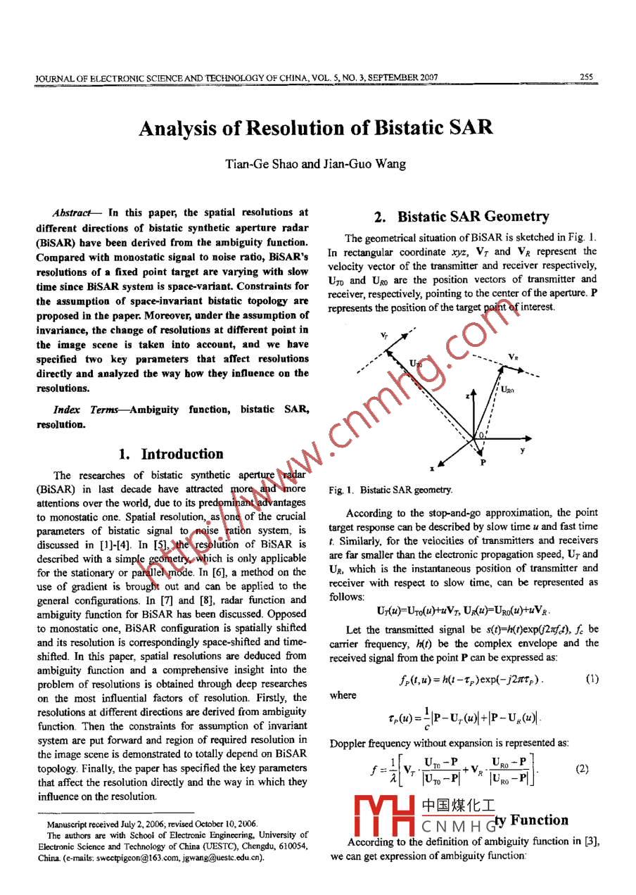 JOURNAL OF BLECTRONIC SCIENCBAND TECHINOLOGY OF CHINA VoL. 5, NO.3, SEPTEMBER 2007.255Analysis of Resolution of Bistatic SARTian-Ge Shao and Jian-Guo WangAbstract - - In this paper, the spatial resolutions at2. Bistatic SAR Geometrydifferent directions of bistatic synthetic aperture radarThe geometrical situation of BiSAR is sketched in Fig. 1.(BiSAR) bave been derived from the ambiguity function.Coapared wit monostaic sigal to noise rnto BiSAR's In retanglar cordinate %, VT and Vk represes theresolutions of a fixed point target are varying with slowvelocity vector of the transmitter and receiver respectively,time since BiSAR system is space-variant. Constraints forUr and URo are the position vectors of transmitter andthe assumption of space-invariant bistatic topology arereceiver, respectively, pointing to the center of the aperture. Pproposed in the paper. Moreover, under the assumption ofrepresents the position of the target point of interest.invariance, the chaoge of resolutions at different point inthe image scene is taken into account, and we havespecified two key parameters that affect resolutionsUnpVdirectly and analyzed the way how they infuence on theresolutions.Uan↑Index Terms- Ambiguity function, bistatic SAR,resolution.1. IntroductionThe rescarches of bistatic synthetic aperture radar(BiSAR) in last decade have attracted more and moreFig 1. Bistatic SAR geometry.attentions over the world, due to its predominant advantagesto monostatic one. Spatial resolution, as one of the crucialAccording to the stop-and-go approximation, the pointparameters of bitatic signal t如o noise ration sytem, is target response can be dsecried by slow time u and fast timediscussed in []-[4]. In [S], the resolution of BiSAR ist. Similarly, for the veiocities of transmitters and receiversdescribed with a simple geometry, which is only applicableare far smaller than the electronic propagation speed, Ur andfor the stationary or parallel mode. In [6], a method on theUr, which is the instantaneous position of transmitter anduse of gradient is brought out and can be applied to thereceiver with respect to slow time, can be represented asgeneral configurations. In [7] and [8], radar function andfollows:ambiguity function for BiSAR has been discussed. OpposedUr(u)=Uro(u)+uVx, Ux(u)=Uqo(u)+tuVx .to monostatic one, BiSAR configuration is spatially shiftedLet the transmitted signal be s(t)=H()exp(2x[2), fc beand its resolution is correspondingly space-shifted and time-carrier frequency, h([) be the complex envelope and theshifted. In this paper, spatial resolutions are deduced fromreceived signal from the point P can be expressed as:ambiguity function and a comprehensive insight into theproblem of resolutions is obtained through deep researchesf(t,u)= h(t-Fp)exp( -j2ttp).1)on the most influential factors of resolution. Firstly, thewhereresolutions at different directions are derived from ambiguityr,(1)==|p - U(2)+|P -U(a).function. Then the constraints for assumption of invariantsystem are put forward and region of required resolution inDoppler frequency without expansion is represented as:the image scene is demonstrated to tally depend on BiSARUro-PURo-P ]topology. Finally, the paper has specified the key parametersthat afect the resolution diretly and the way in which theyUro-P|VR Uo-」infuence on the resolution.中國煤化工Manuscript received July 2, 2006, revised October 10, 2006.The authorsare 、; School of Electronic Enginoering, University ofYHCNMHdyFunctionTheAccording to the definition of ambiguity function in [3],Electronic Science and Technology of China (UESTC), Chengdu, 610054,China. (-mails: swectpigeon@163 .com, jgwang@uestc .edu .cn).we can get expression of ambiguity function:JOURNAL OF ELECTRONIC SCIENCE AND TECHNOLOGY OF CHINA, VOL. s, NO.3, SEPTEMBER 2007g(a) is used to note the integral in (8), thenx(P,P)=-小]IGC.N dJJjCn dug(J)= Jexp[2nJju]du = sinc(rLf).(9Suppose (-Lew2|Vzl, Lex/2|VR|) to be the range of(3)integrating and Ler be the effective coherent integration time,determined by bistatic configuration, including the aperturelength and velocities of both transmitter and receiver.where P is an arbitrary point near the point P. fe(,u) andDifferent situations lead to different Ler which are cormplexfr(,u) are the received signals from P and P, respectively.and discussed as a separate problem in [9].Equation (3) shows that the ambiguity function is theAssume that transmitted signal is a narrow band signalcorrelation coefficient of the response of two point targets.and the frequency spectrum is narrow enough for P() toIn frequency domain, ambiguity function can be describedsuppose the first integral in (4) can be approximated as:asx(P,P)=2PC)xp[j2nf(r(u)-T(u){(國) is used to note the integral in (10), thenP()= jP(/)exp[j2nftJ]df.(11)xJexp[j2rf(Tp(2)- T(u)]du(4)Obviously, the first integral in (4) can be considered as thewhere PO) is the power spectrum of the transmitted signal.inverse Fourier transform of p(a) In other words, becauseThe first integral in (4) is caused by the complex envelope ofP(f) is the frequency spectrum of transmitted signals, p(a) istransmitted signal, while the latter integral is caused by thethe auto correlation of the complex envelope of thecarrier fequency. To simplify the ambiguity function, severaltransmitted signal H().From the above analysis, we can obtain the followassumptions can be made as follows on which all theequation as simplified bistatic ambiguity function:first-order Taylor expansion in the following text are based on|P|<|Uro|,|P|<|URo|, Lp<|Uxo| and L <|Uol.x(P,P)=. p()8UfJ)exp[j2nftJ].(12)LR and LT are the length of transmiting and receivingThe spatial resolution is mainly determined by the amplitudeantenna apertures, respectively.factor in (12).For convenience of expression, several definitions aremade.4. Bistatic SAR Resolution1) u is the time delay diference between two target pointsFrom (12), it is obviously that p(國) corresponds to t
