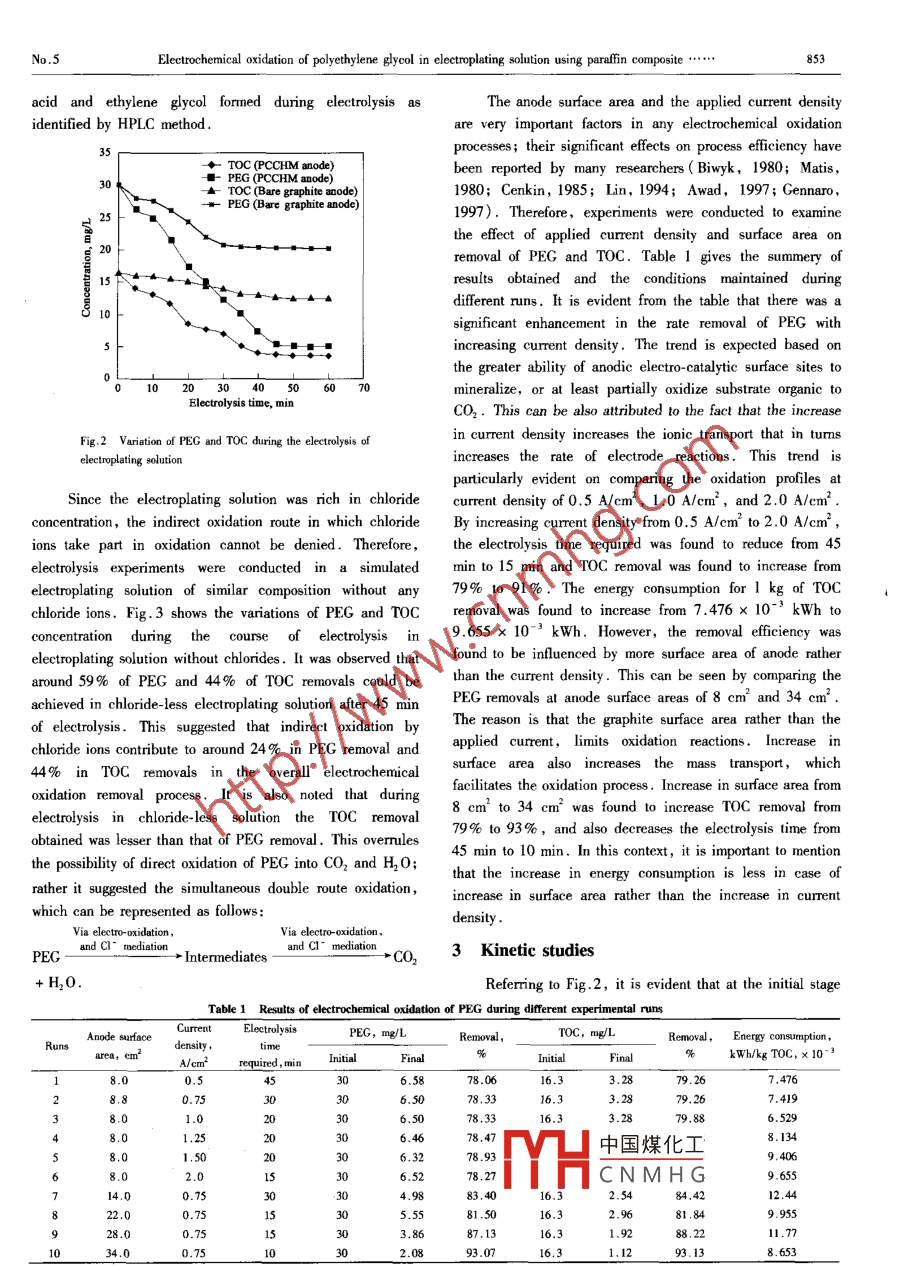 Jounal of Enirormental Sciences Vol. 16, No.5,pp. 851- 855 ,2004ISN 100742Article ID: 101-0742(2004)05-0851-05CLC number: X131Document code: AElectrochemical oxidation of polyethylene glycol in electroplating solution usingparafin composite copper hexacyanoferrate modified ( PCCHM) anodeRajesh S. Bejankiwar ”,Abir Basu, Max Cementi(Department of Civil and Environmental Engineering, University of Windsor, Windsor, Ontario N9B 3P4, Canada. E mail: bejanki @ uwindsor . ca)Abstract: Electrochemical oxidation of polyethylene glycol(PEG) in an acidic(pH 0.18 to 0.42) and high ionicstrength electroplating solution was investigated. The electroplating solution is a major source of wastewater in theprinting wiring board industry. A paraffin composite copper hexacyanoferrate modified( PCCHM) electrode was usedas the anode and a bare graphite electrode was used as the cathode . The changes in PEG and total organic carbon(TOC) concentrations during the course of the reaction were monitored. The efciency of the PCCHM anode wascompared with bare graphite anode and it was found that the former showed significant electrocatalytic property ftorPEG and TOC removal . Chlorides present in the solution were found to contribute significantly in the overall organicremoval process. Short chain organic compounds like acetic acid, oxalic acid, formic acid and ethylene glycolformed during electrolysis were identified by HPLC method. Anode surface area and applied current density werefound to infuence the electro- oxidation process, in which the former was found to be dominating. Investigations ofthe kinetics for the present electrochemical reaction suggested that the two stage first-order kinetic model provides amuch better representation of the overall mechanism of the process if compared to the generalized kinetic model .Keywords: polyethylene glycol( PEG ); paraffin composite copper hexacyanoferrate modified( PCCHM) electrode;electroplating solution; two stage first order kinetic model; generalized kinetic modelozone/UV radiation has been reported ( Chang, 2001 ),butIntroductionthis method appears to be uneconomical in both installationA highly acidic electroplating solution (pH 0.18 tond operation. Also, other advanced oxidation processes0.42) with high ionic strength is a major wastewater source in(AOP's) like Fenton's reagent, H202/03 and H2O2/UVthe printing wiring board ( PWB) industry. The chemicaloxidation, photocatalytic oxidation, gamma iradiation andcomposition of the recipe solution ( sulfuric acid of 60 g/L,ultrasound technique though scienifically feasible are noCuSO, .5H20 of 200 g/L and 0.03 g/L of chlorides) makes iteconomicaly suitable for wastewater treatment ( Gulyas ,difficult to treat with conventional treatment processes1997). The limiting factors for using conventional treatment(Suzuki,1976; Andreozi, 1996a). Also, the chemicalmethods, namely, high acidity and ionic strength can becoagulation method, presently adopted by the industries is notadvantageous for the electrochemical oxidation method. Ina viable method due to a large amount of hazardous chemicalsuch situations electrochemical oxidation technique appears tosludge ( containing very high concentration of Cu2* ions )be an ideal method for decomposition of PEG in electroplatingproduced during the treatment. Recycling or reuse of thesolution. A high salinity wastewater with 5% w/w chloridessolution is inhibited because of the low quality of organicswas treated electrochemically to remove organie pollutantspresent after electroplating and electrophoresis . Therefore,( Sheng,1998). Also, high strength wastewaters fromremoval of spent organics in order to add new additives is onedifferent industries were treated successfully at lab scale byof the very important steps for the neutralization processresearchers( Vlyssides,1997;Canozares,2002; .(Chang, 2001).Bejankiwar, 2003; Bunce, 2003 )Polyethylene glycols ( PEG: H-( 0CH2CH2).-0H) areIn this study, we have carried out the electrochemicalmajor organic compounds used as brightening and stabilizingoxidation of PEG in a simulated solution( similar to the recipeagent during eletroplating process(Fang,1996). It is anof electroplating solution of PWB industry ) using parafnimportant group of non-ionic synthetic water-soluble polymerscomposite copper hexacyanoferrate modified ( PCCHM )of ethylene oxide. Several studies have been performed on theelectrode. PCCHM anode has been used extensively in electrobiodegradability of PEC' s in water since biological oxidationchromic devices, power sources, ion-selective electrodes anis generally considered the most environmentally friendly andelectro catalysis . Composite electrodes comprising of graphitecheapest method of wastewater treatment ( Haines,1975;powder中國煤化工hexaerocyanoferatesWatson, 1976, Dwyer, 1983). However, as mentionedhave alsletermination of alkaliFYHCNMH Gearlier,biological treatment cannot work in such highly acidicmetalionsand for pHand high ionic strength solutions .measurements. Narayanan and Deepa ( Narayanan,2001 )Decomposition of PEC in electroplating solution byhave explained in detail the widespread use of PCCHM* Corresponding author852Rajesh s. Bejankiwar et al .Vol. 16electrode. So far, there is no report on the use of this anodefor electro-catalytic oxidation of organics presented in theDC powersupplywastewater. The main reason for selecting PCCHM anode for田日the present study is because of the fact that this electrode isrelatively insoluble on redox cycling as charge neutrality isalways maintained via the diffusion of electrolyte ions throughthe zeolytic structure( Scoltz, 1996) .InletThe main objective of the present study is to evaluatethe eficiency of paraffin composite copper hexacyanoferratemodified electrode for oxidation of PEG and to study thekinetics of the process . Measuring PEG concentration andtotal organic carbon(TOC) concentration during the course ofElectrodereaction enabled the monitoring of the