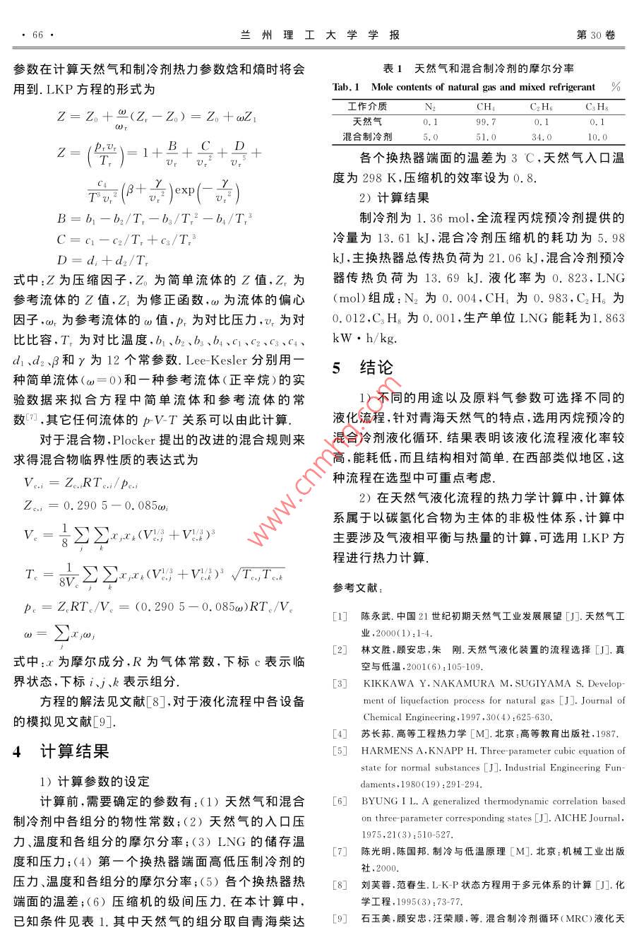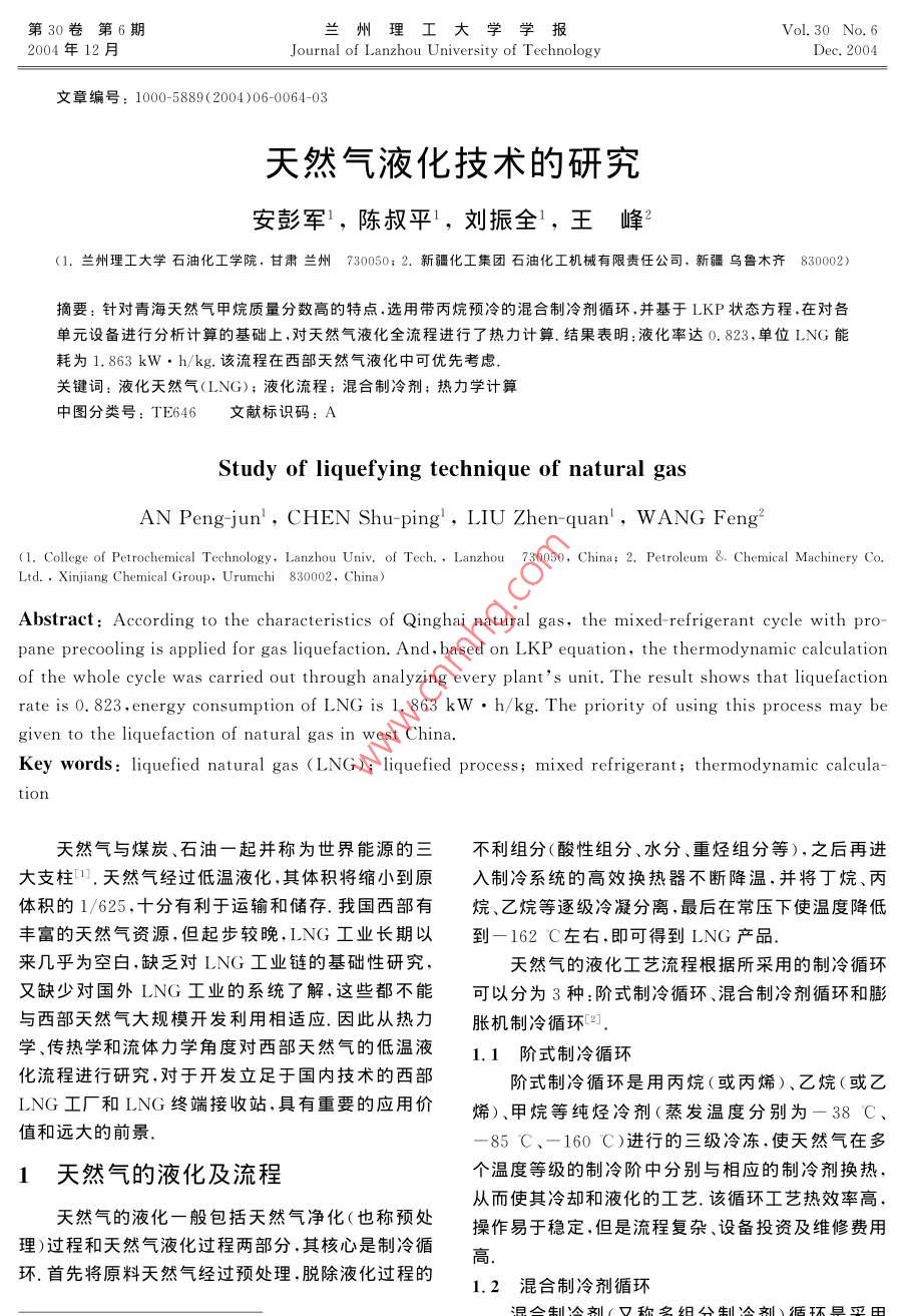 第30卷第6期蘭州理工大學(xué)學(xué)報(bào)VoL 30 No 62004年12月Journal of L anzhou University of TechnologyDec.2004文章編號(hào):1000-5889(2004)06-0064-03天然氣液化技術(shù)的研究安彭軍1,陳叔平1,劉振全1,王峰(1.蘭州理工大學(xué)石油化工學(xué)院,甘肅蘭州730050;2.新疆化工集團(tuán)石油化工機(jī)械有限責(zé)任公司,新疆烏魯木齊830002)摘要:針對(duì)青海天然氣甲烷質(zhì)量分?jǐn)?shù)高的特點(diǎn),選用帶丙烷預(yù)冷的混合制冷劑循環(huán),并基于LKP狀態(tài)方程,在對(duì)各單元設(shè)備進(jìn)行分析計(jì)算的基礎(chǔ)上,對(duì)天然氣液化全流程進(jìn)行了熱力計(jì)算.結(jié)果表明:液化率達(dá)0.823,單位LNG能耗為1.863kW·h/kg.該流程在西部天然氣液化中可優(yōu)先考慮關(guān)鍵詞:液化天然氣(LNG);液化流程;混合制冷劑;熱力學(xué)計(jì)算中圖分類號(hào):TE646文獻(xiàn)標(biāo)識(shí)碼:AStudy of liquefying technique of natural gasAN Peng-jun, CHEN Shu-ping, LIU Zhen-quan, WANG Feng2(1. College of Petrochemical Technology, Lanzhou Univ, of Tech, Lanzhou 730050, China: 2, Petroleum &. Chemical MachineryLtd, Xinjiang Chemical Group, Urumchi 830002, China)Abstract: According to the characteristics of Qinghai natural gas, the mixed-refrigerant cycle with propane precooling is applied for gas liquefaction. And, based on LKP equation, the thermodynamic calculationof the whole cycle was carried out through analyzing every plants unit. The result shows that liquefactionrate is 0. 823, energy consumption of LNG is 1.863kw. h/kg. The priority of using this process may begiven to the liquefaction of natural gas in west ChinaKey words: liquefied natural gas (LNG); liquefied process; mixed refrigerant; thermodynamic calcula-tion天然氣與煤炭、石油一起并稱為世界能源的三不利組分(酸性組分、水分、重?zé)N組分等),之后再進(jìn)大支柱.天然氣經(jīng)過(guò)低溫液化,其體積將縮小到原入制冷系統(tǒng)的高效換熱器不斷降溫,并將丁烷、丙體積的1625,十分有利于運(yùn)輸和儲(chǔ)存.我國(guó)西部有烷、乙烷等逐級(jí)冷凝分離,最后在常壓下使溫度降低豐富的天然氣資源,但起步較晚,ING工業(yè)長(zhǎng)期以到一162C左右即可得到ING產(chǎn)品來(lái)幾乎為空白,缺乏對(duì)LNG工業(yè)鏈的基礎(chǔ)性研究天然氣的液化工藝流程根據(jù)所采用的制冷循環(huán)又缺少對(duì)國(guó)外LNG工業(yè)的系統(tǒng)了解,這些都不能可以分為3種:階式制冷循環(huán)、混合制冷劑循環(huán)和膨與西部天然氣大規(guī)模開發(fā)利用相適應(yīng)因此從熱力脹機(jī)制冷循環(huán)學(xué)傳熱學(xué)和流體力學(xué)角度對(duì)西部天然氣的低溫液1.1階式制冷循環(huán)化流程進(jìn)行研究,對(duì)于開發(fā)立足于國(guó)內(nèi)技術(shù)的西部階式制冷循環(huán)是用丙烷(或丙烯)、乙烷(或乙LNG工廠和LNG終端接收站具有重要的應(yīng)用價(jià)烯)、甲烷等純烴冷劑(蒸發(fā)溫度分別為-38c、值和遠(yuǎn)大的前景85℃、-160℃)進(jìn)行的三級(jí)冷凍,使天然氣在多1天然氣的液化及流程個(gè)溫度等級(jí)的制冷階中分別與相應(yīng)的制冷劑換熱從而使其冷卻和液化的工藝.該循環(huán)工藝熱效率高天然氣的液化一般包括天然氣凈化(也稱預(yù)處操作易于穩(wěn)定,但是流程復(fù)雜、設(shè)備投資及維修費(fèi)用理)過(guò)程和天然氣液化過(guò)程兩部分,其核心是制冷循環(huán),首先將原料天然氣經(jīng)過(guò)預(yù)處理,脫除液化過(guò)程的高1.2混合制冷劑循環(huán)第6期安彭軍等:天然氣液化技術(shù)的研究65混合制冷劑的制冷原理與純組分制冷劑的制冷原理1.3膨脹機(jī)制冷循環(huán)大致相同,即都是通過(guò)冷劑液體的汽化,并與被冷介以膨脹機(jī)制冷循環(huán)為基礎(chǔ)的天然氣液化工藝流質(zhì)進(jìn)行熱交換使其降溫.與純組分制冷劑不同的是.程是通過(guò)采用透平膨脹機(jī)進(jìn)行等熵膨脹而達(dá)到降溫混合制冷劑產(chǎn)生的冷量是在一個(gè)連續(xù)的溫度范圍之目的的過(guò)程.根據(jù)進(jìn)入膨脹機(jī)的介質(zhì)的不同,膨脹機(jī)內(nèi),純組分冷劑產(chǎn)生的冷量是在一個(gè)固定的溫度上.制冷循環(huán)分為2種混合制冷劑制冷循環(huán)工藝流程的特點(diǎn)是在制冷循環(huán)1)天然氣膨脹機(jī)工藝是采用天然氣膨脹制冷中采用混合制冷劑,其加熱曲線可與被冷卻介質(zhì)的的循環(huán),又稱開式膨脹機(jī)循環(huán)冷卻曲線很好地匹配,有效地增加了兩者的一致性2)循環(huán)膨脹機(jī)工藝是采用氮(或氮甲烷混合可見,混合制冷劑制冷循環(huán)即保留了階式制冷循環(huán)物)膨脹制冷(閉式)的工藝流程.的優(yōu)點(diǎn),而且只用了一臺(tái)壓縮機(jī),使流程大大簡(jiǎn)化,降低了造價(jià)2工藝流程混合制冷劑工藝可以分為全混合制冷劑工藝選用丙烷預(yù)冷的混合冷劑液化循環(huán)(見圖1).(FMR)和預(yù)冷十混合制冷劑工藝,目前有多家公司原料天然氣經(jīng)由燃?xì)庖鎺?dòng)的壓縮機(jī)兩級(jí)壓縮,開發(fā)岀了各具特色丙烷預(yù)冷的混合制冷劑循環(huán)工藝經(jīng)冷卻后,通過(guò)MEA單元除去酸性組分(CO2、硫(AP(Ⅰ公司的C3/ MCRTM工藝、 TECHNIP公司組分等),然后進(jìn)入分子篩干燥系統(tǒng)進(jìn)行深度脫水的 Tealarc工藝、 JF Prichard8Co.的 PRICO工藝、(水的體積質(zhì)量分?jǐn)?shù)控制在1×10-以下)Linde公司的 LINDE工