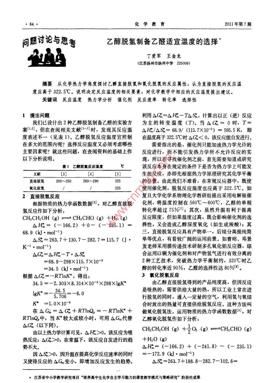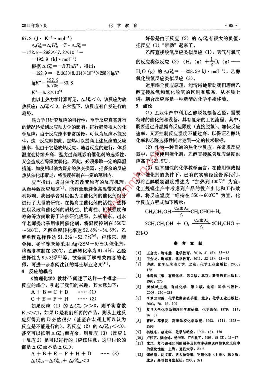 64化學(xué)教育2011年第7期問題討論與思書乙醇脫氫制備乙醛適宜溫度的選擇丁愛軍王金龍(江蘇揚州市揚州中學(xué)225009)摘要從化學(xué)熱力學(xué)角度探討乙醇直接脫氫和氧化脫氫的反應(yīng)屬性,認為直接脫氫的反應(yīng)溫度應(yīng)高于322.5℃。說明決定反應(yīng)溫度的相關(guān)要素,對化學(xué)教學(xué)中相應(yīng)的反應(yīng)溫度提出建議。關(guān)鍵詞反應(yīng)溫度熱力學(xué)分析催化劑反應(yīng)速率轉(zhuǎn)化率選擇性1提出問題利用ΔG=ΔH-T△ΔS,計算出以正(逆)反應(yīng)我們已設(shè)計出2種乙醇脫氫制備乙醛的實驗方為主的轉(zhuǎn)變溫度(T)。當(dāng)ΔG=0時,案1:2,但在查閱相關(guān)文獻時,發(fā)現(xiàn)其反應(yīng)溫ΔH/AS=68.9/(117×103)=5955K,即度表述不一(見表1)。乙醇脫氫反應(yīng)溫度宜控制在溫度高于3225℃時△G<0,該反應(yīng)能自發(fā)進行。在多大的范圍內(nèi)呢?選擇反應(yīng)溫度又必須考慮哪些需要指出的是,催化劑只能加速熱力學(xué)允許的主要因素呢?就這些問題,在查閱資料的基礎(chǔ)上作反應(yīng)進行,而不能引發(fā)熱力學(xué)所不允許反應(yīng)的實以下分析說明?,F(xiàn),所以在尋找催化劑之前,首先需要知道或研究表1乙醇脫氫反應(yīng)溫度該反應(yīng)本身在規(guī)定的條件下是否為熱力學(xué)上可能發(fā)文獻[3][生的反應(yīng),亦即先根據(jù)熱力學(xué)原理研究其化學(xué)平衡直接脫氫200~250269~290的位置。由此我們不難看,在常規(guī)反應(yīng)器中,既使氧化脫氫使用催化劑,脫氫反應(yīng)溫度也應(yīng)高于322.5℃。如2直接脫氫反應(yīng)復(fù)旦大學(xué)化學(xué)系物理化學(xué)教研組提出采用電解銀催根據(jù)物質(zhì)的熱力學(xué)函數(shù)數(shù)據(jù),對乙醇直接脫化劑,將溫度控制在560℃~600℃,乙醇的單程氫反應(yīng)作如下分析:轉(zhuǎn)化率超過75%7;其次,雖然升溫有利于提高CHCH2OH(g)CH3CHO(g)+H2(g)反應(yīng)限度,但如果溫度過高,既會影響催化劑的選△H=(-1662)+0-(-235.1)=擇性,又會造成乙醇深度氧化(如生成羧酸);其68.9(kJ·mol-1)三,直接脫氫反應(yīng)具有產(chǎn)物單一,后續(xù)分離提純簡△S=263.7+130.7-282.7=115.7(J·單等優(yōu)點,有著較廣闊的運用前景。如曹昭、鄧景K-1·mol-1)發(fā)老師采用膜傳遞技術(shù)研制多孔氧化鋁反應(yīng)器,綜△Gm=△,H-T·ΔSm合運用以銅為催化劑和對產(chǎn)物氫氣進行有效分離的=68.9-298×115.7×10-32種工藝技術(shù),突破熱力學(xué)平衡制約,320℃時乙=34.5(kJ·mol-1醇的轉(zhuǎn)化率近90%,乙醛的選擇性達80%根據(jù)△G=- RINk°,得出:3氧化脫氫反應(yīng)34.5=-2.303×8314×10-3×298×lgK由乙醇直接脫氫得到的產(chǎn)品純度高,但因反應(yīng)是吸熱的,需要供給大量的熱,所以工業(yè)上常在進5.706-6.0行脫氫的同時,通入一定量的空氣,利用氫與氧結(jié)K=1.0×10-6合時放出的熱量可直接供給脫氫反應(yīng)。這種方法叫在ΔGn=ΔGm+ RTInQ=- RInk+做氧化脫氫法。運用物質(zhì)的熱力學(xué)函數(shù)數(shù)據(jù),對RTnQ中,當(dāng)K較大或較小時,可用ΔGm代替乙醇氧化脫氫作如下分析:△Gm(以下同)。由以上熱力學(xué)計算可見,ΔHm>0,該反應(yīng)為吸 CH, CH2OH(g)+O2(g)= CH3 CHO(g)熱反應(yīng);△G>0,在常溫下,該反應(yīng)自發(fā)進行的趨+H2O(g)勢不大?!鱄m=(-166.2)+(-241.8)-(—235.1)因△S>0,因升溫在提高化學(xué)反應(yīng)速率的同時=-172.9(kJ·mol-1)又使得反應(yīng)的ΔG變小,即增加反應(yīng)發(fā)生的趨勢。△Sm=263.7+188.8-282.7-102.6=·江蘇省中小學(xué)教學(xué)研究項目“培養(yǎng)高中生化學(xué)自主學(xué)習(xí)能力的課堂教學(xué)模式與策略研究”階段性成果2011年第7期化學(xué)教育67.2(J·K-1mol1)好像是由于反應(yīng)(2)的△C有很大的負值=△Hm-T·△Sm=把反應(yīng)(1)“帶動”起來了。-172.9-298×67.2×10-3乙醇直接脫氫反應(yīng)類似反應(yīng)(1),氫氣與氧氣根據(jù)△G=-RTnK°,得出:的反應(yīng)類似反應(yīng)(2)(H2(g)+3O2(g)-192.9=-2.303×8.314×10-3×298×1H2O(g)的△Cm=-228.59k·mo-1),乙醇氧化脫氫反應(yīng)類似反應(yīng)(3)。5.706運用耦合反應(yīng)原理,能清晰地幫助我們理解乙K°=6.3×103醇直接脫氫和氧化脫氫的區(qū)別和聯(lián)系。從本質(zhì)上由以上熱力學(xué)計算可見,△P<0,該反應(yīng)為放講,耦合反應(yīng)亦是一種新型的化學(xué)平衡移動。熱反應(yīng);ΔC<0,在常溫下,該反應(yīng)有自發(fā)進行的5結(jié)論趨勢(1)工業(yè)生產(chǎn)中利用乙醇脫氫制備乙醛,需要熱力學(xué)只研究反應(yīng)的可行性,至于反應(yīng)真實進行特殊的催化劑和設(shè)備,具有復(fù)雜的工藝流程。其中的情況還受到反應(yīng)動力學(xué)的影響,進行趨勢很大的化既要通過升溫提高反應(yīng)限度(直接脫氫)、加快反應(yīng)學(xué)反應(yīng),由于反應(yīng)速率非常緩慢,可認為反應(yīng)不能發(fā)速率,又要控制反應(yīng)溫度不能過高,以保證乙醇轉(zhuǎn)生,這一反應(yīng)即如此。加熱可以提高上述反應(yīng)的反應(yīng)化率和乙醛選擇性同時達到一定的技術(shù)指標。速率,但由于它是放熱反應(yīng),隨著反應(yīng)的進行,體系(2)作為一種普通的熱化學(xué)反應(yīng),在常規(guī)反應(yīng)溫度會持續(xù)升高,溫度過高既影響催化劑的選擇性,器中,即使使用催化劑,乙醇直接脫氫反應(yīng)溫度也又會造成乙醇深度氧化。因此,必須采取一定