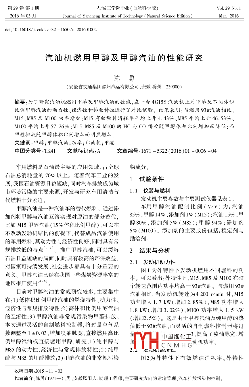 第29卷第1期鹽城工學(xué)院學(xué)報(bào)(自然科學(xué)版)Vol 29 No. 12016年03月Journal of Yancheng Institute of Technology( Natural Science EditionMar.2016doi:10.16018/j.cnki.cn32-1650/n.201601002汽油機(jī)燃用甲醇及甲醇汽油的性能研究陳勇(安徽省交通集團(tuán)滁州汽運(yùn)有限公司,安徽滁州239000摘要:為了研究汽油機(jī)燃用甲醇及甲醇汽油的性能,在一臺(tái)4G5S汽油機(jī)上對(duì)甲醇及不冋體積比例甲醇汽油的動(dòng)力性、經(jīng)濟(jì)性和排放特性進(jìn)行了對(duì)比試驗(yàn)。結(jié)果表明:與燃用93#汽油相比,M15、M85及MI00功率增加;M15有效燃料消耗率平均上升4.43%、M85平均上升46.53%、MIO0平均上升57.26%;M15、M85及M100的HC與CO排放隨甲醇體積比例增加而降低;而甲醛排放隨甲醇體積比例增加而明顯增加,關(guān)鍵詞:甲醇;甲酹汽油;功率;比油耗;甲醛中圖分類(lèi)號(hào):TK41文獻(xiàn)標(biāo)識(shí)碼:A文章編號(hào):1671-5322(2016)01-0006-04車(chē)用燃料是石油最主要的應(yīng)用領(lǐng)域,占全球物成分。石油總消耗量的70%以上。隨著汽車(chē)工業(yè)的發(fā)展,我國(guó)石油資源日益短缺,同時(shí)汽車(chē)排放成為城試驗(yàn)條件市環(huán)境污染的主要來(lái)源,開(kāi)發(fā)與研究車(chē)用清潔替1.1儀器與燃料代燃料十分緊迫。發(fā)動(dòng)機(jī)主要參數(shù)與主要測(cè)試儀器見(jiàn)表1。甲醇汽油是一種汽油車(chē)的替代燃料。通過(guò)添車(chē)用甲醇汽油配制比例(V/V)為:汽油加劑將甲醇與汽油互溶實(shí)現(xiàn)對(duì)原油的部分替代,85%,甲醇14%,添加劑1%(M5);汽油15%,甲比如M5甲醇汽油(15%體積比例甲醇),可以在摩80%,添加劑5%(M5);甲醇94%;添加劑不改動(dòng)發(fā)動(dòng)機(jī)結(jié)構(gòu)的前提下,代替成品汽油使用6%(M00。添加劑的主要成份包括:穩(wěn)定劑與的車(chē)用燃料,其動(dòng)力性與經(jīng)濟(jì)性良好,同時(shí)具有常助溶劑。規(guī)排放低的特點(diǎn)3。推廣甲醇汽油,可以緩解2結(jié)果與分析石油日益短缺的局面,同時(shí)具有較高的環(huán)保效益2.1發(fā)動(dòng)機(jī)動(dòng)力性對(duì)國(guó)家可持續(xù)發(fā)展、社會(huì)進(jìn)步都具有十分重要的圖1為外特性下發(fā)動(dòng)機(jī)燃用不同燃料的功意義。甲醇汽油已經(jīng)在我國(guó)一些煤炭資源豐富的率??梢钥闯?外特性下,M15、M5及M0在整地區(qū)推廣使用個(gè)轉(zhuǎn)速范圍內(nèi)功率均高于93#汽油。與燃用93#目前對(duì)甲醇汽油的常規(guī)研究較多,主要集中汽油相比,當(dāng)發(fā)動(dòng)機(jī)轉(zhuǎn)速為4200r/mn時(shí),M15在:1)低體積比例甲醇汽油的燃燒特性、動(dòng)力性功率增大1.7kW(增加2.85%),M85功率增大經(jīng)濟(jì)性與常規(guī)排放特性;2)高體積比例甲醇汽油1.8kW(增加3.02%),M100功率增大1.5kW的互溶性;3)甲醇汽油非常規(guī)污染物甲醛排放。(增加2.5%)。這是由于甲醇汽油及純甲醇的熱本文通過(guò)靈活的自制燃料控制器,將過(guò)量空氣系值低于93#汽油,而靈活的自制燃料控制器將過(guò)數(shù)調(diào)整至1±0.03,增加噴油脈寬,直接燃用高比例甲醇汽油或直接燃用甲醇,研究:1)純甲醇與加中國(guó)煤化了3,提高了噴油脈寬,增CNMHG動(dòng)機(jī)功率。M85的動(dòng)力性、經(jīng)濟(jì)性與常規(guī)排放特性;2)純甲2.2及機(jī)空醇與M85的甲醛排放;3)甲醇汽油的非常規(guī)污染圖2為外特性下有效燃油消耗率。外特性收稿日期:2015-11-0作者簡(jiǎn)介:陳勇(1971-—),男,安徽風(fēng)陽(yáng)人,助理工程師,主要硏究方向?yàn)檫\(yùn)輸管理、汽車(chē)排放污染物控制第1期陳勇:汽油機(jī)燃用甲醇及甲醇汽油的性能研究表1發(fā)動(dòng)機(jī)主要參數(shù)及主要測(cè)試儀器Table 1 Main parameters of test engine and instruments名稱型號(hào)參數(shù)數(shù)值排量/最大功率/kW/轉(zhuǎn)速/(rmn-)78/6000最高轉(zhuǎn)速/(r·min)7000最大扭矩/(N·m)轉(zhuǎn)速/(r·min)134/4500測(cè)功機(jī)(CW100)4G15S靈活燃料控制器(自制)徑x行程/(76×82升功率(k比功率/(kW·kg)0684壓縮比發(fā)動(dòng)機(jī)凈質(zhì)量/k114車(chē)甲醛測(cè)定儀CDM-01(自制)儀器廢氣分析儀AVLa000l下,Ml5、M85及M00在整個(gè)轉(zhuǎn)速范圍內(nèi)有效燃料消耗率均高于93#汽油(M5、M85、M00分別M15比93#汽油高4.43%、47.42%、57.52%),這是由于節(jié)氣門(mén)開(kāi)度100%時(shí)燃用甲醇汽油或純甲醇時(shí)M100噴油脈寬升高所導(dǎo)致在負(fù)荷特性下,與燃用93#汽油相比,發(fā)動(dòng)機(jī)在2400r/mn、2600r/min、3000m/min、3400m/min時(shí),M15有效燃料消耗率分別上升445%0平均上升10001700240031008004500分別上升45.34%45.87%、4646%、48.44%轉(zhuǎn)速/(rmin-)平均上升46.53;M100分別上升58.73%、圖1外特性下發(fā)動(dòng)機(jī)功率56.24%55.45%、58.62%,平均上升57.26%。Fig 1 Engine power at full load負(fù)荷特性下甲醇汽油及純甲醇有效燃料消耗率高于93#汽油是由于甲醇熱值低,達(dá)到相同工況需要消耗更多的燃料2.3發(fā)動(dòng)機(jī)排放特性2.31HC與CO怠速排放表為怠速工況下發(fā)動(dòng)機(jī)燃用不同燃料HC和CO的排放比較??梢钥闯?與燃用93#汽油相M1585比,M15在低怠速(900r/min)工況下CO排放由0.57%下降到0.46%,HC排放量由94×10°下降到88×10°;高怠速000r/mini工況下,CO排放量由060%下降到0.59%,HC排放量由7910001500200025003003500400045004y10M85在低怠速(900r轉(zhuǎn)速/(rmin-1)中國(guó)煤化工.57%下降到0.4