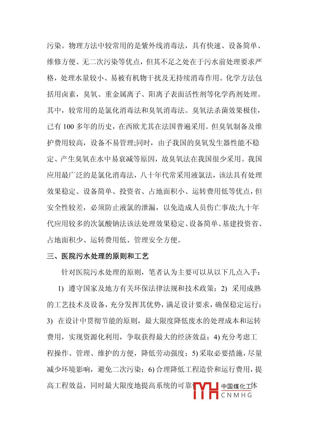 論醫(yī)院污水處理工藝選擇郗洪軍大連宇都環(huán)境工程技術(shù)有限公司遼寧省大連市116600摘要:目前在醫(yī)院污水處理中普遍存在運(yùn)行管理復(fù)雜、系統(tǒng)運(yùn)行不穩(wěn)定、處理達(dá)標(biāo)難等不足,醫(yī)院污水的處理工藝僻進(jìn)一步規(guī)范,系統(tǒng)監(jiān)控、管理水平急待提高。關(guān)鍵字:醫(yī)院;污水;處理工藝;選擇中圖分類號(hào): [R123. 3]文獻(xiàn)標(biāo)識(shí)碼: A正文:我國醫(yī)院污水處理,主要是--.具醫(yī)院的性質(zhì)以及醫(yī)院大小規(guī)模,而且還有污水排放的流向地點(diǎn),并且還需要根據(jù)當(dāng)?shù)貙?shí)際情況的處理要求,進(jìn)行選擇科學(xué)合理的處理工藝,對(duì)此筆者做出下文闡述。一、我國醫(yī)院污水處理工藝概況近年來,隨著醫(yī)院污水排放標(biāo)準(zhǔn)的提高,全國部分城市致力于優(yōu)選較好的污水處理工藝或?qū)υ械奶幚砉に囘M(jìn)行改進(jìn),以使污水排放達(dá)到新的排放標(biāo)準(zhǔn)的要求。但也有相當(dāng)部分省市對(duì)醫(yī)院污水排放要求較低,以及受經(jīng)濟(jì)等多方面因素的制約,醫(yī)院污水的處理工藝較為落后。但選用投資省、處理效果好、運(yùn)行管理自動(dòng)化、占地面積小的污水處理工藝是總的發(fā)展趨勢。(- - )據(jù)醫(yī)院污水水質(zhì)選擇處理方式醫(yī)院污水按水質(zhì)成分的不同,大體上分為生活污水、特種廢水和放射性廢水三大類,其中生活污水占的比重較中國煤化工可所YHCNM HG沖洗水、洗滌污水、洗浴污水等,其水質(zhì)與普通生活污水相似,是主要的處理對(duì)象。因此,醫(yī)院污水處理可借鑒生活污水處理方式。特種廢水包括化驗(yàn)室、手術(shù)室、解剖室、藥劑室排出的污水,含有重金屬、消毒劑、有機(jī)物質(zhì)、酸、堿等。特種廢水中,對(duì)含某些化學(xué)毒物的廢水廢液要盡可能單獨(dú)收集,分別處理,然后再排人綜合污水系統(tǒng)。放射性廢水是放射性診斷、治療及試驗(yàn)研究過程中排放的含有放射性同位素的廢水。放射性廢水必須單獨(dú)收集處理,達(dá)到排放標(biāo)準(zhǔn)后再排入綜合污水系統(tǒng)。(二)據(jù)污水排放去向及處理要求選擇處理工藝醫(yī)院污水處理工藝的選擇,不僅與污水排放去向有關(guān)還與地區(qū)的要求、經(jīng)濟(jì)等多方面因素有關(guān)。第一,醫(yī)院污水處理I藝的選擇與污水排放去向密切相關(guān)。一般地說,若處理后出水排人市政下水道,通常進(jìn)行一級(jí)處理;若處理后出水直接排入河道,則需進(jìn)行二級(jí)以上處理。第二,醫(yī)院污水處理工藝的選擇與各地區(qū)規(guī)定的污水排放標(biāo)準(zhǔn)密切相關(guān)。第三,醫(yī)院污水處理工藝的選擇與地區(qū)經(jīng)濟(jì)發(fā)展緊密相連,即經(jīng)濟(jì)越發(fā)達(dá),經(jīng)費(fèi)投人較多,污水處理工藝選用、運(yùn)行得越好。第四,醫(yī)院污水處理工藝的選擇還與當(dāng)?shù)氐乃辞闆r、人的主觀認(rèn)識(shí)有關(guān)。但對(duì)醫(yī)院污水進(jìn)行回用處理,目前還有爭議。另外,醫(yī)院污水處理一個(gè)非常重要的方面,就是必須進(jìn)行消毒處理,以殺滅各種病原微生物。二、傳統(tǒng)的醫(yī)院污水處理工藝(一)一級(jí)處理中國煤化工YHCNMH G醫(yī)院污水一級(jí)處理的典型工藝是一-級(jí)沉淀加俏毒。此流程適用于污水排人市政下水道的醫(yī)院,特別是一些綜合醫(yī)院。就我國目前的情況而言,大多數(shù)城市醫(yī)院污水處理后是排人城市下水道,故通常只進(jìn)行一級(jí)處理。但隨著醫(yī)院污水排放標(biāo)準(zhǔn)的提高,有些大城市醫(yī)院也積極采用二級(jí)處理以確保處理后出水的水質(zhì)。(二)二級(jí)處理二級(jí)處理通常為生物處理,常采用的處理方法有:生物轉(zhuǎn)盤法、生物接觸氧化法、射流曝氣法、氧化溝法、塔式生物濾池法等。這些技術(shù)均屬生物氧化法,通常是利用鼓風(fēng)曝氣、機(jī)械曝氣等,使污水中真菌等微生物大量繁殖,以吸附和氧化污水中的有機(jī)物等有害物質(zhì)。二級(jí)處理工藝適用于醫(yī)院污水排人地面水域的情況,可對(duì)污水的生物性污染、理化性污染及有毒有害物質(zhì)進(jìn)行全面處理。生物氧化法處理污水雖然出水水質(zhì)較好,但會(huì)產(chǎn)生大量的活性污泥,需進(jìn)行污泥處理,這加大了處理流程、增加了處理費(fèi)用;同時(shí),曝氣會(huì)對(duì)空氣造成二次污染:另外,生物處理污水停留時(shí)間較長,工藝設(shè)施占地面積較大也是其弱點(diǎn)。因此,多數(shù)醫(yī)院逐步對(duì)原有的工藝進(jìn)行改造或新建較先進(jìn)的污水處理工程,以提高出水水質(zhì),使之達(dá)標(biāo)排放。(三)消毒處理醫(yī)院污水消毒處理方法很多,大致可分為物理方法和化學(xué)方法兩大類。物理方法有輻射法、紫外線法、加熱法、冷凍法等。用物理方法對(duì)醫(yī)院污水進(jìn)行消毒處理,通常適用于污水量較小的情況,且其處理效果往往不如采用化學(xué)法明顯,但該法有個(gè)5中國煤化工次.THCNM HG污染。物理方法中較常用的是紫外線消毒法,具有快速、設(shè)備簡單、維修方便、無二次污染等優(yōu)點(diǎn),但其不足之處在于污水前處理要求嚴(yán)格,處理水量較小、易被