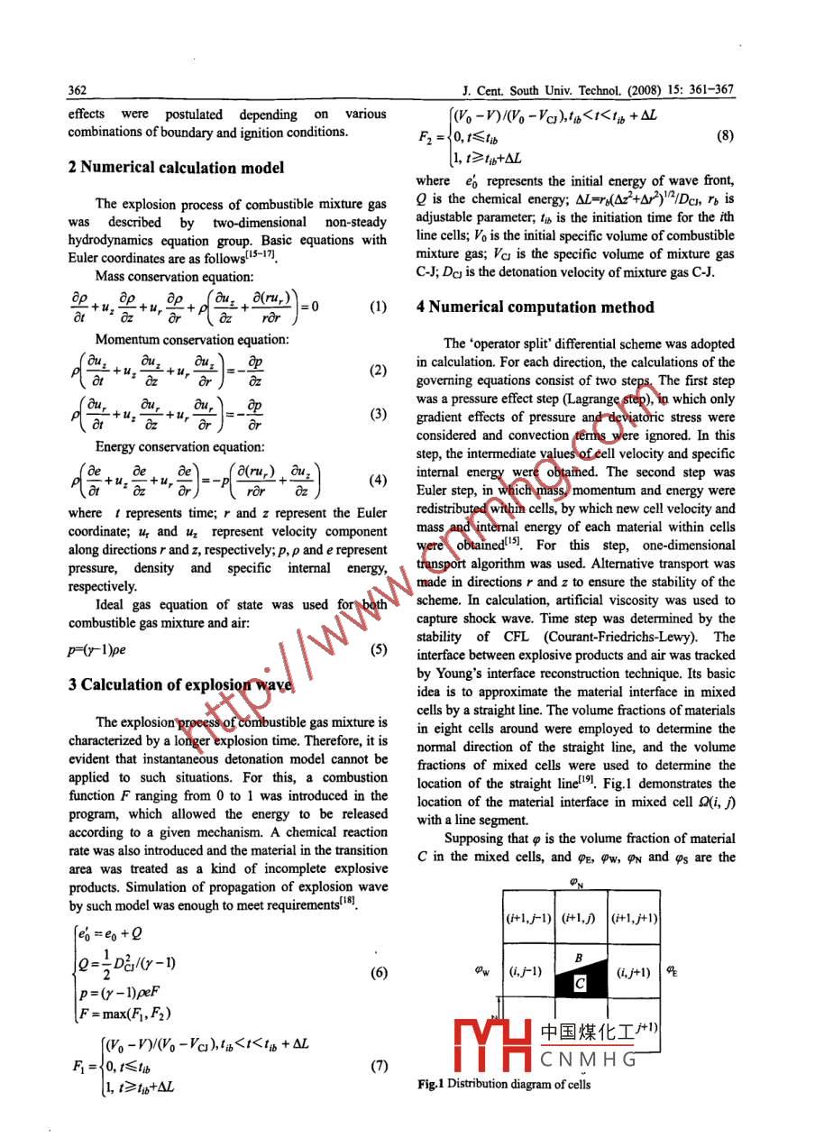 J Cent. South Univ Technol. (2008)15: 361-367DOI:10.1007/l1771-0080068-xNumerical simulation for explosion wave propagation ofcombustible mixture gasWANG Cheng(王成, NING Jian-guo(寧建國(guó)), MA Tian-bao(馬天寶(State Key Laboratory of Explosion Science and Technology, Beijing Institute of Technology,Beijing 100081, China)Abstract: A two-dimensional multi-material code was indigenously developed to investigate the effects of duct boundary conditionsand ignition positions on the propagation law of explosion wave for hydrogen and methane-based combustible mixture gas In thecode, Youngs technique was employed to track the interface between the explosion products and air, and combustible function modelwas adopted to simulate ignition process. The code was employed to study explosion flow field inside and outside the duct and toobtain peak pressures in different boundary conditions and ignition positions. Numerical results suggest that during the propagationin a duct, for point initiation, the curvature of spherical wave front gradually decreases and evolves into plane wave due to themultiple reflections on the duct wall, multi-peak values appear on pressure-time curve, and peak pressure strongly relies on the ductemition model and multi-material interface treatment method are feasibleKey words: combustible mixture gas; explosion wave; interface treatment; combustion function modefront tracking method with a godunov-type solver fo1 Introductionthe Euler equations, BIELERT and SICHE2investigated the propagation process of detonation ofIn mining and other related industries, explosion ethylene/oxygen and methane/air mixtures at differentrelated accidents occur frequently, the main cause is the mixing ratios in the duct. WANG and XU3I usedcombustible gases!-2). These occurrences normally five-order WENO scheme and elementary reactionattribute to leakage of combustible mixture gas in the model to simulate the propagation process of themining or industrial ducts. When mixed with air, such detonation wave for H2-O2 mixture gas in heart-shapedgases react violently. If ignited by some initiation sources, duct, and analyzed the process of wave system evolutiothey form a turbulent flow, and become combustible, and chemical dynamics accompanying the secondaryexplosive and even detonable due to disturbance from initiation. ZHANG et al 4) adopted simplified two-stagebarriers such as equipment and ducts. It is, therefore, chemical reaction model and improved high precisionof great significance to conduct research on propagation space-time conservation method (CE/Se)to simulateprocess of explosive wave produced by combustible deflagration-to-detonation process of combustible gasmixture gas after ignition. This resembles an explosion All these previous numerical simulation studies wereof a non-ideal explosive. In contrast to explosion of performed using single gas and only one material incondensed explosives, such a gas explosion is calculation domain. Up to our knowledge, there is nocharacterized by slowering pressure-rise, longer energy substantial understanding on the explosion characteristicsrelease time and longer over-pressure acting time on of combustible mixture gas and two or more materials instructures/9-10). Due to this fact and unavailability of calculation domain. The need therefore arises to studyanalytical solutions for the explosive wave produced by such situations. With our indigenously developedcombustible mixture gas, the research on explosion of two-dimensional Euler code based on Youngs techniccombustible mixture gas was mainly carried out by for processing multi-material interface and combustionnumerical simulation. In recent years, ORAN et all function model to simulate ignition process,numericalnumerically have simulated the cellular detonation of analyses were performed for the evolution process of theHr-Oz-Ar mixture gas. Their results indicated that the explosive flow field inside and outside the duct whencollision of triple wave points plays a very important role hydrogerne-based combustible mixture gasin the secondary initiation. With the combination ofplod中國(guó)煤化工 nations, variousFoundation item: Project(10572026)supported by the National Natural Science FoundatiCNMHGRecelved date: 2008-01-05: Accepted date: 2008-03-24nding author: WANG Cheng, Associate professor, PhD; TeL: +86-10-68912762; E-mail: wangcheng@biteducnJ.Cent. South Univ. Technol. (2008)15: 361-367effects were postulated depending on various(-1(-V)<1