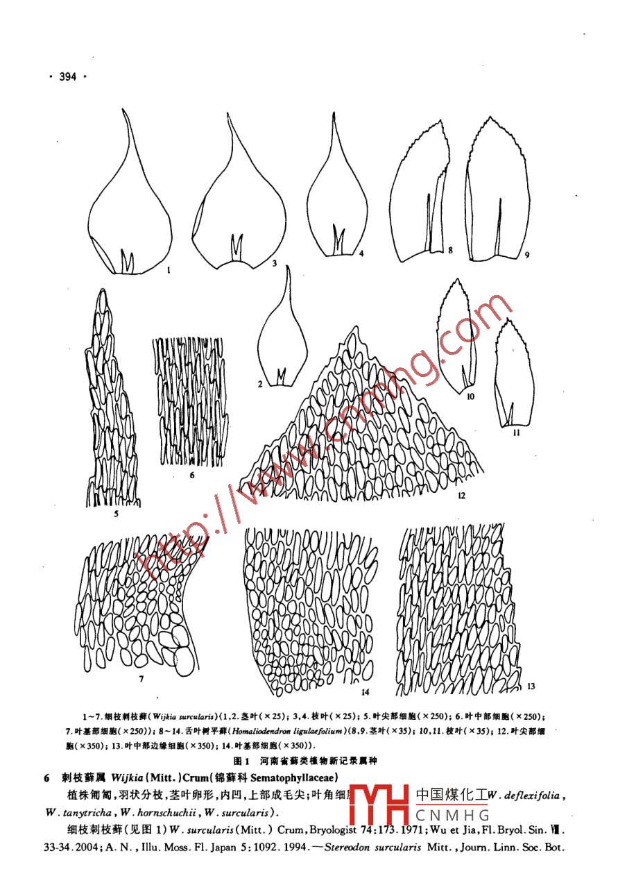 第32卷/第3期/河北師范大學(xué)學(xué)報(bào)/自然科學(xué)版/Vol. 32 No. 32008年5月JOURNAL OF HEBEI NORMAL UNIVERSITY/Natural Sciencoe Edition/May. 2008河南省蘚類植物新記錄屬種劉永英1,2,趙建成',李琳', 王育水2(1.河北師范大學(xué)生命科學(xué)學(xué)院,河北石家莊050016; 2.焦作高等師范??茖W(xué)校生物系,河南焦作454000)0摘要:報(bào)道河南省蘚類 植物新記錄7屬7種:叢毛蘚屬Pleuridium 及叢毛蘚P. subulatum ,小曲尾蘚屬Di-cranella及變形小曲尾蘚D. waria ,劍葉蘚屬Scopelophila 及劍葉蘚s. calaractae,擬扁枝蘚屬Homaliadelphus及擬扁枝蘚H. tarionianus ,樹平蘚屬Homaliodendron及舌葉樹平蘚H. ligulafliurm ,刺枝蘚屬Wijkia 及細(xì)枝刺枝蘚w. surcularis ,毛灰蘚屬Homomallium及毛灰蘚H. incuralum.對(duì)這些植物的識(shí)別特征、生境和地理分布做了簡要討論,并根據(jù)標(biāo)本對(duì)其中的2種繪制了形態(tài)解剖圖.關(guān)鍵詞:河南省;蘚類;新記錄中團(tuán)分類號(hào):Q949.35* 2文獻(xiàn)標(biāo)識(shí)碼:A文章編號(hào)1000-5854(2008)03-0392-05據(jù)文獻(xiàn)報(bào)道,已知河南省分布有蘚類植物41科115屬286種1亞種10變種[1~20].筆者在研究鑒定采自河南省云臺(tái)山地區(qū)苔蘚植物標(biāo)本的過程中,發(fā)現(xiàn)河南省蘚類植物新記錄7屬7種[15-28),特予以報(bào)道,以期為河南省苔蘚植物研究提供新資料.憑證標(biāo)本存放于河北師范大學(xué)生命科學(xué)學(xué)院標(biāo)本室(HBNU).云臺(tái)山地區(qū)是指云臺(tái)山世界地質(zhì)公園及其周邊地區(qū).該地區(qū)位于東亞裂谷西緣太行山南段,地理坐標(biāo)為35'11'25"~35*29' 40" N,112*44'40"~ 113"26'45" E,行政區(qū)劃橫跨河南省焦作市所屬修武縣、博愛縣和沁陽.市等二縣- -市,面積約556 km2.筆者主要以修武縣云臺(tái)山園區(qū)、博愛縣青天河園區(qū)、青龍峽園區(qū)、蜂林峽園區(qū)、焦作市影視城和縫山針公園為采集點(diǎn)進(jìn)行苔蘚植物標(biāo)本采集.1叢毛蘚屬 Pleuridium Brid. (牛毛蘚科Ditrichaceae)在牛毛蘚科中,河南省已記載的只有牛毛蘚屬(Ditrichum),此次發(fā)現(xiàn)叢毛蘚屬為河南省新記錄,2屬的主要區(qū)別:前者孢蒴高出雌苞葉,而后者孢蒴隱于雌苞葉內(nèi).本屬世界記錄30余種,多分布在溫帶地區(qū).中國大陸只記載叢毛蘚1種[18].叢毛蘚P. subulatum (Hedw.) Rabenh. Deutschl. Krypt. FI. 2(3):79.1848; Chen, Gen. Musc. Sin. I :100. 1963 ;Gao, FI. Bryol. Sin. I . 68-69. 1994 ; Bai, FI. Bryol. Intramongolic. 116-117. 1997;Zeng in Wu, FI.Yunnan. 18:38-39. 2002;A. N. , Ilu. Moss. FI. Japan 1: 106-107.1987. - Phascum subulatum Hedw. , Spec.Muse. 19. 1801.一Pleuridium acuminatum Lindb. , Oefv. K. Vet. Foerh. 20: 406.1863;Zhang, Fl. Tsinlin.皿(1):11. 1978.生境:土生或礫石面薄土生,海拔300~ 1 000 m. .標(biāo)本鑒定:焦作市影視城,劉永英2004100569 ,2004100561a;修武縣云臺(tái)山老潭溝,劉永英05039b;修武縣云臺(tái)山茱萸峰,劉永英05041b.分布:中國(陜西、上海、云南和內(nèi)蒙古),日本,歐洲及北美洲.識(shí)別特征:植株毛狀叢生;葉長披針形,上部邊緣內(nèi)卷;中肋粗壯,幾乎充滿葉上部;葉上部細(xì)胞長形或長菱形,基部細(xì)胞長方形;球形孢蒴隱于苞葉內(nèi).2小 曲尾蘚屬Dicranella (C. M. )Schimp. (曲尾蘚科Dicranaceae)植株形似曲尾蘚,但形體較小.明顯特征是角細(xì)胞不分化,孢蒴弓形背凸.1990年被記錄為中國新記錄屬,目前中國分布有14種.中國煤化工CNMHG收稿日期:2007 -09-08;慘回日期:2007-11-20MYH薔金項(xiàng)目:河南省自然科學(xué)基金101000.0700200;河南省科技攻關(guān)項(xiàng)目(0624240019)作者簡介:劉水英(1969-).女,河南淮陽人.副教授,碩士,從事植物學(xué)教學(xué)及苔蘚植物學(xué)研兗. .通訊作者:趙建成(1956- ).男.教授,研究方向?yàn)樘μ\學(xué). E - mil:haojiancheng@ mail. hebru. edu. cn393●變形小曲尾蘚D. varia (Hedw. ) Schimp. , Coroll.13. 1855;Gao, FI. Bryol. Sin. I. 145. 1994; Bai, FI.Bryol. lntramongolic.126-127. 1997;Zeng in Wu, FI. Yunnan. 18: 74-75.2002. - - Dicranum varium Hedw.,Spec Muse. 133. 1801. -Anisothecium ruberum Lindb. , Muse. Scand. 26. 1879; Chen, Gen. Musc. Sin. I :119. 1963.生境:土生,海拔750~850m.標(biāo)本鑒定:博愛縣峰林峽,劉永英200410489 ,2004100495 ,2004100490 ,2004100384.分布:中國(遼寧、江西云南、內(nèi)蒙古、四川、江蘇、浙江、貴州、廣西和廣東),日本,歐洲,北美洲及非洲.識(shí)別特征:葉狹披針形,基部稍寬,常一向扭曲,先端有齒;中肋細(xì),達(dá)葉尖終止;孢蒴卵圓形,弓形彎曲,無環(huán)帶,16齒.3劍葉蘚屬 Scopelophila (Mitt. )Lindb. (叢蘚科Pottiaceae)筆者采用Zander[28)的觀點(diǎn),國內(nèi)學(xué)者黎興江(2002年)也同意此觀點(diǎn).1956年,Akire Noguchi曾將劍葉蘚屬或稱擬買氏蘚屬(Merceyopsis)合并于買氏蘚屬(Merceya)中,中國苔蘚學(xué)的奠基人陳邦杰先生(1963年)主張分為2屬.本屬植物多生長在含有銅、鋅或鐵的巖石上.劍葉蘚屬約17種,中國分布有2種.劍葉蘚Sopelophila cataractae(Mitt. ) Broth. in Engler & Prant,Nat. PA1. 1(3) :436.1902 ;Zand. ,Bull. Buffalo.Soc. Nat. Sai.32:154.1993;A. N. , Iu. Moss. F1. Japan 2:328 329. 1988;Li in Wu, FI. Yunnan. 18:300-302. 2002. -Weissia cataractae Mitt. ,J. Linn. Soc. London Bot. 12: 135. 1869. - Sopelophila sikkimensis C. Muell. in Ren. etCardl. ,Bull. Soc. R. Bot. Belg. 41(1):53. 1905. - - Merceyopsis sikimensis (C. Mell.) Broth. et Dix. ,Joum. Bot. 48:301.7. 1910;Li in Gao, F. Bryol. Sin. I. 227. 1996; Li, Bryol. Xizang. 114-115. 1985 ; Chen, Gen. Musc. Sin. I: 212.1963. - - Merceya gedeana (Lac. ) Nog. K