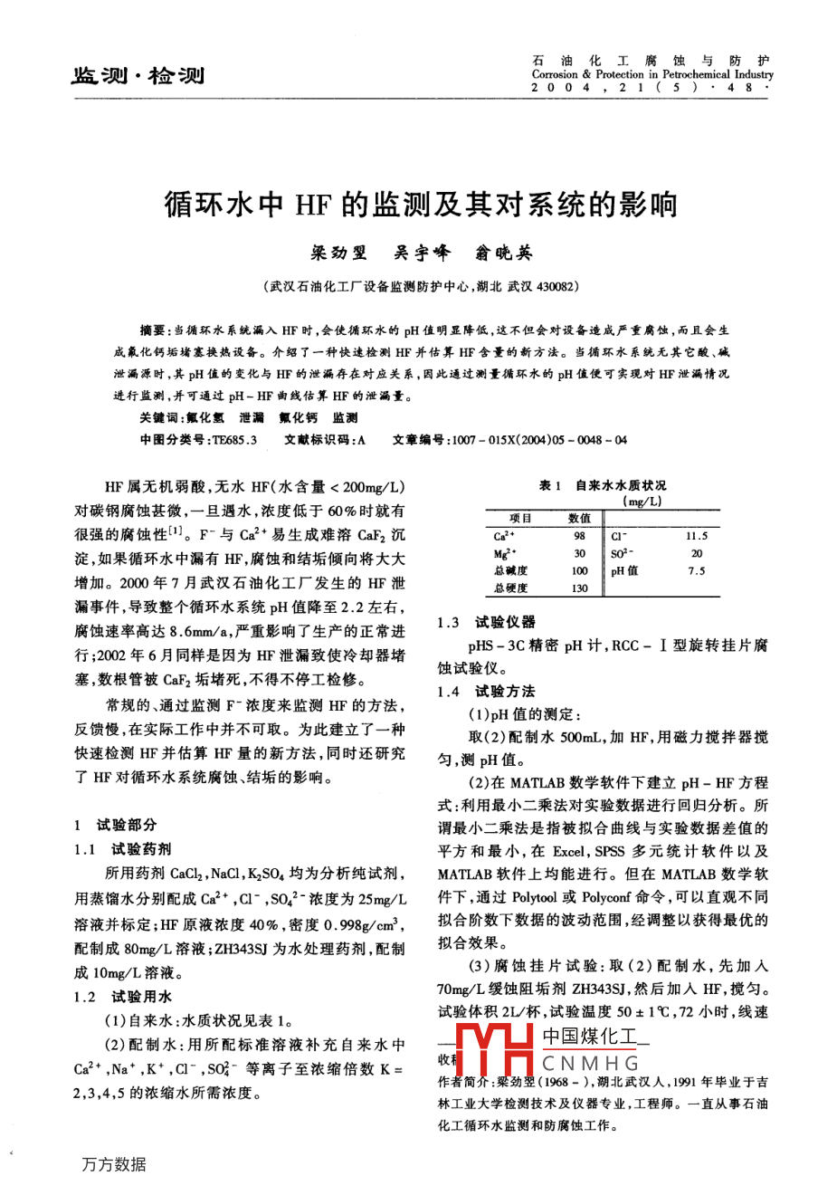 石油化工監(jiān)測·襝測Corrosion Protection in Petrochemical Industry2004,21(5)·48循環(huán)水中HF的監(jiān)測及其對系統(tǒng)的影響梁勁翌吳宇峰翁咣英(武漢石油化工廠設(shè)備監(jiān)測防護(hù)中心,湖北武漢430082)摘要:當(dāng)循環(huán)水系統(tǒng)漏入HF時(shí),會使循環(huán)水的pH值明顯降低,這不但會對設(shè)備造成嚴(yán)重腐蝕,而且會生咸氟化鈣垢堵塞換熱設(shè)備。介紹了一種快速檢測F并佑算HF含量的新方法。當(dāng)循環(huán)水系統(tǒng)無其它酸、堿泄漏源時(shí),其pH值的變化與HF的泄漏存在對應(yīng)關(guān)系,因此通過測量循環(huán)水的pH值便可實(shí)現(xiàn)對HF泄漏情況進(jìn)行監(jiān)測,并可通過pH-HF曲線估算HF的泄漏量關(guān)鍵詞:氟化氫泄漏氟化鈣監(jiān)測中圖分類號:TF6853文獻(xiàn)標(biāo)識碼:A文章編號:1007-015X(2004)05-0048-04HF屬無機(jī)弱酸,無水HF(水含量<200mg/L)表1自來水水質(zhì)狀況對碳鋼腐蝕甚微,一旦遇水,濃度低于60%時(shí)就有項(xiàng)目數(shù)值很強(qiáng)的腐蝕性1。F-與Ca2+易生成難溶CaF2沉98淀,如果循環(huán)水中漏有H,腐蝕和結(jié)垢傾向?qū)⒋蟠罂倝A度100pH值7.5增加。2000年7月武漢石油化工廠發(fā)生的HF泄總硬度漏事件,導(dǎo)致整個(gè)循環(huán)水系統(tǒng)pH值降至2.2左右,腐蝕速率高達(dá)86mm/a,嚴(yán)重影響了生產(chǎn)的正常進(jìn).3試驗(yàn)儀器行;2002年6月同樣是因?yàn)镠F泄漏致使冷卻器堵pHS-3C精密pH計(jì),RCC-I型旋轉(zhuǎn)掛片腐蝕試驗(yàn)儀。塞,數(shù)根管被CaF2垢堵死,不得不停工檢修。1.4試驗(yàn)方法常規(guī)的、通過監(jiān)測F濃度來監(jiān)測HF的方法(1)pH值的測定:反饋慢,在實(shí)際工作中并不可取。為此建立了一種取(2)配制水500mL,加HF,用磁力攪拌器攪快速檢測HF并估算HF量的新方法,同時(shí)還研究勻,測pH值。了HF對循環(huán)水系統(tǒng)腐蝕、結(jié)垢的影響。(2)在 MATLAB數(shù)學(xué)軟件下建立pH-HF方程式:利用最小二乘法對實(shí)驗(yàn)數(shù)據(jù)進(jìn)行回歸分析。所1試驗(yàn)部分謂最小二乘法是指被擬合曲線與實(shí)驗(yàn)數(shù)據(jù)差值的1.1試驗(yàn)藥劑平方和最小,在 Excel,SFss多元統(tǒng)計(jì)軟件以及所用藥劑CaCl2,NaCl,K2SO4均為分析純試劑, MATLAB軟件上均能進(jìn)行。但在 MATLAB數(shù)學(xué)軟用蒸餾水分別配成Ca2+,C1-,SO2濃度為25mg/L件下,通過 Polytool或 Polycom命令,可以直觀不同溶液并標(biāo)定;H原液濃度40%,密度0.998g/cm3擬合階數(shù)下數(shù)據(jù)的波動范圍,經(jīng)調(diào)整以獲得最優(yōu)的配制成80m/溶液;ZHB45為水處理藥劑,配制擬合效果。成10mg/L溶液(3)腐蝕掛片試驗(yàn):取(2)配制水,先加入1.2試驗(yàn)用水70mg/L緩蝕阻垢劑zH343sJ,然后加人H,攪勻。(1)自來水:水質(zhì)狀況見表1。試驗(yàn)體積2L/杯,試驗(yàn)溫度50±1℃,72小時(shí),線速(2)配制水:用所配標(biāo)準(zhǔn)溶液補(bǔ)充自來水中中國煤化工Ca2+,Na·,K+,Cl,SO等離子至濃縮倍數(shù)K=CNMHG2,3,4,5的濃縮水所需濃度。作者簡喬:梁勁翌(1968-),湖北武漢人,1991年畢業(yè)于吉林工業(yè)大學(xué)檢測技術(shù)及儀器專業(yè),工程師。一直從事石油化工循環(huán)水監(jiān)測和防腐蝕工作第5期梁勁翌等循環(huán)水中HF的監(jiān)測及其對系統(tǒng)的影響0.315m/s,不濃縮;掛片材質(zhì)A3鋼,規(guī)格40mm×度的升高,pH值降低緩慢,曲線較平緩;HF到達(dá)12mm×2.5mm。定值時(shí),pH值降到最低點(diǎn),以后隨HF濃度升高而(4)阻垢試驗(yàn):取(2)配制水500L,先加入略升高。這種現(xiàn)象是HF所特有的。HF和HCl二70mg/L阻垢緩蝕劑zH343SJ,補(bǔ)充HCO3濃度與者濃度變化與pH值的關(guān)系見圖2Ca2+-致(以CaCO3計(jì)),用四硼酸鈉調(diào)節(jié)pH值至9.0左右后加入HF,攪勻,在80℃水浴中放置10小時(shí)取出,冷卻后用EDTA法測Ca2+濃度9753◆HC12結(jié)果與討論2.1HF的監(jiān)測SH(1)pH值與HF的關(guān)系:通過監(jiān)測F濃度來監(jiān)今小小$令小分測HF,方法有離子選擇電極法、目視比色法、滴定酸的濃度/(mgL)法和分光光度法等。它們共同的特點(diǎn)是耗時(shí),反饋圖2HC和HF與pH值的關(guān)系慢,滿足不了快速、易行的檢測要求。通過監(jiān)測循環(huán)水pH值監(jiān)測HF,先決條件是泄pH值隨H濃度變化的特有現(xiàn)象是因?yàn)樘妓崧┰粗袥]有其他酸性物質(zhì)。HF烷基化裝置的原料鹽在水中存在以下電離平衡:丙烯、異丁烷均呈中性,即使漏進(jìn)水中也不會引起HCOH++c0(1)pH值的變化;裝置中除催化劑H外,沒有其他酸(2)存在。如果循環(huán)水pH值發(fā)生變化,只可能是由漏HF屬弱酸,HF=H++F-,隨HF濃度加大,電HF引起,因此用pH值監(jiān)測是可行的。離出的F與水中Ca2+反應(yīng)生成難溶的CaF2沉淀不同水質(zhì)pH值隨HF的變化關(guān)系見圖1。Ca2++F=caF因?yàn)镵,,< KapCaco,根據(jù)沉淀轉(zhuǎn)移原則,原有平衡(1),(2)被破壞,最終使HCO3濃度升高,7一K=2.0導(dǎo)致pH值有上升趨勢。K=3.0K=4.0但是,HF濃度很低時(shí),由于低氟濃度條件下,一K=5.0氟化鈣沉淀難以生成2),因此在加入HF初始階段,F濃度低,CaF2未能生成,水中原有的平衡沒有破壞,pH值隨H+增大而下降。HCl屬強(qiáng)酸,生F濃度/(mg-L)成的CaCl2可溶,其溶度積遠(yuǎn)大于CaCO3,所以沒有圖1pH-HF濃度的關(guān)系出現(xiàn)類似情況。(2)建立方程式:從pH-HF關(guān)系圖(圖1)可以從圖1可以看出,盡管水質(zhì)條件不同,pH-H看出,K>2.0的三條