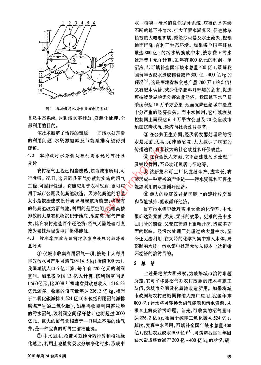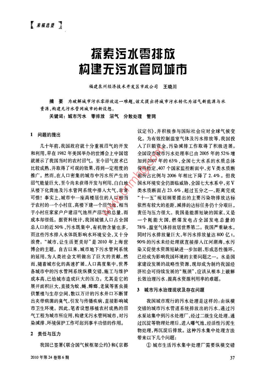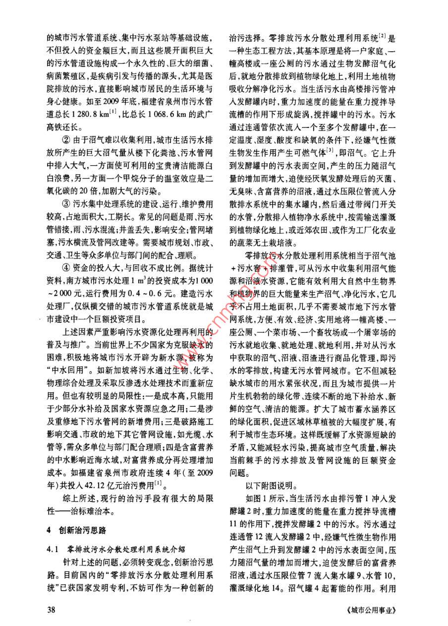 【來(lái)選量了振泵污水要排放前建無(wú)污水管網(wǎng)城市福建泉州經(jīng)濟(jì)技術(shù)開(kāi)發(fā)區(qū)市政公司王曉川摘要為破解城市污水零排放這一難題,該文提出將城市污水轉(zhuǎn)化為沼氣新能源與水資源,構(gòu)建無(wú)污水管網(wǎng)城市的新設(shè)想。關(guān)鍵詞:城市污水零排放沼氣分散處理管網(wǎng)1問(wèn)題的提出議定書(shū)》,并積極參與國(guó)際社會(huì)應(yīng)對(duì)全球氣候變化。為有效控制溫室氣體及污水排放等,我國(guó)投幾十年前我國(guó)政府就十分重視沼氣的開(kāi)發(fā)人了巨額資金,污染減排工作取得了積極進(jìn)展。和利用,早在1982年美國(guó)舉辦的世博會(huì)上中國(guó)館全國(guó)設(shè)市城市污水處理率已由2005年的52%增就展示了我國(guó)當(dāng)時(shí)的農(nóng)村沼氣。至今沼氣技術(shù)已加到2007年的63%,全國(guó)七大水系的水質(zhì)總體比較成熟,并取得了可觀(guān)的效果,得到一定程度的保持穩(wěn)定,407個(gè)國(guó)家監(jiān)控?cái)嗝嬷?劣V類(lèi)水質(zhì)斷推廣。然而,在人口密集的城市中污水所產(chǎn)生的面所占比例與2006年相比下降了2.4%。但我沼氣能量巨大,至今尚未獲得開(kāi)發(fā)與利用,白白地國(guó)水環(huán)境安全仍面臨威脅,全國(guó)七大水系中,劣V從樓下化糞池及污水管網(wǎng)系統(tǒng)中排入大氣,非常類(lèi)水質(zhì)斷面占23.6%,超過(guò)五分之一,距離完成可惜!事實(shí)上,城市中一座高樓居住的人口相當(dāng)“十一五”規(guī)劃綱要提出的主要污染物排放達(dá)標(biāo)于農(nóng)村的一個(gè)小村莊,高樓下建一個(gè)沼氣池,相當(dāng)依然有較大的差距減排的達(dá)標(biāo)任務(wù)仍十分艱巨,于小村莊家家戶(hù)戶(hù)建沼氣池所產(chǎn)沼氣的總量,而責(zé)任與壓力很大。我國(guó)是能源短缺的國(guó)家,又是成本卻很低。據(jù)資料統(tǒng)計(jì),我國(guó)城鎮(zhèn)人口占全國(guó)一個(gè)耗能大國(guó),燃煤發(fā)電占全國(guó)發(fā)電總量的總?cè)丝诘慕?0%,污水既集中,有機(jī)物含量也多,78%,溫室氣體排放居世界第二。我國(guó)嚴(yán)重缺水,而這些污水排入水體既影響水環(huán)境安全,又十分同時(shí)污水排放量巨大,年污水排放量達(dá)800億t,浪費(fèi)。“城市,讓生活更美好”是2010年上海世90%的污水未經(jīng)處理就直接排入江河湖海,水污博會(huì)的主題。自古以來(lái),城市地下污水管網(wǎng)系統(tǒng)染又促使水資源短缺進(jìn)一步加劇,形成惡性循環(huán)的延用,為人類(lèi)社會(huì)文明做出了巨大的貢獻(xiàn),然已經(jīng)成為影響我國(guó)環(huán)境的主要問(wèn)題之一。水是國(guó)而,隨著城市化的高速擴(kuò)展,人口高度集中,世界家建設(shè)發(fā)展的戰(zhàn)略性資源,現(xiàn)卻成為制約我國(guó)經(jīng)各城市中的污水管網(wǎng)系統(tǒng)縱橫交錯(cuò),施工與維護(hù)濟(jì)社會(huì)可持續(xù)發(fā)展的“瓶頸”,應(yīng)該從根本上破解成本高,已給城市造成巨大的壓力。尤其是它的長(zhǎng)效治理污水、提高水資源利用率的難題。展開(kāi)面積巨大,直接為蚊、蠅、蟑螂、老鼠等害蟲(chóng)提供繁殖與生存空間,數(shù)以萬(wàn)計(jì)的污水井口不斷冒3城市污水治理現(xiàn)狀及存在問(wèn)題出夾帶病菌的臭氣,引發(fā)與傳播疾病,直接影響城我國(guó)城市現(xiàn)行的污水處理是這樣的:由縱橫市衛(wèi)生環(huán)境。因此,筆者設(shè)想移植農(nóng)村成熟的沼交錯(cuò)的城市污水管道系統(tǒng)排放岀的污水,通過(guò)污氣工程為城市所應(yīng)用構(gòu)建無(wú)污水管網(wǎng)城市,對(duì)污水泵站集中到污水處理廠(chǎng),經(jīng)過(guò)二級(jí)生化處理,通染減排、環(huán)境保護(hù)工作可起到事半功倍的作用。過(guò)沉淀等物理處理后,進(jìn)人曝氣池經(jīng)活性污泥生2責(zé)任與壓力物處理,再沉淀后排放。這種污水集中處理方法帶來(lái)以下幾個(gè)問(wèn)題我國(guó)已簽署《聯(lián)合國(guó)氣候框架公約》和《京都①城市生活污水集中處理廠(chǎng)需要縱橫交錯(cuò)2010年第24卷第6期的城市污水管道系統(tǒng)集中污水泵站等基礎(chǔ)設(shè)施,治污選擇。零排放污水分散處理利用系統(tǒng)2是不但投入的資金額巨大,而且這些展開(kāi)面積巨大種生態(tài)工程方法,其基本原理是將一戶(hù)家庭的污水管道設(shè)施構(gòu)成一個(gè)永久性的巨大的細(xì)菌、幢高樓或一座公廁的污水通過(guò)生物發(fā)酵沼氣化病菌繁殖區(qū),是疾病引發(fā)與傳播的源頭,尤其是醫(yī)后,就地分散排放到植物綠化地上,利用土地植物院排放的污水,直接影響城市居民的生活環(huán)境與吸收分解凈化污水。當(dāng)生活污水由高樓排污管沖身心健康。如至2009年底,福建省泉州市污水管人發(fā)酵罐內(nèi)時(shí),重力加速度的能量在重力攪拌導(dǎo)道總長(zhǎng)1280.8km,比總長(zhǎng)1068.6km的武廣流槽的作用下形成旋渦,攪拌罐中的污水。污水高鐵還長(zhǎng)。通過(guò)連通管依次流入一個(gè)至多個(gè)發(fā)酵罐中,在②由于沼氣難以收集利用,城市生活污水排定溫度濕度、酸度和缺氧的條件下,經(jīng)嫌氣性微放所產(chǎn)生的巨大沼氣量從樓下化糞池污水管網(wǎng)生物發(fā)生作用產(chǎn)生可燃?xì)怏w3,即沼氣。它上升中排入大氣,一
