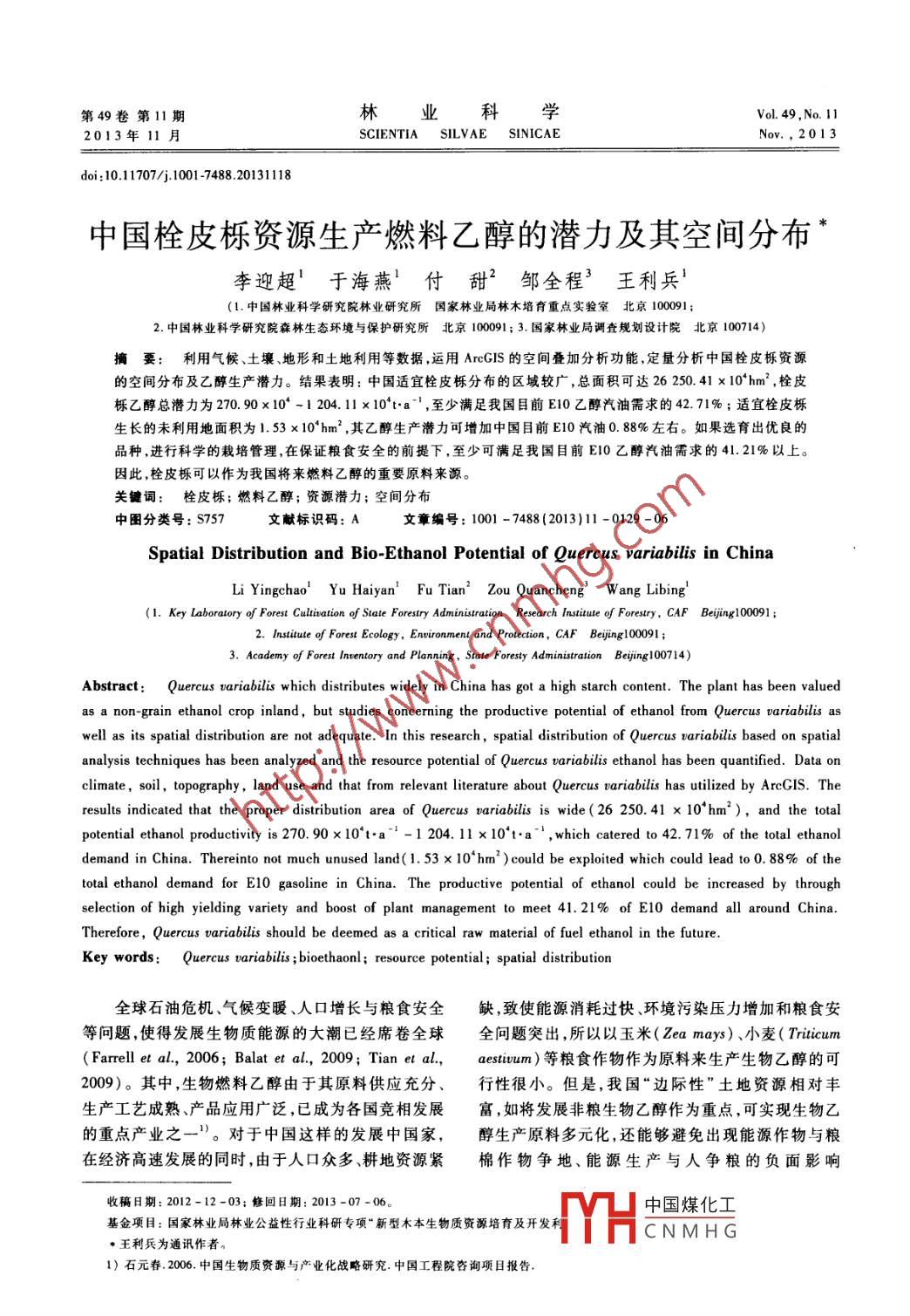 第49卷第11期林業(yè)科學(xué)Vol. 49. No. 1 12013年11月SCIENTIA SILVAE SINICAENov.,2013doi:10.11707/1001-7488.20131118中國(guó)栓皮櫟資源生產(chǎn)燃料乙醇的潛力及其空間分布李迎超于海燕付甜2鄒全程王利兵(1.中國(guó)林業(yè)科學(xué)研究院林業(yè)研究所國(guó)家林業(yè)局林木培育重點(diǎn)實(shí)驗(yàn)室北京100091;2.中國(guó)林業(yè)科學(xué)研究院森林生態(tài)環(huán)境與保護(hù)研究所北京100091;3.國(guó)家林業(yè)局調(diào)査規(guī)劃設(shè)計(jì)院北京100714)利用氣候、土壤、地形和土地利用等數(shù)據(jù),運(yùn)用 ArcGIS的空間疊加分析功能,定量分析中國(guó)栓皮櫟資源的空間分布及乙醇生產(chǎn)潛力。結(jié)果表明:中國(guó)適宜栓皮櫟分布的區(qū)域較廣,總面積可達(dá)26250.41×10hm2,栓皮櫟乙醇總潛力為270.90×104-1204.11×10′ta-,至少滿(mǎn)足我國(guó)目前E0乙醇汽油需求的4271%;適宜栓皮櫟生長(zhǎng)的未利用地面積為1.53×10hm2,其乙醇生產(chǎn)潛力可增加中國(guó)目前E10汽油0.88%左右。如果選育出優(yōu)良的品種,進(jìn)行科學(xué)的栽培管理,在保證糧食安全的前提下,至少可滿(mǎn)足我國(guó)目前E0乙醇汽油需求的41.21%以上。因此,栓皮櫟可以作為我國(guó)將來(lái)燃料乙醇的重要原料來(lái)源。關(guān)鍵詞:栓皮櫟;燃料乙醇;資源潛力;空間分布圖分類(lèi)號(hào):S757文獻(xiàn)標(biāo)識(shí)碼:A文章編號(hào):1001-7488(2013)11-0129-06Spatial Distribution and Bio-Ethanol Potential of Quercus variabilis in ChinangcnaoYu Haiyan Fu Tian Zou Quancheng Wang Libing(1. Key Laboratory of Forest Cultivation of State Forestry Administration Research Institute of Forestry, CAF Beijing100091:2. Institute of Forest Ecology, Environment and Protection, CAF Beijing100091;3. Academy of Forest Inventory and Planning, State Foresty Administration Beiing100714)Abstract: Quercus variabilis which distributes widely in China has got a high starch content. The plant has been valuedas a non-grain ethanol crop inland, but studies concerning the productive potential of ethanol from Quercus variabiliswell as its spatial distribution are not adequate. In this research, spatial distribution of Quercus variabilis based on spatialanalysis techniques has been analyzed and the resource potential of Quercus variabilis ethanol has been quantified. Dataclimate, soil, topography, land use and that from relevant literature about Quercus variabilis has utilized by ArcGIS. Theresults indicated that the proper distribution area of Quercus variabilis is wide( 26 250. 41 x 10hm'),and the totalpotential ethanol productivity is270.90×10t·a-1204.11×10°t·a^, which catered to42.71% of the total ethanoldemand in China. Thereinto not much unused land 1 53 x 10 hm )could be exploited which could lead to 0. 88% of thetotal ethanol demand for E10 gasoline in China. The productive potential of ethanol could be increased by throughselection of high yielding variety and boost of plant management to meet 41. 21% of E10 demand all around ChinaTherefore, Quercus variabilis should be deemed as a critical raw material of fuel ethanol in the futureKey words: Quercus variabilis; bioethaonl: resource potential; spatial distribution全球石油危機(jī)、氣候變暖、人口增長(zhǎng)與糧食安全缺,致使能源消耗過(guò)快、環(huán)境污染壓力增加和糧食安等問(wèn)題,使得發(fā)展生物質(zhì)能源的大潮已經(jīng)席卷全球全問(wèn)題突出,所以以玉米( Zea mays)、小麥( Triticum( Farrell et al,2006; Balat et al.,2009; Tian et al., aestuum)等糧食作物作為原料來(lái)生產(chǎn)生物乙醇的可2009)。其中,生物燃料乙醇由于其原料供應(yīng)充分、行性很小。但是,我國(guó)“邊際性”土地資源相對(duì)豐生產(chǎn)工藝成熟、產(chǎn)品應(yīng)用廣泛,已成為各國(guó)競(jìng)相發(fā)展富,如將發(fā)展非糧生物乙醇作為重點(diǎn),可實(shí)現(xiàn)生物乙的重點(diǎn)產(chǎn)業(yè)之一1)。對(duì)于中國(guó)這樣的發(fā)展中國(guó)家,醇生產(chǎn)原料多元化,還能夠避免出現(xiàn)能源作物與糧在經(jīng)濟(jì)高速發(fā)展的同時(shí),由于人口眾多、耕地資源緊棉作物爭(zhēng)地、能源生產(chǎn)與人爭(zhēng)糧的負(fù)面影響收稿日期:2012-12-03;修回日期:2013-07-06?;痦?xiàng)目:國(guó)家林業(yè)局林業(yè)公益性行業(yè)科研專(zhuān)項(xiàng)“新型木本生物質(zhì)資源培育及開(kāi)發(fā)利H中國(guó)煤化工CNMH王利兵為通訊作者1)石元春2006.中國(guó)生物質(zhì)資源與產(chǎn)業(yè)化戰(zhàn)略研究.中國(guó)工程院咨詢(xún)項(xiàng)目報(bào)告130林業(yè)科學(xué)49卷( Fairless,2007;曾麟等,2006;嚴(yán)陸光,2008),并來(lái),包括中國(guó)科學(xué)院資源環(huán)境科學(xué)數(shù)據(jù)中心(htp:∥且利用“非糧”原料發(fā)展生物燃料乙醇也是我國(guó)可www.resdc.cn/first.asp)提供的中國(guó)1:100萬(wàn)土壤再生能源的中長(zhǎng)期發(fā)展規(guī)劃(張彩霞等,2010)。數(shù)據(jù)、中國(guó)90mDEM數(shù)據(jù)和中國(guó)2000年1km×1櫟屬( Quercus)是發(fā)展生物乙醇重要的“非糧”km分辨率的土地利用柵格數(shù)據(jù),其中,土壤數(shù)據(jù)包原料(謝碧霞等,2008;齊學(xué)軍等,2011;李安平括土壤類(lèi)型、pH值、全N、全P、全K、有機(jī)質(zhì)和土壤等,2011;羅偉祥等,2009),無(wú)論從世界范圍還是質(zhì)地;中國(guó)生態(tài)系統(tǒng)研究網(wǎng)絡(luò)數(shù)據(jù)共享系統(tǒng)(htp從我國(guó)來(lái)看,櫟屬在森林植被建設(shè)的優(yōu)勢(shì)樹