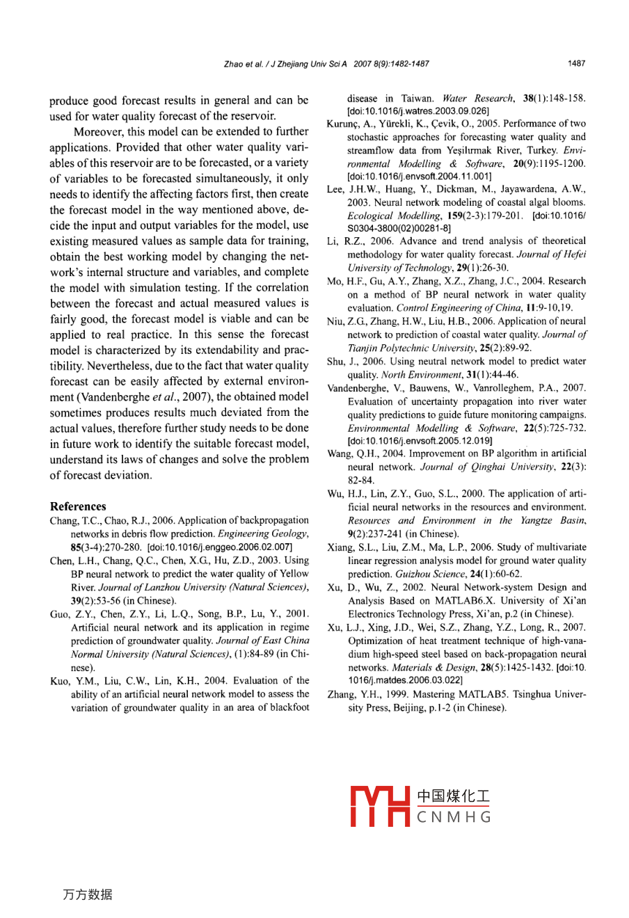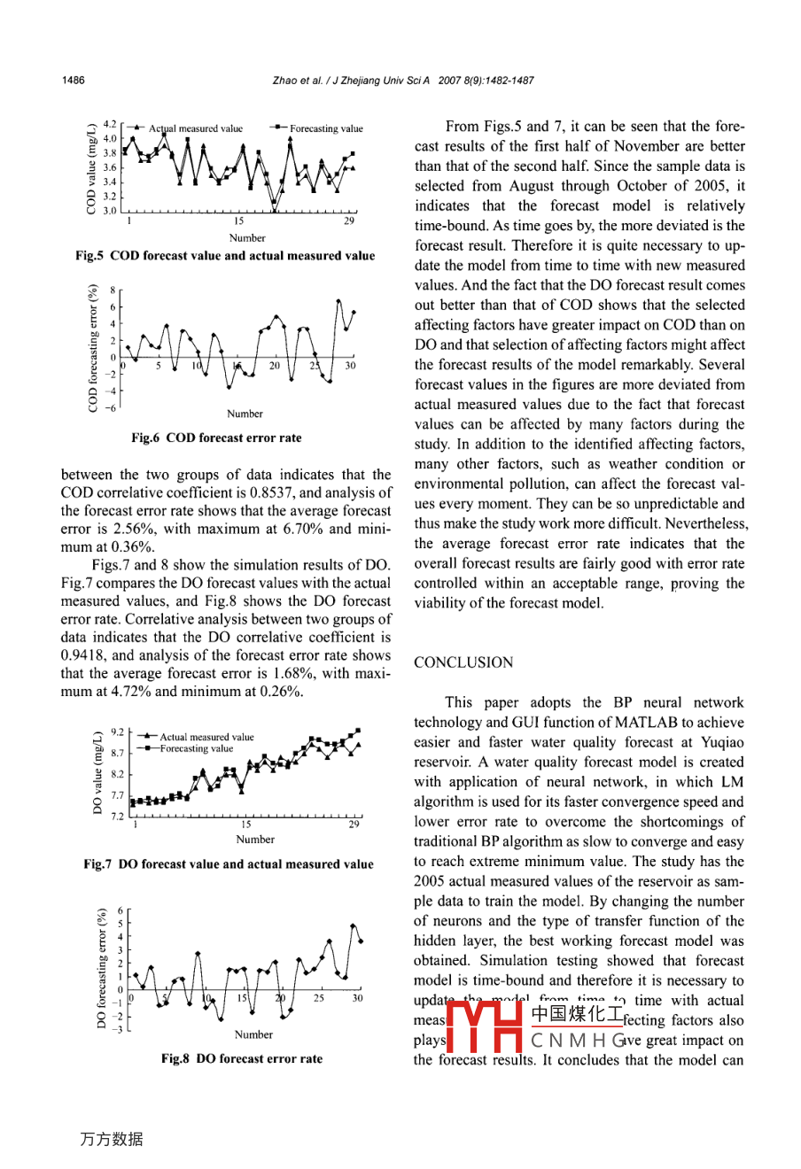 1482Zhao et al. 1 J Zhejiang Univ SciA 2007 8(9):1482-1487Journal of Zhejang University SCIENCE AISSN 1673-565X (Print); ISSN 1862-1775 (Online)www.zju. edu cnjzus; www springerink comJzusE-mal: jzus@zju.edu.cnW ater quality forecast through application ofBP neural network at Yuqiao reservoirZHAO Ying', NAN Jun, CUI Fu-yi, GUO Liang(School of Municipal and Environmental Engineering. Harbin lnstitute of Technology. Harbin 150090, China)E-mail: zhaoying@hit.edu.cnReceived Dec. 26. 2006; revision acepted Apr. 9, 2007Abstract: This paper deals with the study of a water quality forecast model through application of BP neural network techniqueand GUI (Graphical User Interfaces) function of MATLAB at Yuqiao reservoir in Tianjin. To overcome the shortcomings oftraditional BP algorithm as being slow to converge and easy to reach extreme minimum value, the model adopts LM (Leven-berg-Marquardt) algorithm to achieve a higher speed and a lower eror rate. When factors afecting the study object are ientifed,the reservoir's 2005 measured values are used as sample data to test the model. The number of neurons and the type of transferfunctions in the hidden layer of the neural network are changed from time to time to achieve the best forecast results. Throughsimulation testing the model shows high efciency in forecasting the water quality of the reservoir.Key words: Water quality forecast, BP neural network, MATLAB, Graphical User Interfaces (GU)doi: 10.163 1/jzus.2007.A1482Document code: ACLC number: TU991INTRODUCTIONquality in addition to the restriction and standardiza-tion of development in farming and fishery in theThe Yuqiao reservoir covers a flow area of 2060proximity of the reservoir. As a result, this paperkm' with a total storage capacity of 1.559x10* m'. It studies water quality forecast at Yuqiao reservoir tois the only reservoir in Tianjin that incorporatesgain better understanding of possible water qualityvarious functions including flood control, urban water changes in the future. The study will provide scien-supply, irrigation, power generation and aquaculture.tific evidences for water quality management andIt is also a key regulating reservoir for the Diversionpropose necessary action to foresee and prevent anyProject from Luanhe River to Tianjin and plays a future problems, thus playing a positive role in se-major role in securing the economic growth ofTianjincuring the safety of water supply in Tianjin.and the life and property of the people living in theIn recent years, many researches have been con-lower region. However in recent years, along with theducted on water quality forecast model (Chen et al.,development of farmland frillization and fishery in2003; Kurunc et al., 2005; Li, 2006). However, asthe area, the content of nitrogen and phosphorus in thewater quality can be affected by so many factors,water keeps rising, resulting in massive reproductiontraditional data processing methods are no longerof undesirable water bodies such as fungus andgood enough for solving the problem (Wu et al.. 2000;waterweeds and their over-nutrition. To ensure the Xiang et al, 2006) as such factors show a compli-safety of drinking water, it is important to initiate acated nonlinear relation to the variables of watercomprehensive treatment of the reservoir's waterqua中國煤化工and, the neural net-Fharacteristics of the' Project (No. 2006AA06Z305) supported by the Hi-Tech ResearchhumYHC N M H Gy, sl-organizationand Development Program (863) of Chinaand error tolerant and has been widely adopted forZhao et al. 1 J Zhejiang Univ SciA 2007 8():1482-14871483mode identification, analysis and forecast, system high-performance visualized numerical computationrecognition and design optimization (Niu et al, 2006; software. Aimed for analysis and design of neuralShu, 2006). MATLAB is mathematical software withnetwork, Toolbox 4.0 offers many toolbox functionshigh-level numerical computation and data visualiza- that can be called directly. GUI and Simulink, the .tion capacity. It provides users with neural network simulation tool, and has become an ideal tool fordesign and simulation and enables them to work on analysis and design of neural network. It provides thedesign and simulation at greater convenience. This GUI for design and simulation of neural network,paper focuses on forecasting the water quality CODmaking it more convenient for the users to design and(chemical oxygen demand) and DO (dissolved oxy- conduct simulation testing. The model can also begen) values of Yuqiao reservoir. Based on BP neuralmodified subject to actual needs to forecast waternetwork technique and MATLAB's GUI function, the quality under various conditions.study creates a water quality forecast model andadopts the 2005 measured values of Yuqiao reservoir Basic theory of creating the modelas sample data to conduct testing and simulation inIn recent years, neural network technology hasorder to verify the viability of the model.been widely adopted in water quality forecast, inwhich BP network is commonly used (Lee et al, 2003;Mo et al,, 2004). The model created in this paper is aIDENTIFICATION OF STUDY OBJECTS ANDBP neural network model with a single hidden layerAFFECTING FACTORS(Fig.1), with R as the input layer, s' the hidden layer,S the output layer, Iw the weight matrix of theCOD and DO are two major values for evaluat-input layer, LW. the weight matrix from the hiddening water quality This paper studies the forecast of layer to the output layer, b' and b2 threshold values ofCOD and DO at Yuqiao reservoir. Based on existingthe hidden and output layer respectively andf' andfmeasured values and correlative analysis, 8 factorsthe neuron transfer functions of the hidden and outputare identified as affecting factors including waterlayer respectively. As theoretically proven, such BPtemperature, turbidity, pH, alkalinity, chloride,model as shown in Fig.1 can approach any nonlinearNH4*-N, NO2 -N and hardness, each of which affectsfu