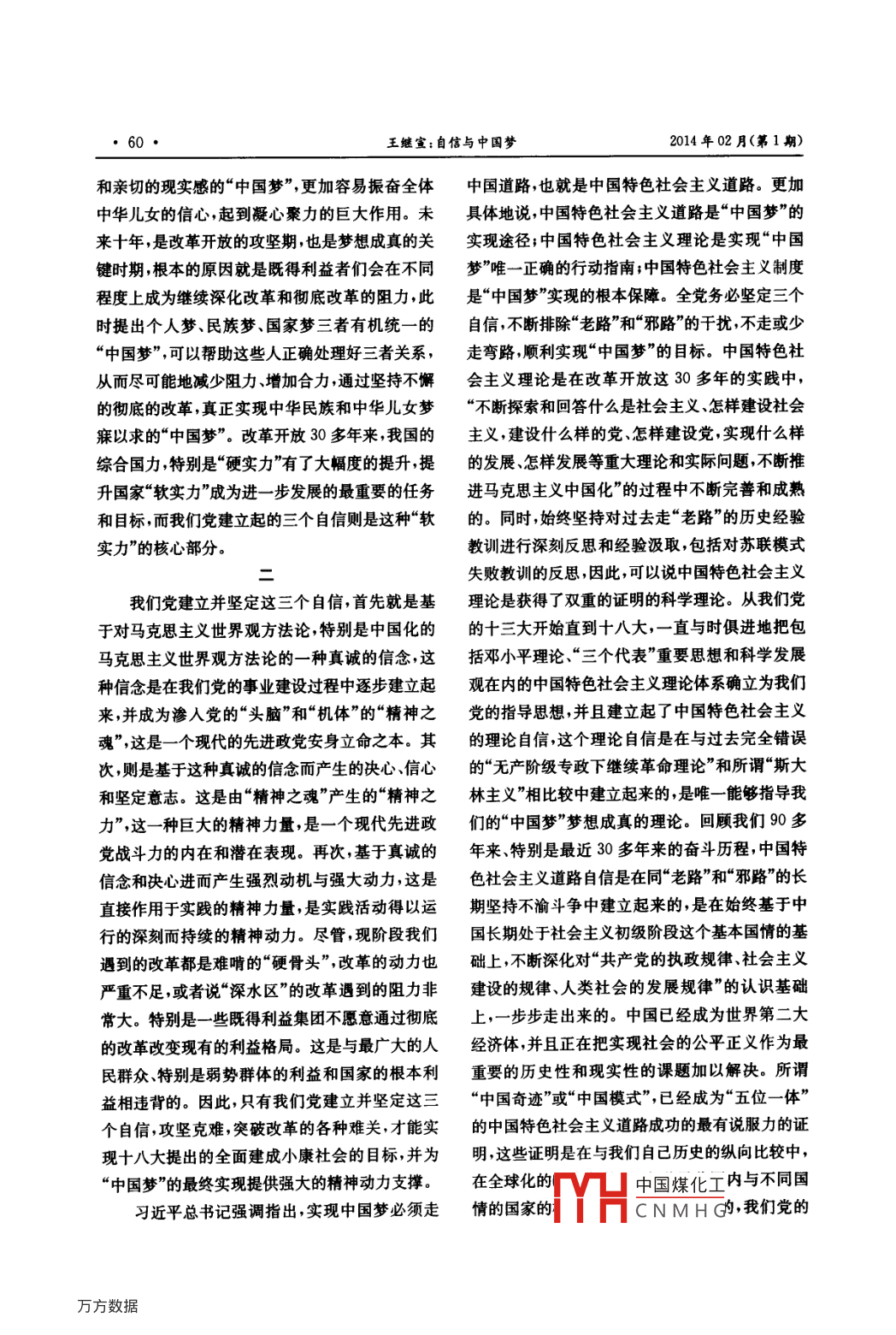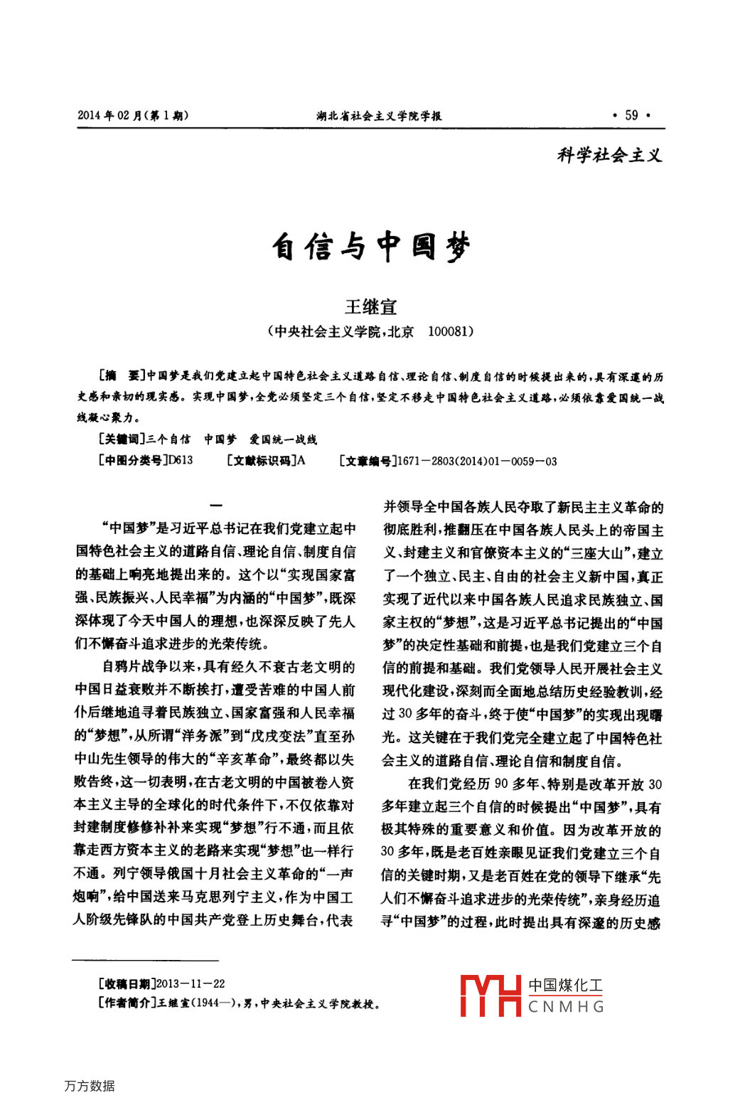 2014年02月(第1期)湖北省社會(huì)主義學(xué)院學(xué)報(bào)科學(xué)社會(huì)主義旬信與中圓夢(mèng)王繼宜(中央社會(huì)主義學(xué)院,北京100081)[摘要]中國夢(mèng)是我們黨建立起中國特色社會(huì)主義道路自信、理論自信、制度自信的時(shí)候提出來的,具有深遽的歷史感和親切的現(xiàn)實(shí)感。實(shí)現(xiàn)中國夢(mèng),全黨必須堅(jiān)定三個(gè)自信堅(jiān)定不移走中國特色社會(huì)主義道路,必須依靠愛國統(tǒng)一戰(zhàn)線凝心聚力。[關(guān)鑣詞]三個(gè)自信中國夢(mèng)愛國統(tǒng)一戰(zhàn)線[圖分類號(hào)]D613[文獻(xiàn)標(biāo)識(shí)碼]A[文章編號(hào)]1671-2803(2014)01-0059-03并領(lǐng)導(dǎo)全中國各族人民奪取了新民主主義革命的中國夢(mèng)”是習(xí)近平總書記在我們黨建立起中徹底勝利推翻壓在中國各族人民頭上的帝國主國特色社會(huì)主義的道路自信理論自信制度自信義、封建主義和官僚資本主義的“三座大山”,建立的基礎(chǔ)上響亮地提出來的。這個(gè)以“實(shí)現(xiàn)國家富了一個(gè)獨(dú)立民主自由的社會(huì)主義新中國真正強(qiáng)民族振興、人民幸?!睘閮?nèi)涵的“中國夢(mèng)”,既深實(shí)現(xiàn)了近代以來中國各族人民追求民族獨(dú)立、國深體現(xiàn)了今天中國人的理想也深深反映了先人家主權(quán)的“夢(mèng)想”,這是習(xí)近平總書記提出的“中國們不懈奮斗追求進(jìn)步的光榮傳統(tǒng)。夢(mèng)”的決定性基礎(chǔ)和前提也是我們黨建立三個(gè)自自鴉片戰(zhàn)爭以來,具有經(jīng)久不衰古老文明的信的前提和基礎(chǔ)。我們黨領(lǐng)導(dǎo)人民開展社會(huì)主義中國日益衰敗并不斷挨打,道受苦難的中國人前現(xiàn)代化建設(shè),深刻而全面地總結(jié)歷史經(jīng)驗(yàn)教訓(xùn),經(jīng)仆后繼地追尋著民族獨(dú)立、國家富強(qiáng)和人民幸福過30多年的奮斗,終于使“中國夢(mèng)”的實(shí)現(xiàn)出現(xiàn)曙的“夢(mèng)想”,從所謂“洋務(wù)派”到“戊戌變法”直至孫光。這關(guān)鍵在于我們黨完全建立起了中國特色社中山先生領(lǐng)導(dǎo)的偉大的“辛亥革命”最終都以失會(huì)主義的道路自信理論自信和制度自信。敗告終,這一切表明在古老文明的中國被卷入資在我們黨經(jīng)歷90多年特別是改革開放30本主義主導(dǎo)的全球化的時(shí)代條件下,不僅依靠對(duì)多年建立起三個(gè)自信的時(shí)候提出“中國夢(mèng)”,具有封建制度修修補(bǔ)補(bǔ)來實(shí)現(xiàn)“夢(mèng)想”行不通,而且依極其特殊的重要意義和價(jià)值。因?yàn)楦母镩_放的靠走西方資本主義的老路來實(shí)現(xiàn)“夢(mèng)想”也一樣行30多年既是老百姓親眼見證我們黨建立三個(gè)自不通。列寧領(lǐng)導(dǎo)俄國十月社會(huì)主義革命的“一聲信的關(guān)鍵時(shí)期,又是老百姓在黨的領(lǐng)導(dǎo)下繼承“先炮響”,給中國送來馬克思列寧主義,作為中國工人們不懈奮斗追求進(jìn)步的光榮傳統(tǒng)”,親身經(jīng)歷追人階級(jí)先鋒隊(duì)的中國共產(chǎn)黨登上歷史舞臺(tái)代表尋“中國夢(mèng)”的過程,此時(shí)提出具有深邃的歷史感收稿日期]2013-11-22中國煤化工[作者簡介]王繼宣(1944-),男,中央社會(huì)主義學(xué)院教授CNMHG60王繼宣:自信與中國夢(mèng)2014年02月(第1期)和親切的現(xiàn)實(shí)感的“中國夢(mèng)”,更加容易振奮全體中國道路,也就是中國特色社會(huì)主義道路。更加中華兒女的信心,起到凝心聚力的巨大作用。未具體地說中國特色社會(huì)主義道路是“中國夢(mèng)”的來十年是改革開放的攻堅(jiān)期也是夢(mèng)想成真的關(guān)實(shí)現(xiàn)途徑;中國特色社會(huì)主義理論是實(shí)現(xiàn)“中國鍵時(shí)期根本的原因就是既得利益者們會(huì)在不同夢(mèng)”唯一正確的行動(dòng)指南;中國特色社會(huì)主義制度程度上成為繼續(xù)深化改革和徹底改革的阻力此是“中國夢(mèng)”實(shí)現(xiàn)的根本保障。全黨務(wù)必堅(jiān)定三個(gè)時(shí)提出個(gè)人夢(mèng)、民族夢(mèng)國家夢(mèng)三者有機(jī)統(tǒng)一的自信不斷排除“老路”和“邪路”的干擾,不走或少“中國夢(mèng)”可以幫助這些人正確處理好三者關(guān)系,走彎路順利實(shí)現(xiàn)“中國夢(mèng)”的目標(biāo)。中國特色社從而盡可能地減少阻力、增加合力通過堅(jiān)持不懈會(huì)主義理論是在改革開放這30多年的實(shí)踐中,的徹底的改革,真正實(shí)現(xiàn)中華民族和中華兒女夢(mèng)“不斷探索和回答什么是社會(huì)主義怎樣建設(shè)社會(huì)寐以求的“中國夢(mèng)”。改革開放30多年來我國的主義建設(shè)什么樣的黨怎樣建設(shè)黨實(shí)現(xiàn)什么樣綜合國力特別是“硬實(shí)力”有了大幅度的提升提的發(fā)展怎樣發(fā)展等重大理論和實(shí)際問題,不斷推升國家“軟實(shí)力”成為進(jìn)一步發(fā)展的最重要的任務(wù)進(jìn)馬克思主義中國化”的過程中不斷完善和成熟和目標(biāo)而我們黨建立起的三個(gè)自信則是這種“軟的。同時(shí)始終堅(jiān)持對(duì)過去走“老路”的歷史經(jīng)驗(yàn)實(shí)力”的核心部分。教訓(xùn)進(jìn)行深刻反思和經(jīng)驗(yàn)汲取包括對(duì)蘇聯(lián)模式失敗教訓(xùn)的反思,因此,可以說中國