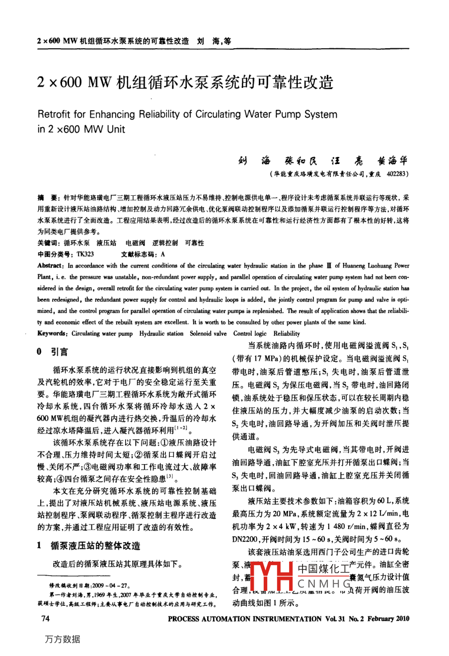 2 x600 MW機(jī)組循環(huán)水泵系統(tǒng)的可靠性改造劉海,等2x600MW機(jī)組循環(huán)水泵系統(tǒng)的可靠性改造Retrofit for Enhancing Reliability of Circulating Water Pump Systemin 2 x600 MW Unit劉海張和民汪亮黃海華(華能重慶珞璜發(fā)電有限責(zé)任公司,重慶402283)摘要: 針對華能珞璜電廠三期工程循環(huán)水液壓站壓力不易維持控制電源供電單-、程序設(shè)計(jì)未考慮循泵系統(tǒng)并聯(lián)運(yùn)行等現(xiàn)狀,采用重新設(shè)計(jì)液樂站油路結(jié)構(gòu)、增加控制及動(dòng)力回路冗余供電、優(yōu)化泵閥聯(lián)動(dòng)控制程序以及添加循泵并聯(lián)運(yùn)行控制程序等方法,對循環(huán)水泵系統(tǒng)進(jìn)行了全面改造。工程應(yīng)用結(jié)果表明,經(jīng)過改造后的循環(huán)水泵系統(tǒng)在可靠性和運(yùn)行經(jīng)濟(jì)性方面都有了根本性的好轉(zhuǎn),這將為同類電廠提供參考。關(guān)鍵詞:循環(huán)水泵液壓站電磁閥 邏輯控制 可靠性中圖分類號: TK323文獻(xiàn)標(biāo)志碼: AAbstract: In accordance with the curent conditions of the circulating water hydraulic station in the phase I of Huaneng Luohuang PowerPlant, i. e. the pressure was unstable , non-redundant power supply, and parallel operation of circulating waler pump sysem had not been con-sidered in the design, overall retroft for the cireulating water pump system is carried out. In the project, the oil system of hydraulic station hasbeen redesigned, the redundant power supply for control and hydraulic loops is added, the joinly control program for pump and valve is opti-mized, and the control program for parall operation of circulating water pumps is replenished. The result of application shows that the reliabili-ty and economic eleet of the rebuilt system are excellent. It is worth to be consuled by other power plants of the same kind.Keywords: Circulaing water pump Hydraulic station Solenoid valve Control logie Reliability當(dāng)系統(tǒng)油路內(nèi)循環(huán)時(shí),使用電磁閥溢流閥S,S,?引言(帶有17 MPa)的機(jī)械保護(hù)設(shè)定。當(dāng)電磁閥濫流閥S,循環(huán)水泵系統(tǒng)的運(yùn)行狀況直接影響到機(jī)組的真空帶電時(shí),油泵后管道憋壓;S,失電時(shí),油泵后管道泄及汽輪機(jī)的效率,它對于電廠的安全穩(wěn)定運(yùn)行至關(guān)重壓。電磁閥S2為保壓電磁閥,當(dāng)S,帶電時(shí),油回路閉要。華能珞璜電廠三期工程循環(huán)水系統(tǒng)為敞開式循環(huán)鎖,油系統(tǒng)處于穩(wěn)壓和保壓狀態(tài),可以在較長周期內(nèi)穩(wěn)冷卻水系統(tǒng),四臺循環(huán)水泵將循環(huán)冷卻水送人2x住液壓站的壓力,并大幅度減少油泵的啟動(dòng)次數(shù);當(dāng)600 MW機(jī)組的凝汽器內(nèi)進(jìn)行熱交換,升溫后的冷卻水S,失電時(shí),油回路導(dǎo)通,為開閥加壓和關(guān)閥時(shí)泄壓提經(jīng)過涼水塔降溫后,進(jìn)入凝汽器循環(huán)利用1-21。該循環(huán)水泵系統(tǒng)存在以下問題:①液壓油路設(shè)計(jì)供通道。不合理、壓力維持時(shí)間太短;②循泵出口蝶閥開啟過電磁閥S,為先導(dǎo)式電磁閥,當(dāng)其帶電時(shí),開閥進(jìn)慢關(guān)閉不嚴(yán);③電磁閥功率和工作電流過大、故障率油回路導(dǎo)通,油缸下腔室充壓并打開循泵出口蝶閥;當(dāng)較高;④四臺循泵之間存在安全性隱患'”。S,失電時(shí),回油回路導(dǎo)通,油缸上腔室充壓并關(guān)閉循本文在充分研究循環(huán)水系統(tǒng)的可靠性控制基礎(chǔ)泵出口蝶閥。上,提出了對液壓站機(jī)械系統(tǒng).液壓站電源系統(tǒng)、液壓液壓站主要技術(shù)參數(shù)如下:油箱容積為60 L,系統(tǒng)站控制程序泵閥聯(lián)動(dòng)程序、循泵控制主程序進(jìn)行改造最高壓力為20 MPa,系統(tǒng)額定流量為2x12 V/min,電的方案,并通過工程應(yīng)用證明了改造的有效性。機(jī)功率為2 x4 kW,轉(zhuǎn)速為1480 r/min,蝶閥直徑為DN2200 ,開閥時(shí)間為15 ~60s,關(guān)閥時(shí)間為5 ~60s。1循泵液壓站的整體改造該套液壓站油泵選用西門子公司生產(chǎn)的進(jìn)口齒輪改造后的循泵液壓站其原理具體如下。泵、液中國煤化工產(chǎn)元件。油缸全密封,二囊氮?dú)鈮毫υO(shè)計(jì)值修改稿收到日期:2009-04-27。合理YHCNMH(頃荷開閥的油壓波第一作者劉海,男,1969年生,0年畢業(yè)于重慶大學(xué)自動(dòng)控劍專業(yè),獲項(xiàng)士學(xué)位,高級工程師;主要從事電廠自動(dòng)控制技術(shù)的應(yīng)用與研究工作。動(dòng)曲線如圖1所示。74PROCESS AUTOMATION INSTRUMENTATION VoL 31 No, 2 February 20102 x 600 MW機(jī)組循環(huán)水泵系統(tǒng)的可靠性改造劉海,等13.5MPa15.0MPa踐,其可靠性一直維持在 100%,因此,提出了進(jìn)一步提高循環(huán)水系統(tǒng)的經(jīng)濟(jì)性和可靠性的要求。華能珞璜10.SMPa電廠單臺機(jī)組的循環(huán)水系統(tǒng)由一-臺低速循泵和一臺高開閏油壓恢復(fù)速循泵組成。兩臺機(jī)組共有兩臺低速循泵和兩臺高速4675循泵,機(jī)組之間設(shè)有相互供水的聯(lián)絡(luò)門。理論研究證明,電廠母管制循環(huán)水回路是可以實(shí)現(xiàn)并聯(lián)經(jīng)濟(jì)運(yùn)行圖1油壓波動(dòng)曲線的I61。Fig.1 Curves of the Aluctuation of oil pressure華能珞璜電廠循泵相互連鎖分兩種方式:①標(biāo)準(zhǔn)工況下,當(dāng)機(jī)組間供水聯(lián)絡(luò)門關(guān)閉運(yùn)行時(shí),單元機(jī)組兩2系統(tǒng