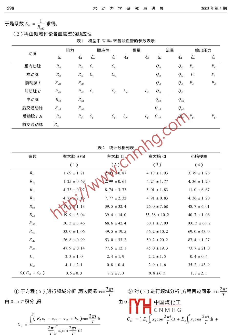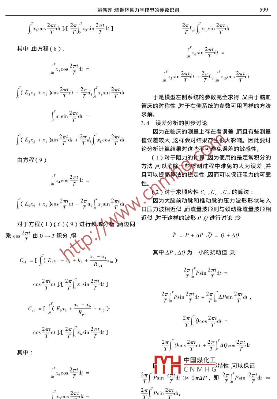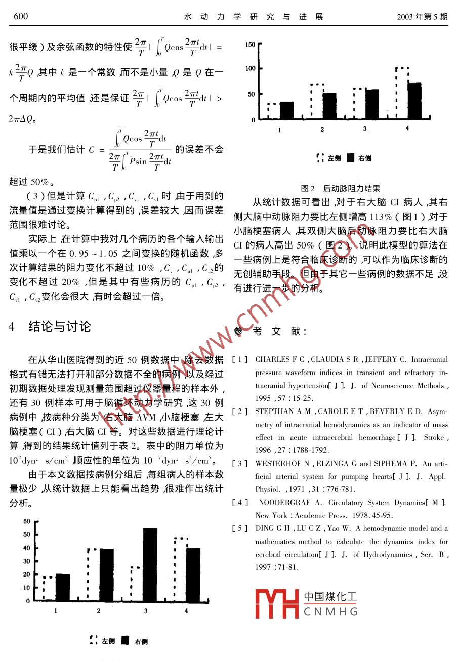 A輯第18卷第5期水動(dòng)力學(xué)研究與進(jìn)展Ser. A, Vol 18 No 52003年9月JOURNAL OF HYDRODYNAMICSSep.,2003文章編號(hào)1000-48742003)5059506腦循環(huán)動(dòng)力學(xué)模型的參數(shù)識(shí)別姚偉,丁光宏2,劉輝王盛章,呂傳真2,陳韶華2(1.復(fù)旦大學(xué)力學(xué)與工程科學(xué)系,上海2004332.華山醫(yī)院上海200040)摘要:本文根據(jù)已建立的腦 Willis環(huán)參數(shù)模型進(jìn)一步簡化并進(jìn)行模型參數(shù)方程的反問題求解通過計(jì)算結(jié)果與實(shí)際結(jié)論對(duì)比發(fā)現(xiàn)理值可以反映一些病例的臨床診斷結(jié)果關(guān)鍵詞:集中參數(shù)模型洫血液動(dòng)力學(xué)脈動(dòng)流反問題中圖分類號(hào):0368文獻(xiàn)標(biāo)識(shí)碼arameter identification of a hydrodynamic modeldescribing the cerebral circulationYAO WeiDING Guang-hongLIU HuiWANG Sheng-zhangLU Chuan-zhenchen Shao-hua1. Department of Mechanics and Engineering Science, Fudan University Shanghai 200433,China2. Hua Shan Hospital, Shanghai 200040, Chinacerebral circulation set up in our previous workd developed a mathematical method to solve the inverse problem and obtained the values of indeces in the model. Compared with theclinical data from Huashang Hospital, most theoretical results agreed with the clinical diagnosesKey words: lumped parameters model hemodynamics pulsatile flow inverse problem引言變13。因此一些學(xué)者開始著手從建立模型的方法來研究腦血管疾病腦血管疾病是危害人類生命的重要疾病之本實(shí)驗(yàn)室根據(jù)腦循環(huán)的特點(diǎn)建立了一個(gè)具有四它不僅發(fā)病率高、死亡率高、并且致殘率復(fù)發(fā)率都很端輸入的腦wlis環(huán)的集中參數(shù)模型模型根據(jù)定高給家庭和社會(huì)造成嚴(yán)重的精神和經(jīng)濟(jì)負(fù)擔(dān)。大常流的特點(diǎn)將Wls環(huán)的大血管分成18段每段用量的臨床和動(dòng)物實(shí)驗(yàn)表明,許多腦血管疾病在發(fā)病dH中國煤化工的特點(diǎn)考慮到血管壁前期腦血管動(dòng)力學(xué)參數(shù)住往已經(jīng)有顯著改變而且的彈CNMHG分別用8個(gè)流容器這些動(dòng)力學(xué)改變常常要明顯地早于形態(tài)學(xué)的改(C,C2,C1,C2,C,Ca,Cn,Cg)表示左右*收稿日期:199909-12(2003-03-12修改稿)作者教揖姚偉(1973-)女遼寧朝陽人講師博士596水動(dòng)力學(xué)研究與進(jìn)展2003年第5期大腦的頸、椎、前、后等血管的順應(yīng)性,用流感器R,+ r(L1,La,La,La)分別表示左右頸動(dòng)脈系統(tǒng)和椎R、1·R動(dòng)脈系統(tǒng)的慣量用流感器(L,L2)來表示左右后交通動(dòng)脈的慣量還有6個(gè)終端阻力分別加入到P, Pa(5)它們各自的動(dòng)脈血管。由此模型得到的狀態(tài)方程的正問題求解無論是在時(shí)域還是在頻域方面都與生理實(shí)際相符合3PdtOP在對(duì)此模型的正、反問題的求解過程中發(fā)現(xiàn)模型的參數(shù)L,L2的變化對(duì)理論計(jì)算的結(jié)果影響極微甚至將其置零結(jié)果都不會(huì)產(chǎn)生較大的變化因而(6)我們可以認(rèn)為大腦后交通動(dòng)脈的慣性可以忽略:并且還發(fā)現(xiàn)我們將R置零其值由R1,R2分擔(dān)R置零其值加到Rn2上R2置零其值加到Ra2上OP這樣對(duì)理論計(jì)算的結(jié)果影響也很微小于是我們認(rèn)為R,R,Ra的阻力可忽略。由此我們得到相吋簡化的集中參數(shù)模型。R(7)2狀態(tài)方程dt對(duì)此模型可用電路分析方法建立狀態(tài)方程IPR1·R.≠、R+rRd Qu(10)PO(1)dQR,·RR方程中的參數(shù)說明列于表1。PPR(2)3參數(shù)求解及誤差分析dPR+R3.1為了方便求解我們將方程中的部分參數(shù)如下dtR12·R(3)Pa中國煤化工R,+CNMHGRPa+q(4)Q1姚偉等腦循環(huán)動(dòng)力學(xué)模型的參數(shù)識(shí)別597PP,b2RR+R(12)(7)Rn,Rn2,P1,P2,P可采用定常理論的公式求得R,2 +rRa1=(P1-Qa·Ra1)Q1,R+rRn2=(P2-Qa·R2)QPa1=P1-Q·RE。=-R1ERP3+ P4-QR、2)3.2臨床分析方程中可無創(chuàng)測(cè)量或直接推算的量有3參數(shù)求解(1)P,P2,P3,P4可用生理壓力傳感器或超1)首先對(duì)方程進(jìn)行定常分析,求終端阻力聲血管搏動(dòng)檢測(cè)儀直接精確測(cè)量;Rp, Rn, rn r(2)Q。,Q。,Q、1,(a可用B型超聲波探頭和①由方程(3)(8)(9)定常積分得多普勒超聲血液流速探頭直接精確檢測(cè)(3)Qu,Q2,Qn,Qn,Q1,Q可用經(jīng)顱超聲多普勒探頭(TCD)和一些血管影象學(xué)數(shù)據(jù)得E (EoL xo dt+x,dt)dt到EsI xsdtdt4)Q12Qa2可通過TCD測(cè)大腦后動(dòng)脈時(shí)探頭的不同定位得到的波形近似求得Ra+rR(5)Rall, Ral2,Rpel, Rpe, Rae, Lat根據(jù)E3=-Rn2·R可由血管影象學(xué)數(shù)據(jù)直接或近似算出,或根據(jù)②由方程(1)(6)(10)定常積分得生理狀態(tài)假定(6)R1,R2,R、1,R、2可通過血管輸入阻抗計(jì)算公式求得;其中P,Qm,Pm,Qm分別為PdtRQ。,P、,Q波形第n次 Fourier變換的模。(ExI -x8+b)dt+todtZein I= pen/Qcin I但在臨床上由于Qn12可以近似測(cè)得又由于1Z、m=Pmn/Qmφmin=φpwin-9qin中國煤化工+b于是HCNMHGdt2Pldt598水動(dòng)力學(xué)研究與進(jìn)展2003年第5期于是系數(shù)E求得R(2)再由頻域討論各血管壁的順應(yīng)性表1模型中wlis環(huán)各段血管的參數(shù)表示阻力順應(yīng)性慣量輸出壓力動(dòng)脈左右左右左右左右頸內(nèi)動(dòng)脈RR CCC, CP椎動(dòng)脈R、1前動(dòng)脈P前動(dòng)脈I中動(dòng)脈后交通動(dòng)脈Rm后動(dòng)脈HR.前交通動(dòng)脈R表2統(tǒng)計(jì)分析列表參數(shù)右大腦AVM左大腦CI右大腦CI(1)R1.69±1.212.93±0.873