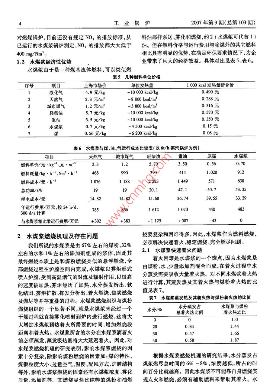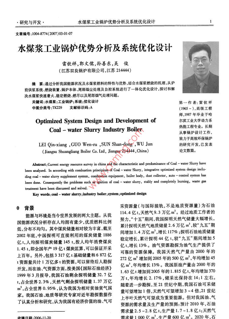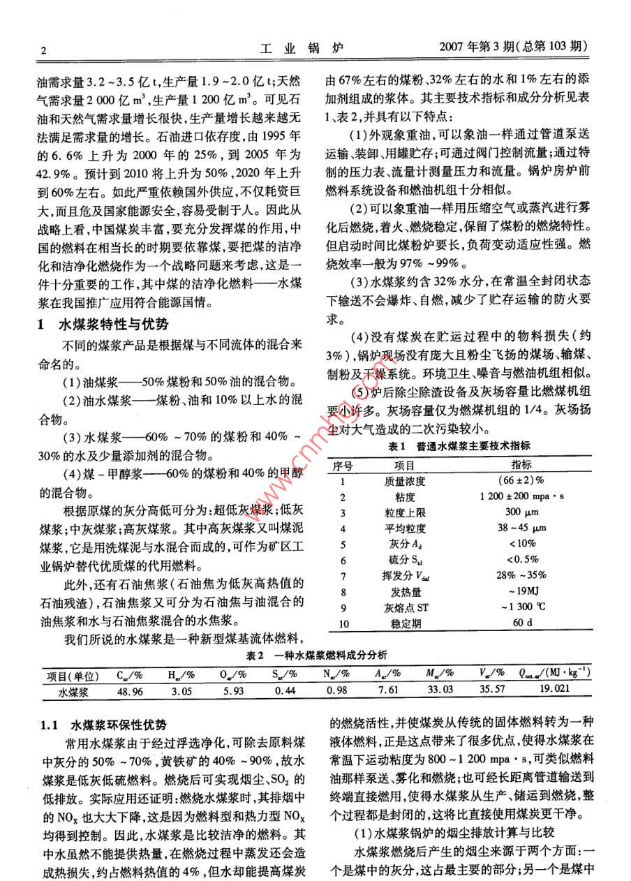 研究與開發(fā)·水煤漿工業(yè)鍋爐優(yōu)勢分析及系統(tǒng)優(yōu)化設(shè)計文章編號:10048714(2007)03-01407水煤漿工業(yè)鍋爐優(yōu)勢分析及系統(tǒng)優(yōu)化設(shè)計雷欽祥,郭文儒,孫善東,吳俊(江蘇雙良鍋爐有限公司,江蘇2144摘要:通過分析我國能源狀況及水煤漿燃料的特性與優(yōu)勢,結(jié)合水煤漿燃燒的機(jī)理,從爐前供漿系統(tǒng)燃燒裝置、鍋爐本體、尾部煙塵處理及自控系統(tǒng)進(jìn)行了一體化優(yōu)化設(shè)計,探討和解決水煤漿快速著火、穩(wěn)定燃燒、燃盡以及尾部煙氣處理問題。關(guān)鍵詞:水煤漿;工業(yè)鍋爐;系統(tǒng);優(yōu)化設(shè)計第一作者:雷欽祥中圖分類號:TK229文獻(xiàn)標(biāo)識碼:A(1965-),高級工程師,1987年畢業(yè)于哈Optimized System Design and Development of爾濱工業(yè)大學(xué)動力系Coal-water Slurry Industry boiler熱能工程專業(yè)。長期從事鍋爐設(shè)計工作,致力于高效環(huán)保鍋爐LEI Qin-xiang, GUO Wen-ru, SUN Shan-dong,WU Jun的研究開發(fā),已發(fā)表Jiangsu Shuangliang Boiler Co Ltd, Jiangsu 214444, China)論文數(shù)篇。Abstract: Current energy resource survey in china and the characteristic and predominance of Coal- water Slurry haveeen analyzed. In according with combustion principium of Coal-water Slurry, integrative optimized system design inclu-ding coal-water slurry supplement system, combustion equipment, boiler body, dust collector, auto-control system hasbeen done. Consequently the problems such as ignition of coal-water slurry, stably and completely buming, waste gastreatment have been discussed and solved.Key words: coal-water slurry; industry boiler; system; optimized design0背景采資源量(與國際接軌,不是地質(zhì)資源量)為石油能源與環(huán)境是當(dāng)今世界發(fā)展的兩大主題。從我11.4億t,天然氣93萬億m3。經(jīng)過地質(zhì)工作者的國能源狀況分析存在人均擁有量少,優(yōu)質(zhì)燃料比例努力,“十五”期間我國探明天然氣儲量大幅增長,低分布不均勻。其中煤炭儲量相對較為豐富截至累計探明天然氣地質(zhì)儲量2.6萬億m,較“九五”期2002年底中國探明可直接利用的煤炭儲量1886間增加1.4萬億m3,增長117%;探明石油地質(zhì)儲量億t人均探明煤炭儲量145t,按人均年消費(fèi)煤炭穩(wěn)定增長累計探明44億t,較“九五”期間增加1.45t,即全國年產(chǎn)19億t煤炭匡算,可以保證開采億t,增長13%。油氣資源勘探為油氣生產(chǎn)提供了上百年。另外包括3317億t基礎(chǔ)儲量和6872億可靠的資源保障。我國天然氣產(chǎn)量由200年的t資源量共計1萬億多t的資源,可以留待后人勘探272億m3增加到2005年的500億m2,年均增加45開發(fā),而在油氣資源方面按美國《國際石油經(jīng)濟(jì)》億m3,年均增長13%。我國原油產(chǎn)量由2000年的1999年3月報導(dǎo),我國石油剩余探明儲量32.7億1.63億t增加到2005年的1.815億t年均增加370t,占全世界2.3%,天然氣剩余探明儲量1.37萬億萬t,年均增長2.17%,儲采比保持在14:1左右。m,占全世界0.95%,認(rèn)為我國為相對貧油貧氣國隨著進(jìn)一步勘探至21世紀(jì)中期我國石油可釆儲家。我國石油、地質(zhì)等研究專家對近年勘探數(shù)據(jù)作量可望增加1倍,天然氣可望增加3~4倍2l世紀(jì)了認(rèn)真分析和研究,認(rèn)為我國有經(jīng)濟(jì)價值的油、氣可上半葉天然氣可望成為重要能源。但對我國油、氣資源的需求量及生產(chǎn)量的預(yù)測:預(yù)計2010年,石油需求量2.5-2.8億t,生產(chǎn)量1.7-1.8億t;天然氣產(chǎn)量600億工業(yè)鍋爐2007年第3期(總第103期)油需求量3.2-3.5億t,生產(chǎn)量1.9-2.0億t天然由67%左右的煤粉32%左右的水和1%左右的添氣需求量2000億m3,生產(chǎn)量1200億m3。可見石加劑組成的漿體。其主要技術(shù)指標(biāo)和成分分析見表油和天然氣需求量增長很快,生產(chǎn)量增長越來越無1、表2,并具有以下特點:法滿足需求量的增長。石油進(jìn)口依存度,由1995年(1)外觀象重油,可以象油一樣通過管道泵送的6.6%上升為2000年的25%,到2005年為運(yùn)輸、裝卸、用罐貯存;可通過閥門控制流量;通過特42.9%。預(yù)計到2010將上升為50%,2020年上升制的壓力表、流量計測量壓力和流量。鍋爐房爐前到60%左右。如此嚴(yán)重依賴國外供應(yīng),不僅耗資巨燃料系統(tǒng)設(shè)備和燃油機(jī)組十分相似。大,而且危及國家能源安全,容易受制于人。因此從(2)可以象重油一樣用壓縮空氣或蒸汽進(jìn)行霧戰(zhàn)略上看,中國煤炭豐富,要充分發(fā)揮煤的作用,中化后燃燒,著火、燃燒穩(wěn)定,保留了煤粉的燃燒特性。國的燃料在相當(dāng)長的時期要依靠煤,要把煤的潔凈但啟動時間比煤粉爐要長,負(fù)荷變動適應(yīng)性強(qiáng)。燃化和潔凈化燃燒作為一個戰(zhàn)略問題來考慮這是一燒效率一般為97%-99%件十分重要的工作,其中煤的潔凈化燃料——水煤(3)水煤漿約含32%水分,在常溫全封閉狀態(tài)漿在我國推廣應(yīng)用符合能源國情。下輸送不會爆炸、自燃,減少了貯存運(yùn)輸?shù)姆阑鹨?水煤漿特性與優(yōu)勢求不同的煤漿產(chǎn)品是根據(jù)煤與不同流體的混合來(4)沒有煤炭在貯運(yùn)過程中的物料損失(約命名的。3%),鍋爐現(xiàn)場沒有龐大且粉塵飛揚(yáng)的煤場、輸煤(1)油煤漿—50%煤粉和50%油的混合物。制粉及干燥系統(tǒng)。環(huán)境衛(wèi)生、噪音與燃油機(jī)組相似。(2)油水煤漿——煤粉、油和10%以上水的混5)爐