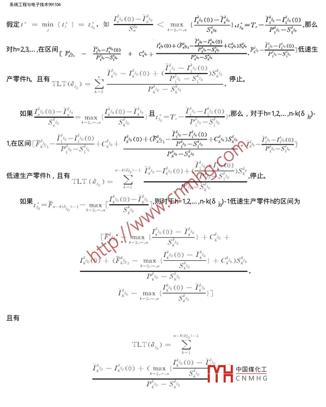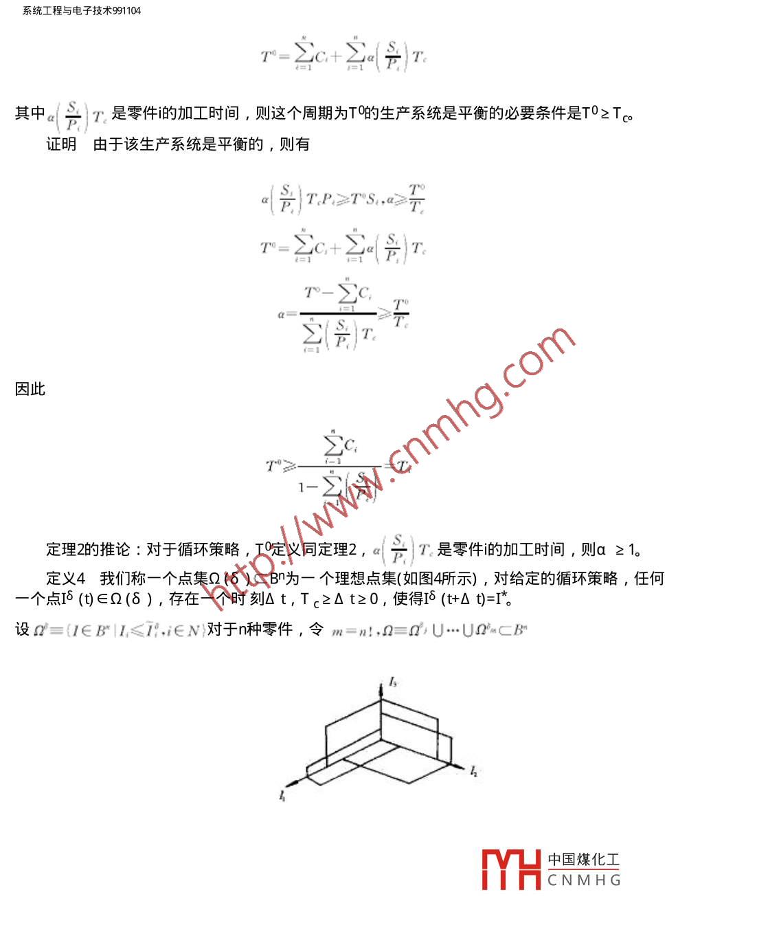 系統(tǒng)工程與電子技術(shù)91104日資源系統(tǒng)系統(tǒng)工程與電子技術(shù),數(shù)字化期刊WANFANG DATA ( CHINAINFO)SYST EMS ENGINEERING AND ELECT RONICSDIGI1999 V ol.21No.11P.11-17,22快速平衡技術(shù)熊中楷里奇曼摘要存儲管理是工業(yè)工程的一個重要研究領(lǐng)域。在國際上首先對單機器生產(chǎn)系統(tǒng)循環(huán)投放的特性進行研究,給出快速進入最優(yōu)軌線的方法和步驟,以及儲存空間任意一點快速進入最優(yōu)軌線時間的計算公式。主題詞存儲管理最優(yōu)設(shè)計系統(tǒng)穩(wěn)定性Quickly Balance T echnologyXiong ZhongkaiCollege of Business,Chongqing University, 515063LeachmanIndustrial Engineering and Operation Research Department, UC Berkeley, CA 94720,USAAbstract T his paper discusses the characteristic 0 f round- Brobin policy for the single machine, multi-item production system. We find and provea real optimal buffer trajectory (corresponds minimum cost)whic h is independent on initial inventory. We have a formula to caclulate the time f rom any initial point tothe optimal buffer trajectory. .Keywords BallanceStableOptimal trajectory Fac tory automation1引言存貯管理是工業(yè)工程的一個重要研究領(lǐng)域。存儲控制的運籌模型可以追溯到本世紀初[8],到目前為止發(fā)表的有關(guān)論文已有數(shù)千篇,根據(jù)美國總統(tǒng)1995年經(jīng)濟報告,美國的存儲總值超過萬億美元[7]。近年來,許多研究人員對從制造系統(tǒng)的穩(wěn)定性來研究存儲很有興趣,例如在文獻[1~6]中,特別是Perkins和Kumar [ 4]對幾種策略的特性進行了深入的研究(由美國國家科學(xué)基金會和美國軍方資助) ,給出了-系列可靠的結(jié)果。在國際上本文首次對單機器生產(chǎn)系統(tǒng)循環(huán)投放的特性和最優(yōu)軌線進行了研究,并給出存儲空間任意- -點到達最優(yōu)軌線的時間計算公式。粗略地講,對一個給定單機器多產(chǎn)品生產(chǎn)系統(tǒng)(見圖1所示) ,給定加工零件供給率、生產(chǎn)率,從一個零件轉(zhuǎn)換為另-個零件的轉(zhuǎn)換時間、轉(zhuǎn)換費用及存儲費用,對應(yīng)于給定的循環(huán)策略可以求出最優(yōu)周期,它對應(yīng)于最低費用。本文要回答的問題是:當最優(yōu)生產(chǎn)周期等于平衡生產(chǎn)周期時,什么是對應(yīng)最少費用的最優(yōu)存儲水平?對存儲空間的任何一點,如何快速控制系統(tǒng)進入最優(yōu)軌線?如果-個干擾出現(xiàn),如機器故障等使系統(tǒng)偏離最優(yōu)軌線,如何快速控制系統(tǒng)?如何使系統(tǒng)穩(wěn)定地運行于最優(yōu)軌線,從而節(jié)省費用?中國煤化工MHCNMH G頭MCINE]--一年fle:/// Vqkx99991104.htom(第1/ 18頁) 2010-3-23 12:01:49系統(tǒng)工程與電子技術(shù)991104圖1單機器多產(chǎn)品生產(chǎn)系統(tǒng)2符號與主要結(jié)論我們定義如下符號:i--零件標號, i∈N={,2... ,n};Cδ ir-在采用循環(huán)策略δ j時轉(zhuǎn)換機器,以加工第1種零件所需時間, i∈Nj∈M={1,2, .. ,m}, .m=n!,Cδ ji=C;;p8 i--采用循環(huán)策略δ j時,第i種零件的生產(chǎn)率, Pδ ji=P;i∈Nj∈M ;Sδ i--采用循環(huán)策略δ時,第i種零件的平均供給率, Sδ ji= S;i∈N,j∈M ;I(G,8 }(t)--采用循環(huán)策略δ ;時,第G周期第i種零件在時刻的存儲水平10.)(1)= (19092)(1)Iδ i()--采用循環(huán)策略δ j時,第i種零件在時刻的存儲水平, *()= (p(r)(2(,../(1)”.1,V i∈N .(t)=r'(t);F(G,8 }()--采用循環(huán)策略δ ;時,在第G周期完成零件1到零件i所用的累計時間,本文假定零件不間斷加工, i∈Nj∈M ;Fδ j-采用循環(huán)策略δ ;時,完成零件1倒零件i所用的累計時間;T*-最優(yōu)生產(chǎn)時間;T*S jir采用循環(huán)策略δ ;時,第i種零件的最優(yōu)加工時間;Bn--n維存儲空間;t*--采用循環(huán)策略j時,對給定的初始存儲狀態(tài)到達最優(yōu)軌線的最快時間;t--對給定初始存儲狀態(tài)到達最優(yōu)軌線的最快時間1" = min{t; )h--第i種零件單位時間的存儲費用;A--轉(zhuǎn)換加工零件i所需時間;m:--兩次加工零件i相隔的基本周期數(shù)。在給出本文的定理前,我們還給出一些定義。定義1對一 一個制造系統(tǒng),如果存在常數(shù),整數(shù)m≥0,使得.I:(Ts+mTJ)=I(T),i∈N (1)我們稱這個制造系統(tǒng)是平衡的(從時刻T起) ,稱T是平衡生產(chǎn)周期(如圖2所示)。中國煤化工MHCNM HGfle:/// Vqkxcg9919991104.htm(第2/ 18頁) 2010-3-23 12:01:49系統(tǒng)工程與電子技術(shù)991104圖2理解平衡生產(chǎn)周期定義定義2如果制造系統(tǒng)是平衡的,并且有最低存儲水平,我們稱這個制造系統(tǒng)處于理想平衡,稱點I*∈B^理想存儲點。現(xiàn)在我們給出本文的一些主要結(jié)論。定理1對一個多產(chǎn)品單機器生產(chǎn)系統(tǒng),采用循環(huán)策略的理想平衡條件是習異+2骨=1 (2)其中T*=T*,vi∈N,T*=Tc,并且gj∈M,使得1(0)= 1=Ix-[B,+C]S,i∈N(3)其中...=尚)Ti(P-S/)=則.+C/+[/*(0)+(F 1+C;9S9]/(4)(P%- S°),i∈N階=0證明首先 ,我們證明1≥0oT.(P%-S))-=TSp-2c>+ 2r.JS)=[2c+ 2興T.JS, -六S2.t20+2 r]Sy≥0在時間[0,Tc] , 零件i的總投入量為TSδj,i∈N。其中生產(chǎn)時間為S1m加果機器中國煤化工不饑餓,則產(chǎn)品量應(yīng)為TYHCNM HGfle:/// Vqkxcg9919991104.htim(第3/ 18頁) 2010-3-23 12:01:49系統(tǒng)工程與電子技術(shù)991104(哥T"PI=S!T"這里假設(shè)機器不饑餓,并且19(T)=1<0)= Py,i∈N。.在時刻附,+C/..開始加工零件i ,這-時刻總的零件存儲應(yīng)該為P:+(P.+C)Si=1m=(尚T:(PI,-S%).Sδi在時刻刊9.,零件i的總存儲量正好為0 ,如果不